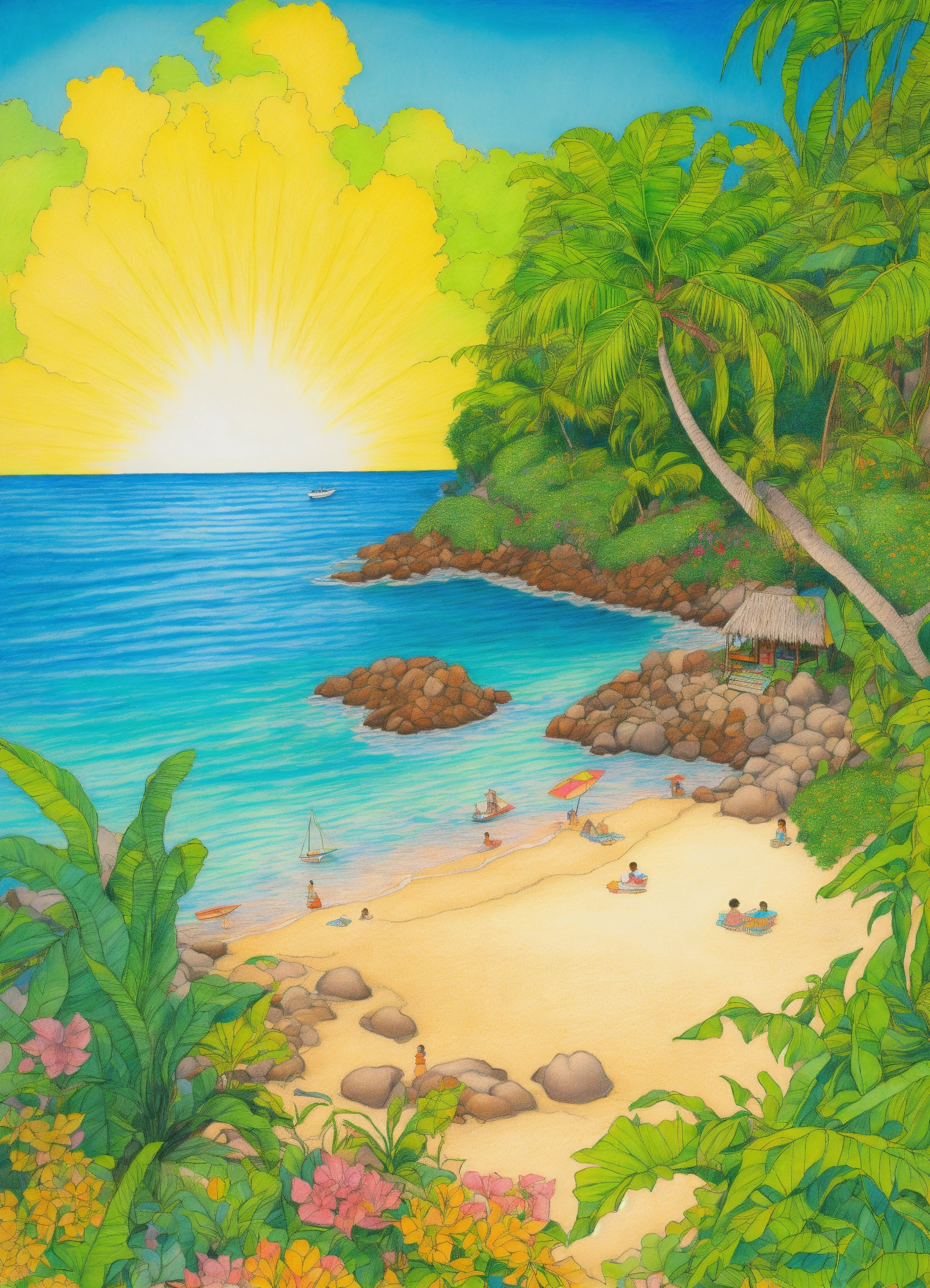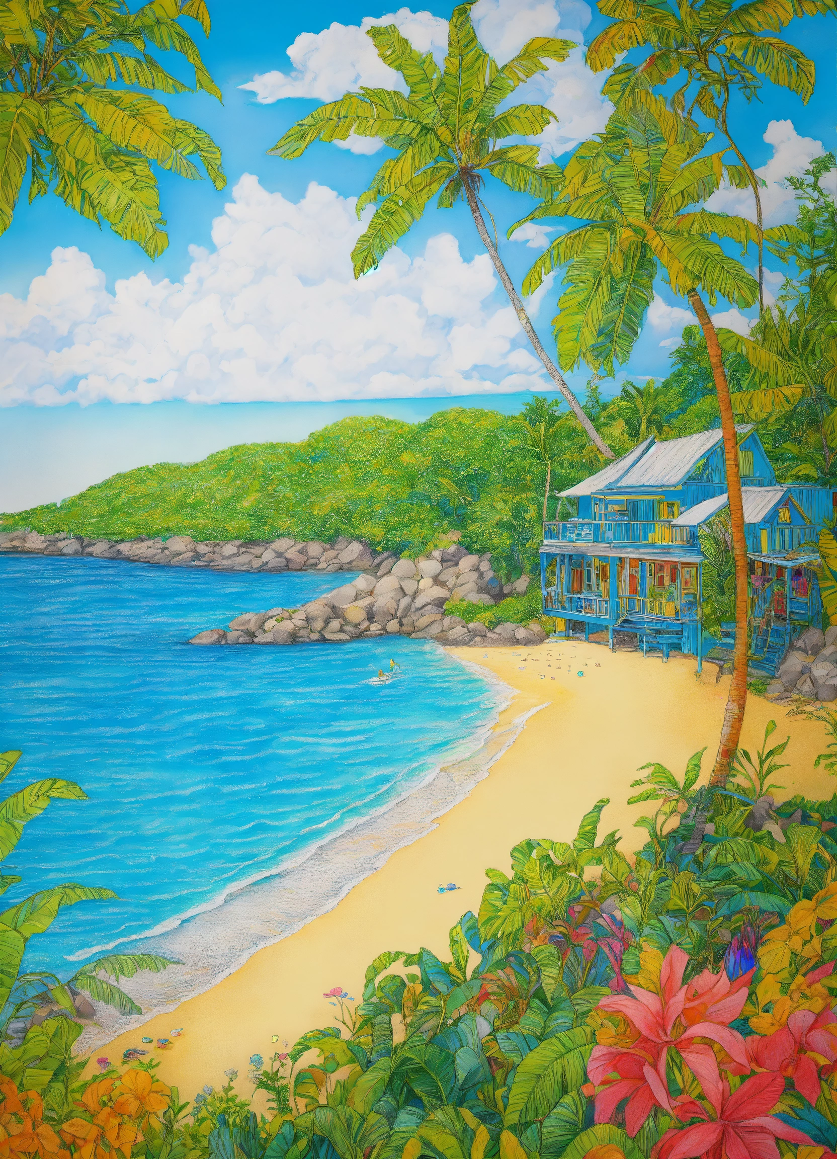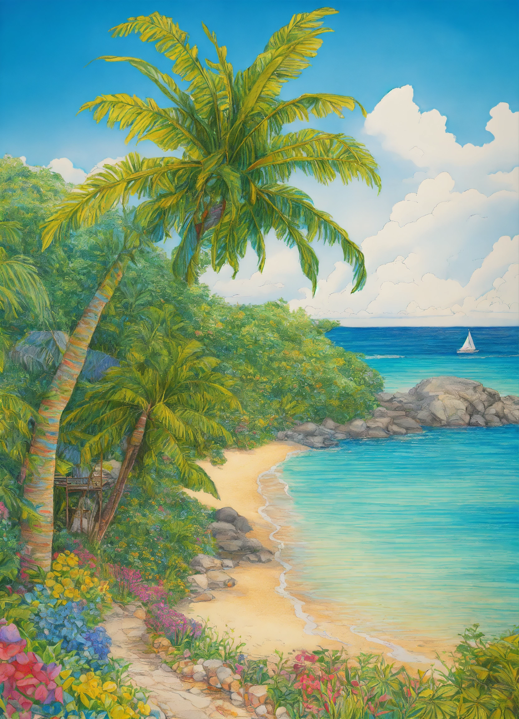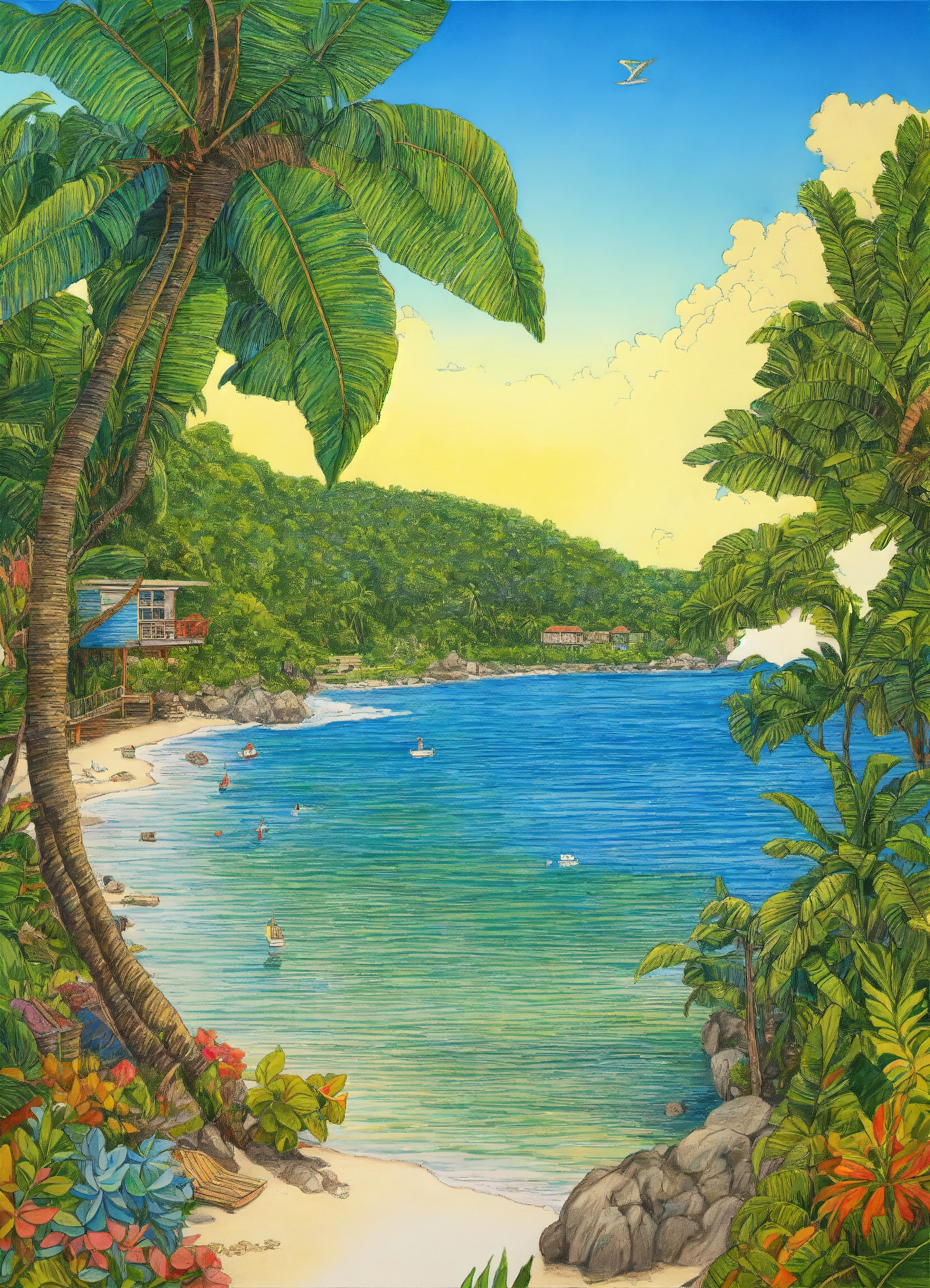 Jamaican beach drawing a beautiful and highly detailed bright colors drawing of a jamaican beach. blue sky, fully sunny. crystal clear, line drawing, clean clear lines, coloring book style, bright colors, intricate details, elegant, discreete, serene, peaceful, magical, fine details, pastel pencils, winsor mccay style