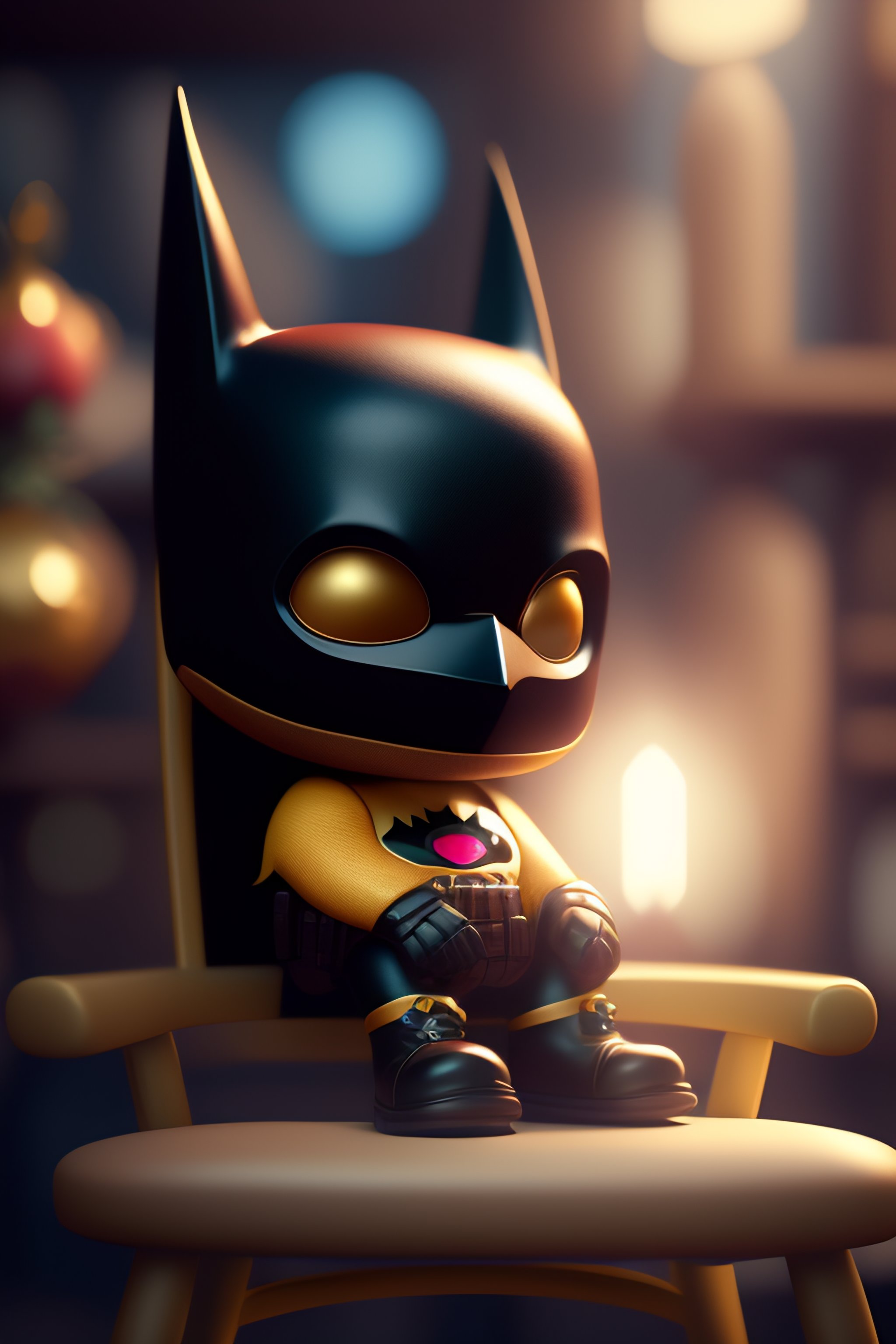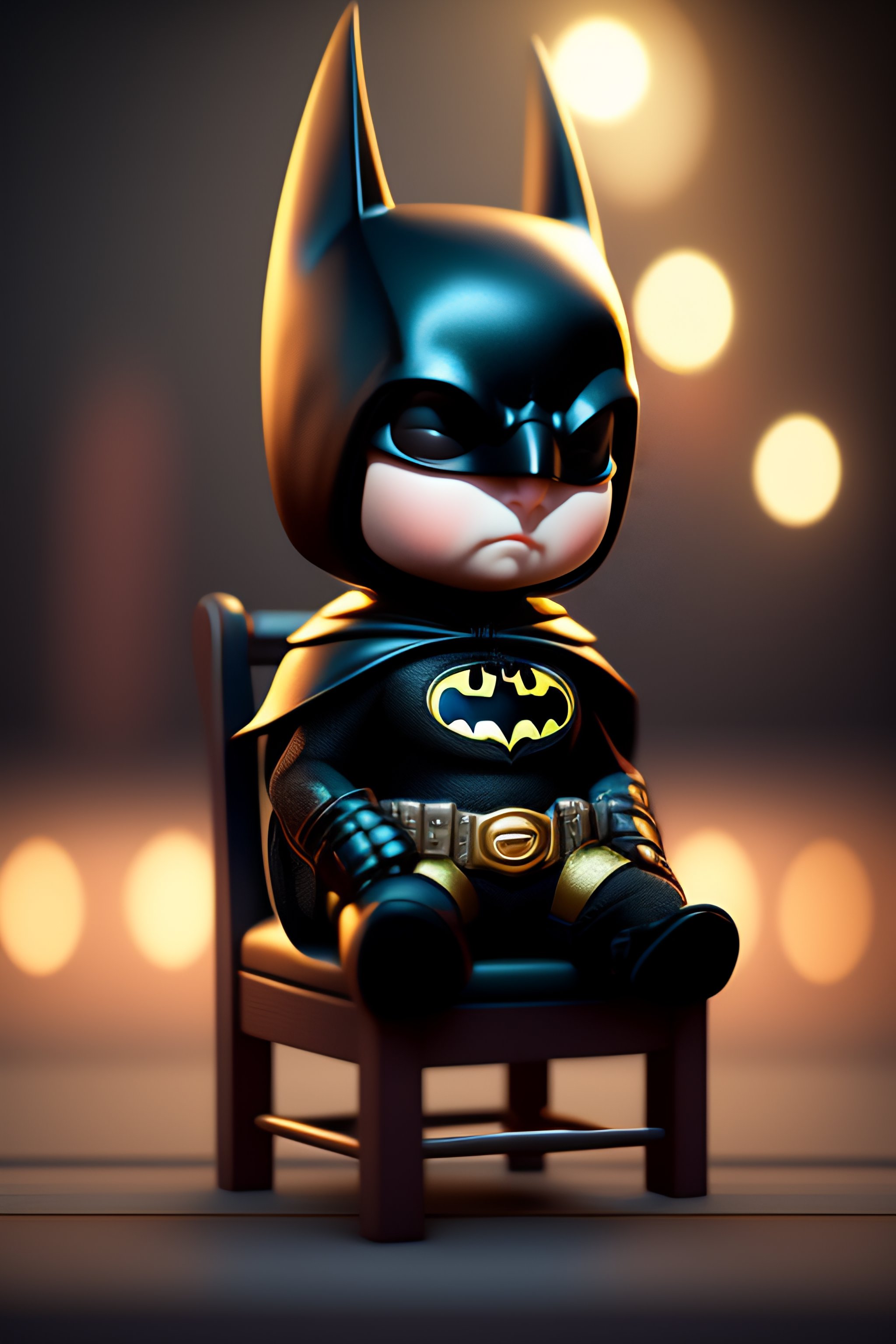 Cute small humanoid batman sitting on a chair, unreal engine, cozy indoor lighting, artstation, detailed, digital painting, cinematic, character design by mark ryden and pixar and hayao miyazaki, unreal 5, daz, hyperrealistic, octane render