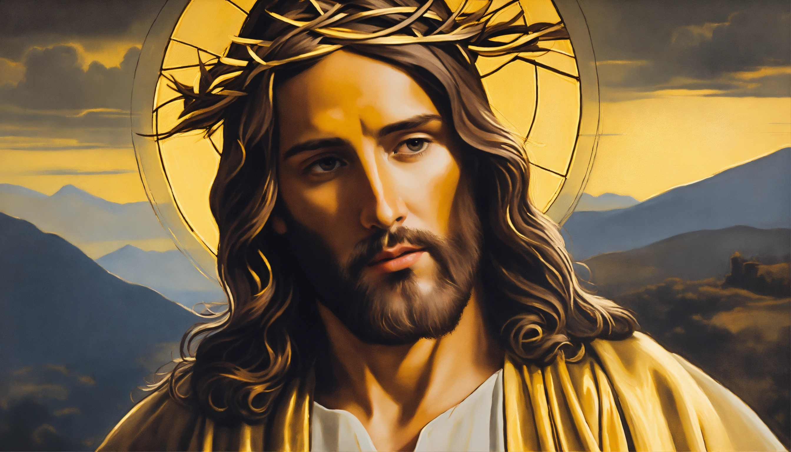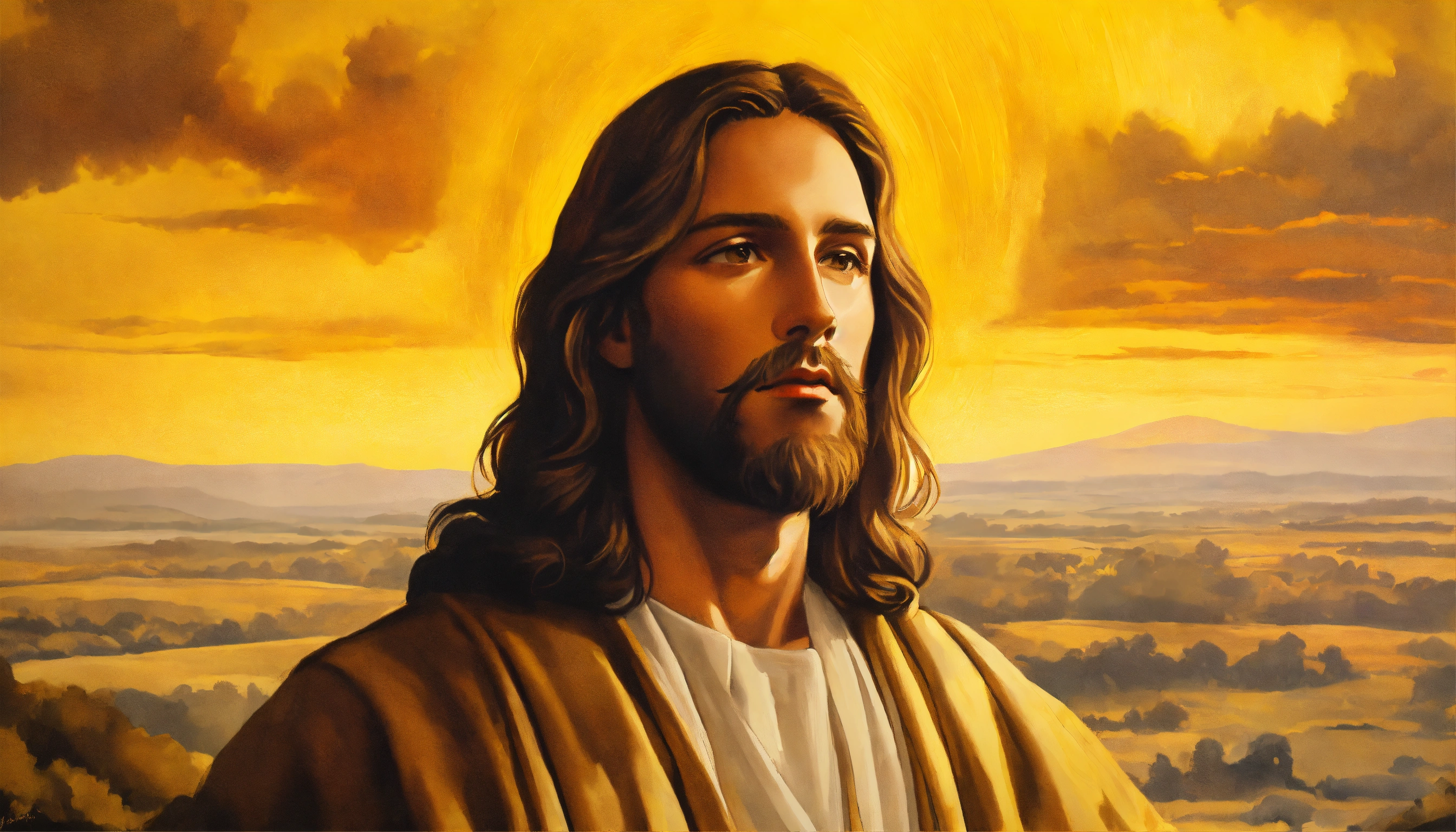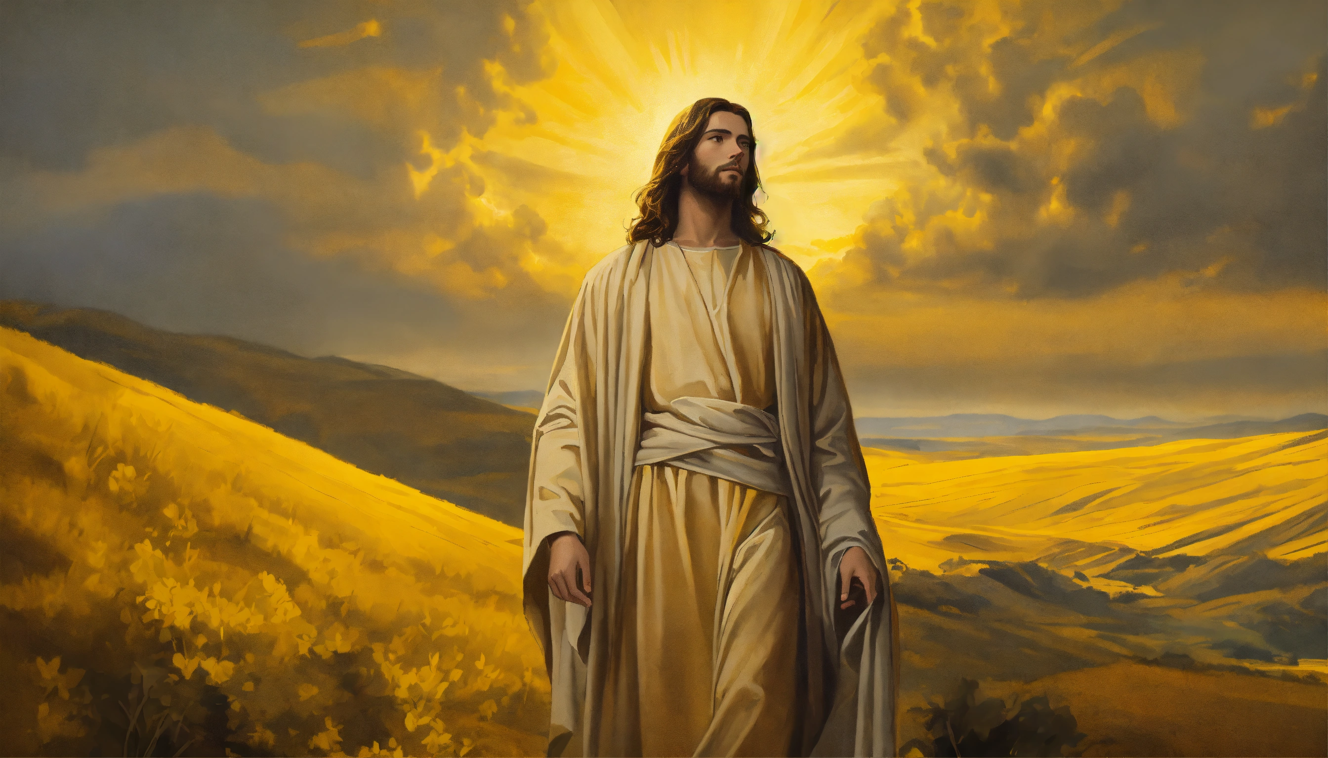 A beautiful picture of a jesus christ portrait on top of a hill, in the style of monochromatic paintings, yellow and gold, multilayered realism, luminous shadowing, painting-inspired, elegant outlines