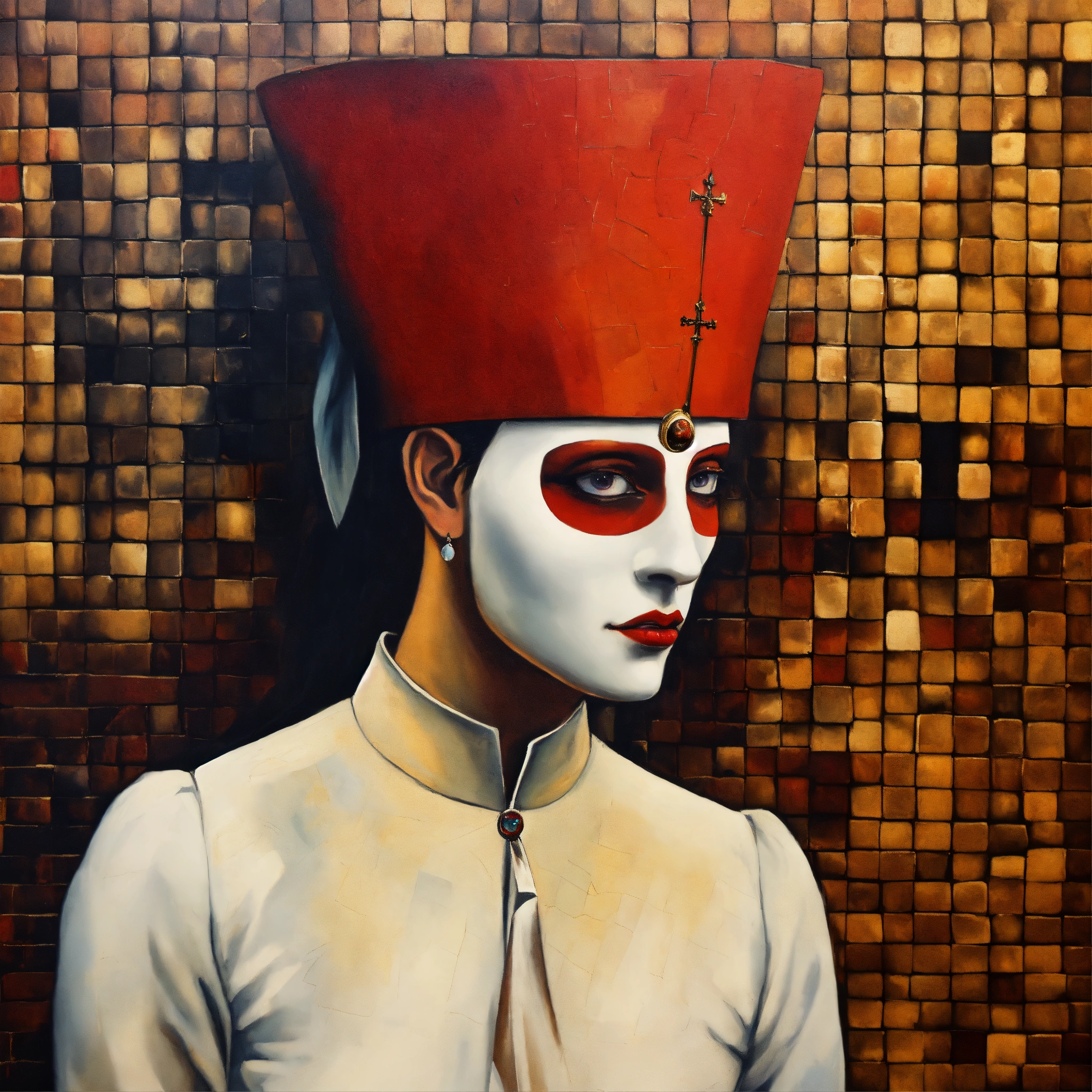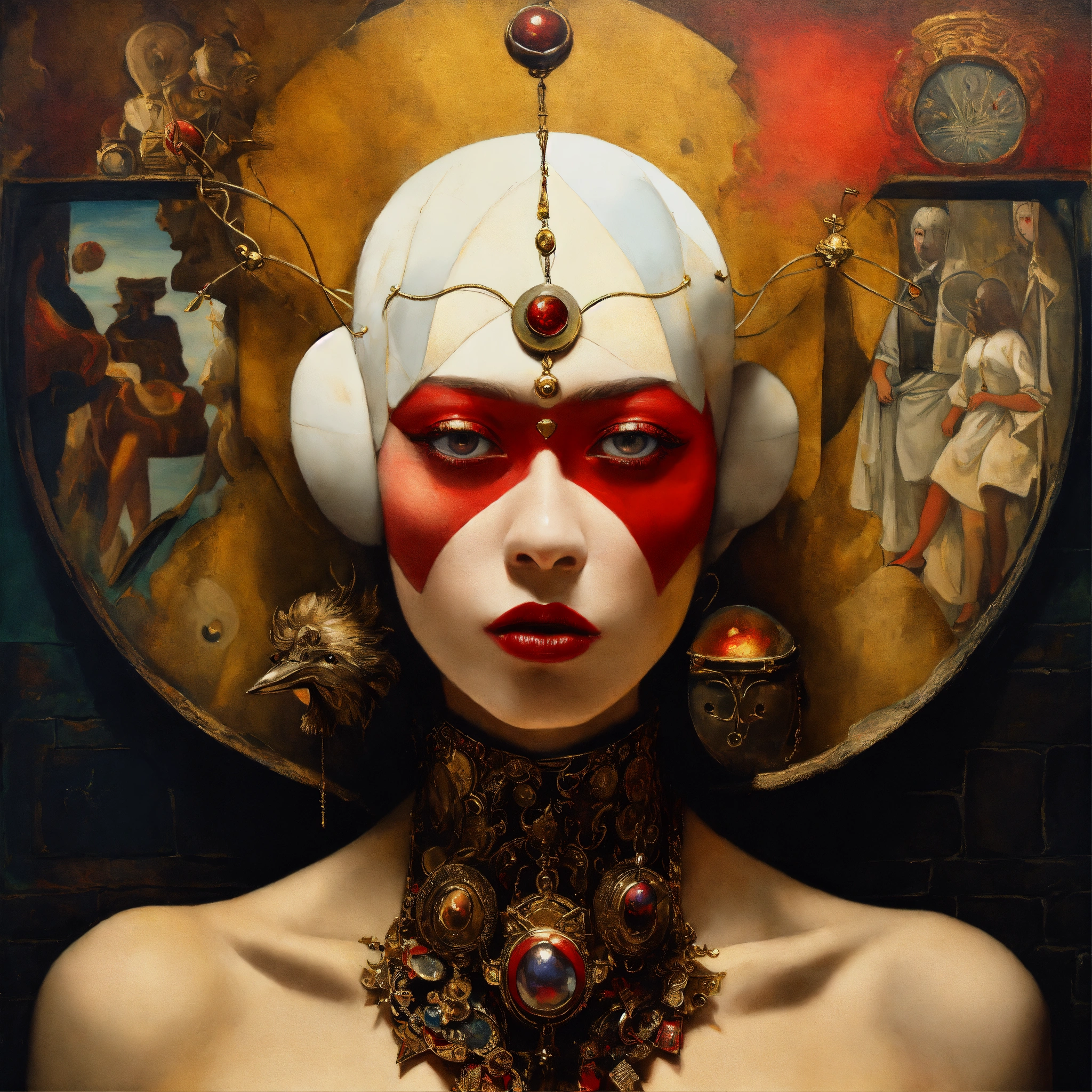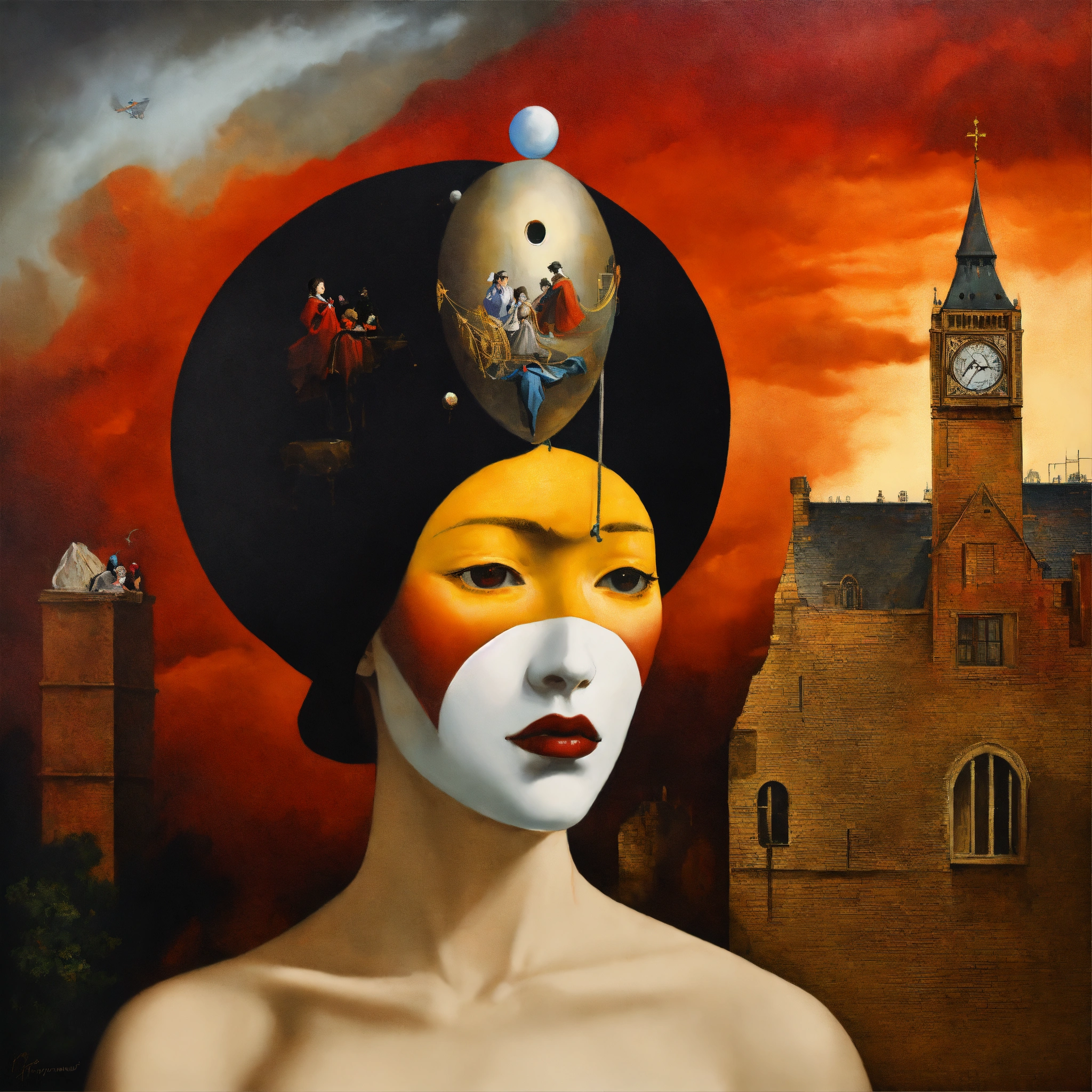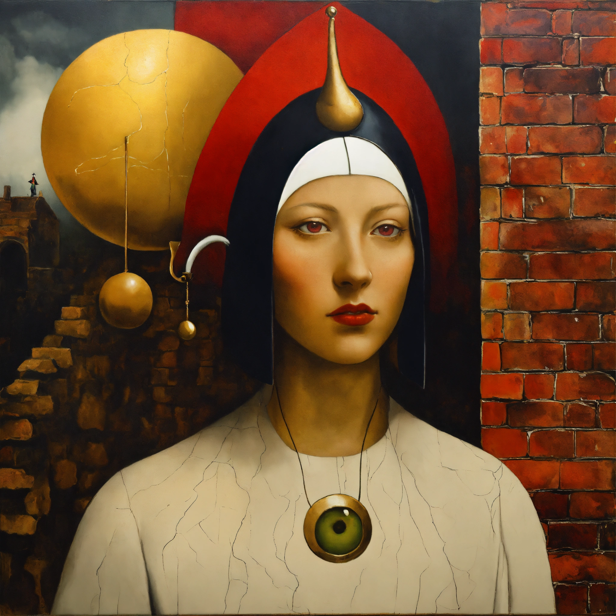 Masterpiece close up painting of a portrait of a diverse couple with bright white face, and women dark black face with red eyes looking straight at you standing in front of an old london brick wall.in the wall is a secret tunnel .hyeronimus bosch surrealism and madness.much more surrealism and crazy designs. with gold and cardinal red surreal salvador dali clouds coming out of her head.more surrealism and bizarre designs with bright vibrant colours.hyeronimus bosch style surrealism