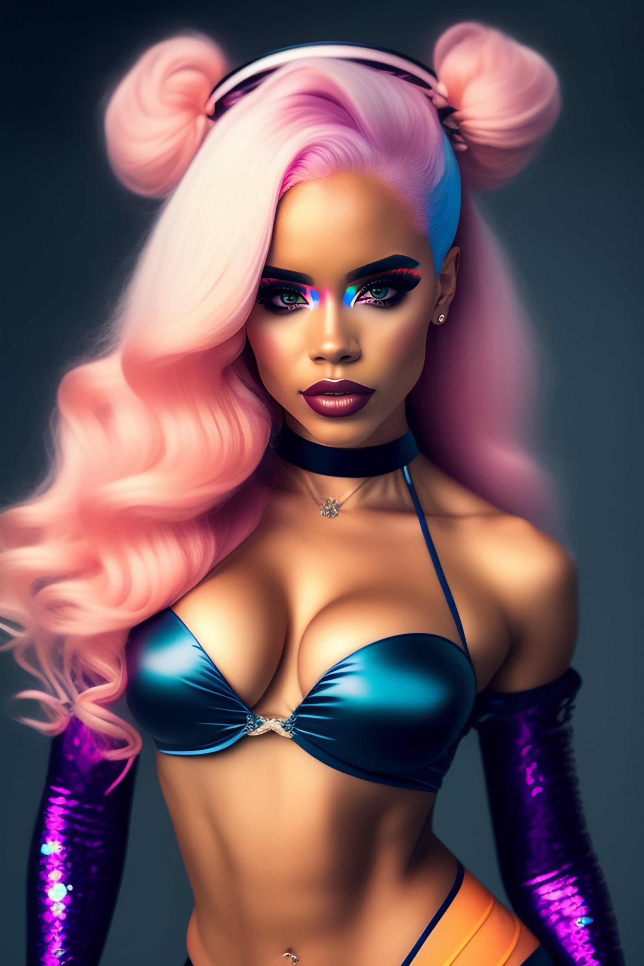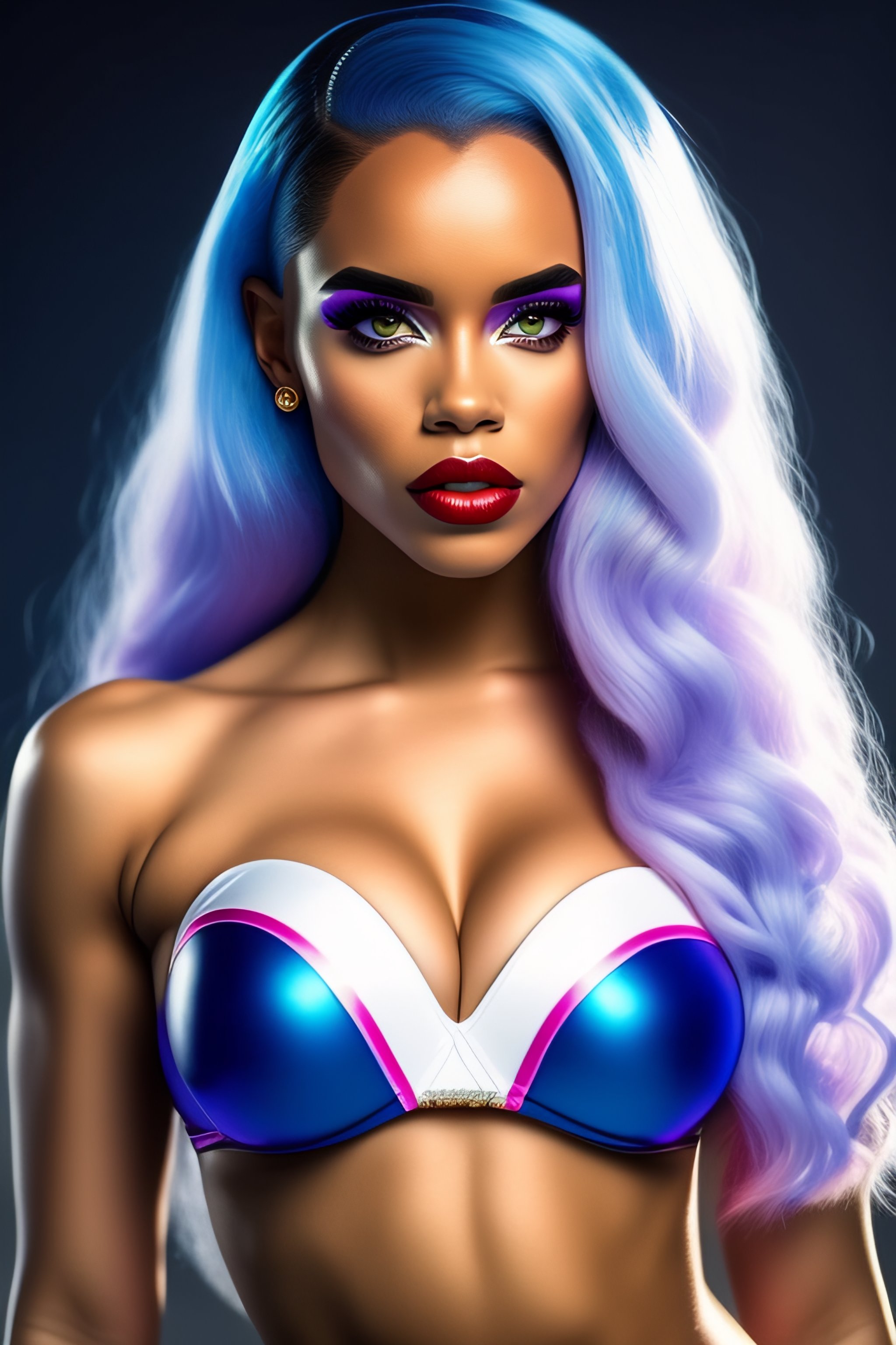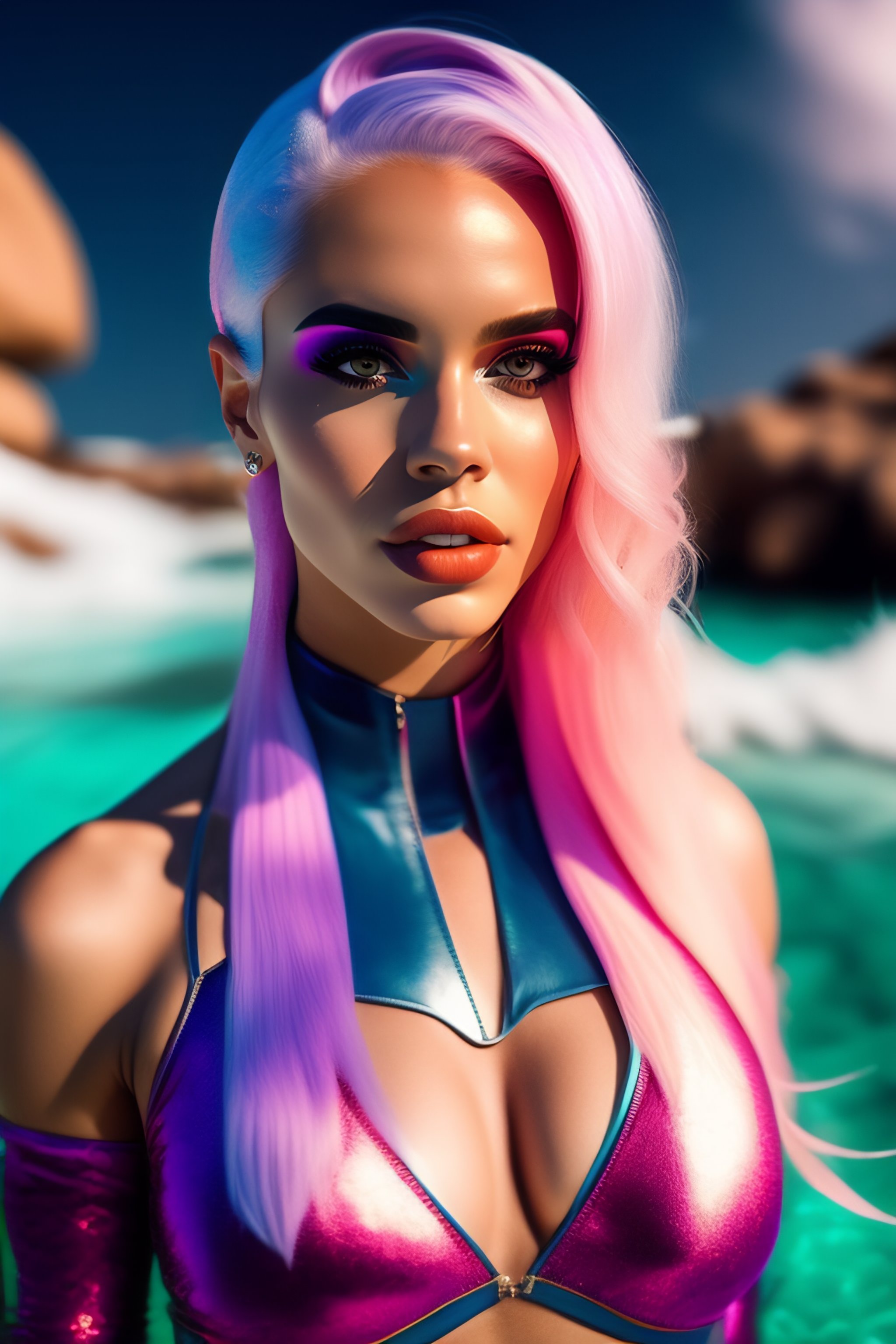 A woman that looks like a fusion of belle delphine and billy eilish in a bikini