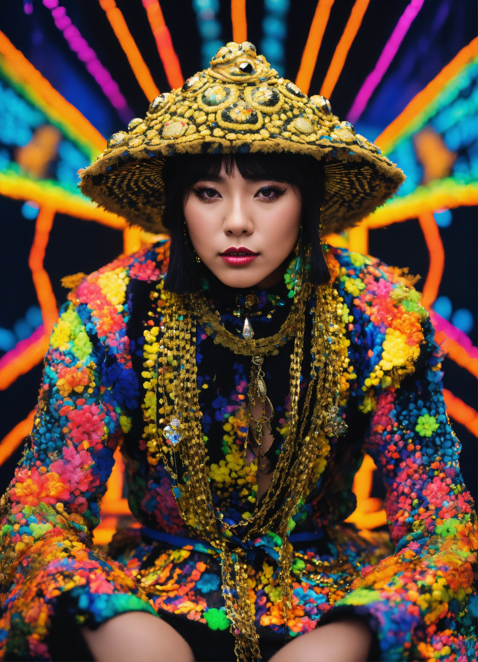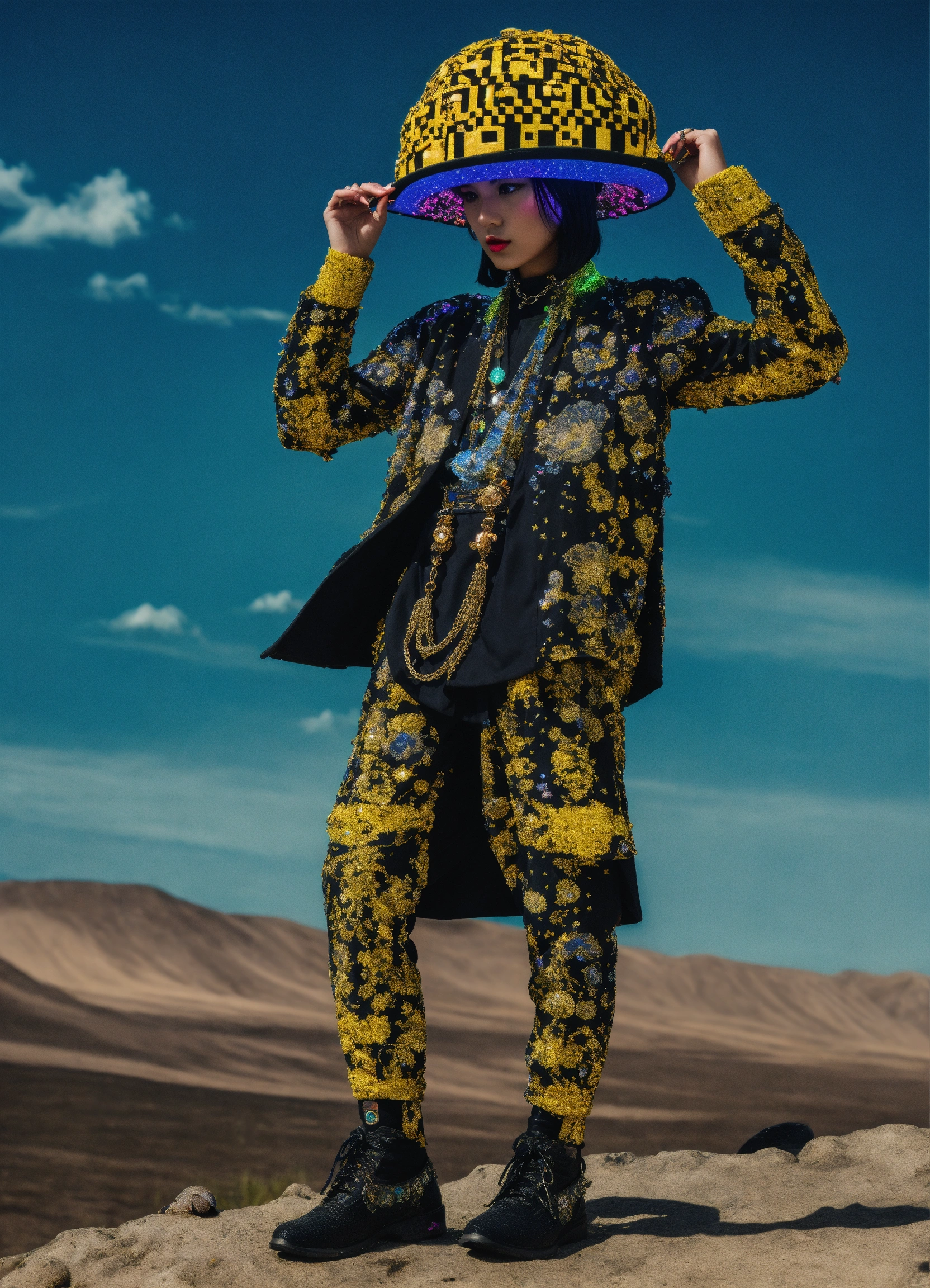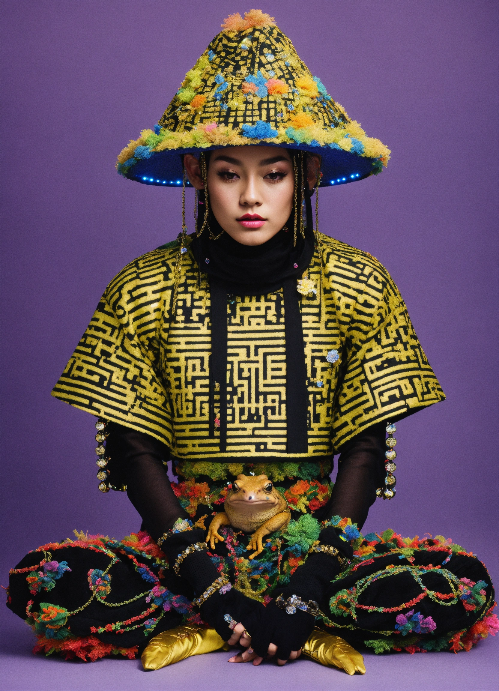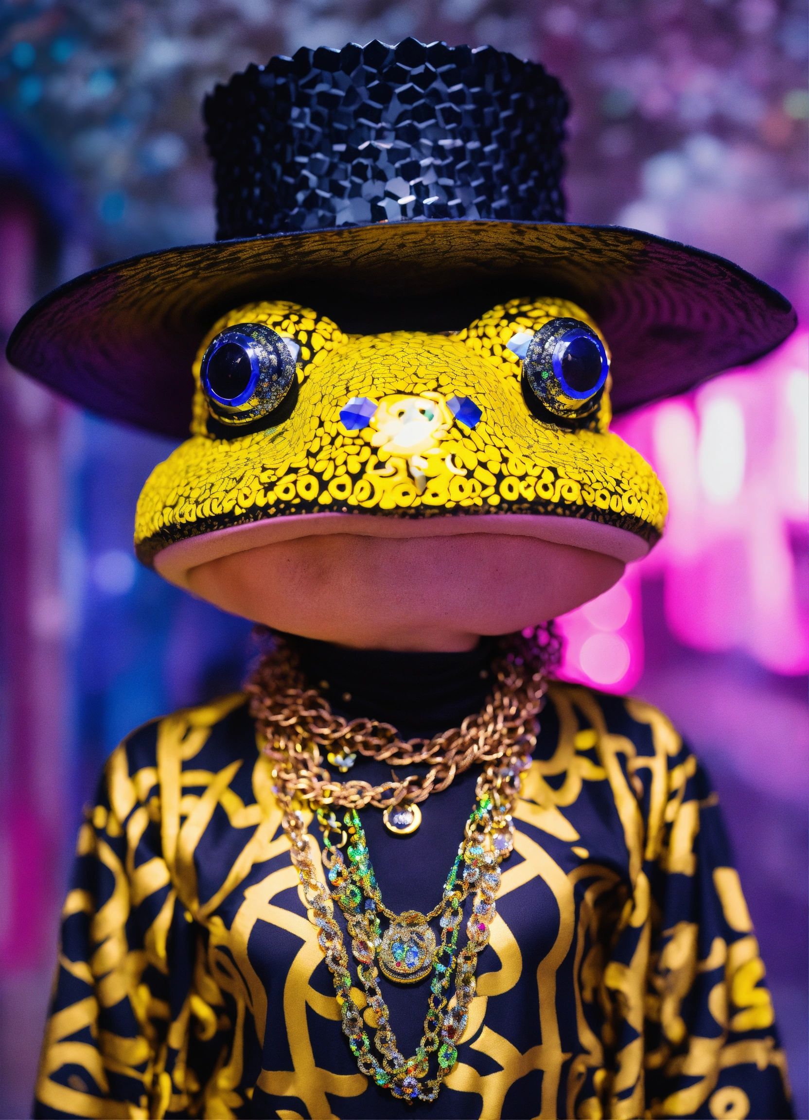 Full body portrait a toad made out of a 3d black and sapphire crystal cloud psychedelic patterned light neon optical illusion, festival raver street wear, kawaii hat with crystal hemp gold black chains, ninja qr code samurai in folk costume in a fashion magazine