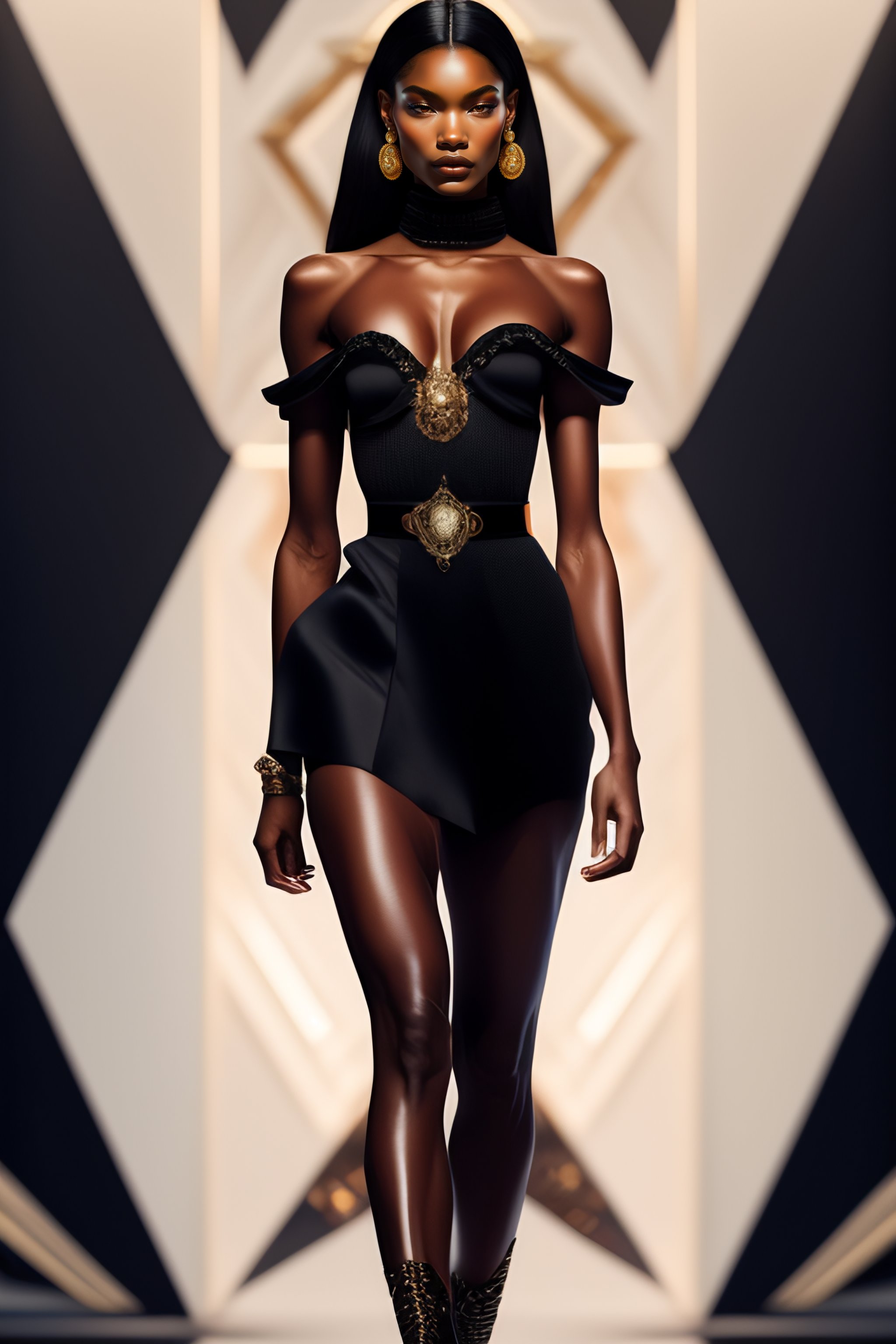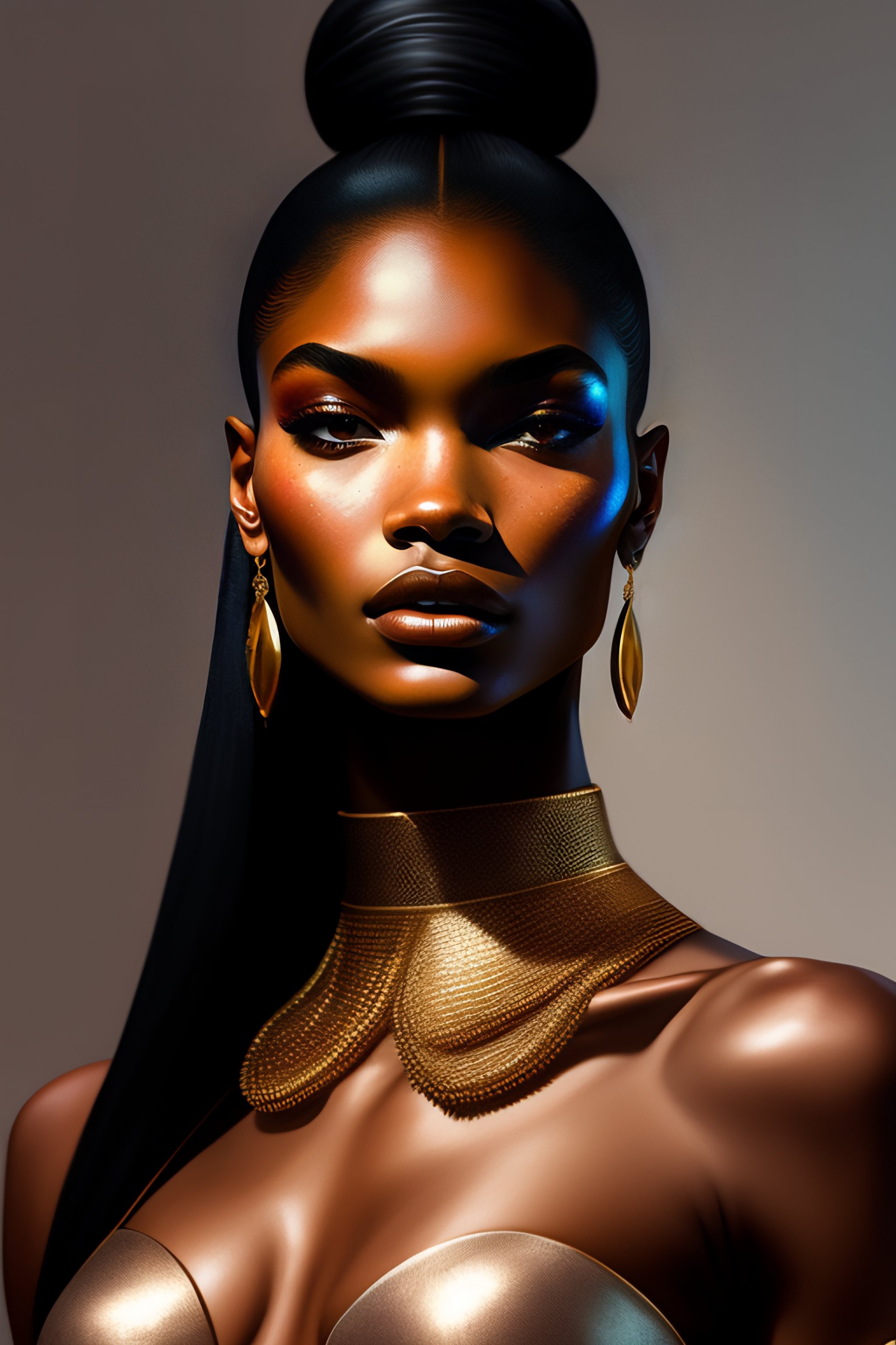 Full body potrait thin muscular chanel iman as black emrald queen, highly detailed, digital painting, artstation, concept art, smooth, sharp focus, illustration, art by tian zi and wlop and alphonse mucha