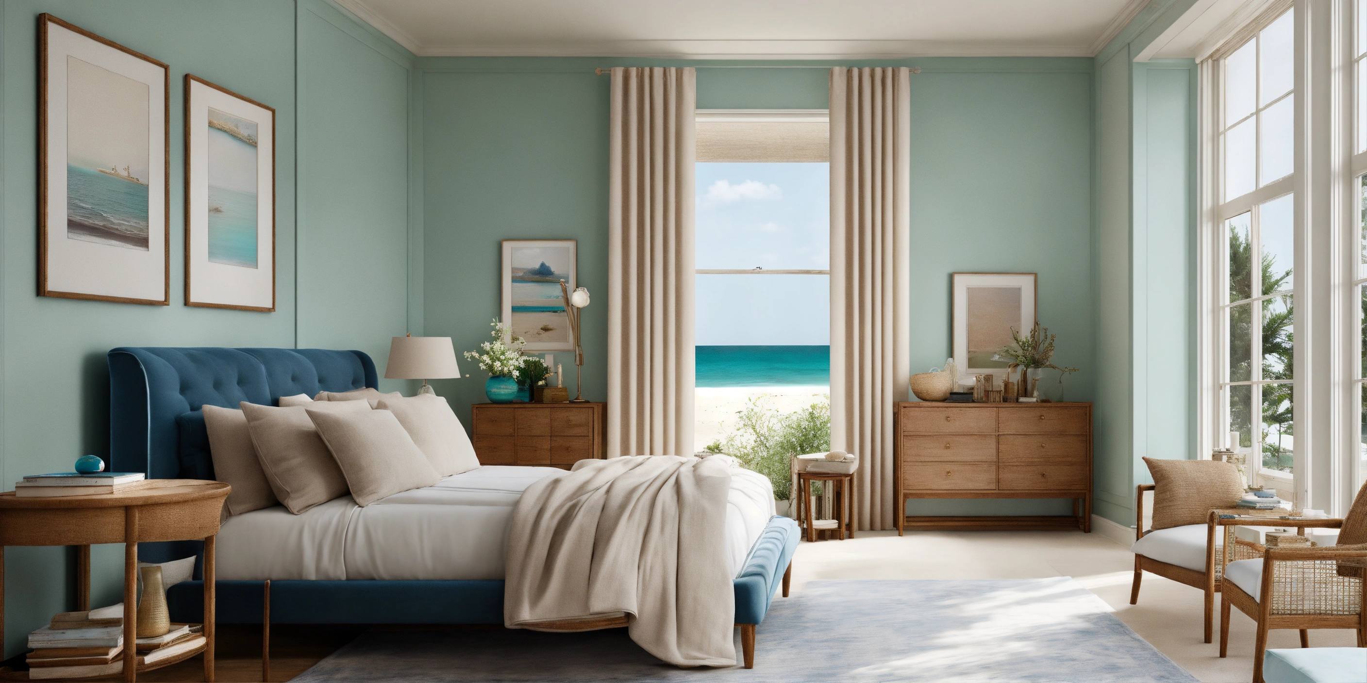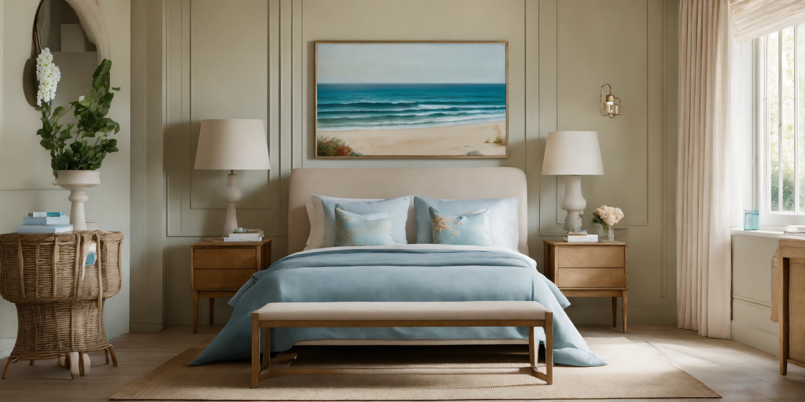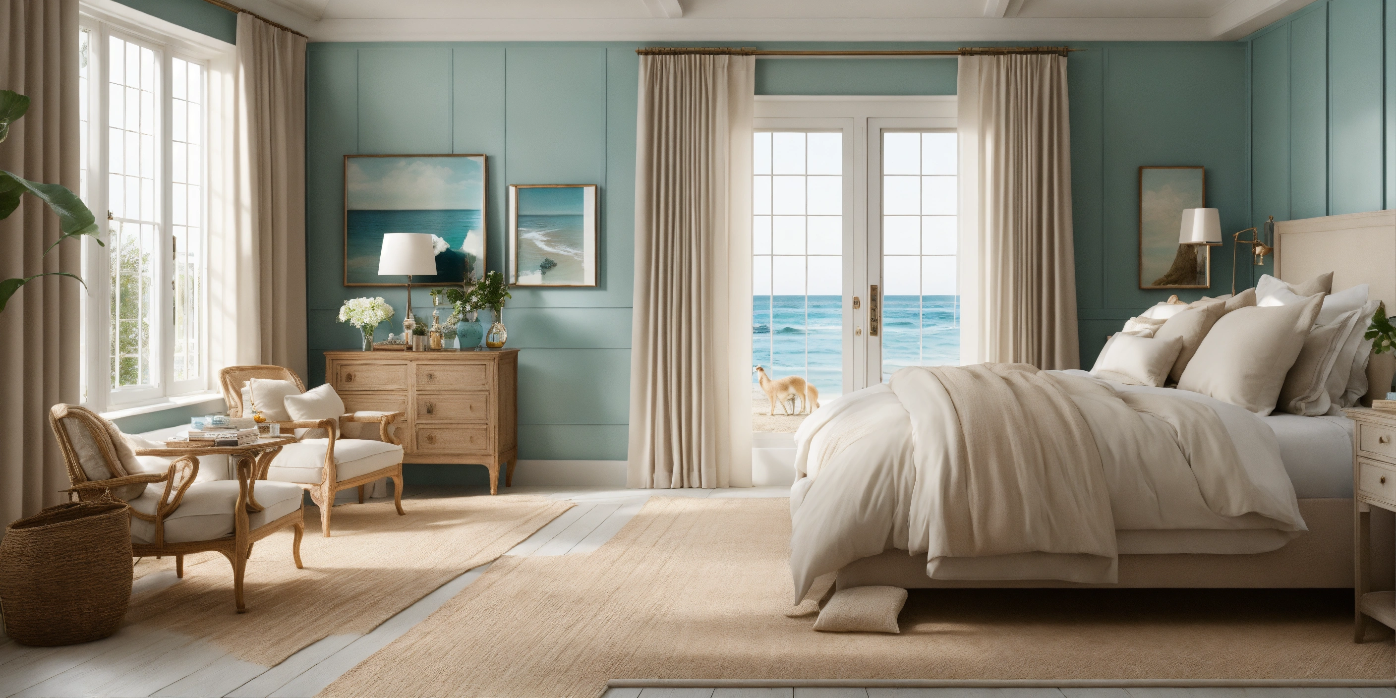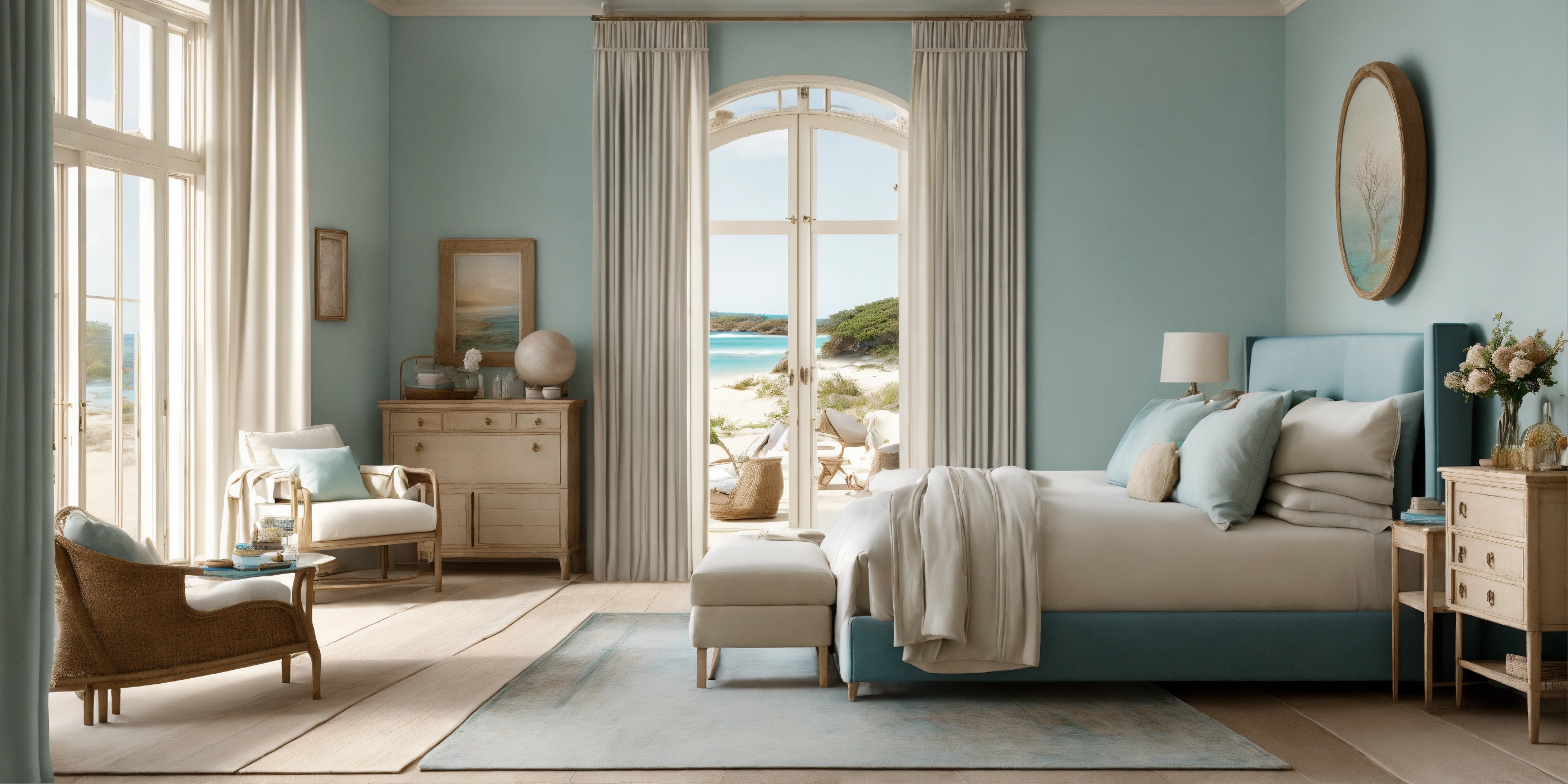 Hyper-photo realistic 8k classic hamptons style luxurious beachside bedroom painted in farrow and balls pale powder paint walls, and in an open light-filled space, the hues should evoke the feeling of ocean spray and sandy beaches