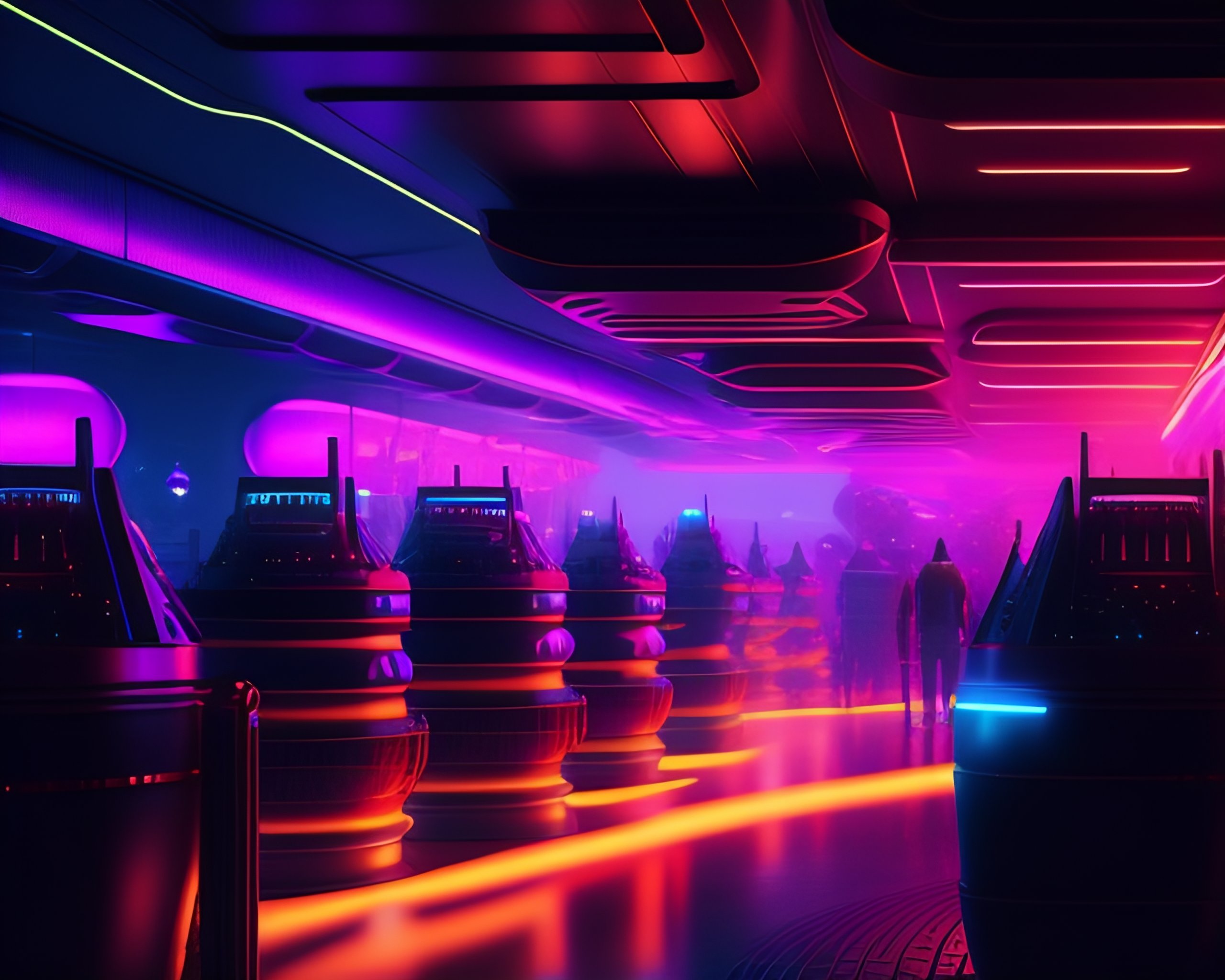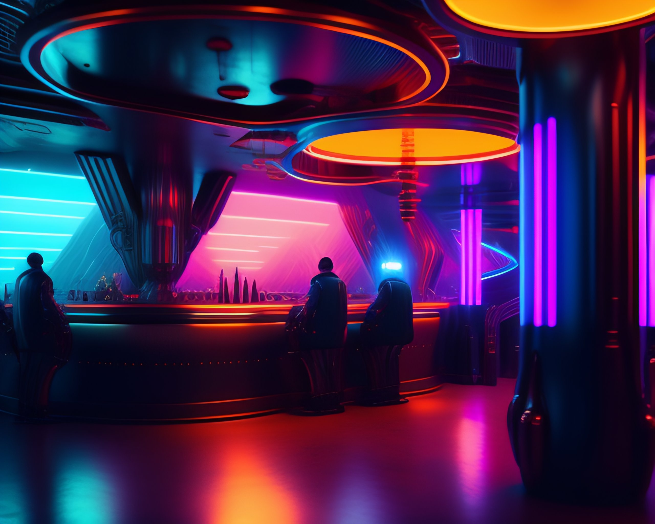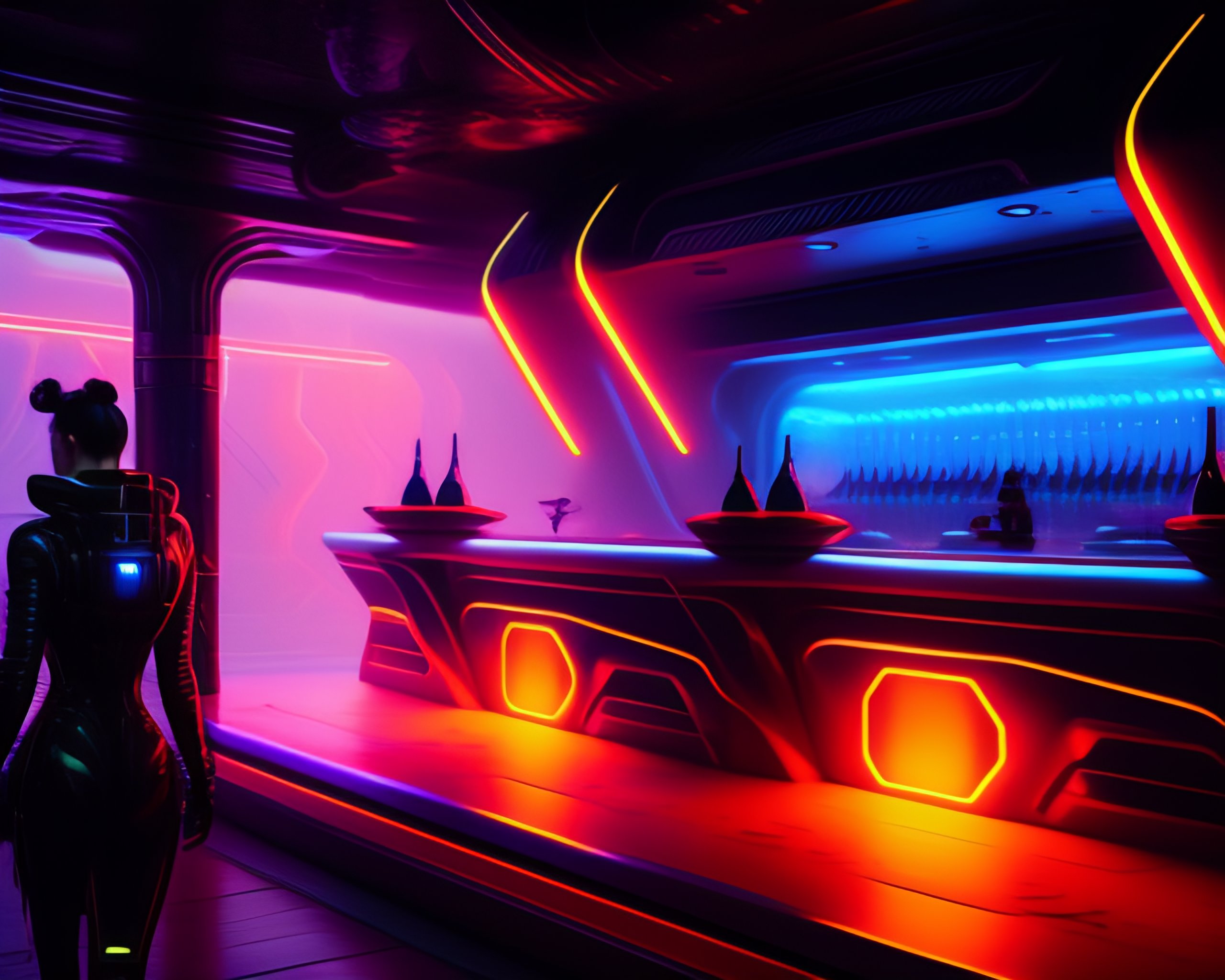 Alien biomechanical, full body cinematic style digital art render with mechanical and futuristic details in a cyberpunk underworld, sci-fi bar, moody atmospheric lighting, techno horror, dangerous, art by romain trystram