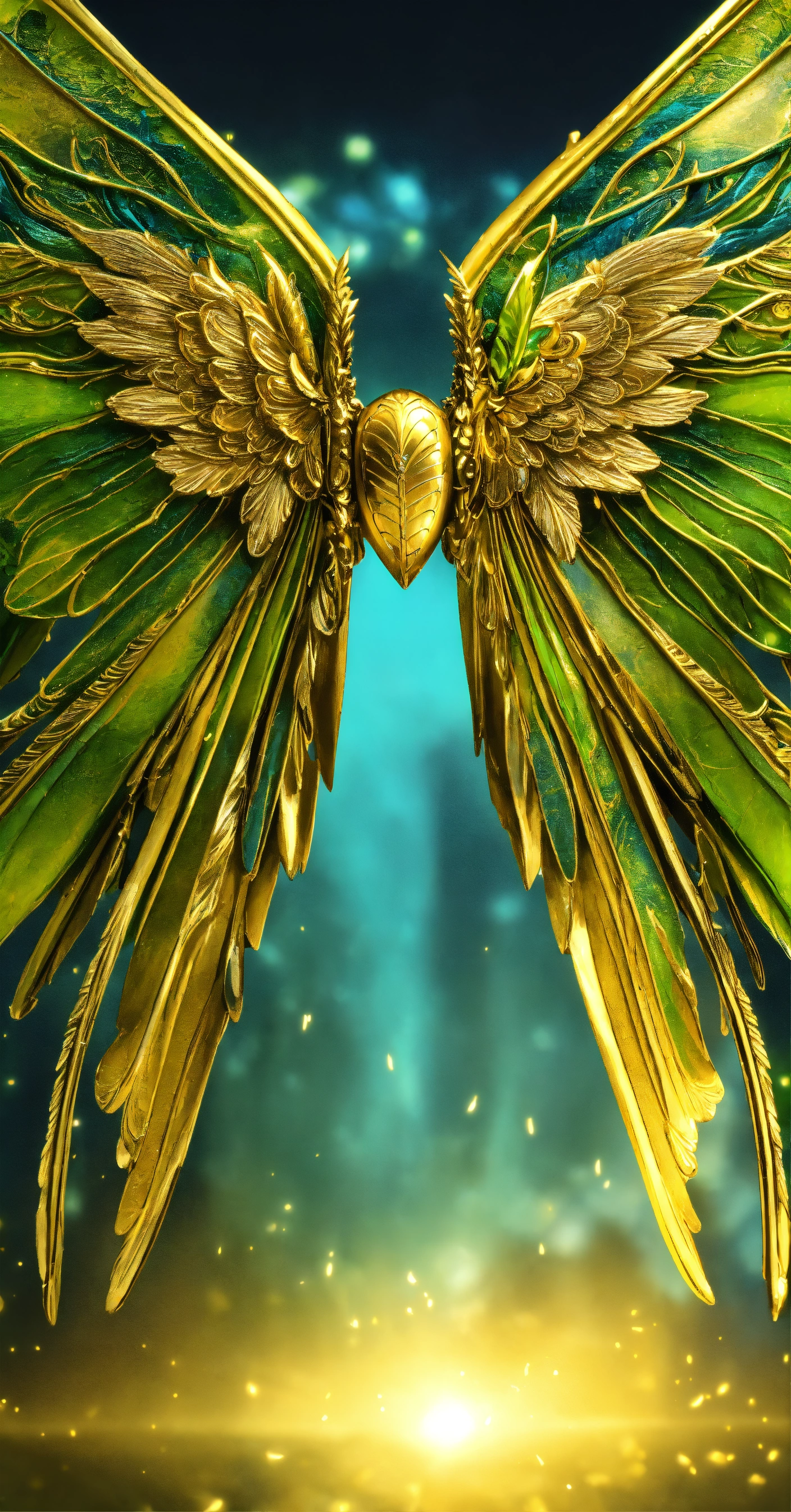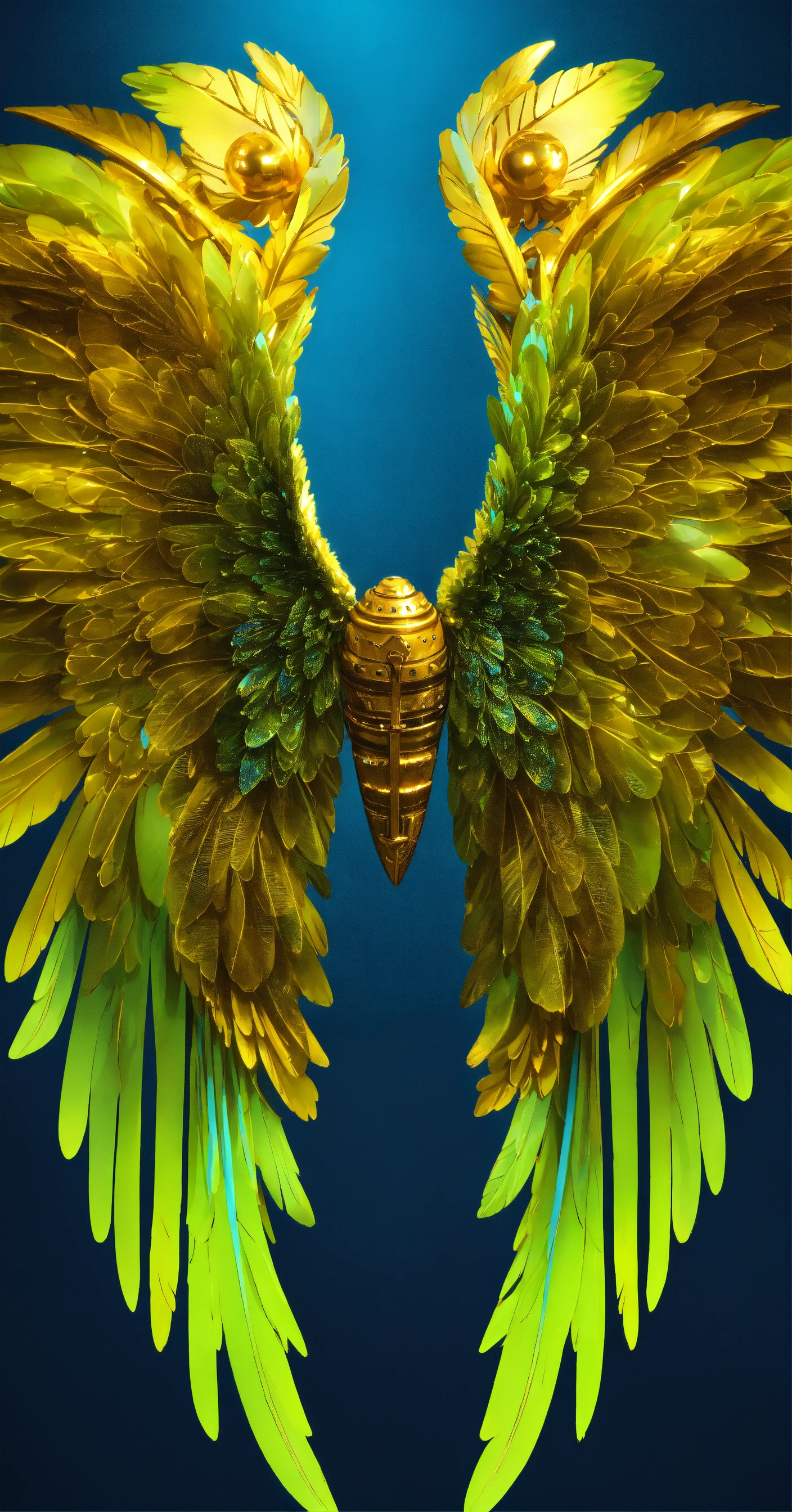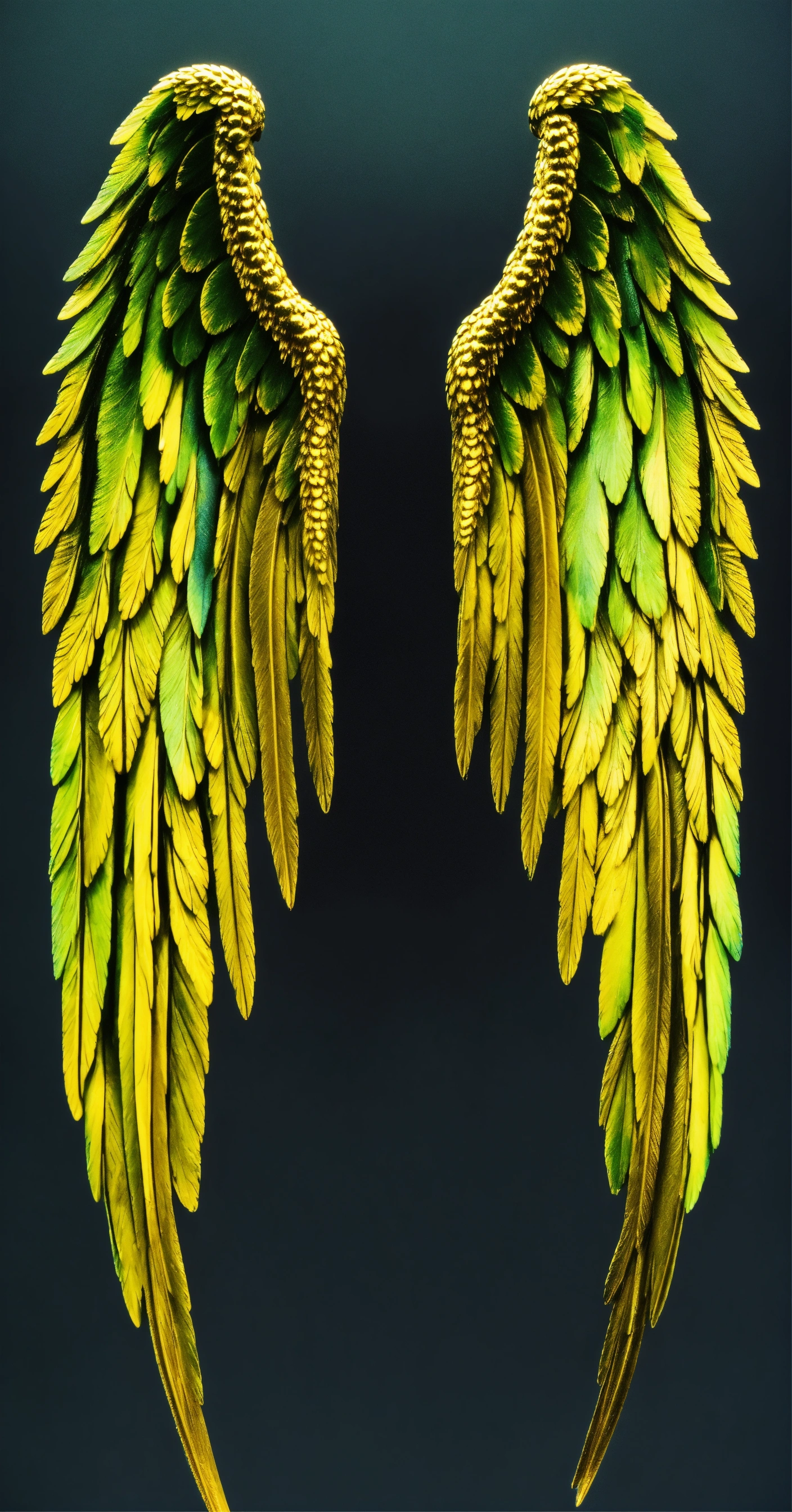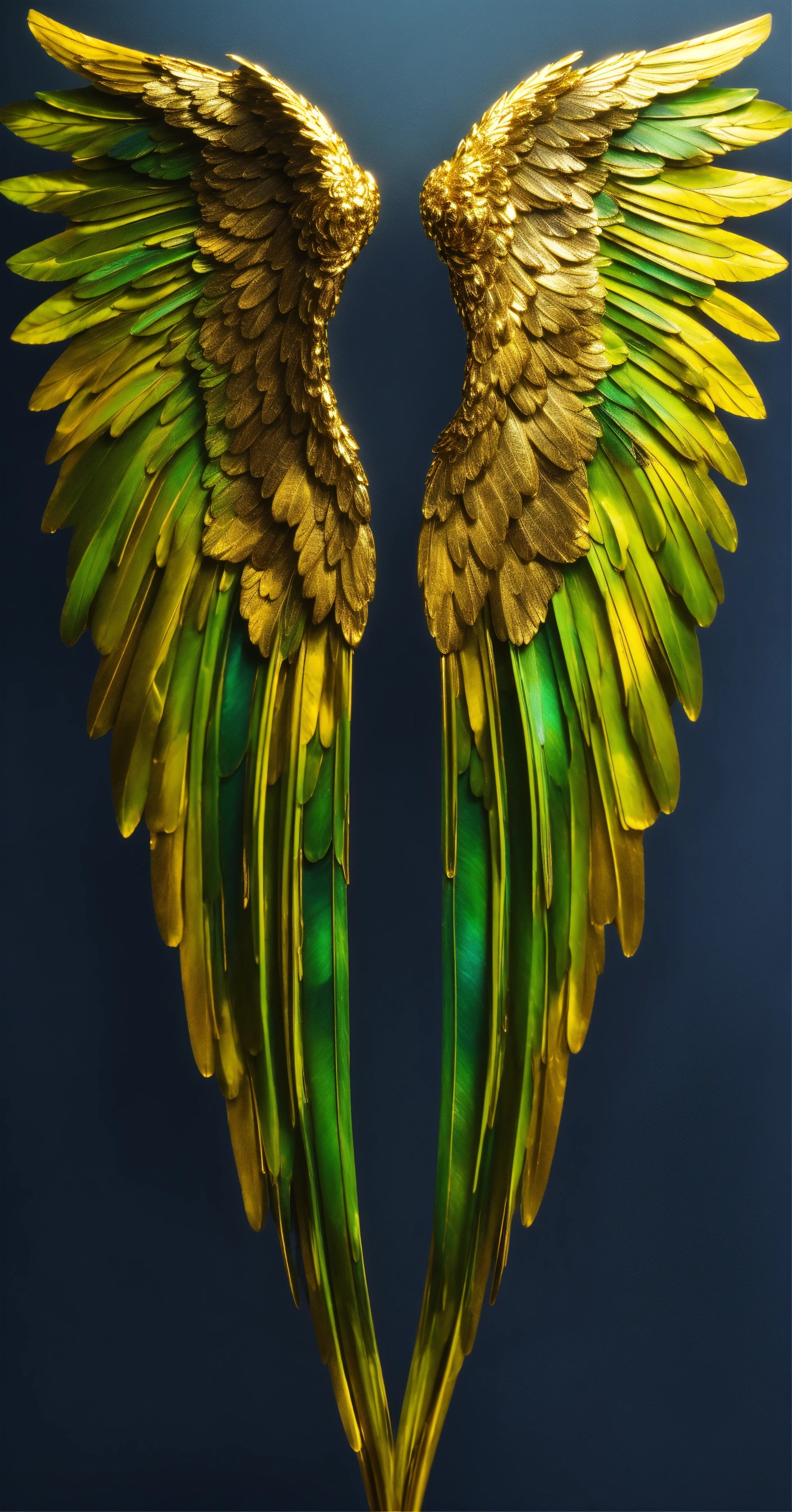 Beautiful and perfect small angel wings in yellow with detailed and defined gold and at the same time some green details. just a pair of small yellow wings with small, complete green. hyper-detailed and hyper-realistic wings. wings with a slight decoration in shades of yellow and gold and green details. small wings complete both the right wing and the left wing, the background is dark blue, 3d, masterpiece. hd. realism. high resolution. high quality. digital art. 8k