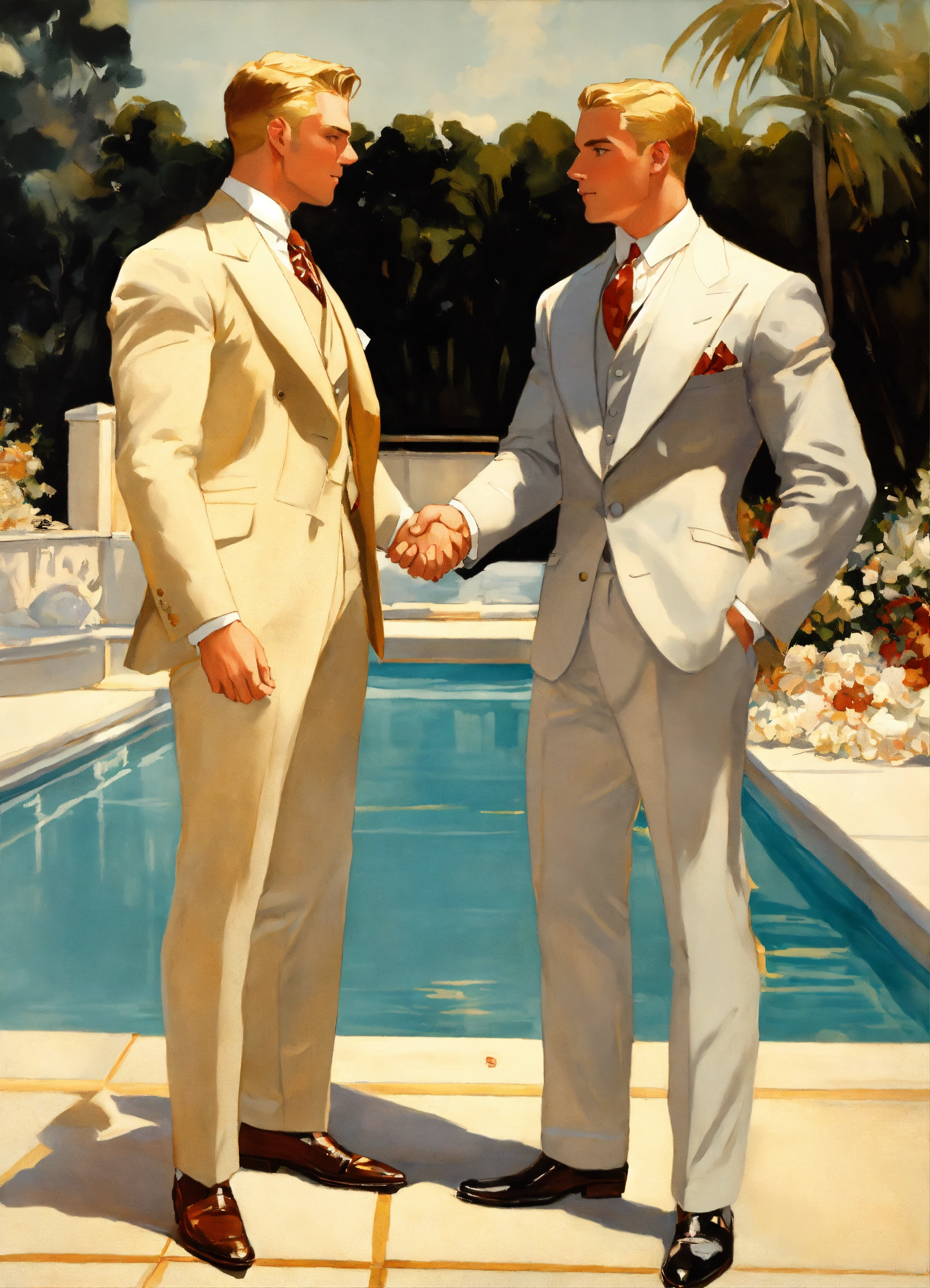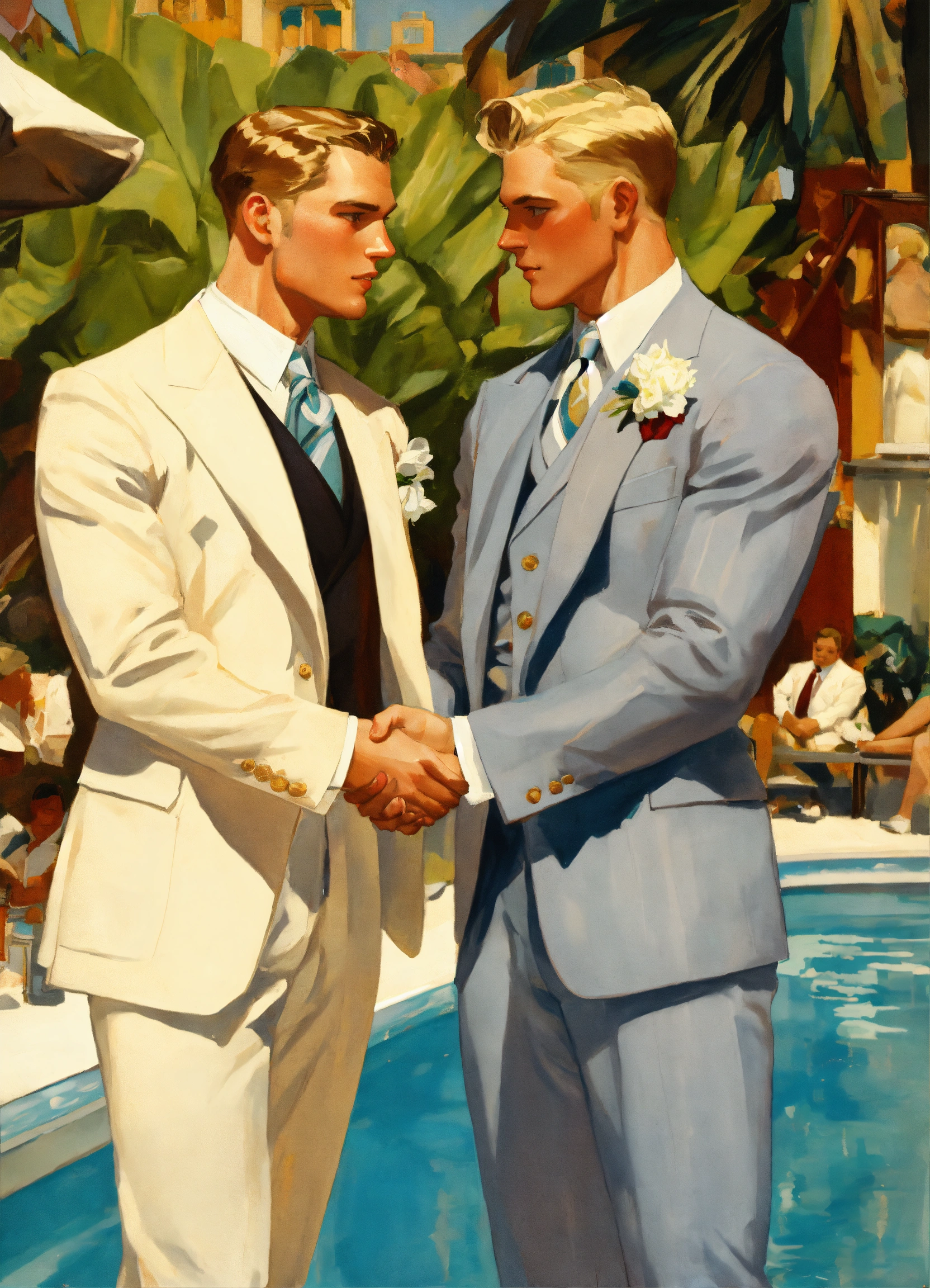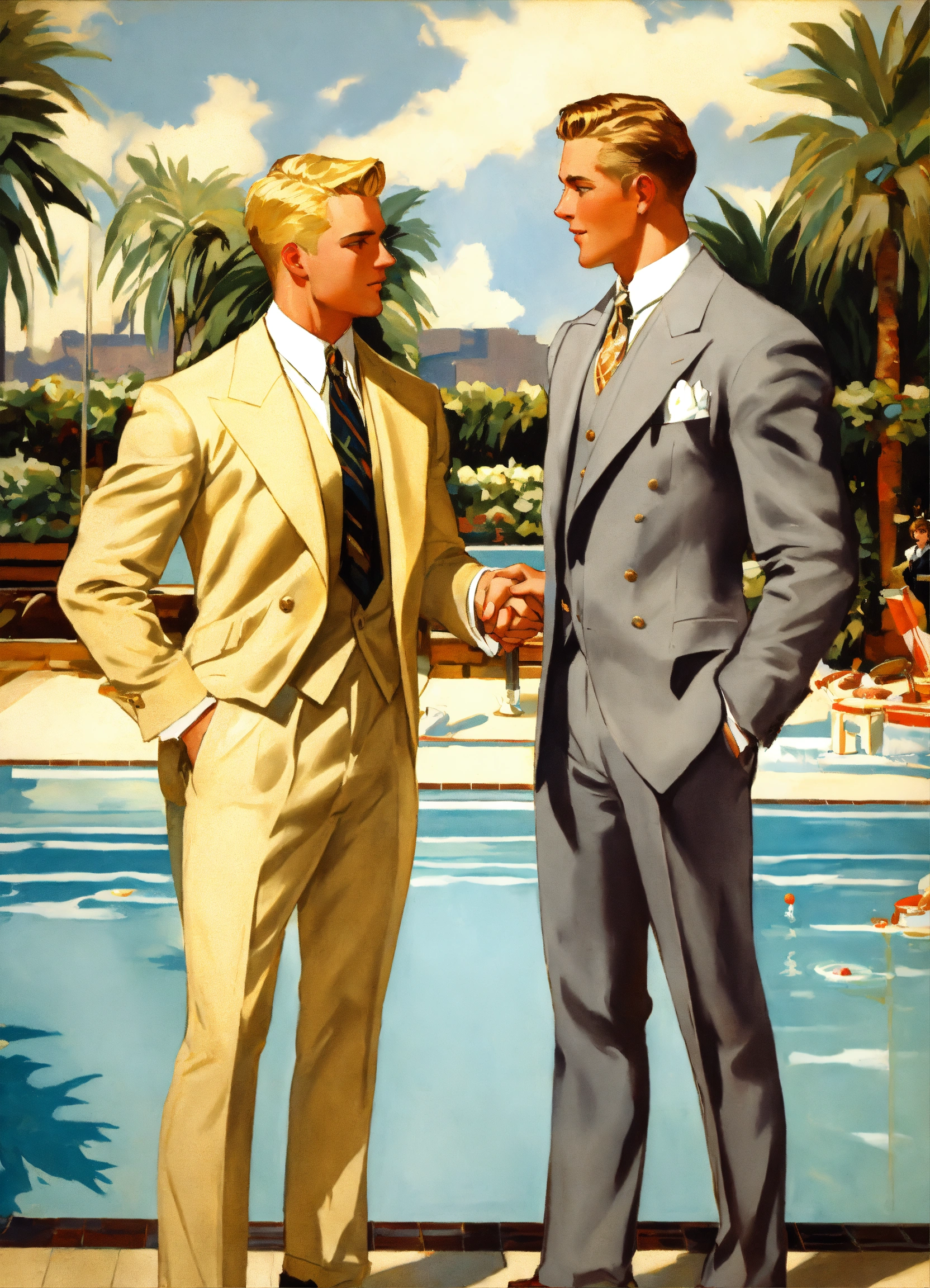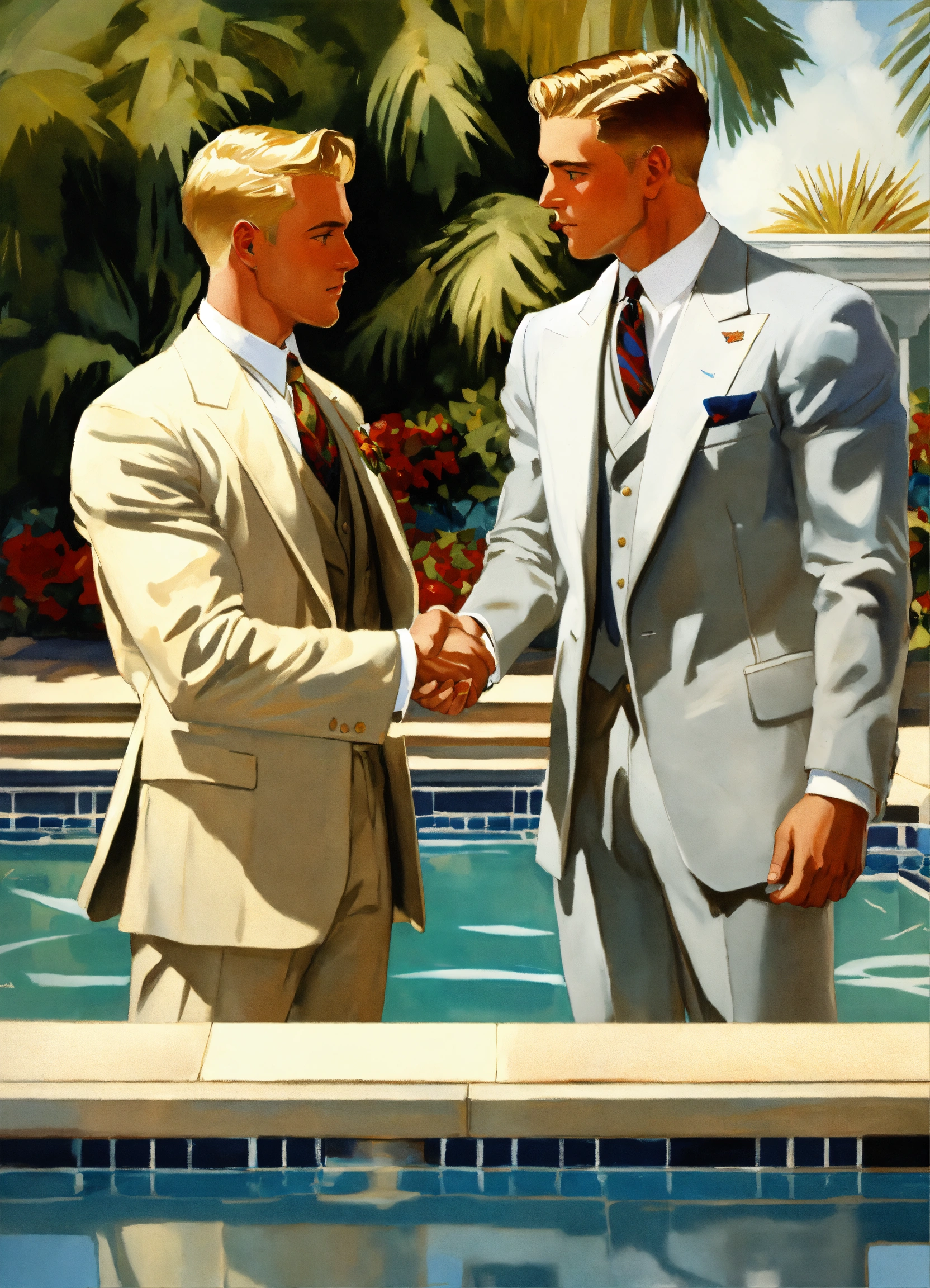Two blonde muscled sportsmen in light grey vested suit and club tie, shaking hands by a pool, leyendecker style