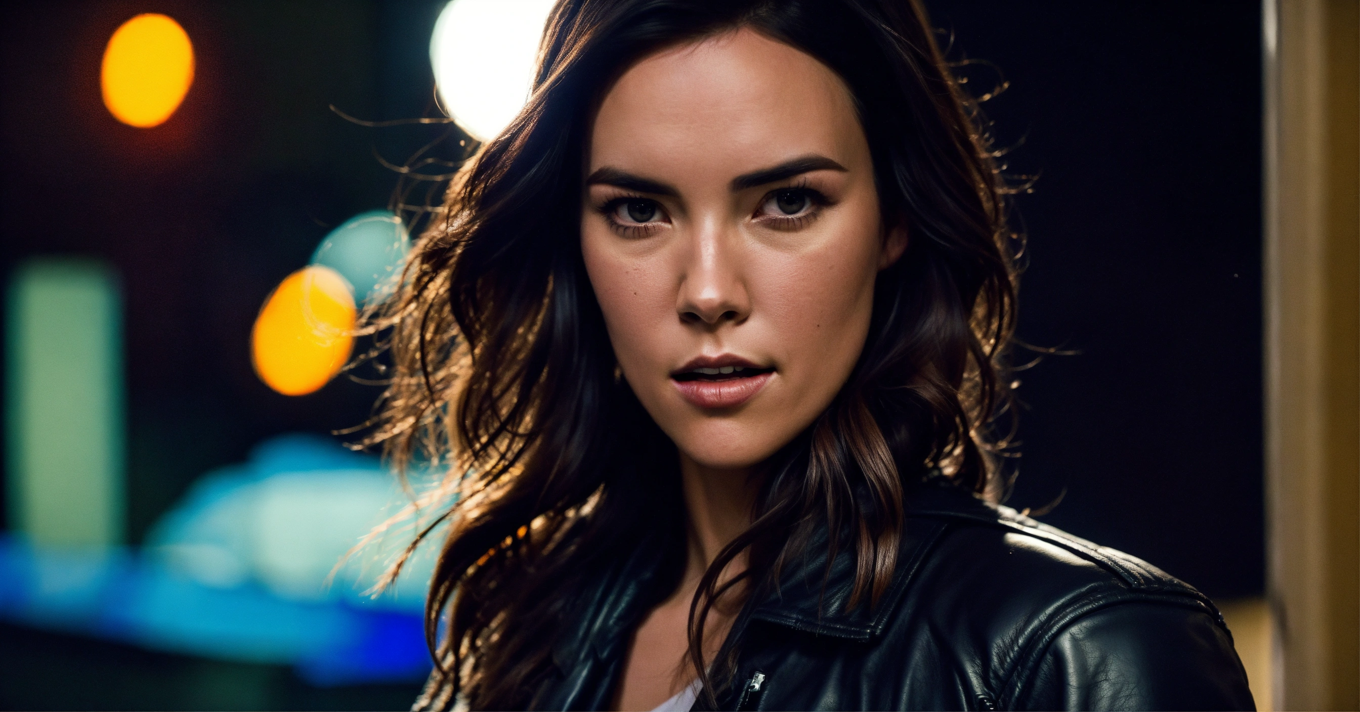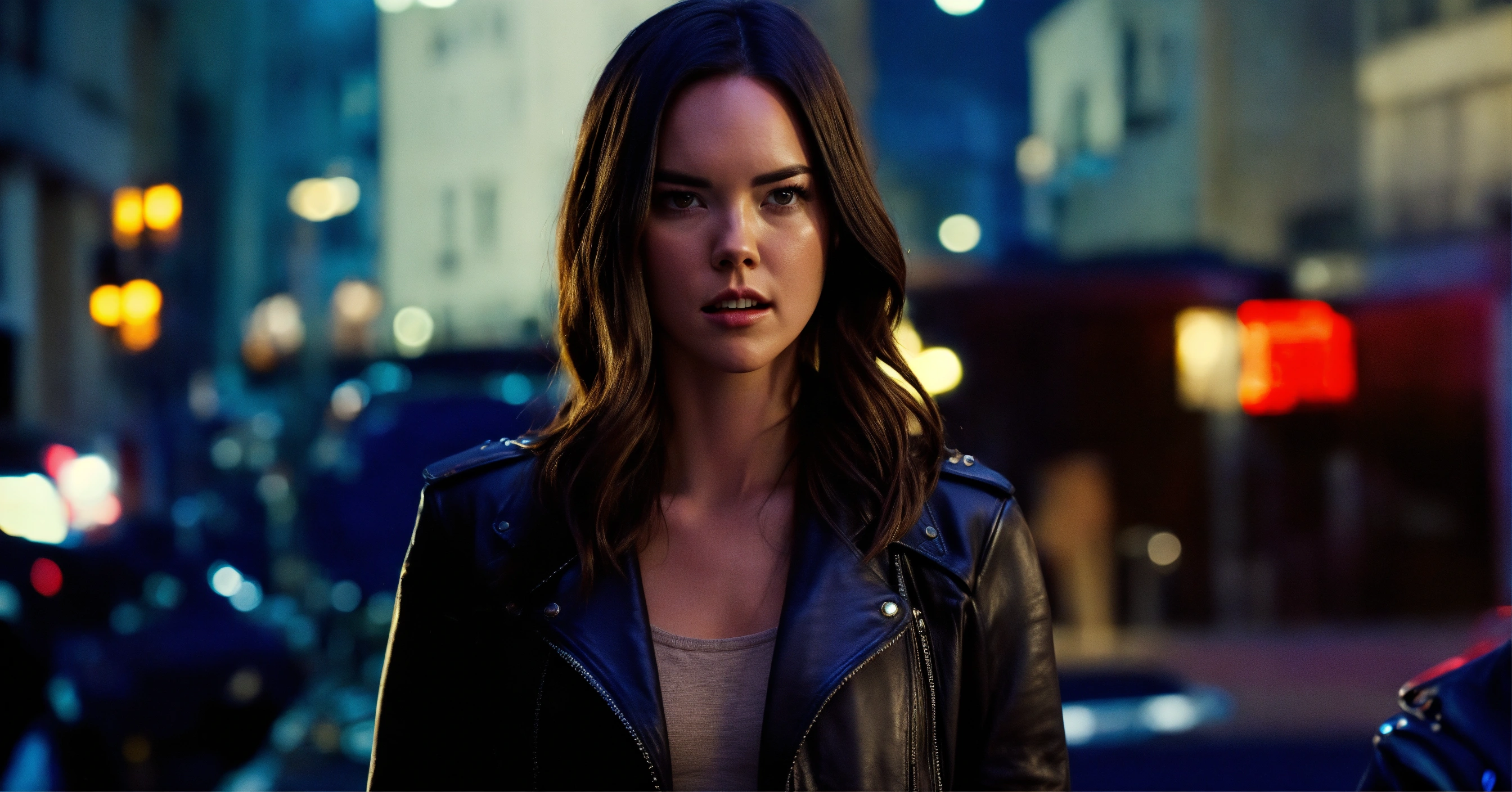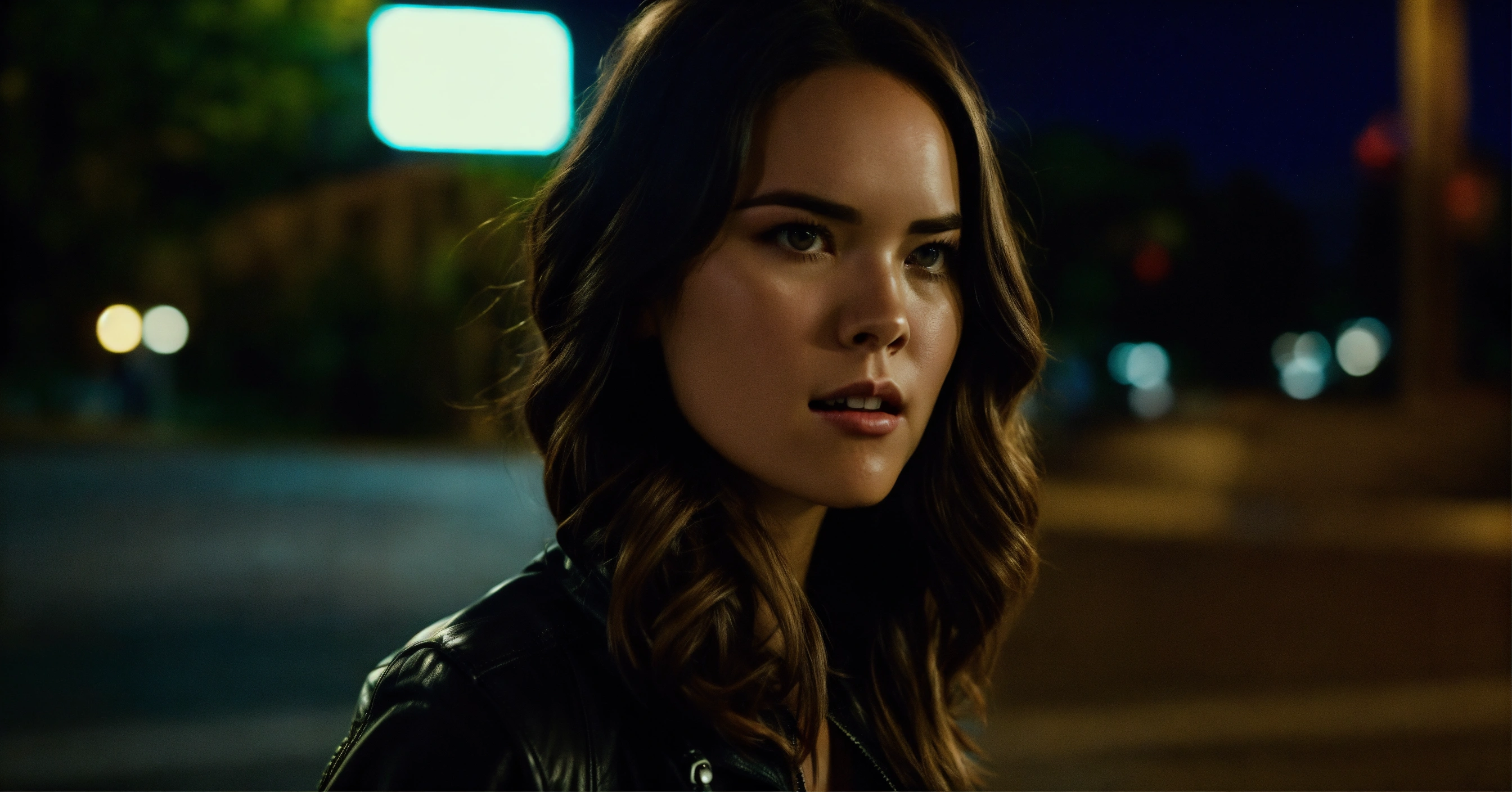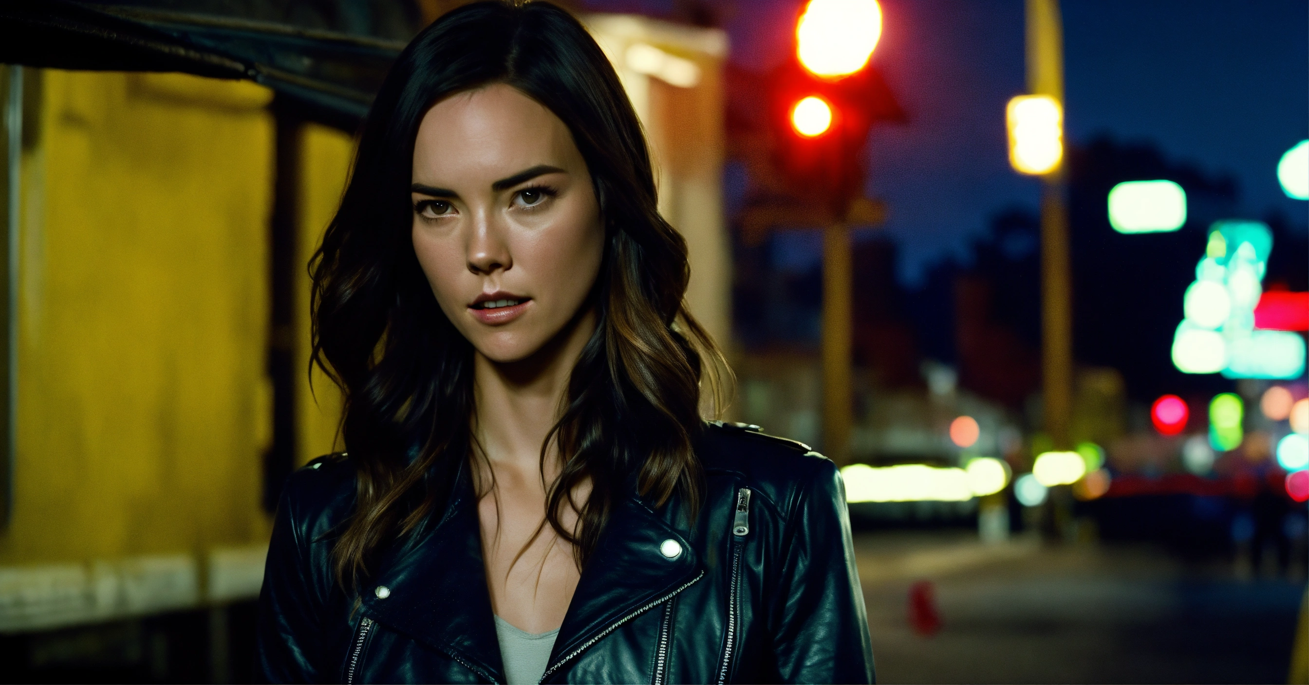 Beautiful 27 years old odette annable, cute big eyes, crime survival serial killer victim, suspenseful, night, city, life-or-death situation, leather jacket, cinematic, realistic walk, closed mouth