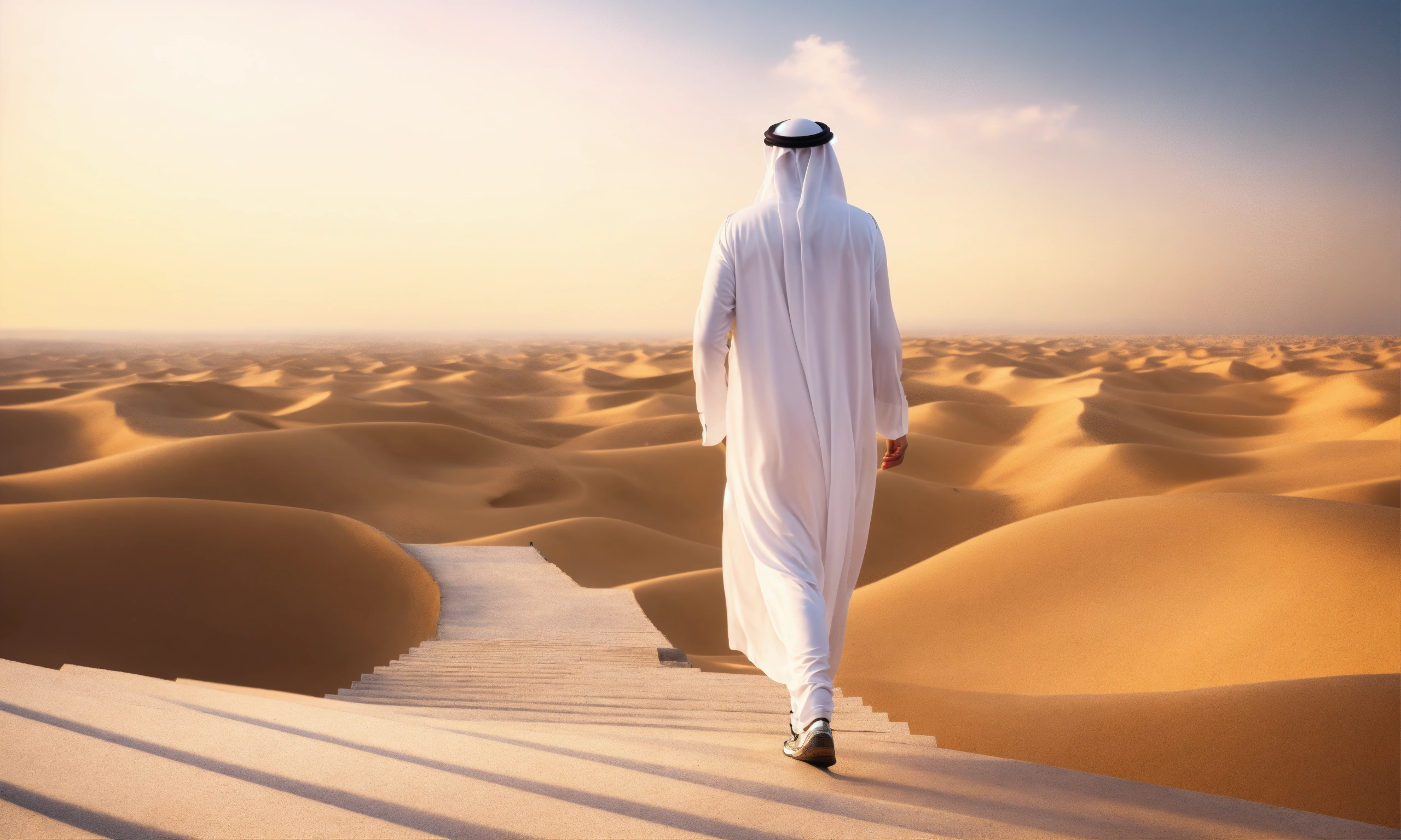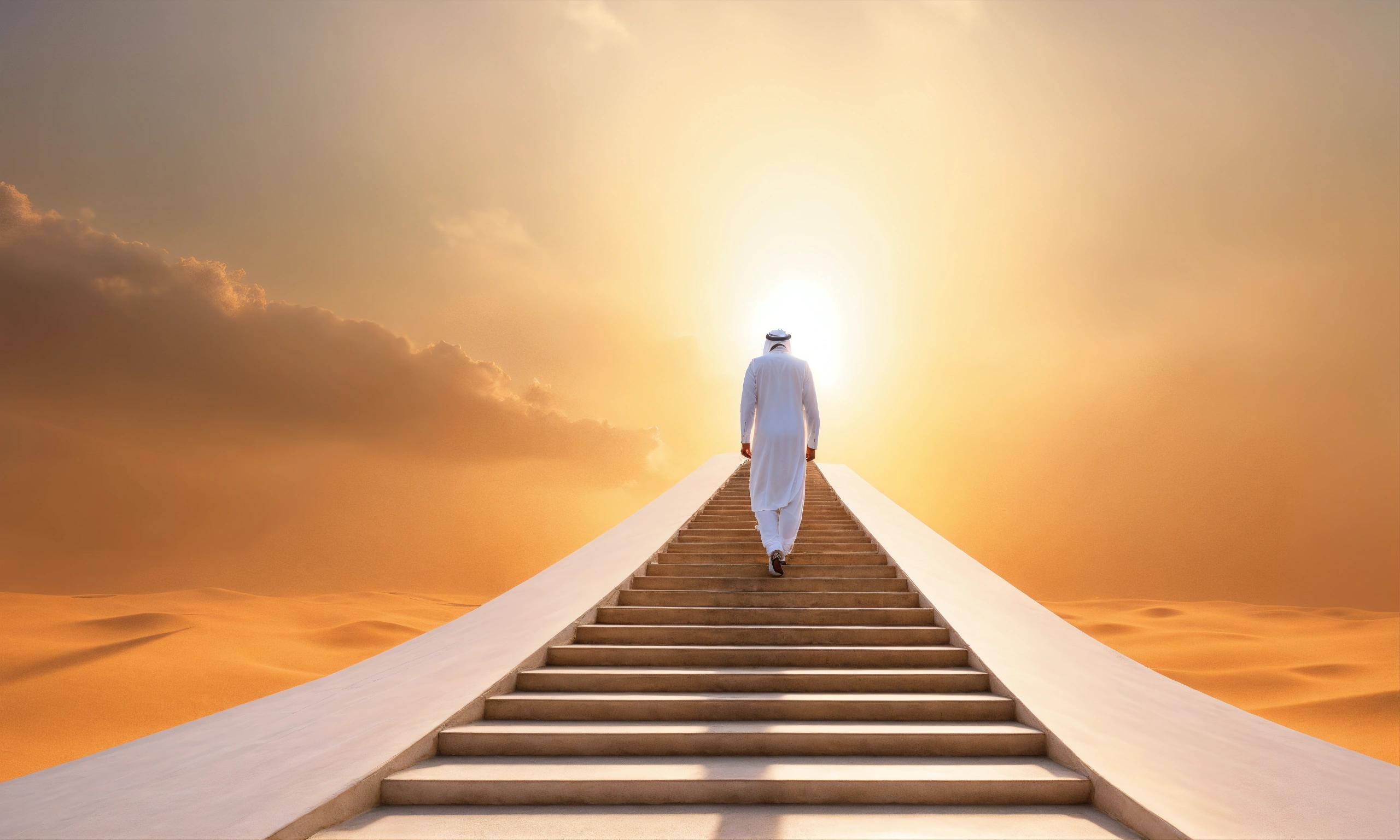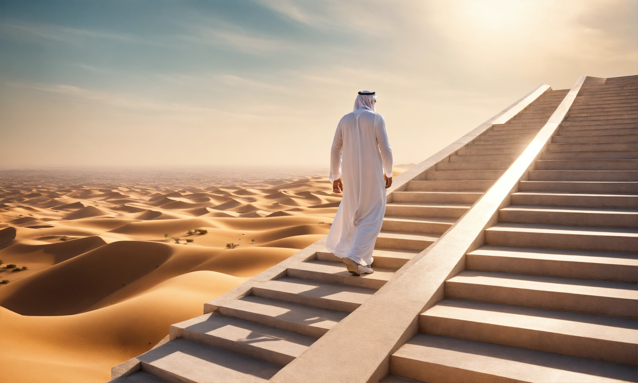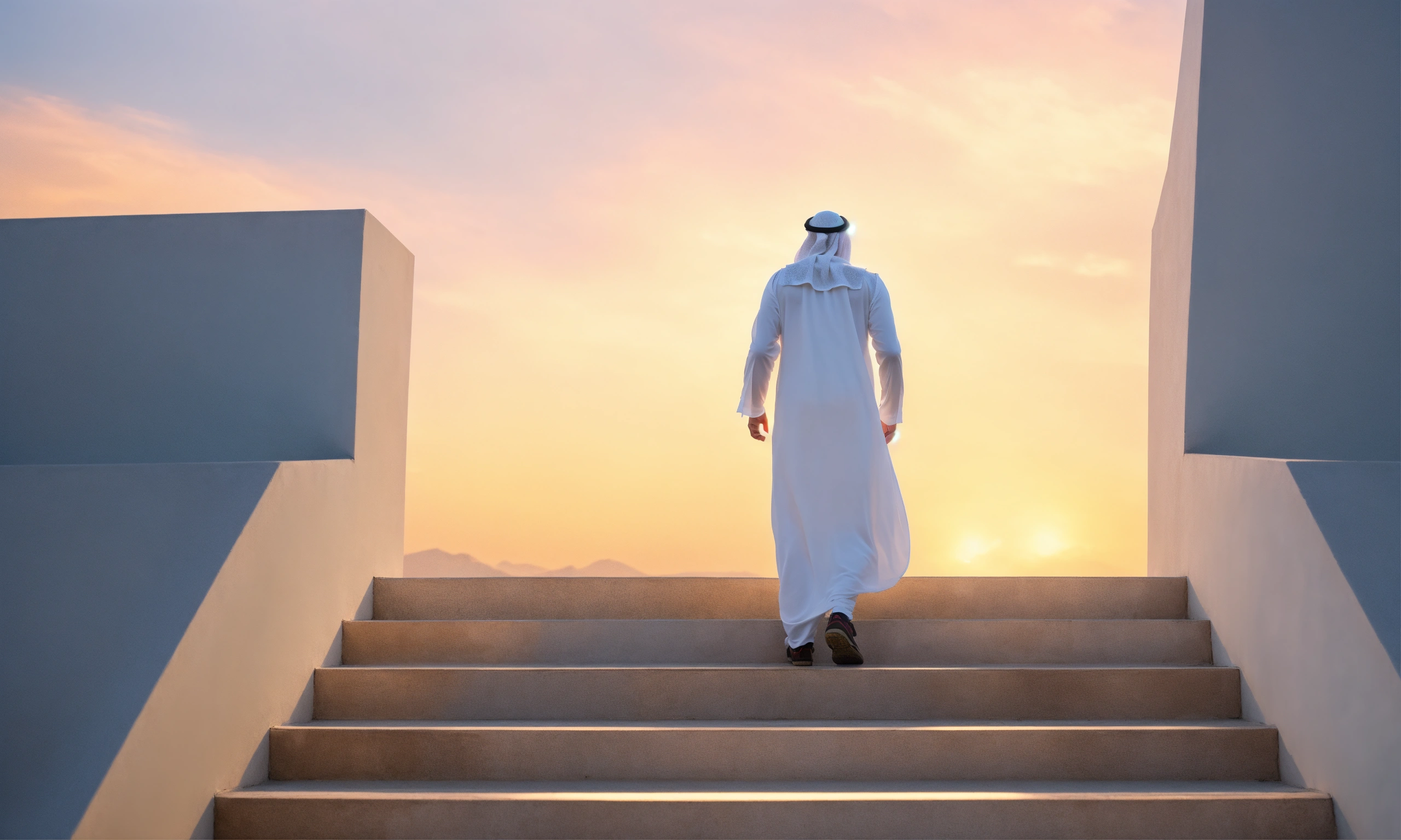 Saudi man climbing up six steps only, white costume, walking upward, right side, side-way, close up, glass, abstract, modern, sky, horizon, natural light, warm, photo-realistic, 8k, high definition