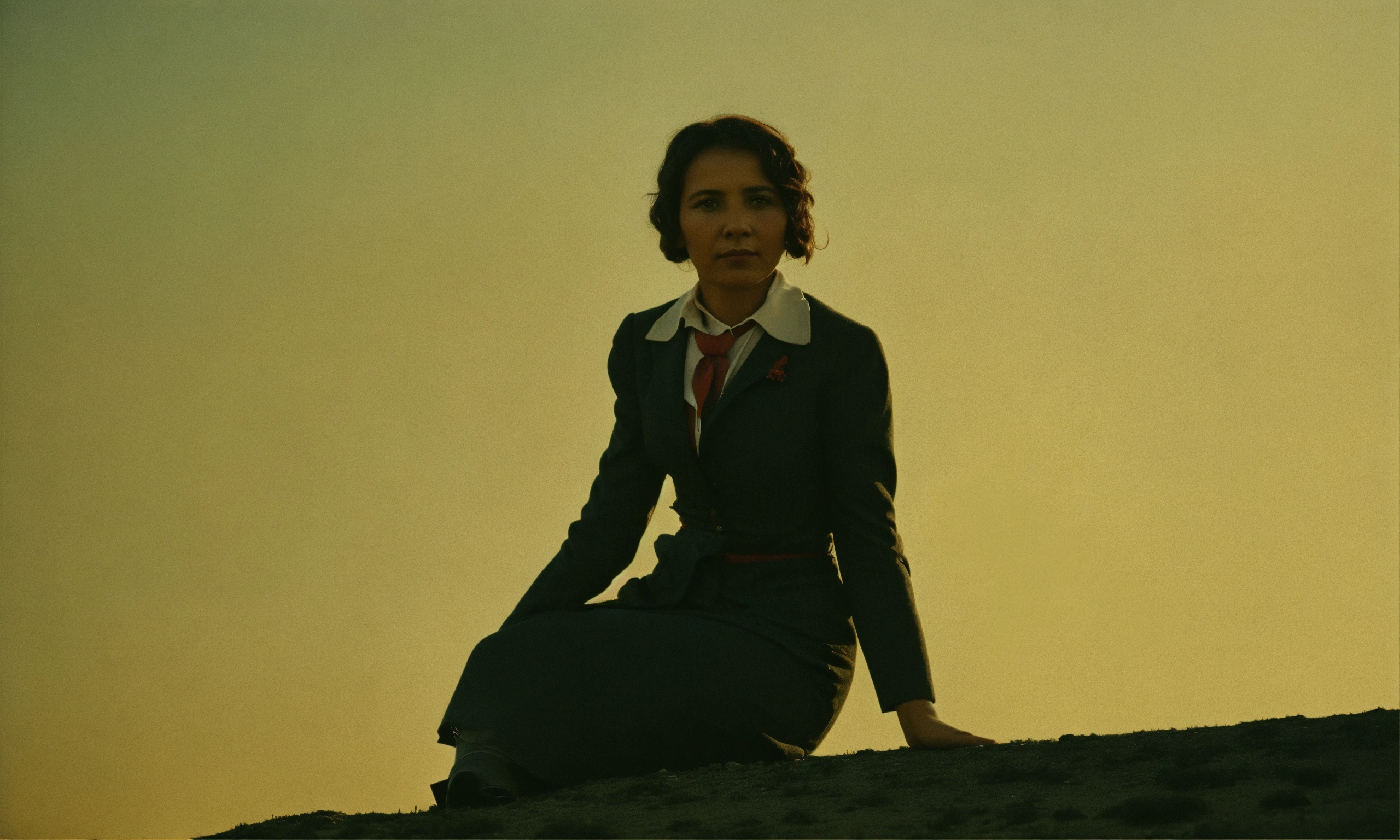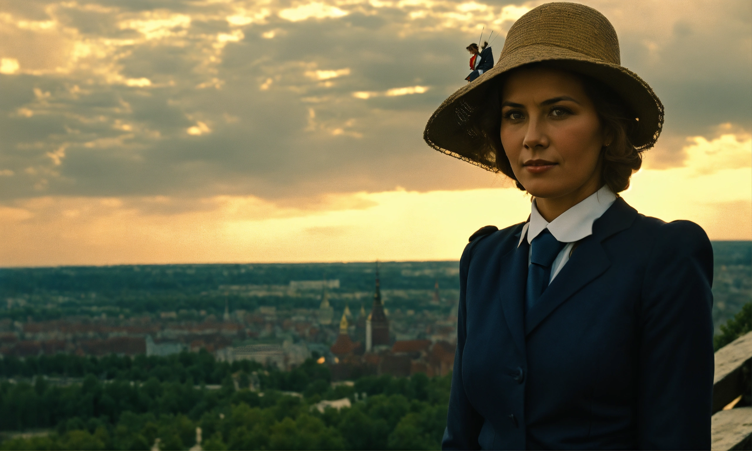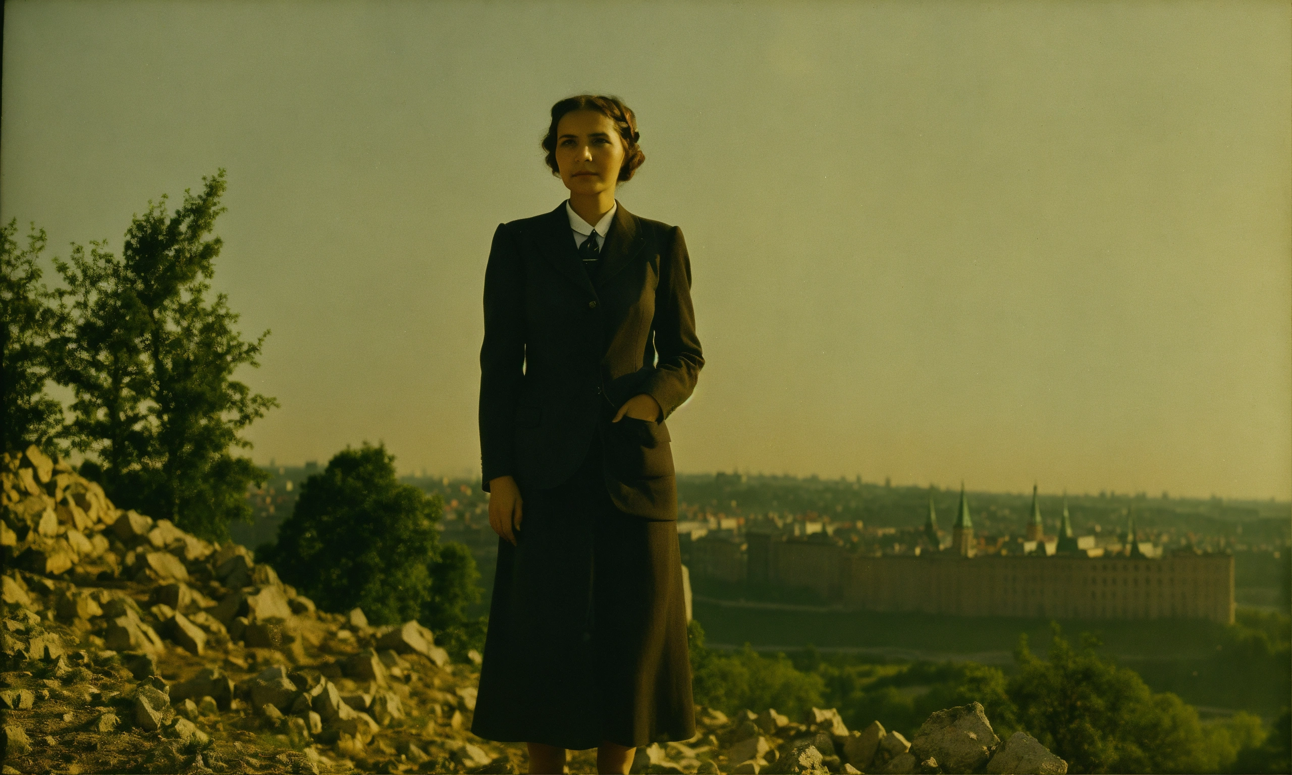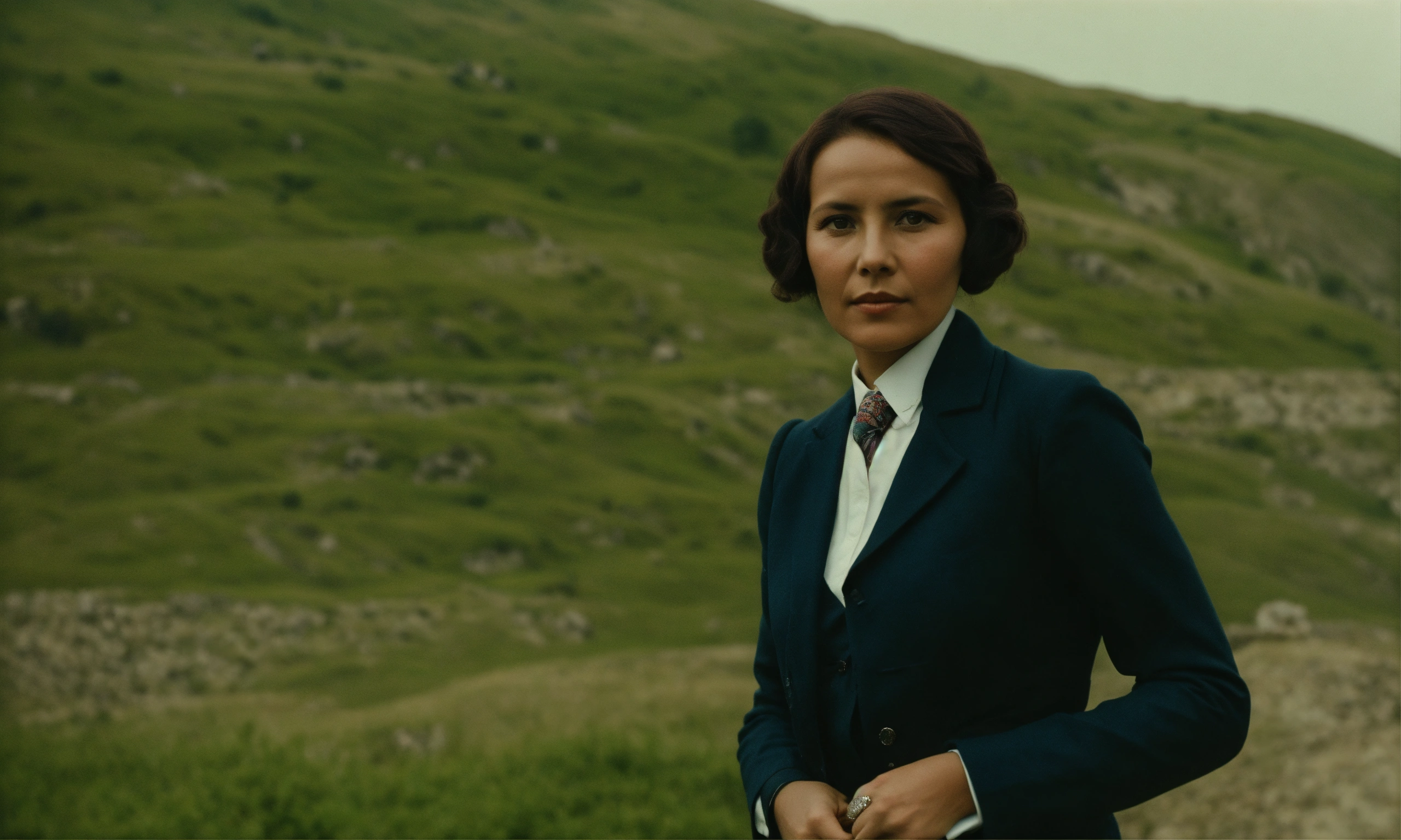 Warszawa 1920-1930, buaty woman 30 age, on top of a mountain, looks at the camera at full height, suit and tie.