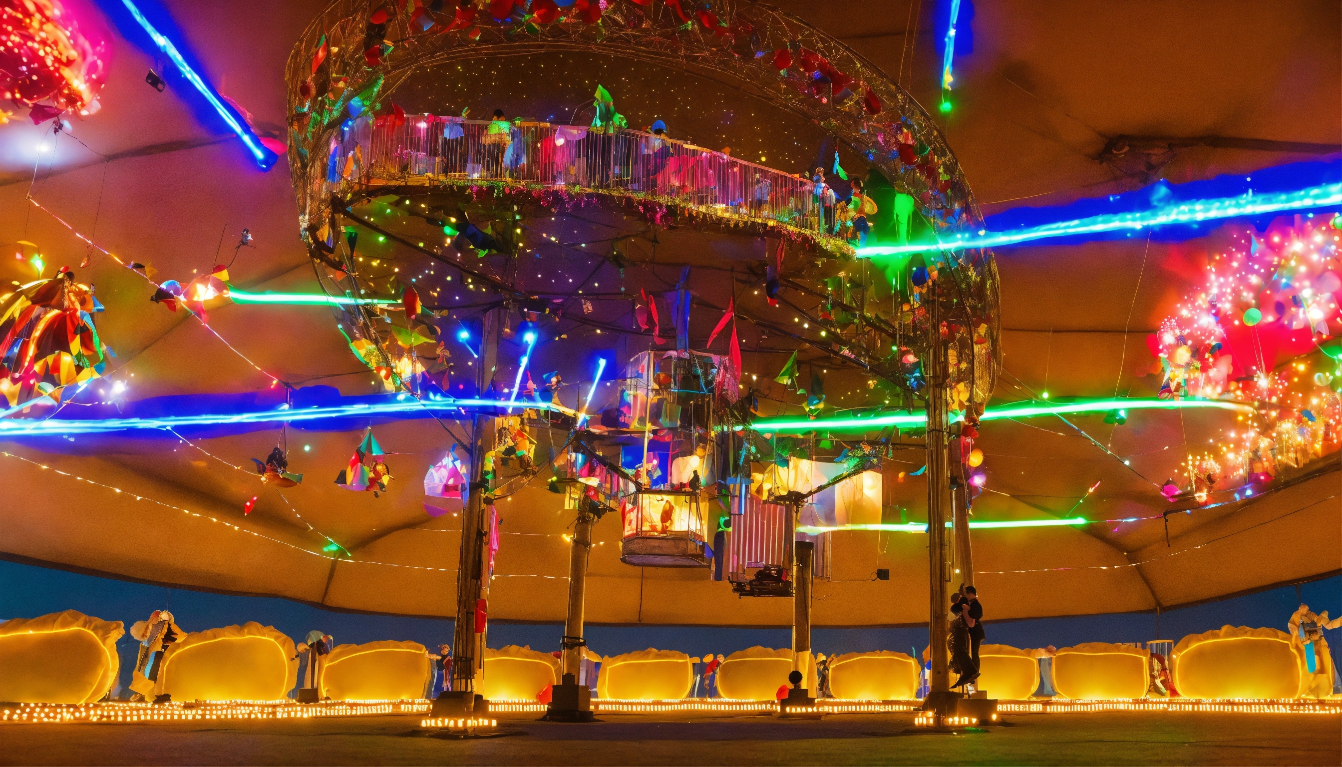 rodeado de bailarines y luces láser.