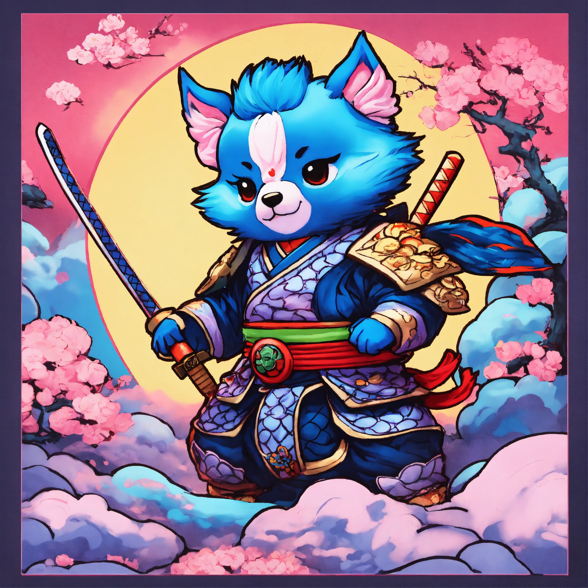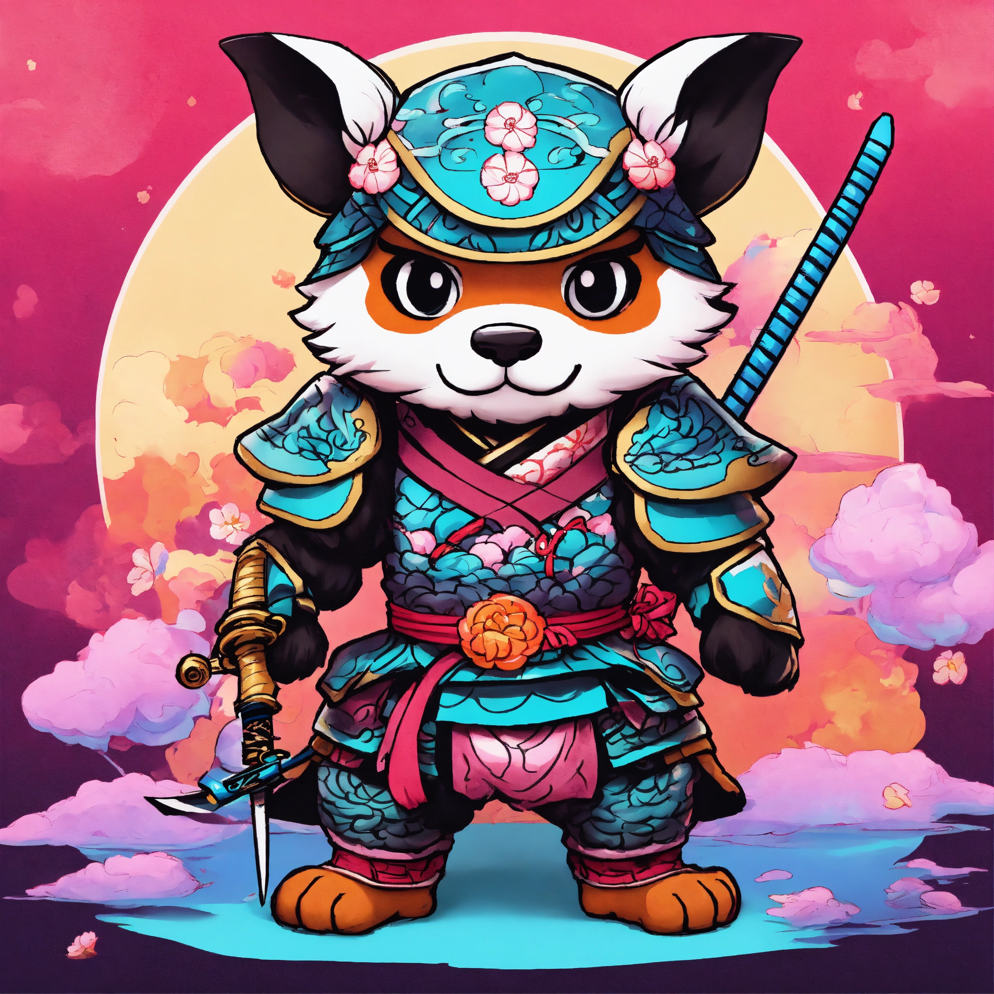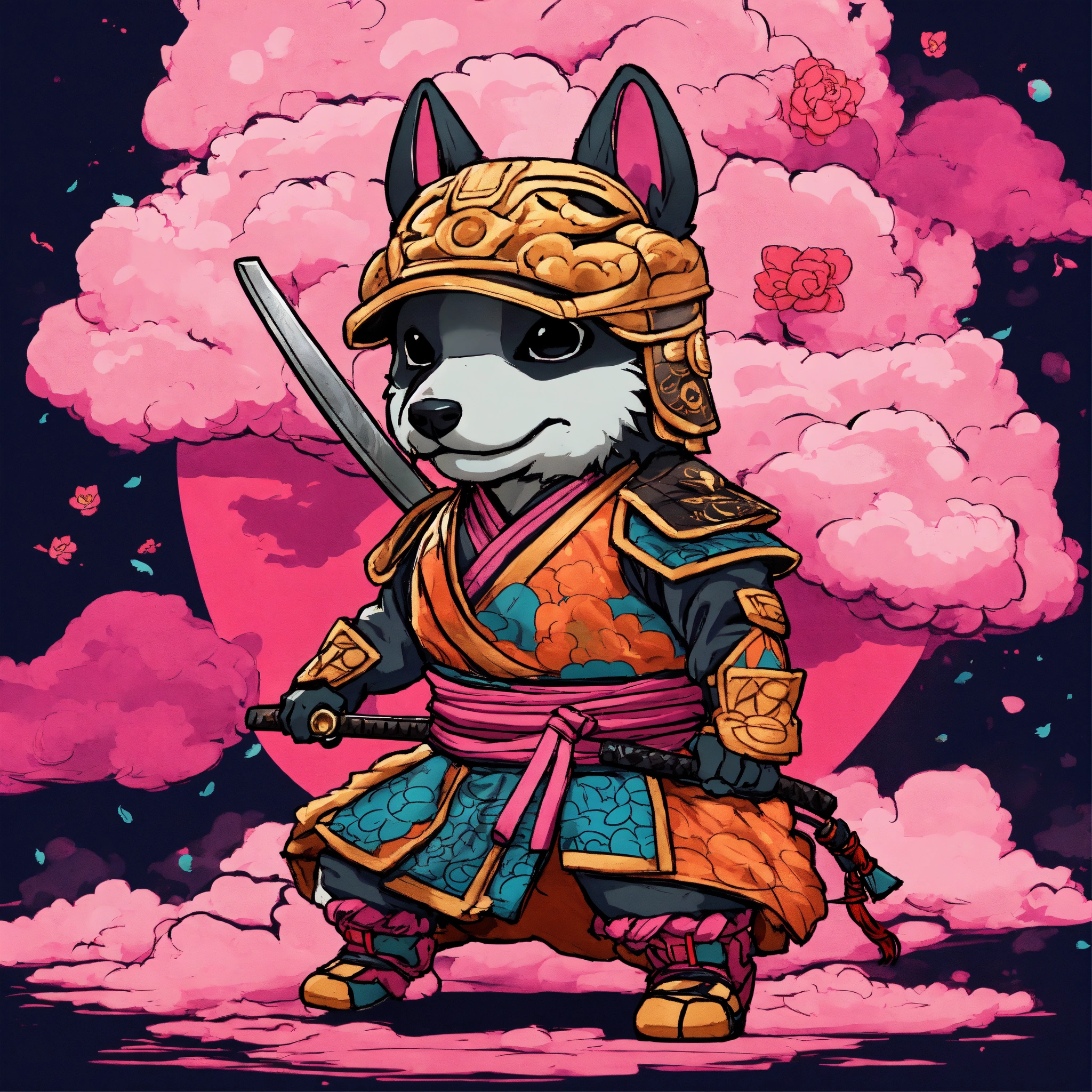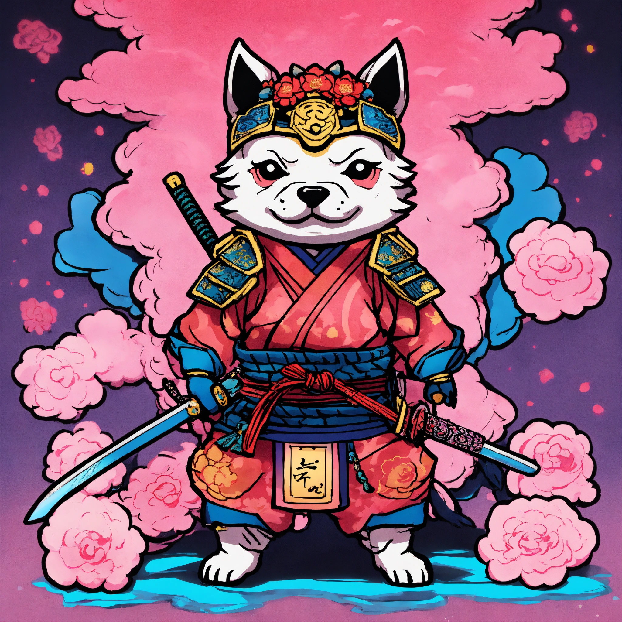 There is a chibi gamer on a cotton candy bright neon background, anthropomorphic dog ninja, samurai deity with koi armor, by kanō tan'yū, highly detailed and colored, in the art style of ukiyo - e, inspired by utagawa kuniyoshi, gaming and education youtube portrait