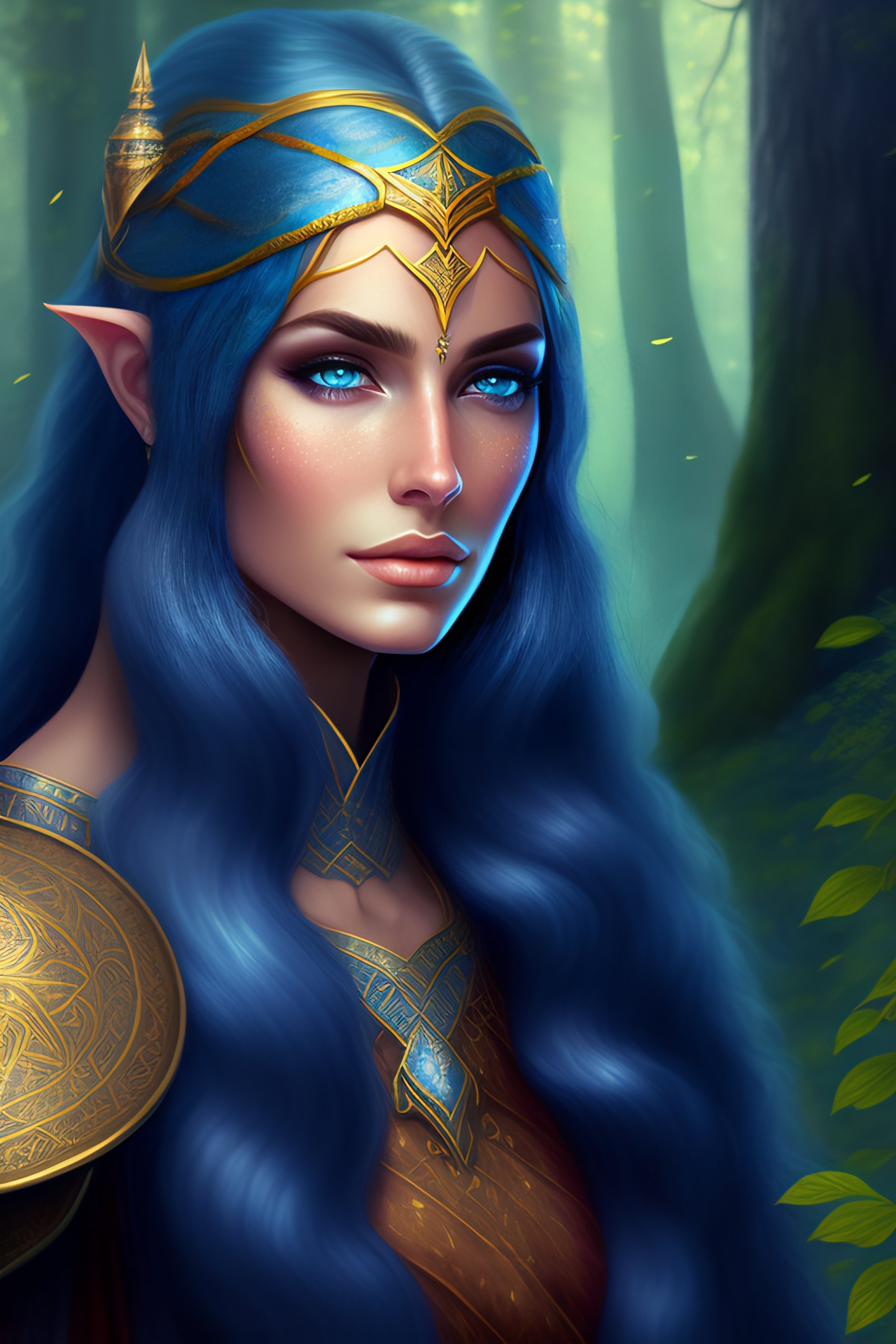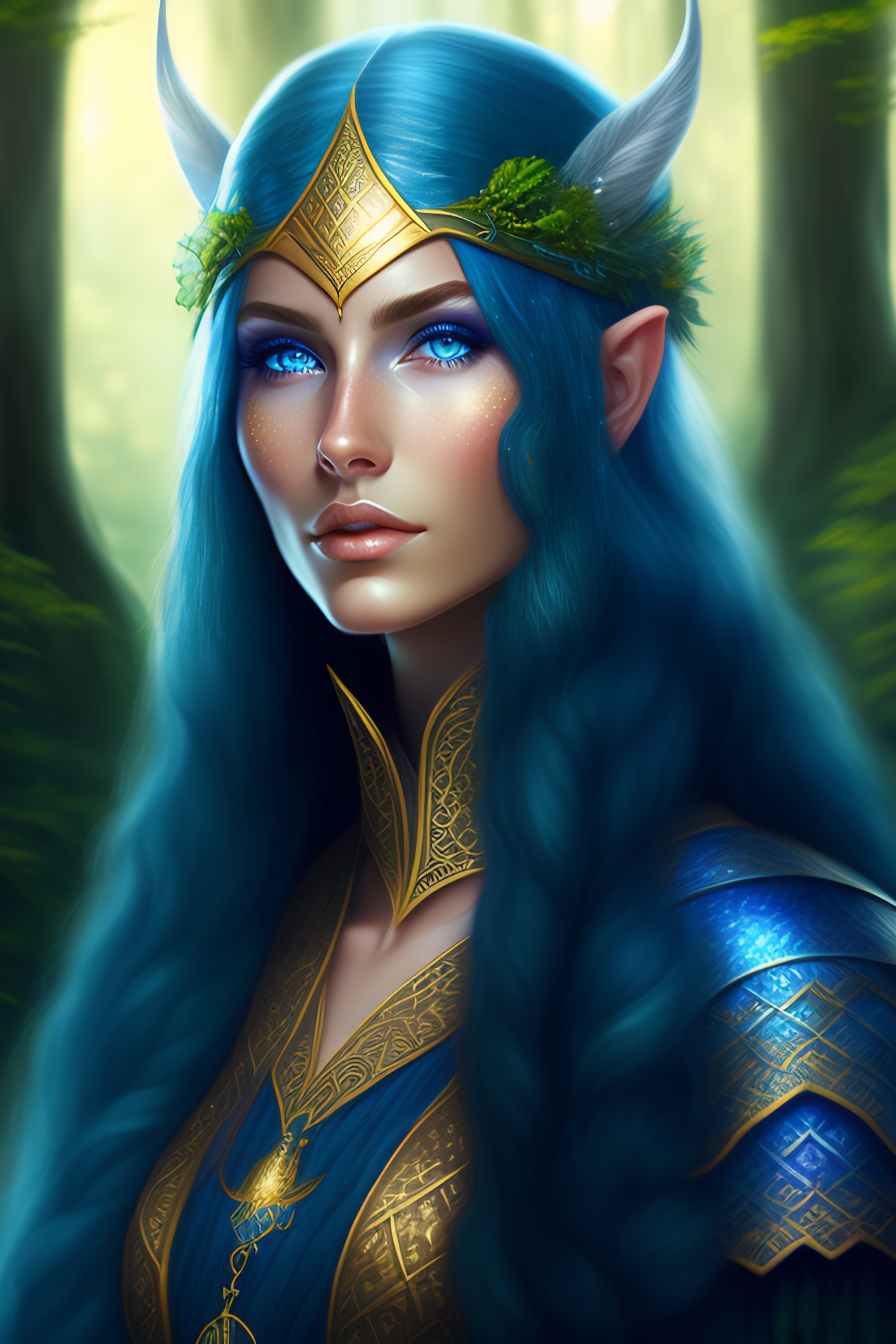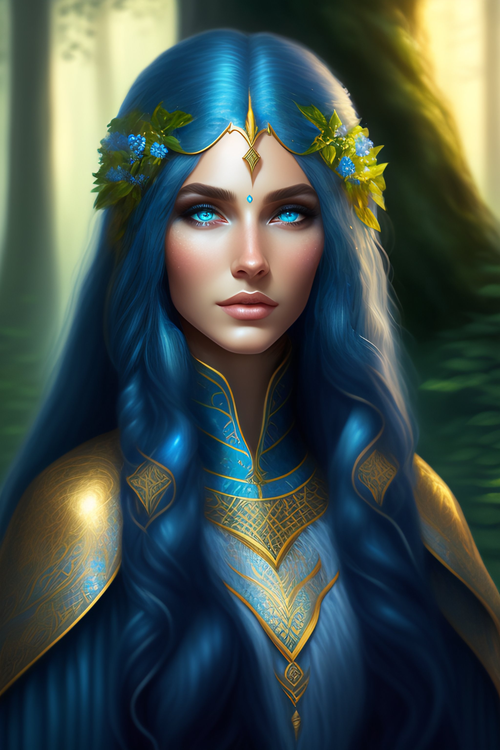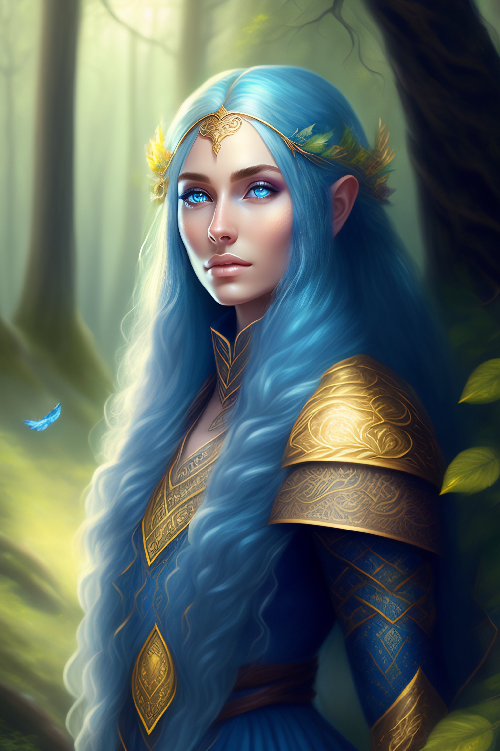 A cute wizard elven, blue long hair, golden eyes, in a forest, simple dress, intricate, elegant, highly detailed, digital painting, hyper realistic, fantasy, dungeons and dragons