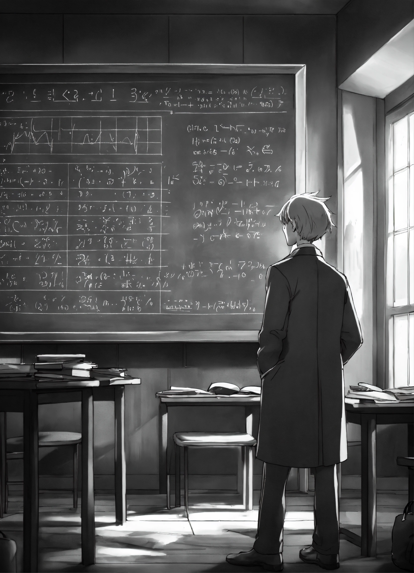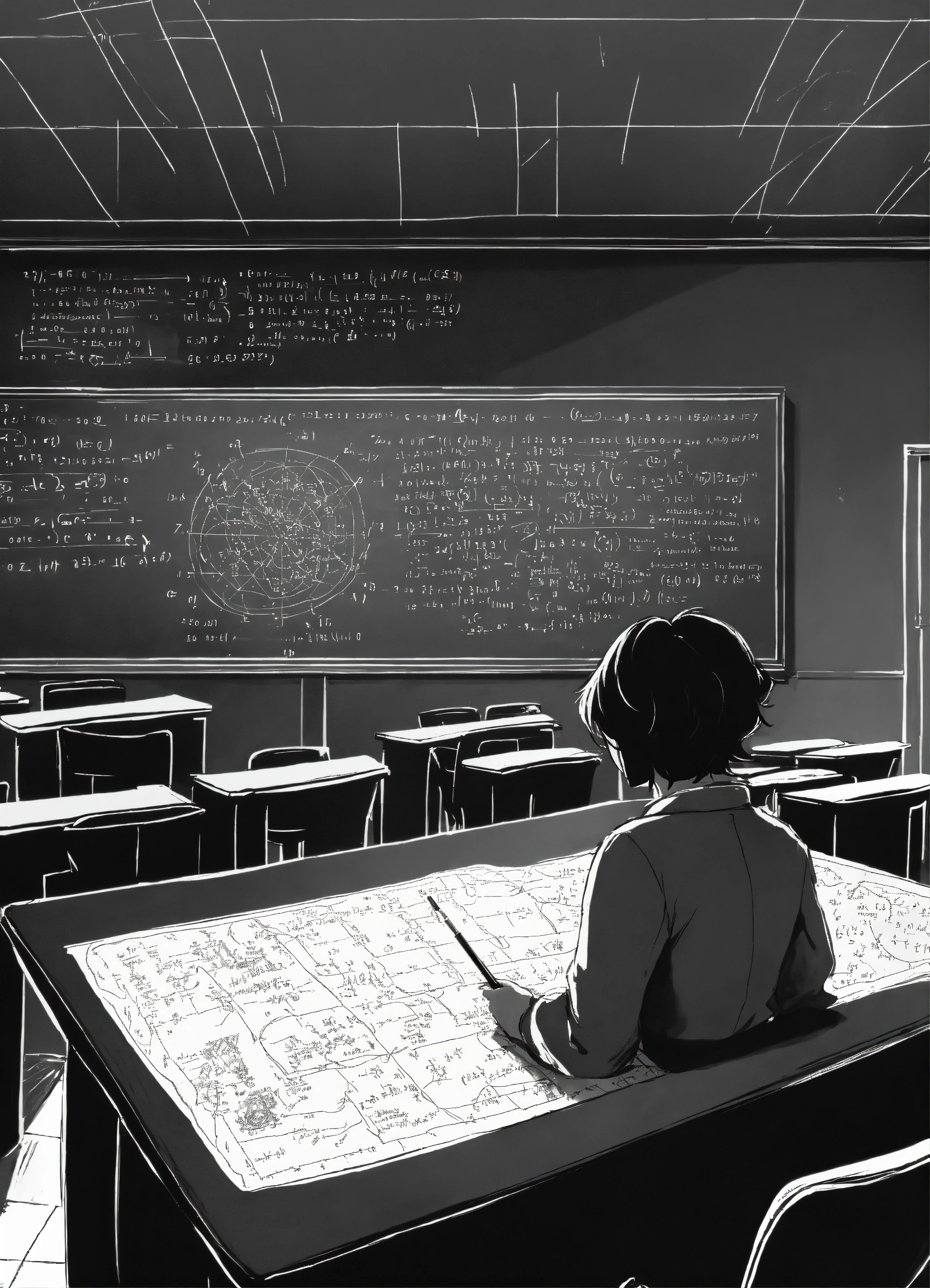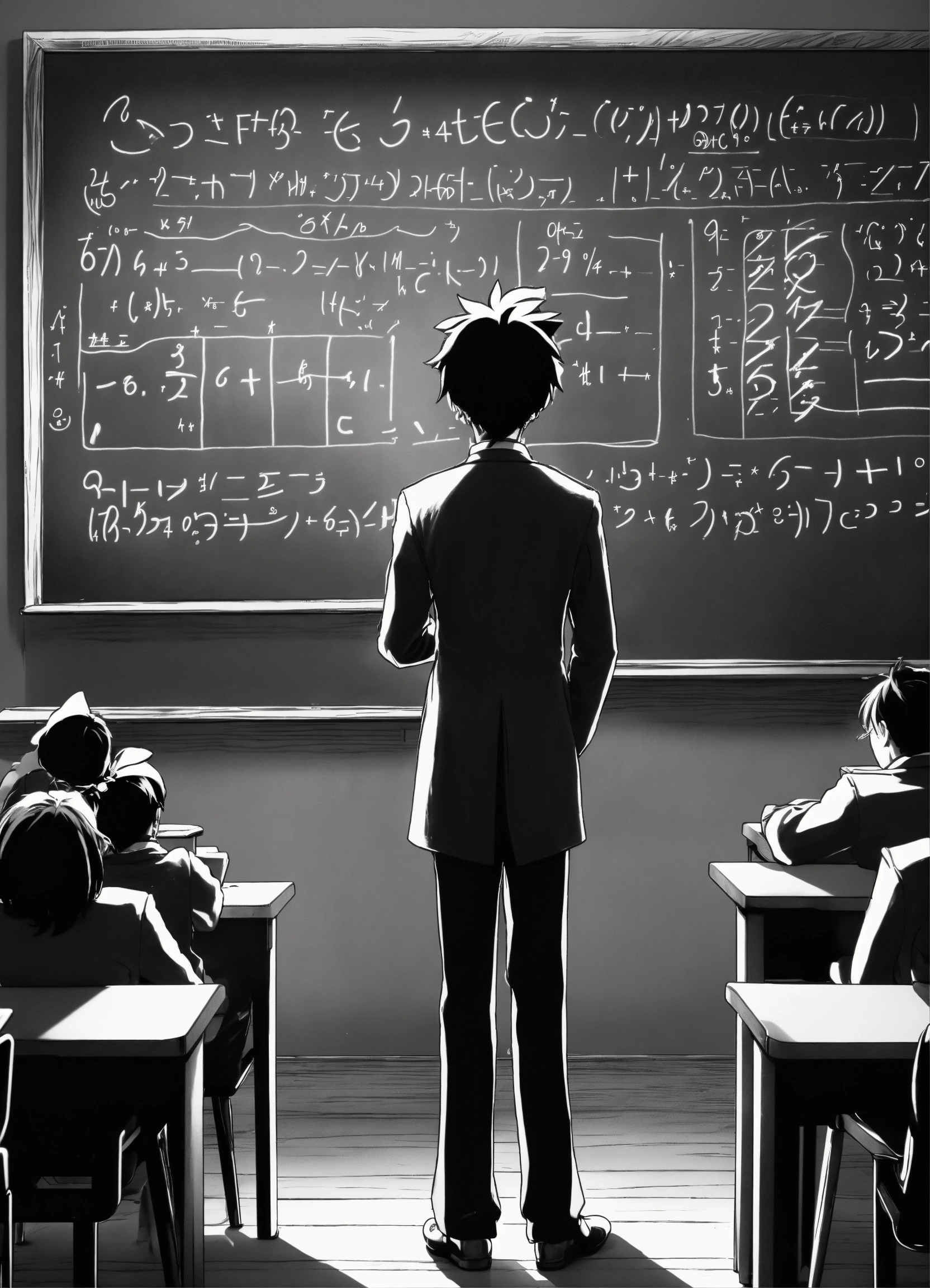 Professor at a chalkboard in front of a classroom doing math black and white anime