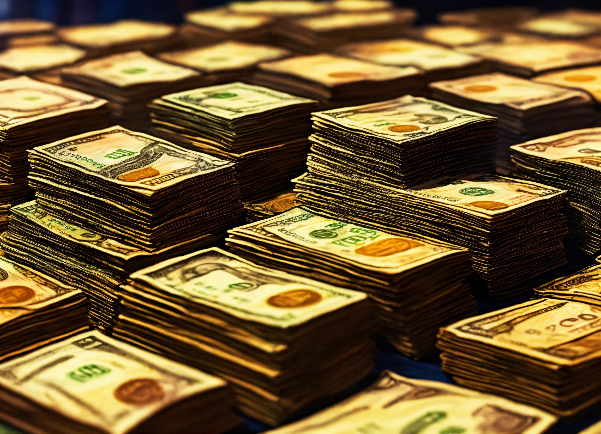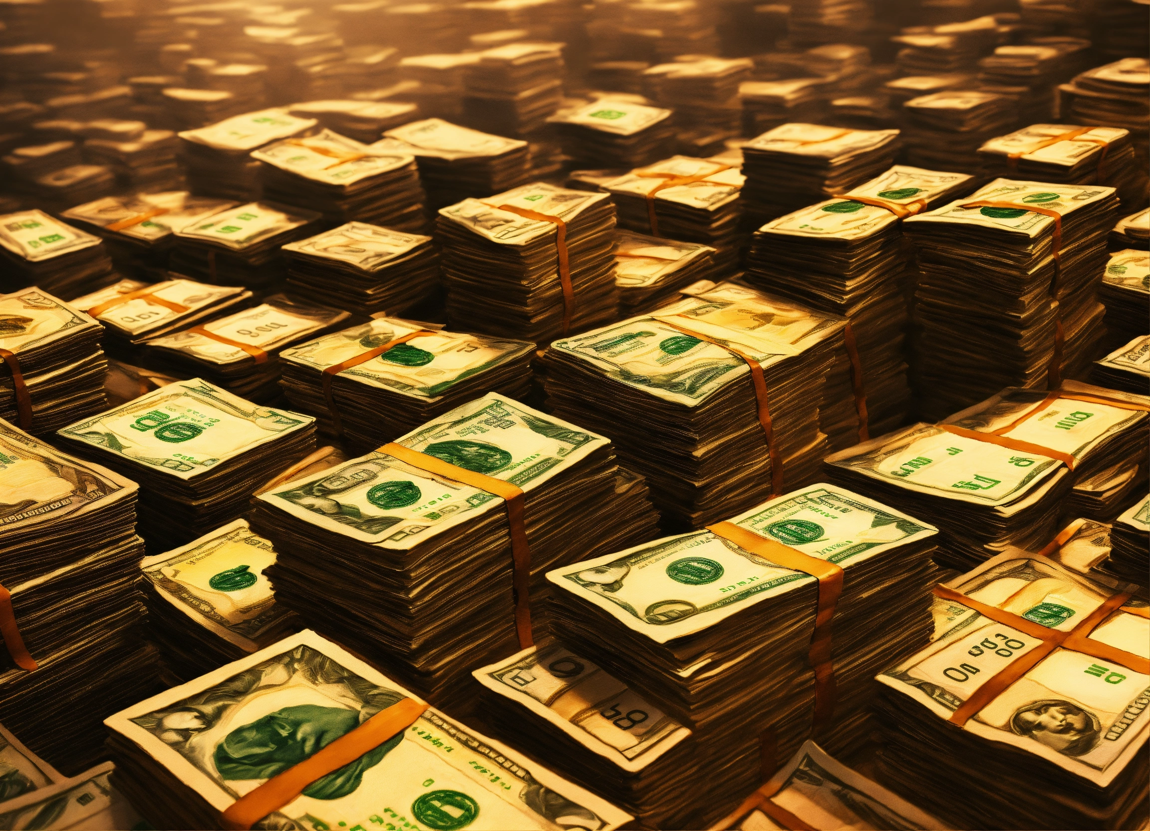 A hand drawn painting of many stacks of money on a big table