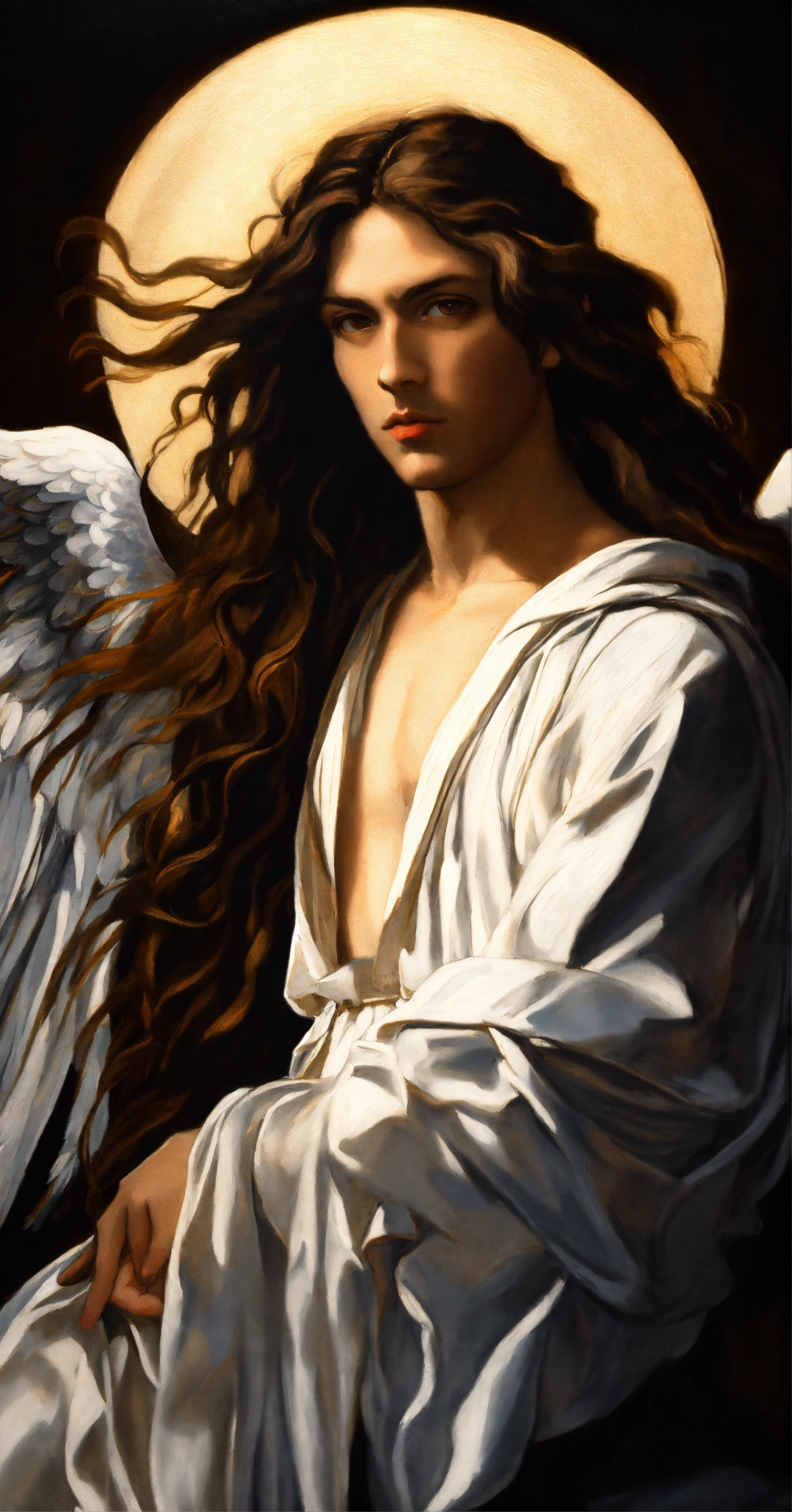 Portrait of an archangel, majestic, long hair, long wings, fine art portrait painting, strong light, fashion, clair obscur, by caravaggio