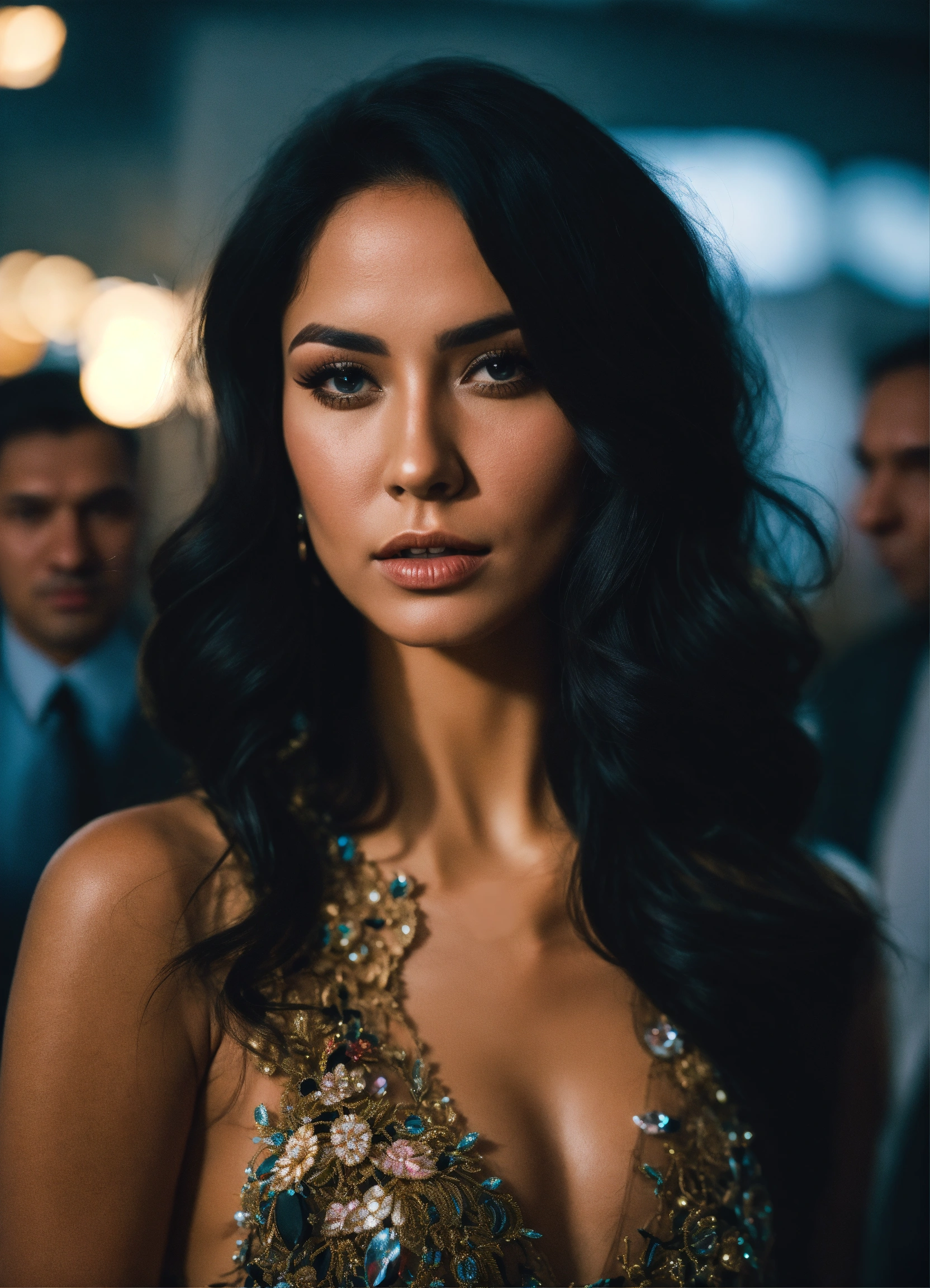 Cinematic photo beautiful latina woman with long black hair in evening dress center of attention surrounded my men, ultra 8k