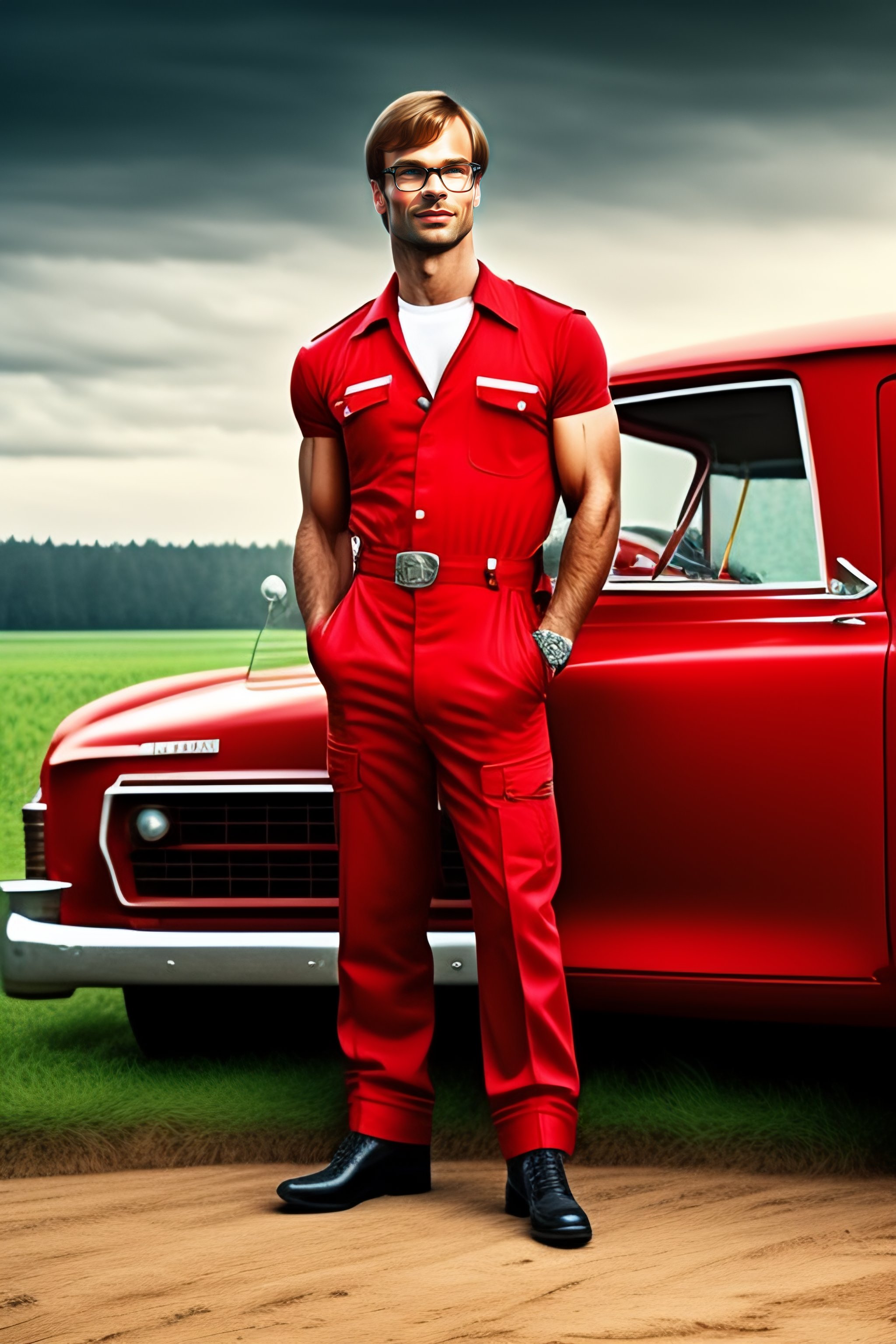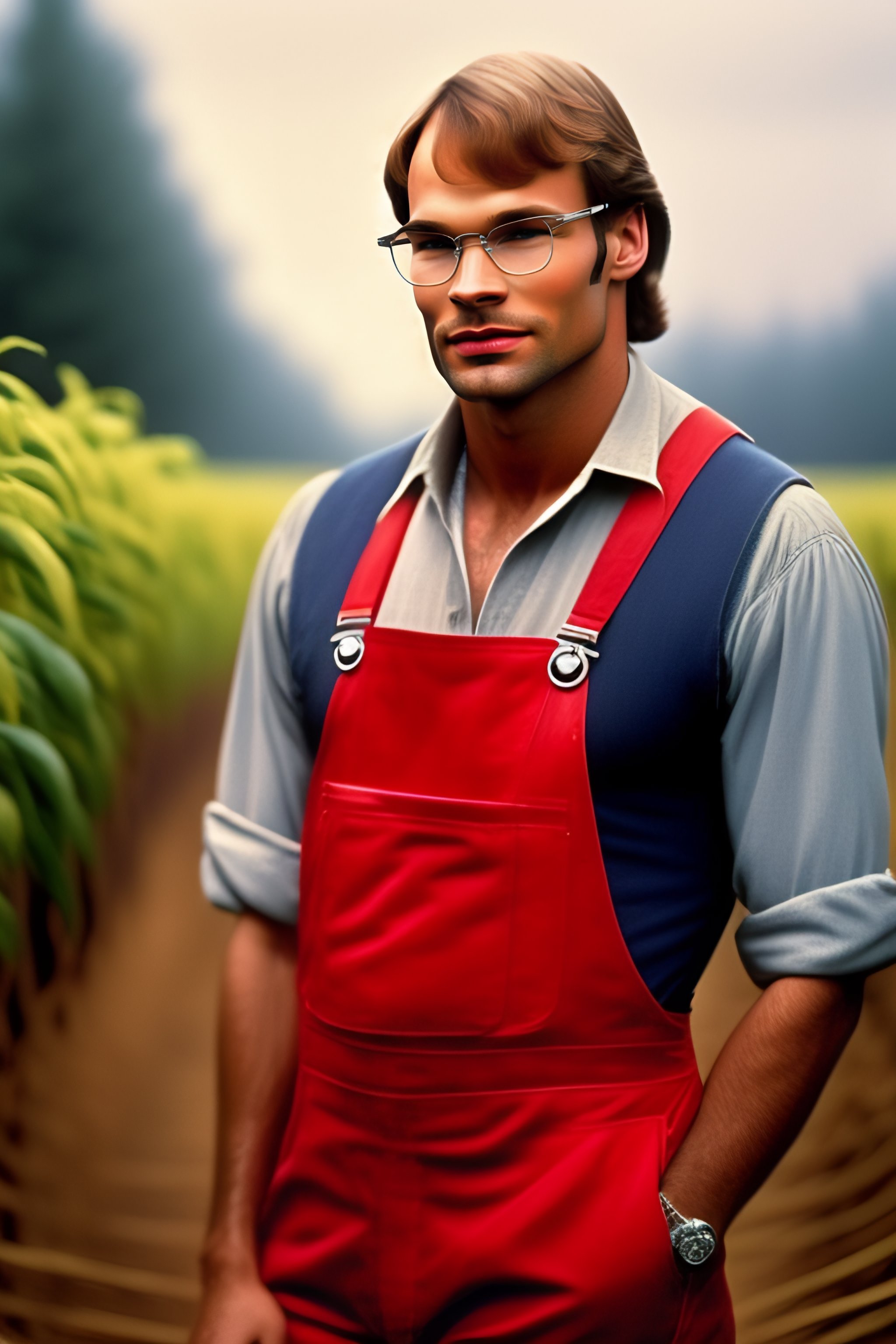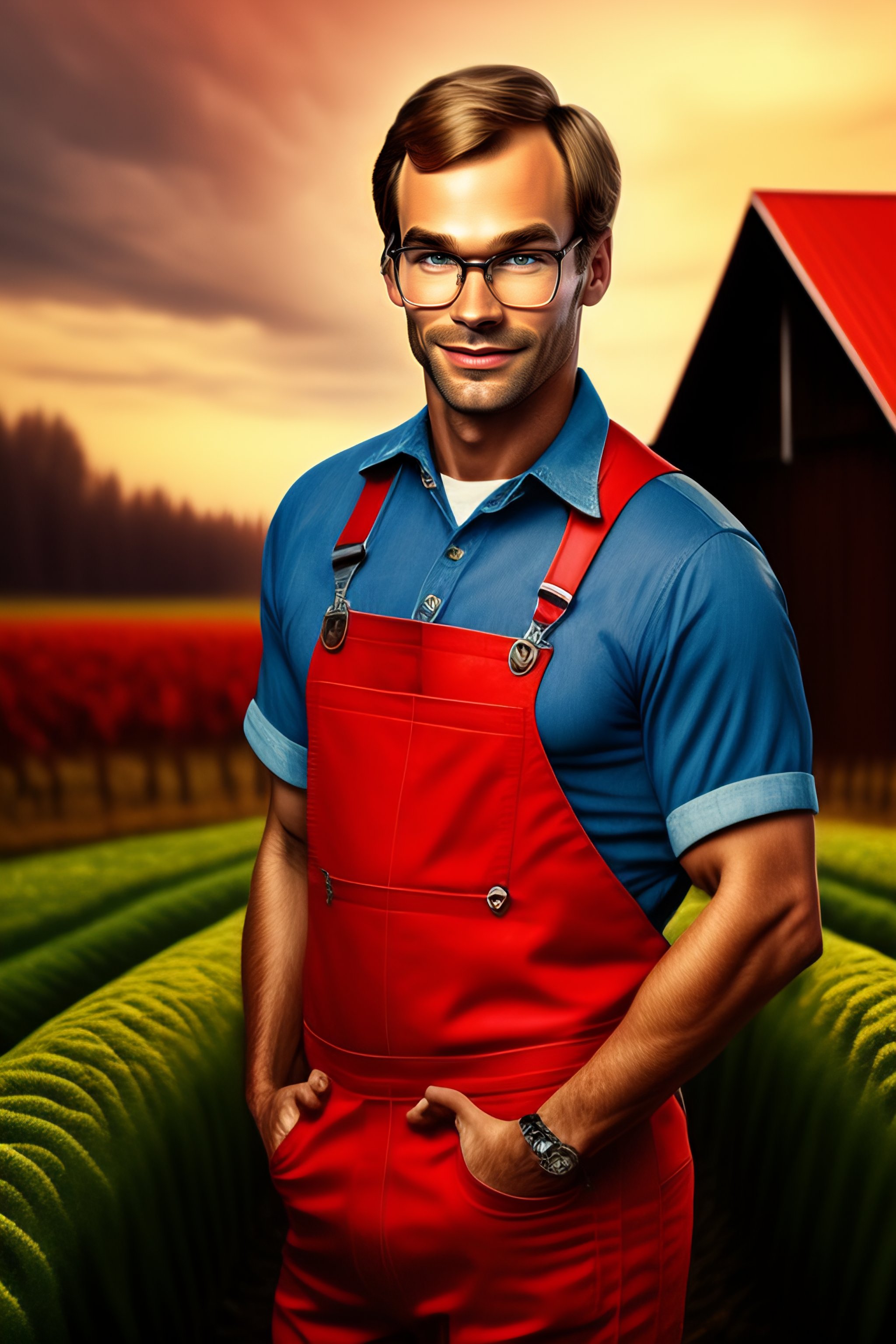 Jeffrey dahmer holding a axe and dressing red overalls in a farm by ilya