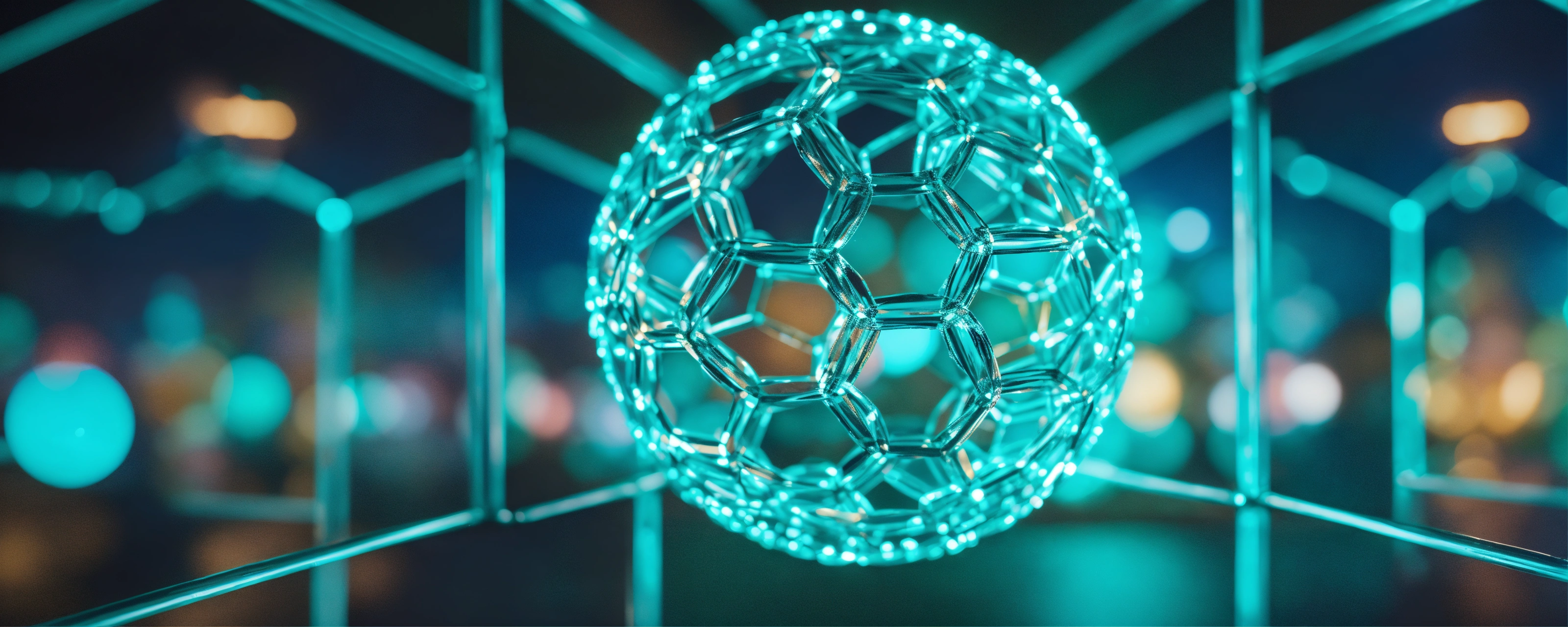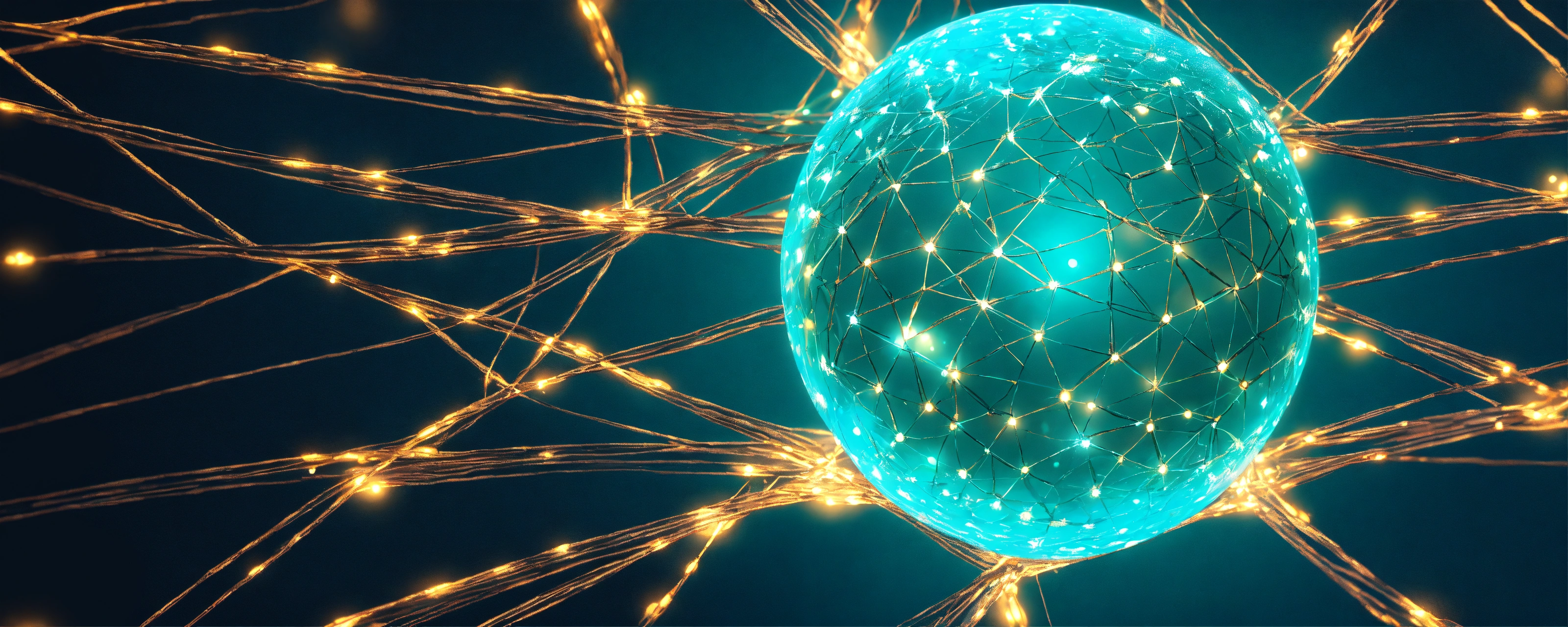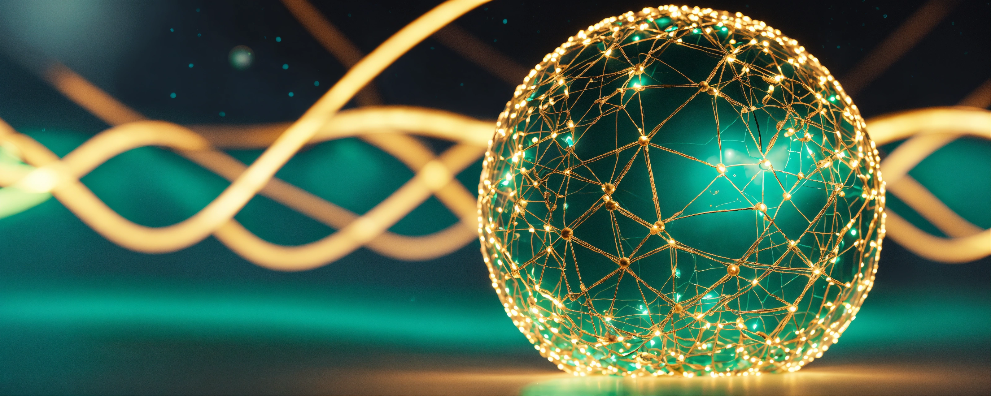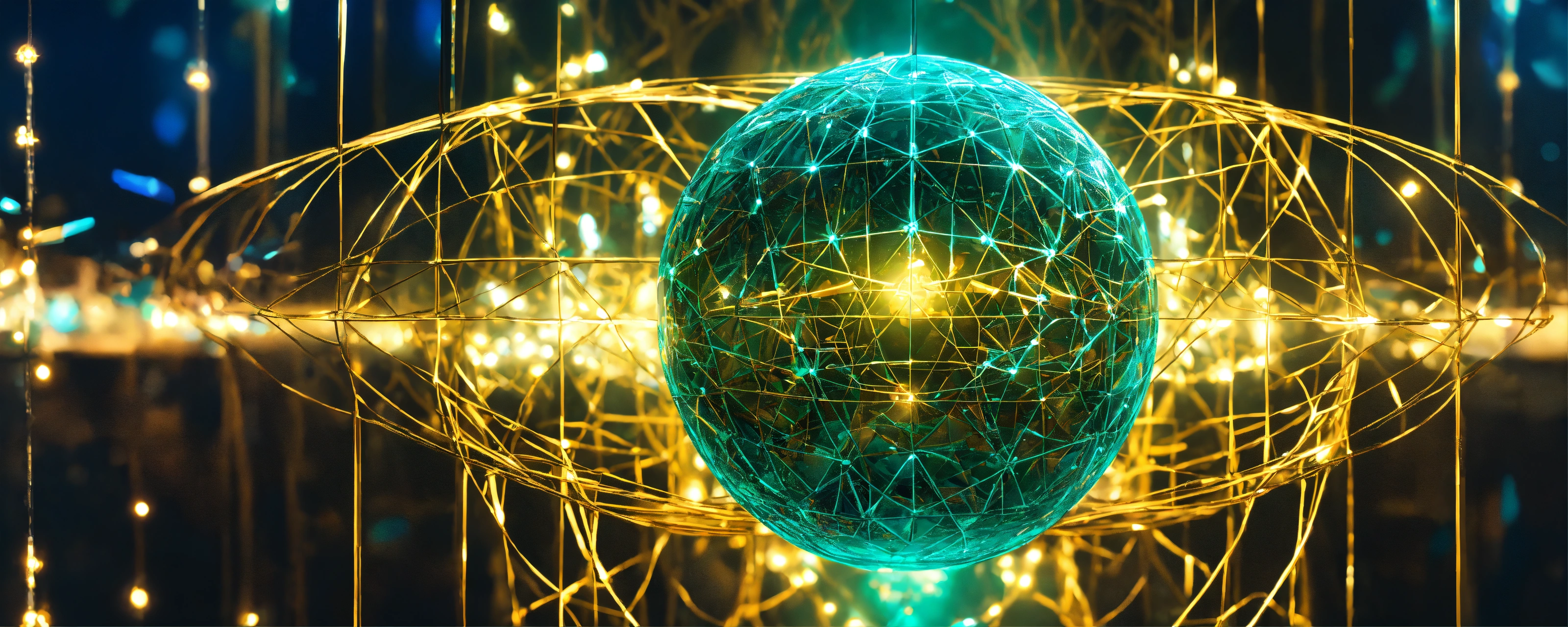Illustration of a turquoise glass ball connected to an infinite network of interconnected lights without borders, glass ball represents a platform, the interconnected lights represents an open social graph