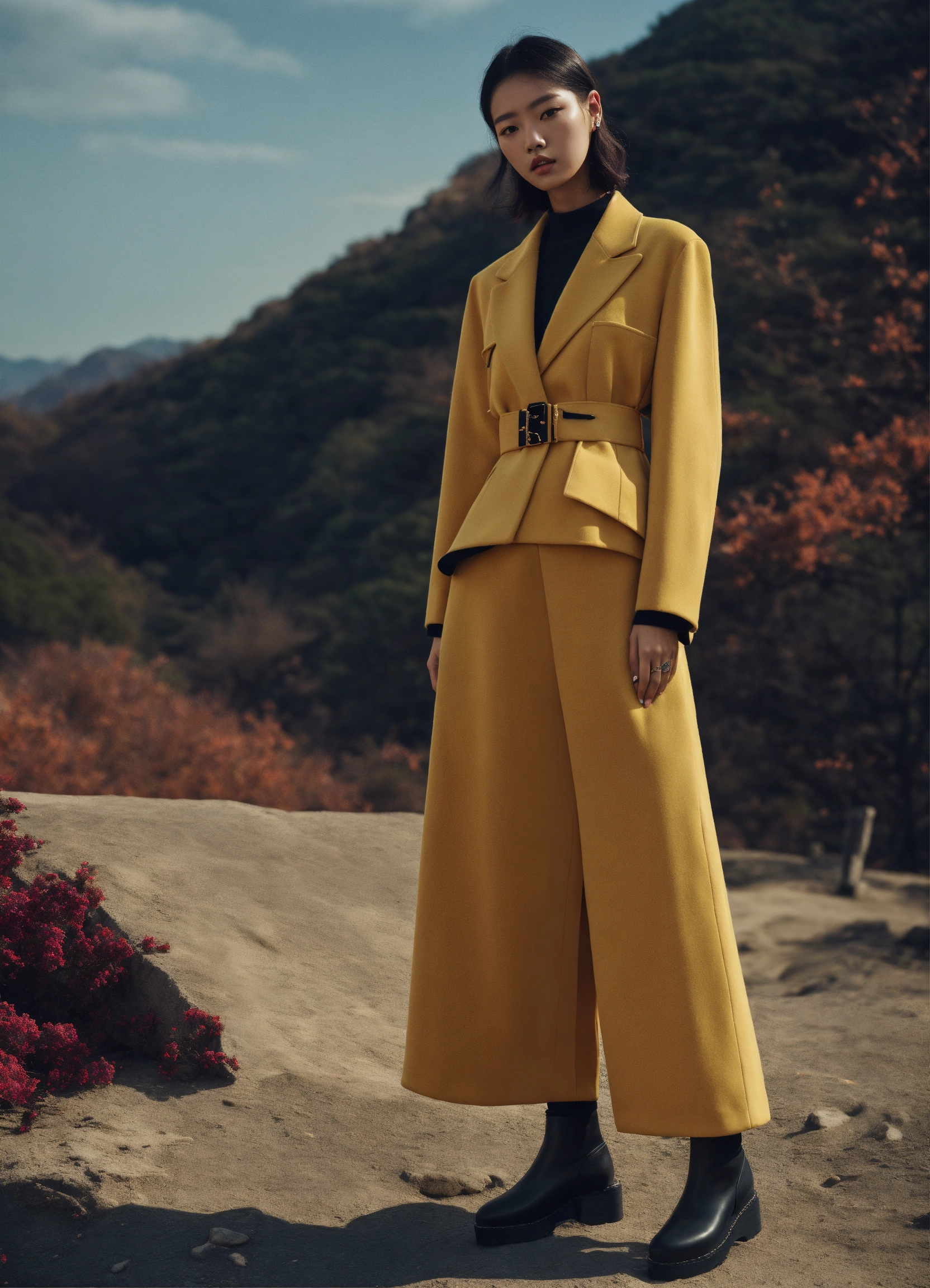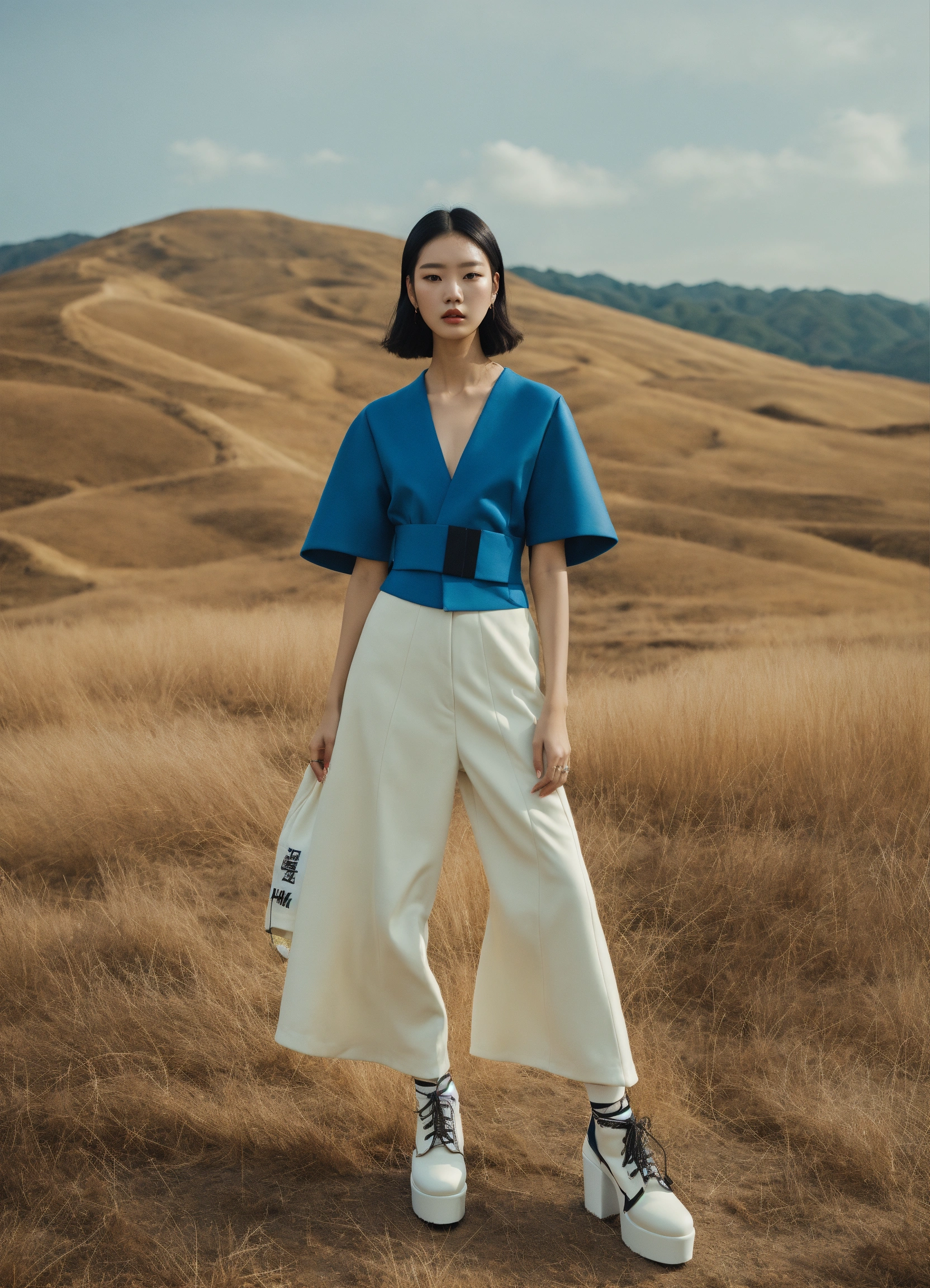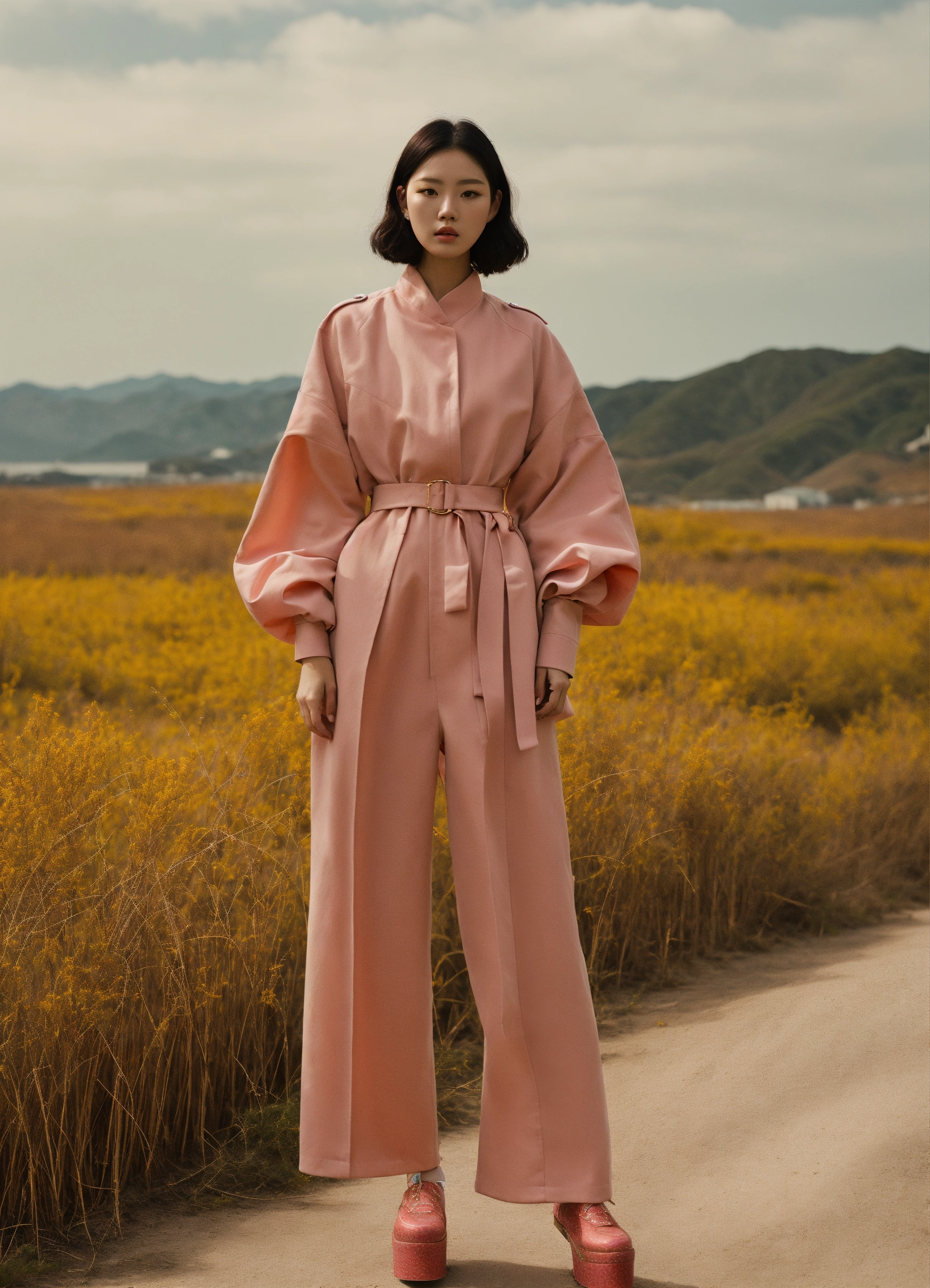 Ultra hd! editorial, fashion oversized collection, korean style, textile, female models, structured outfit, platform, iso 400, surrealistic, 8k, full frame, landscape
