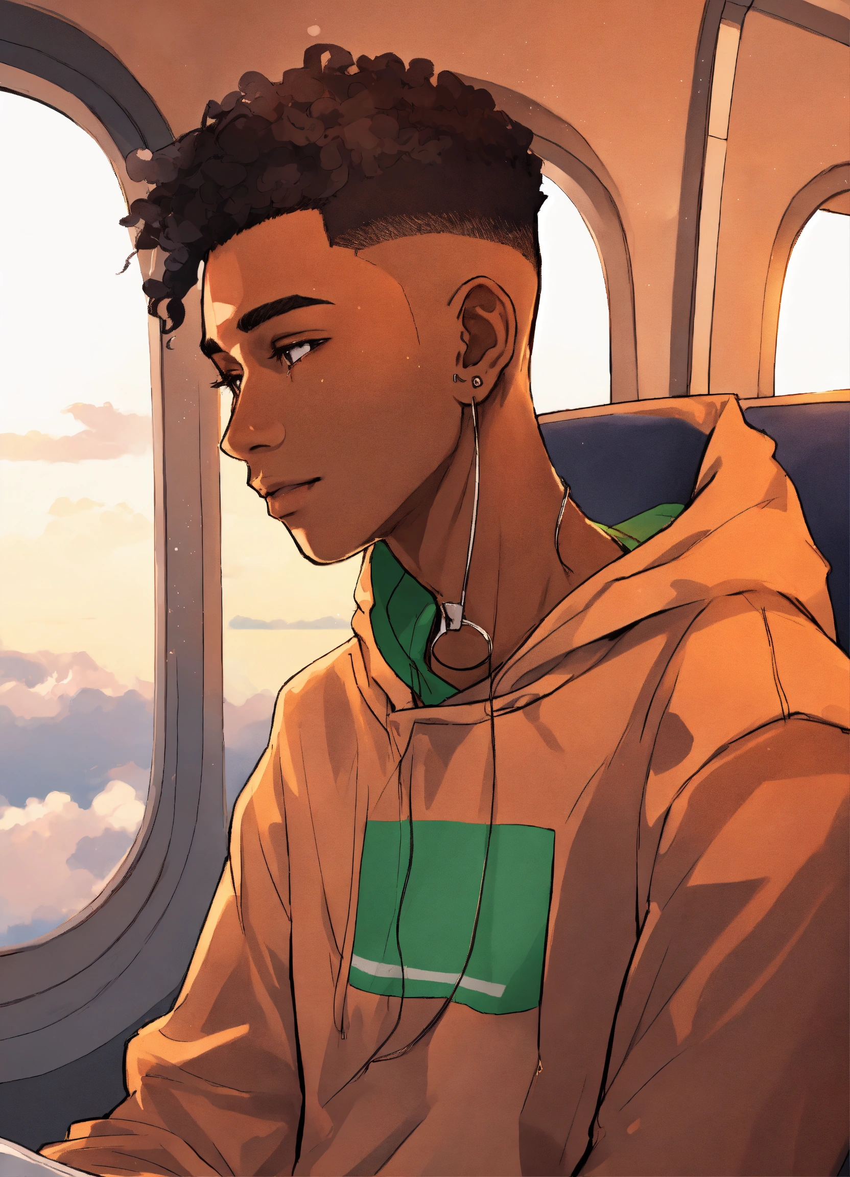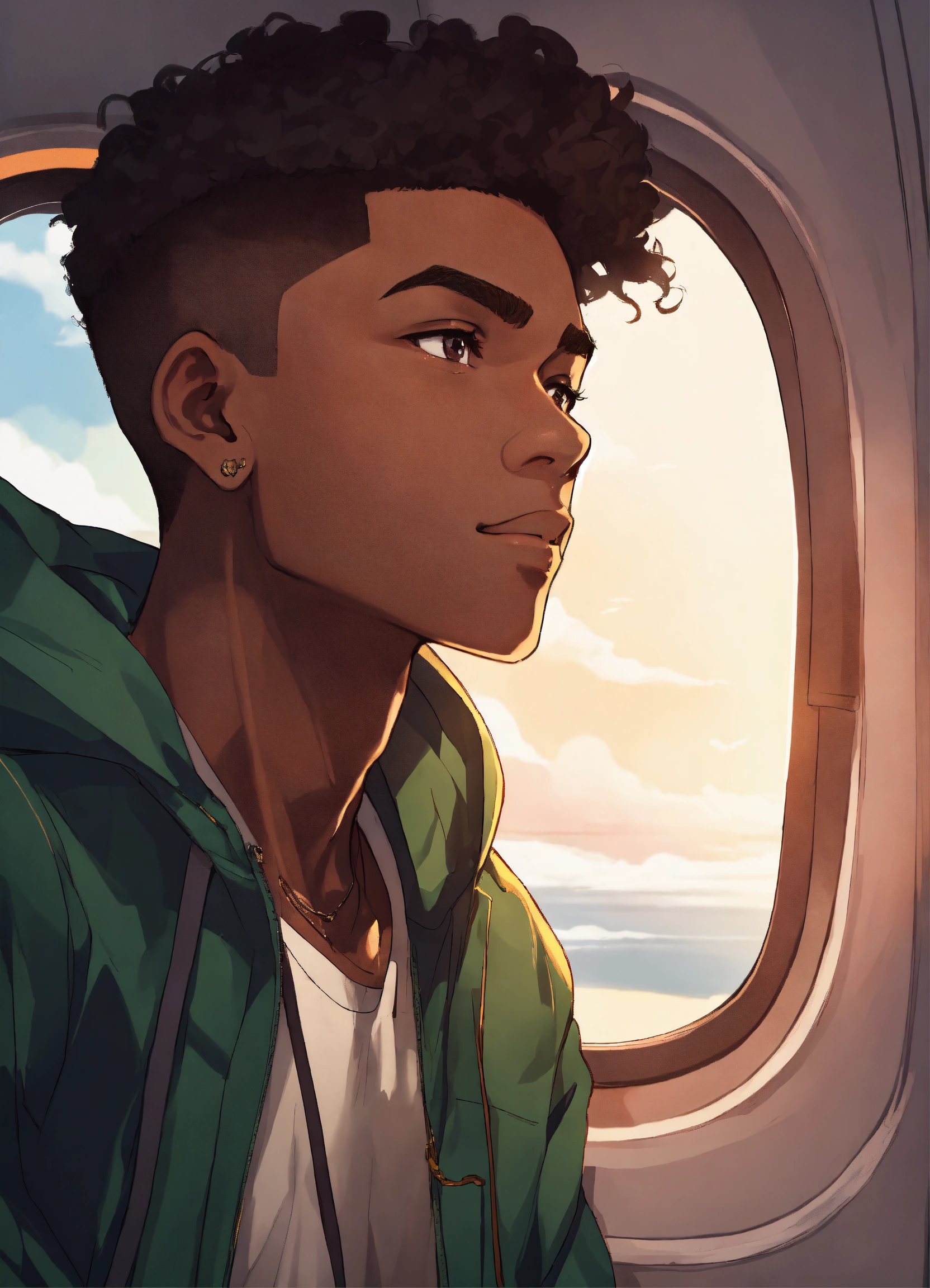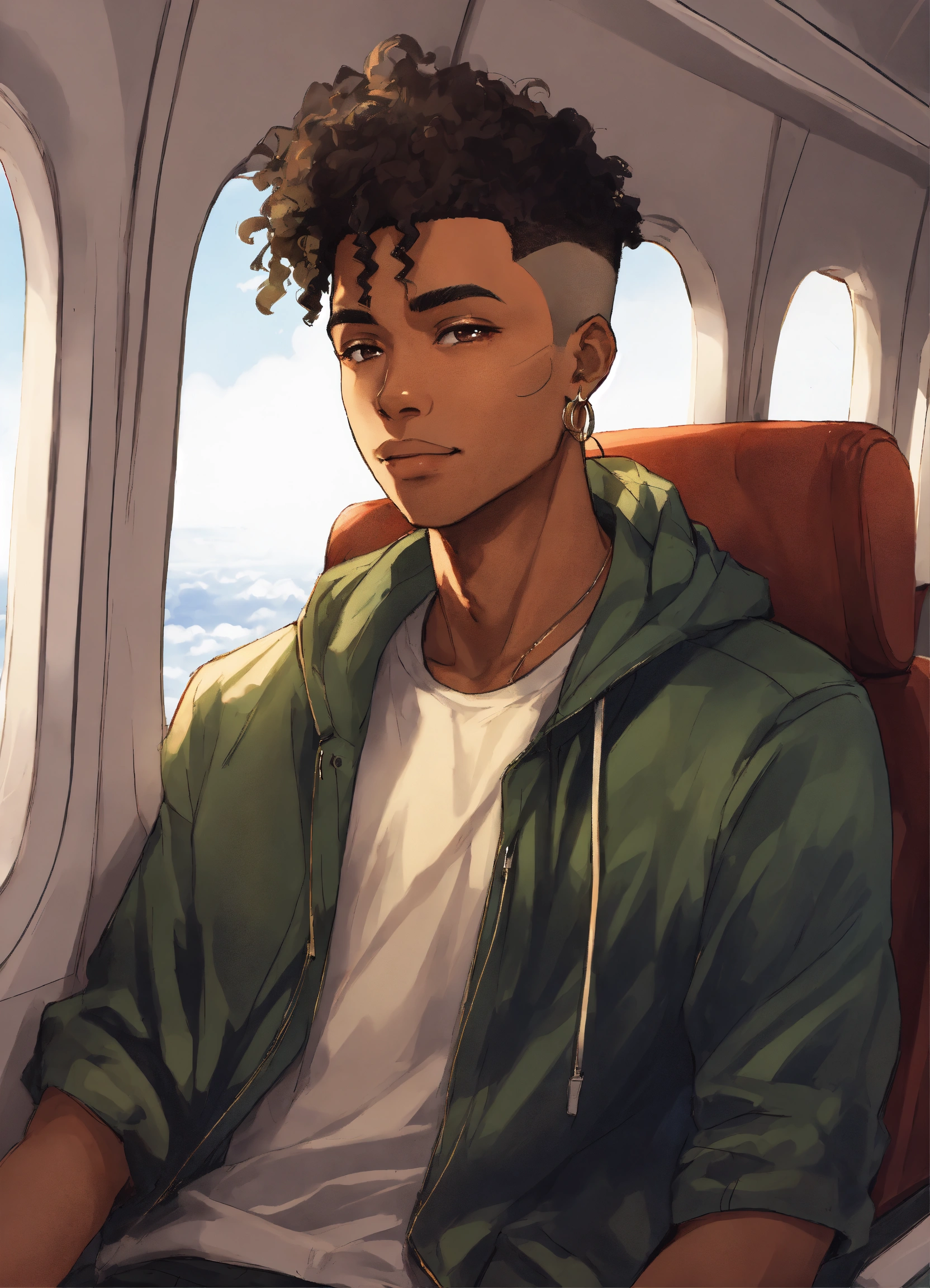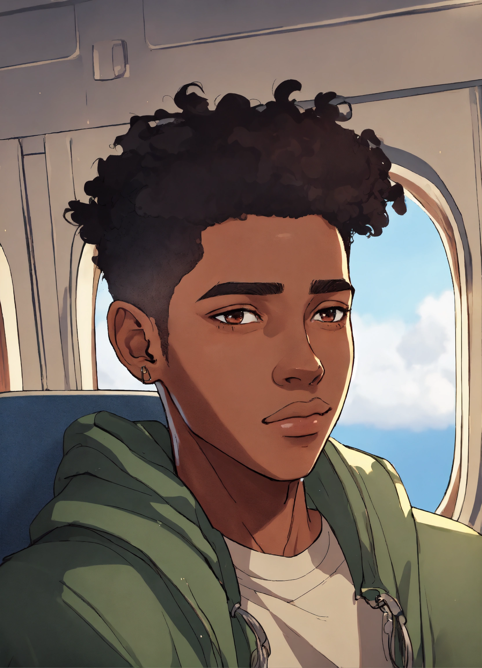 Young african caribbean chinese indian irish mixed race male, 20s, soft face, dark skin, with a sad smile, 4c high top fade, staring outside the window on a plane anime style
