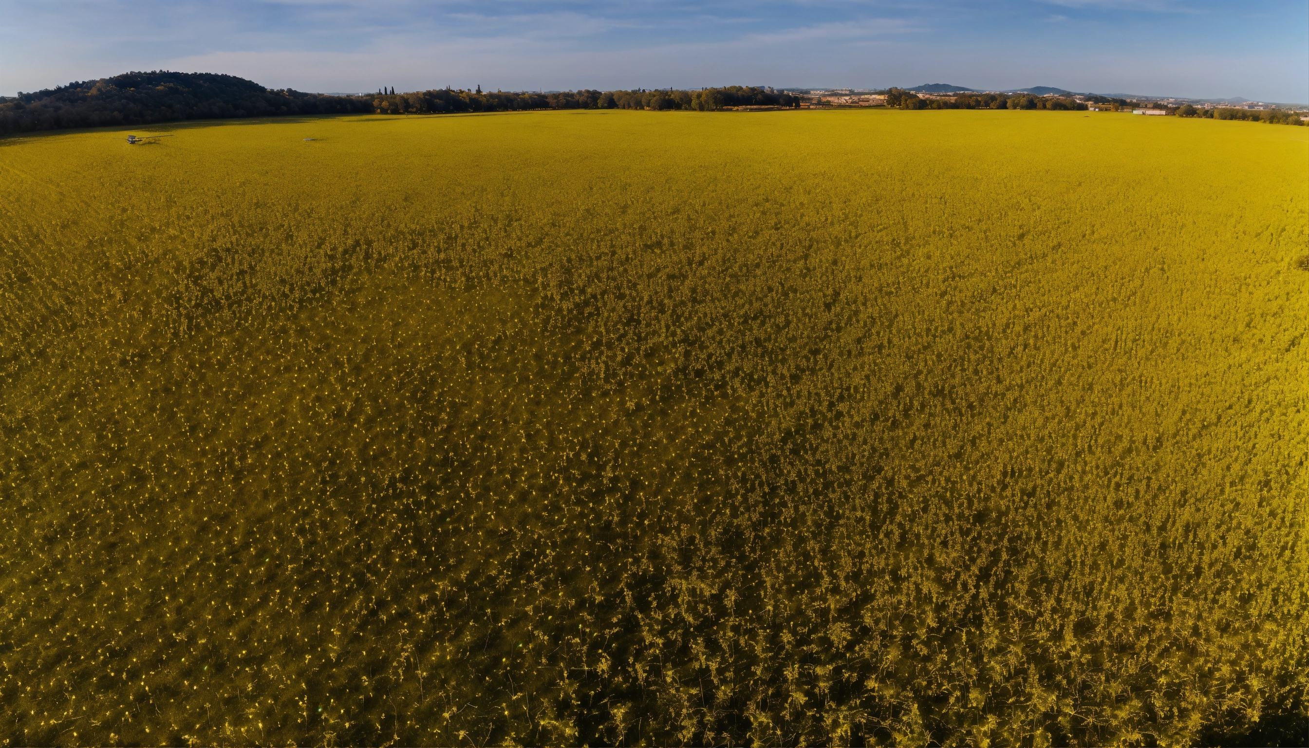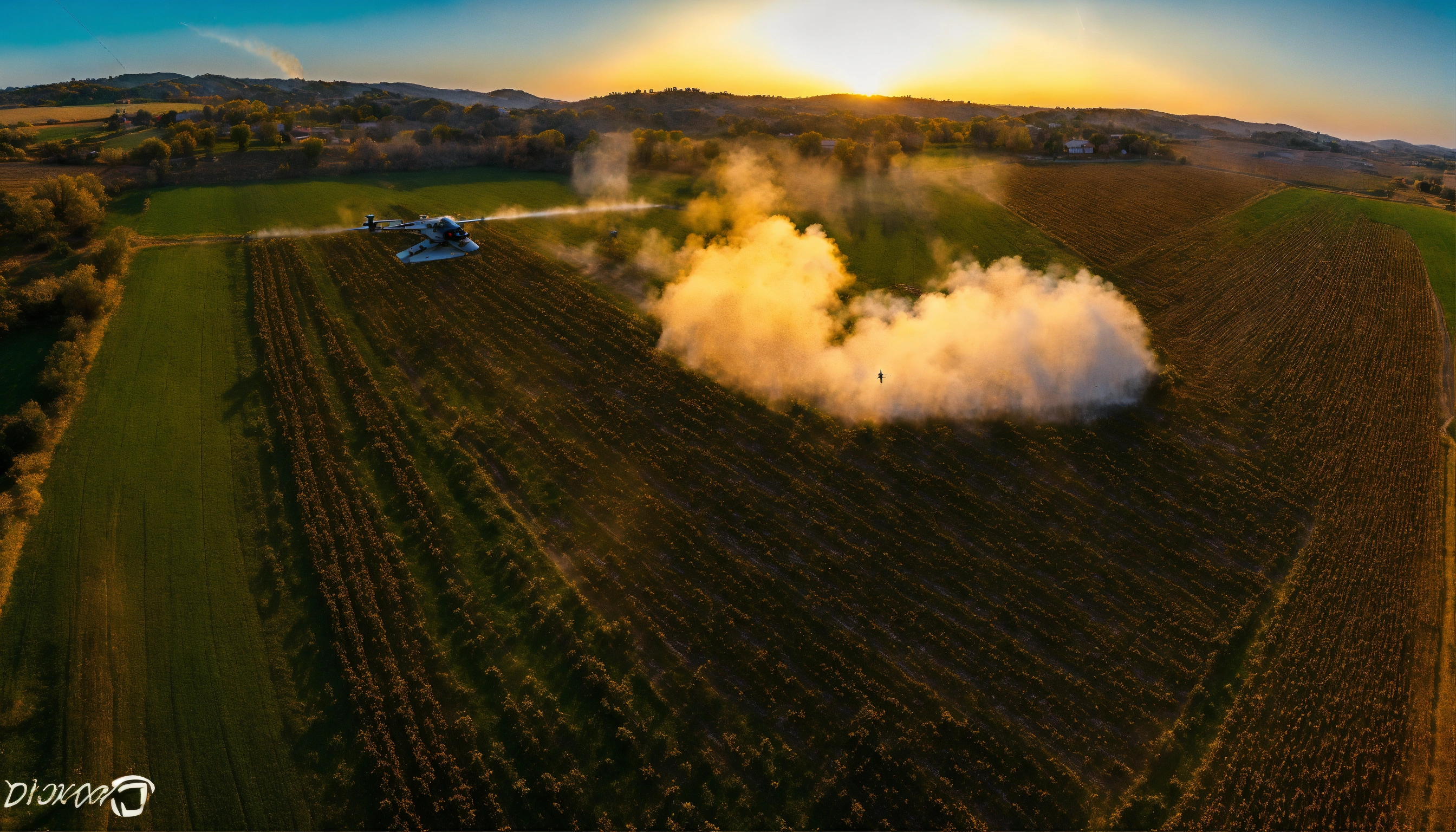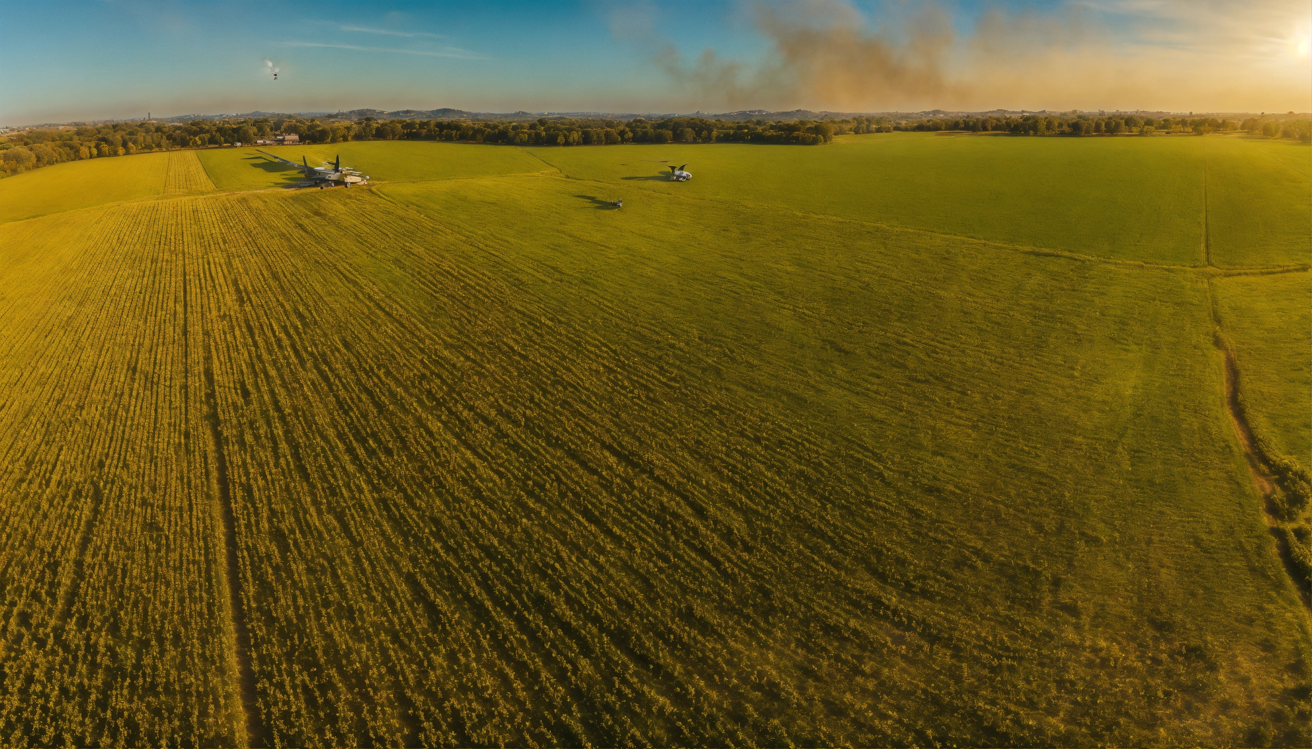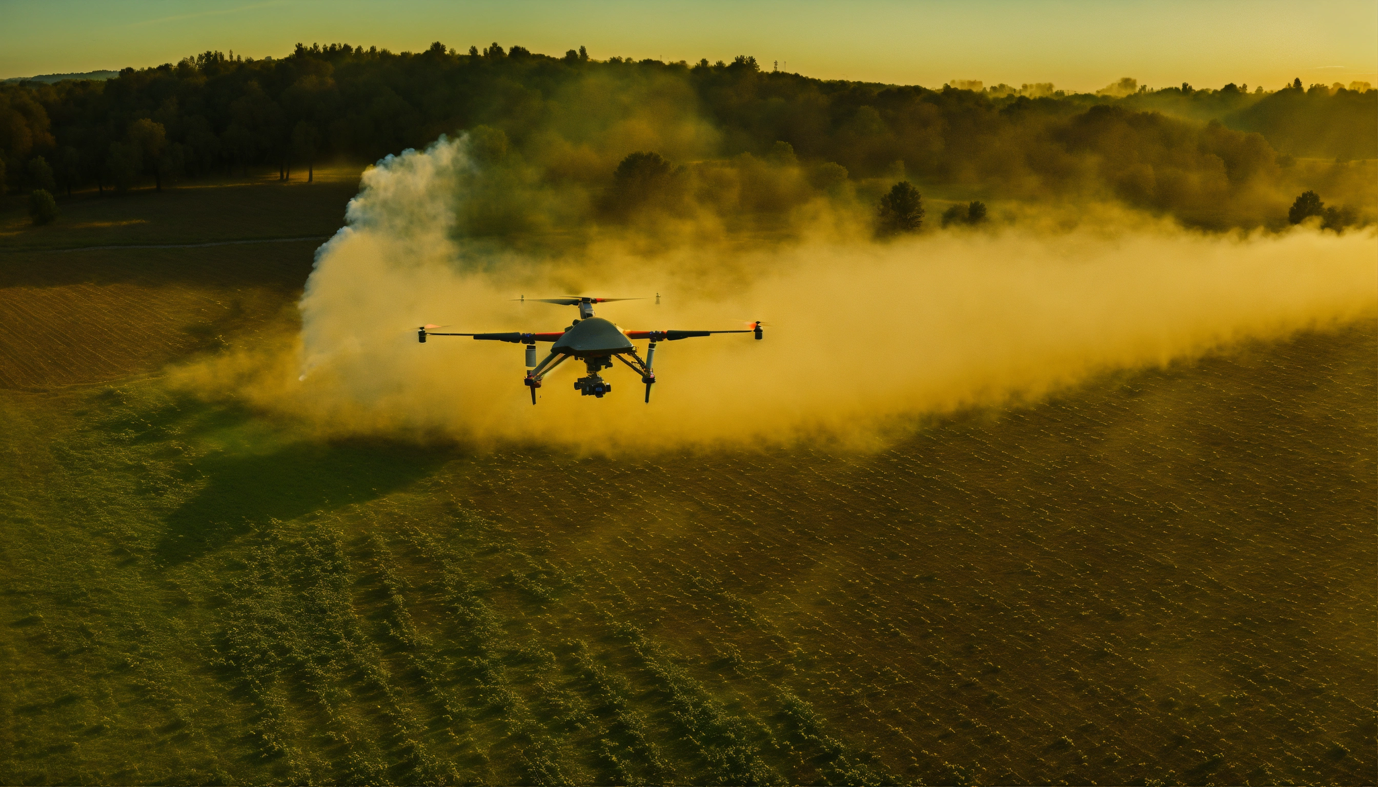 Dron t30 dji fumigando sobre un campo de maiz, vista aerea, 14mm, f16, 1/250, iso 100, al aterdecer en espana, noviembre
