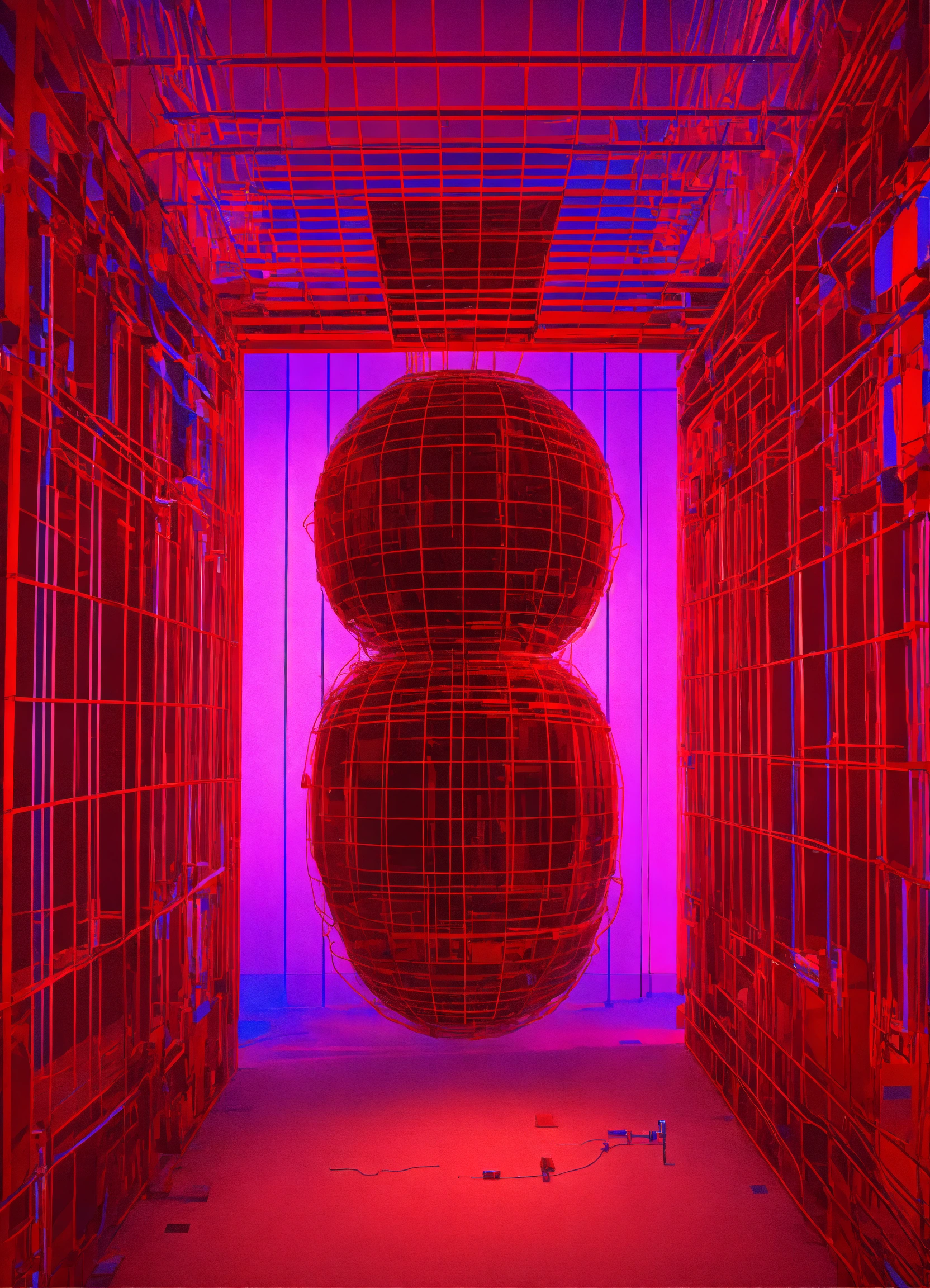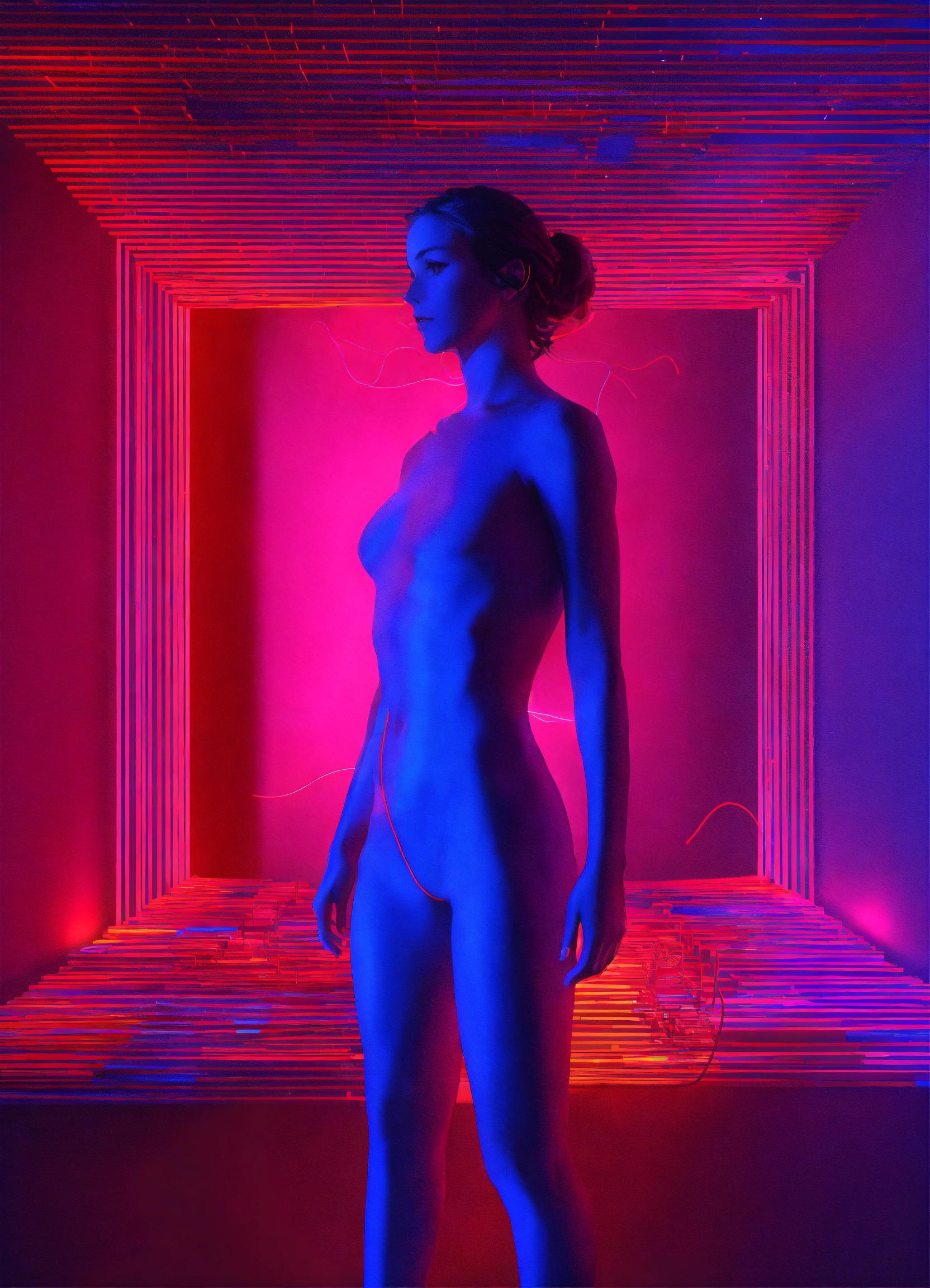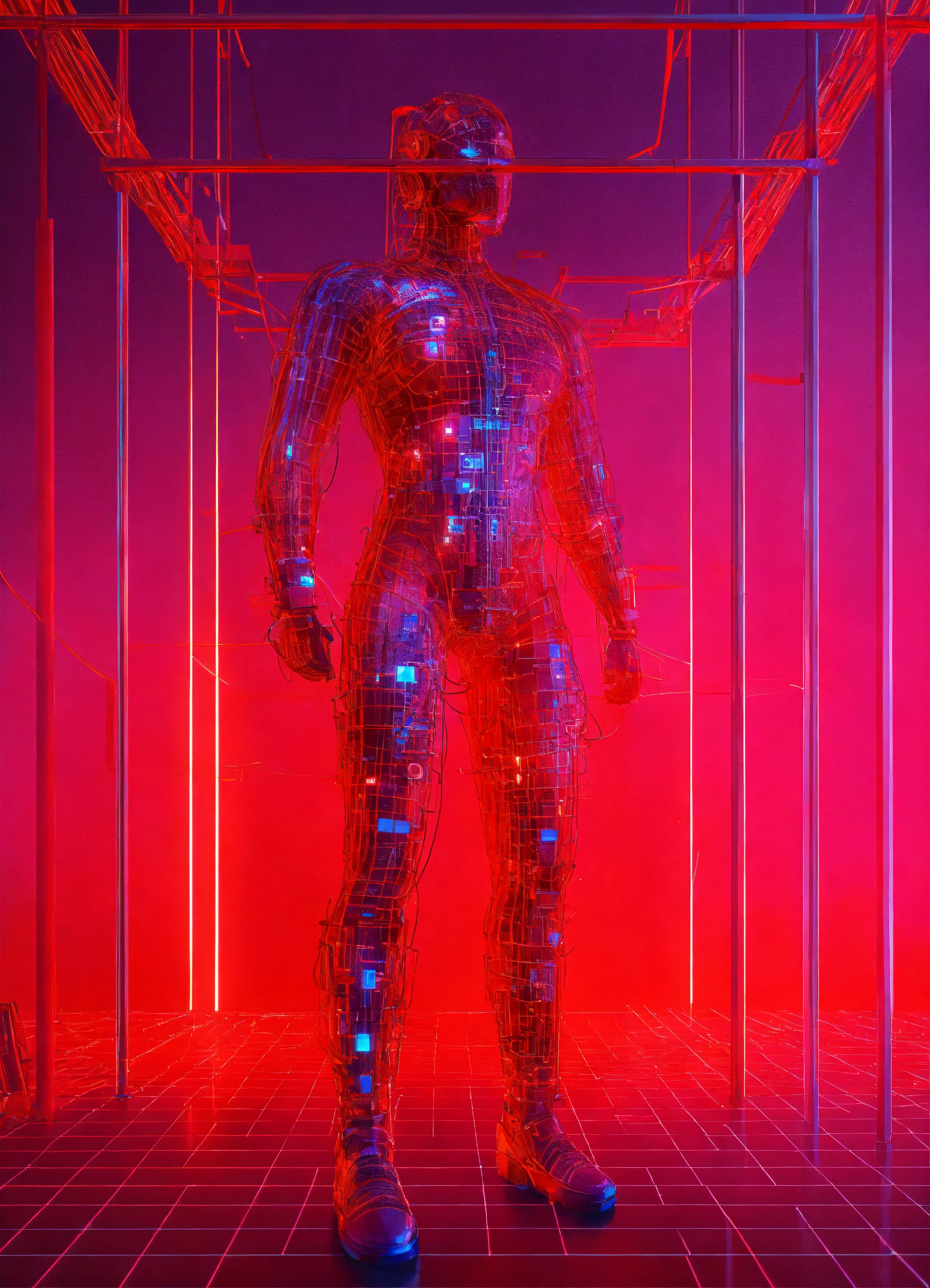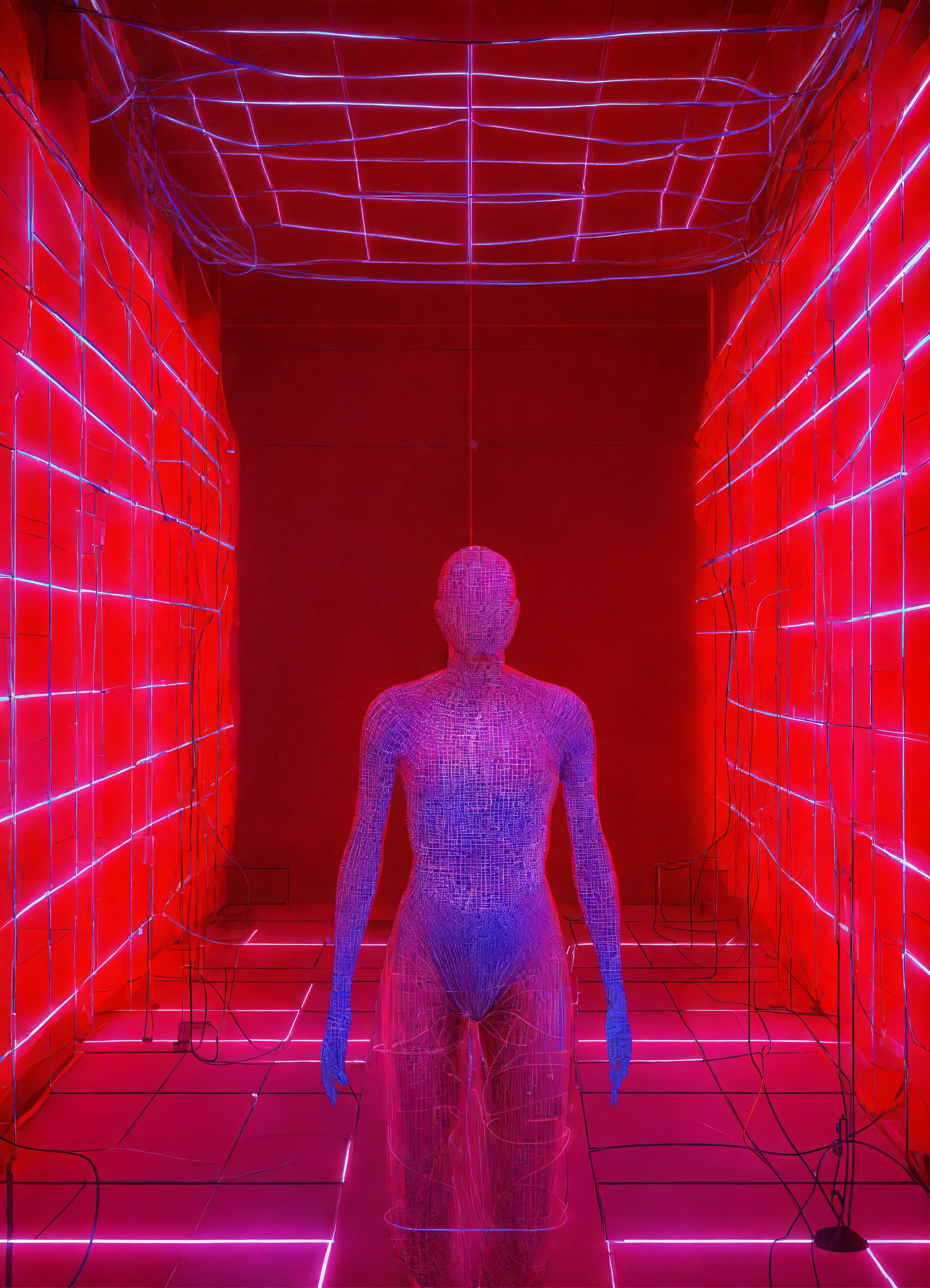 Cycles renderer + strips of light + red wireframe body + blue wired mind + violet above mind soul net