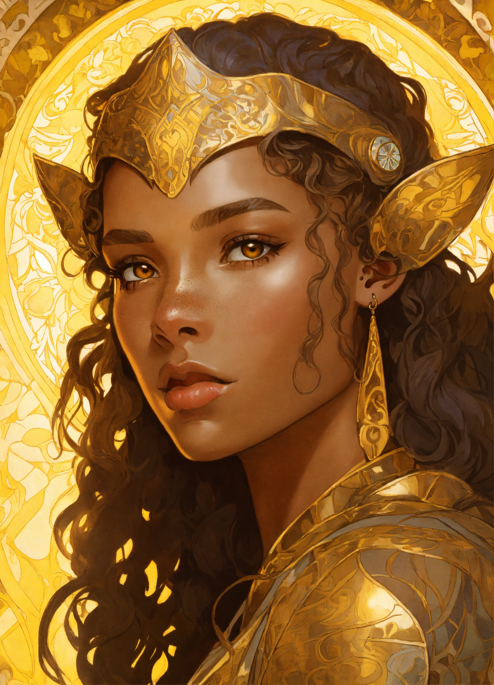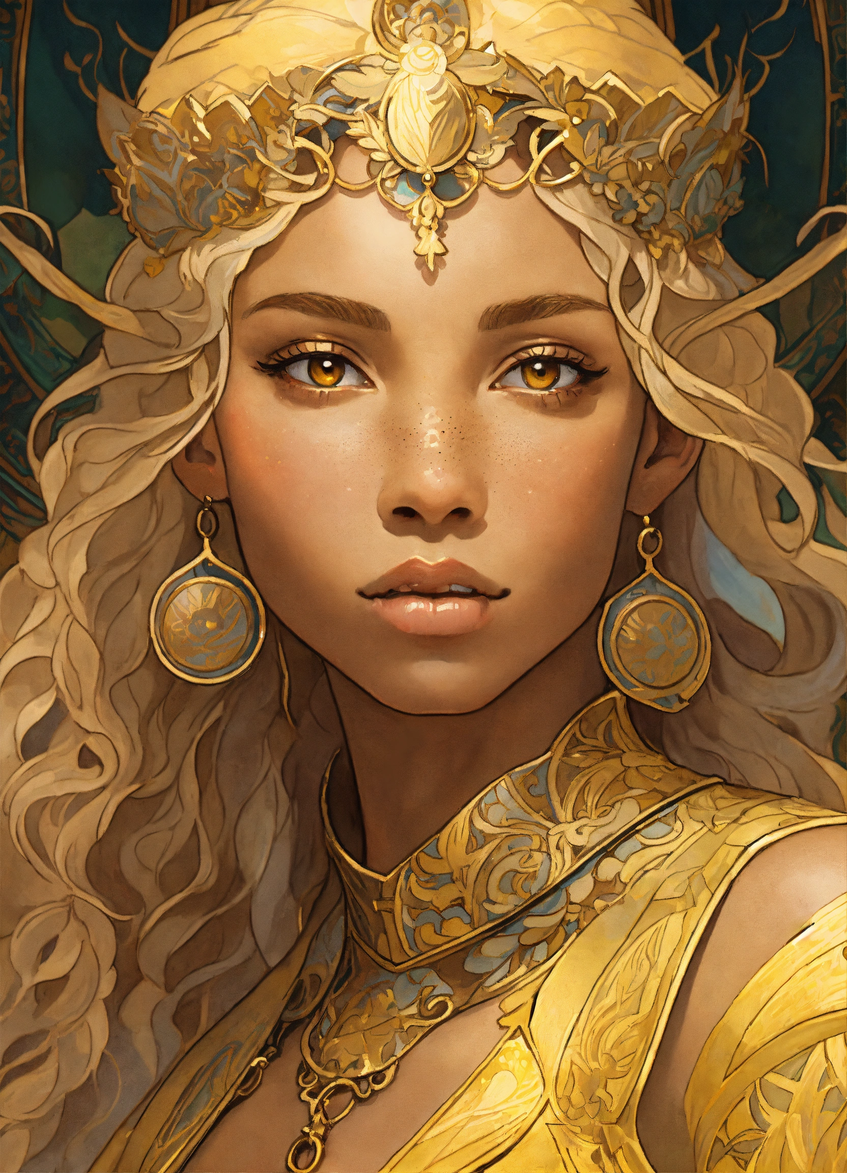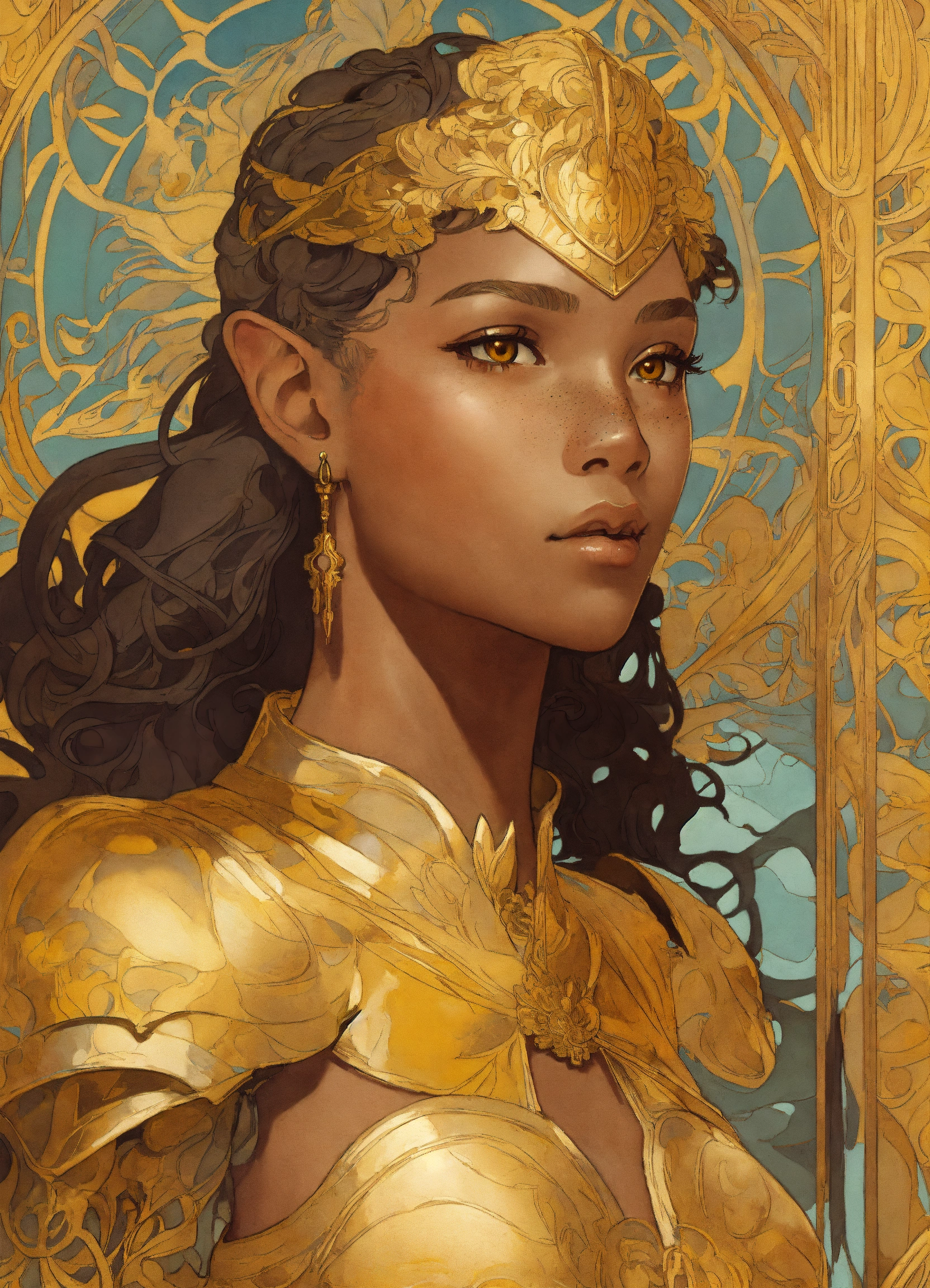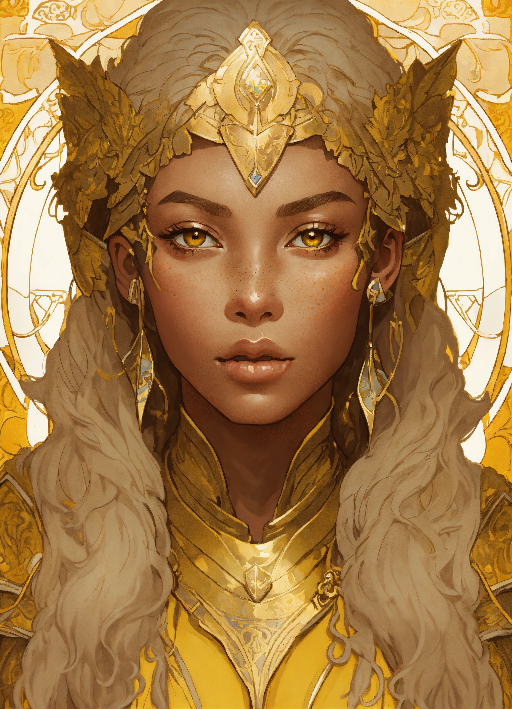 Portrait of a young elf biracial woman with bronze skin, bright yellow eyes, freckles, high cheekbones, long curly blonde hair, wearing light gold armor, art by alphonse mucha, stylized, intricate, delicate