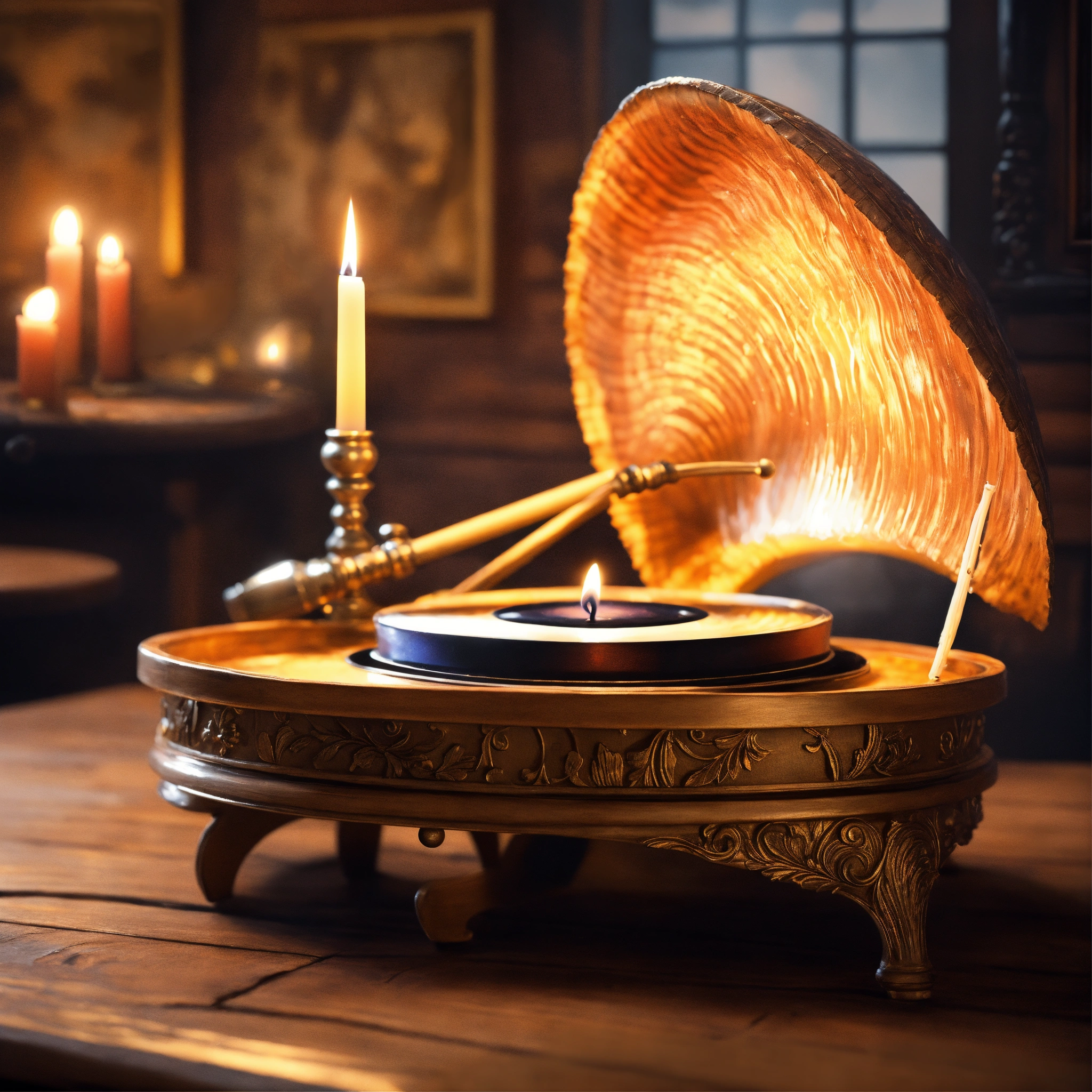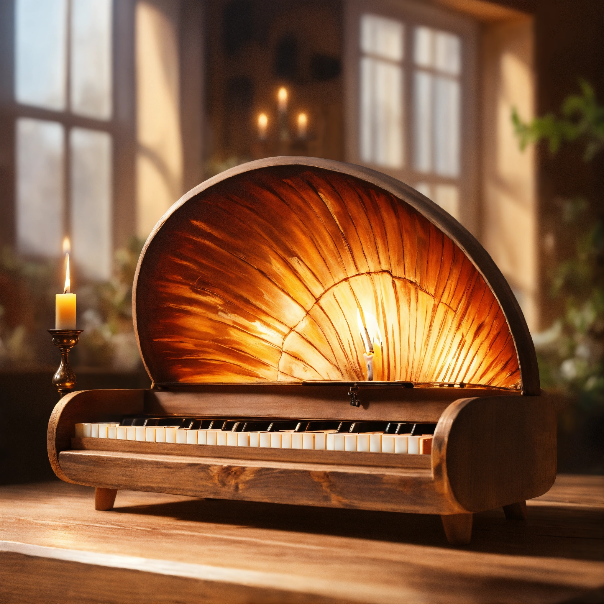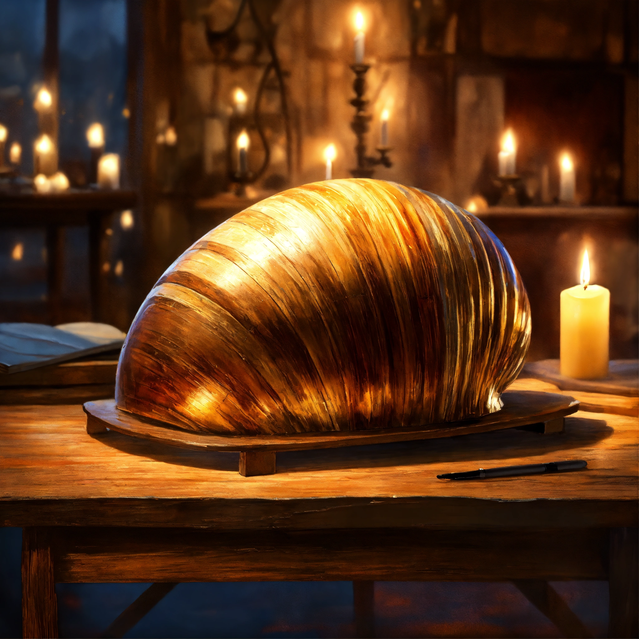 Concept art of a music shell on a wooden table, candle lit, highly detailed, oil painting style, brush strokes, 8k