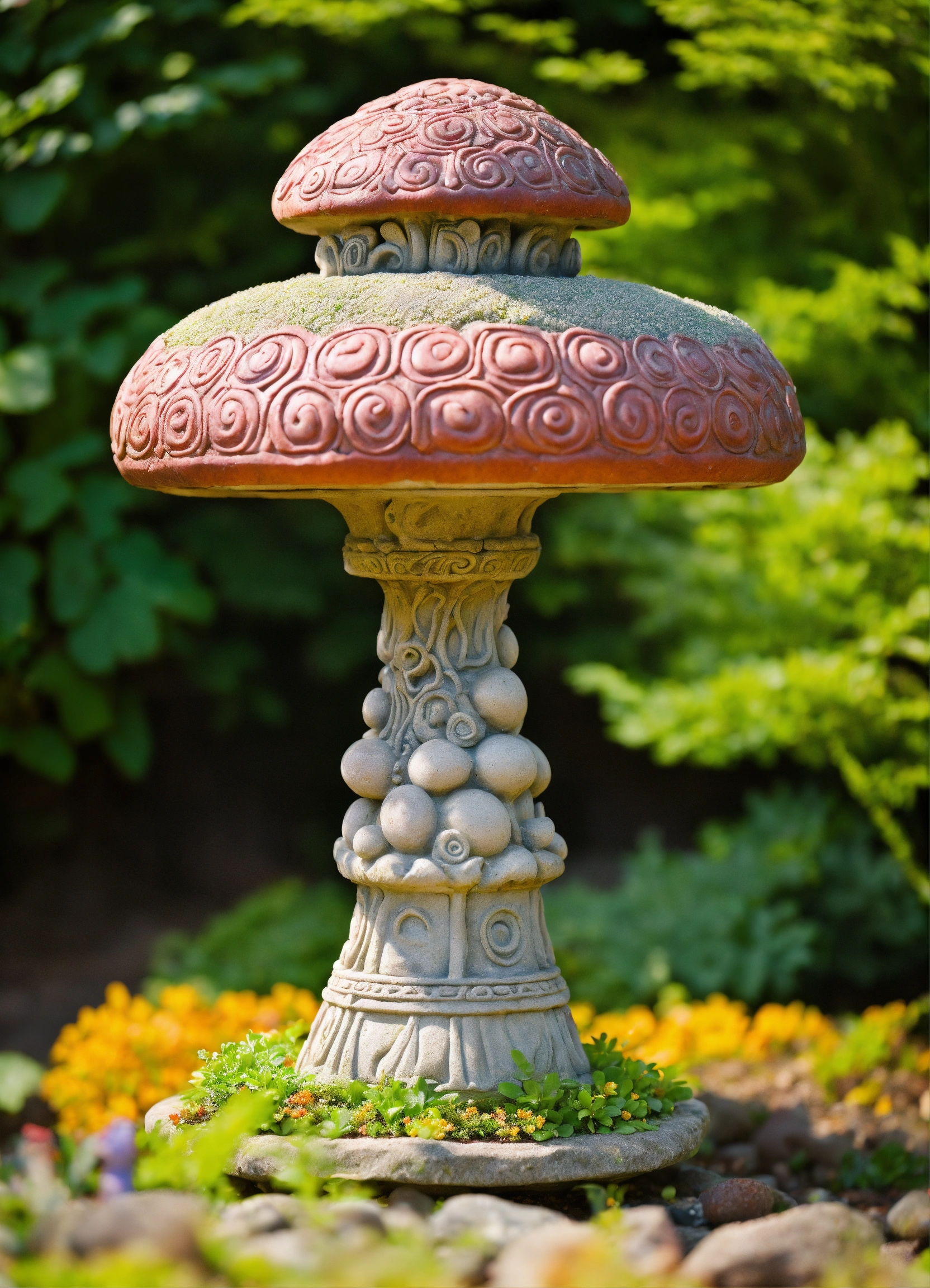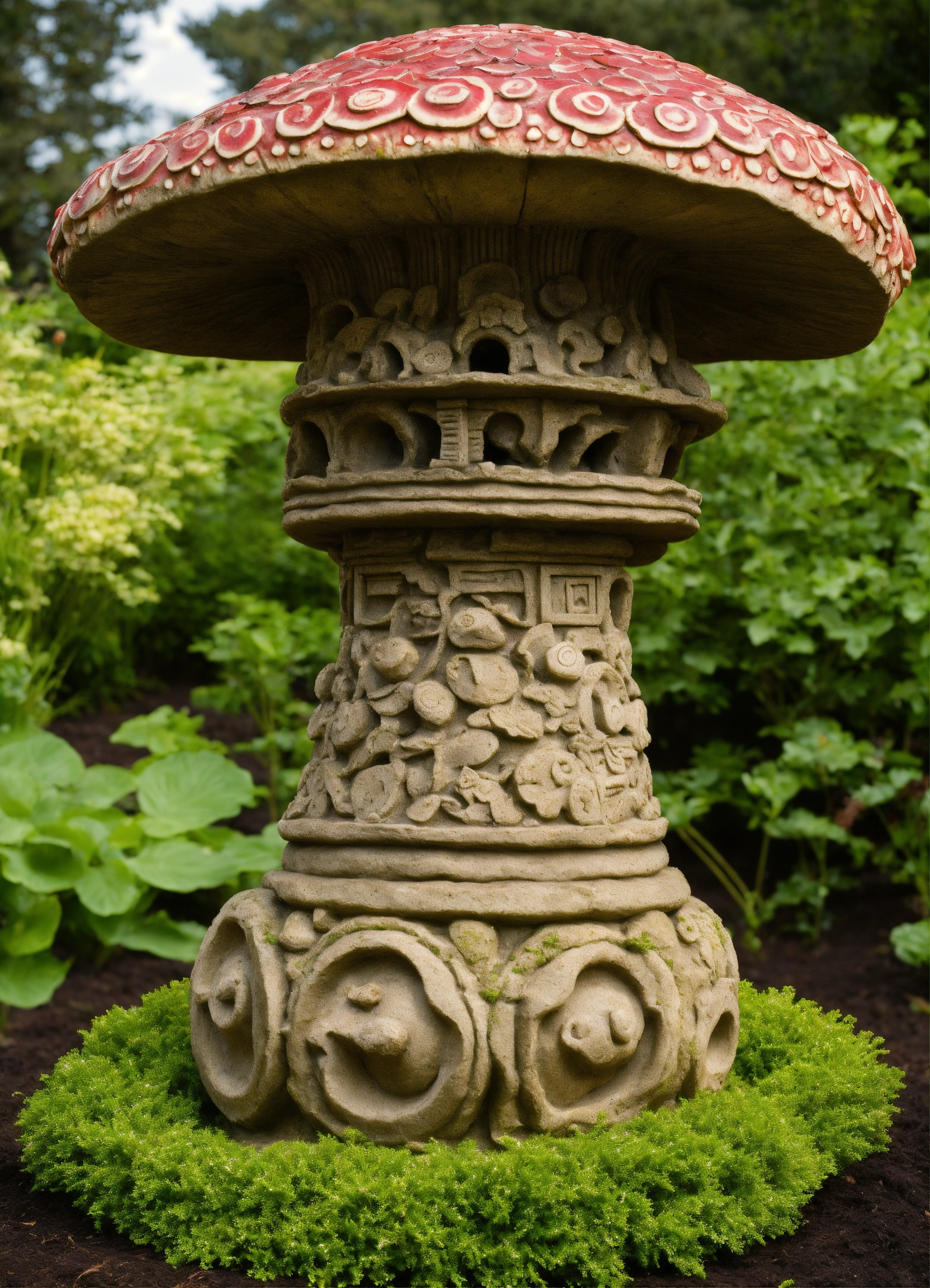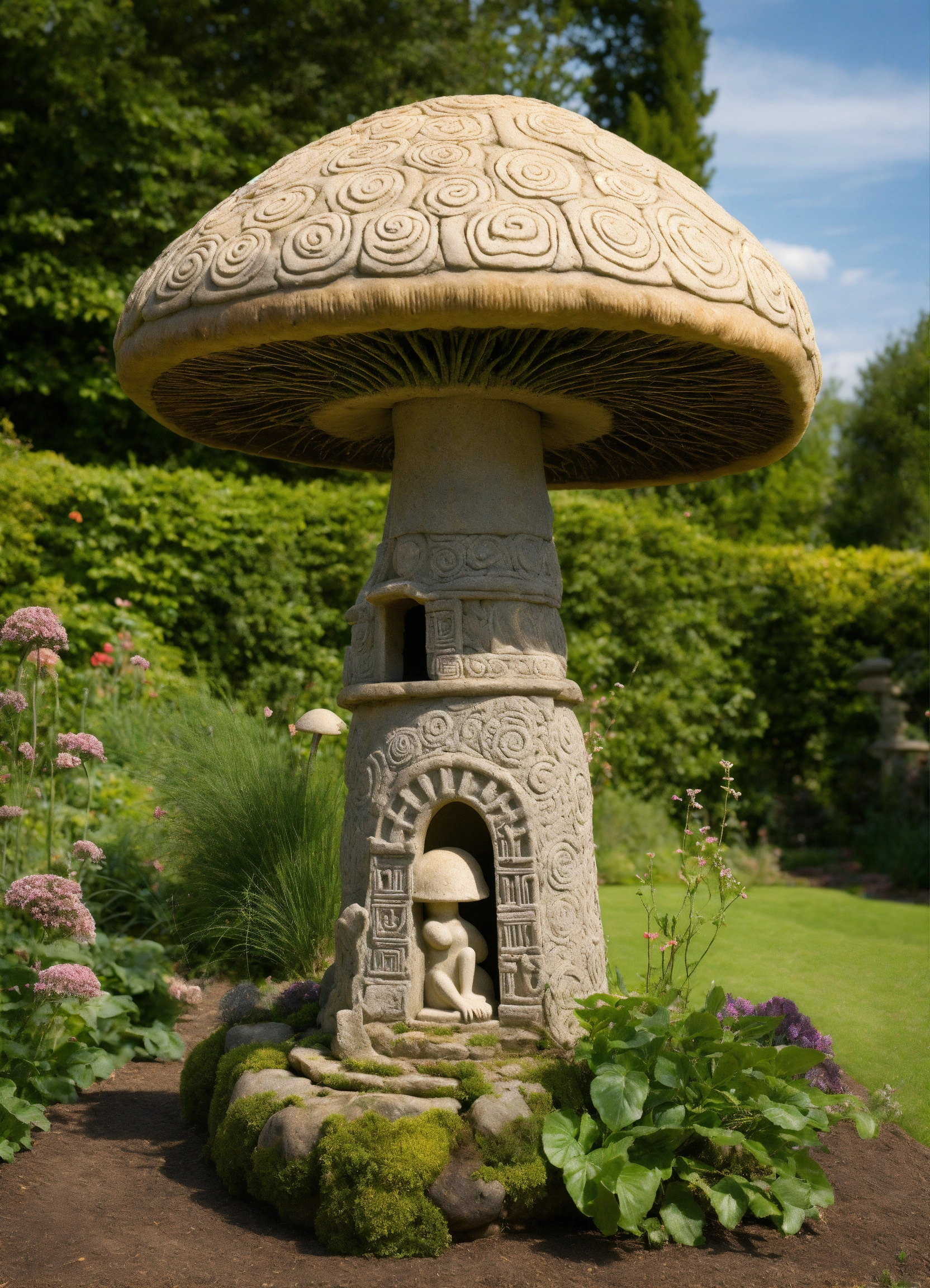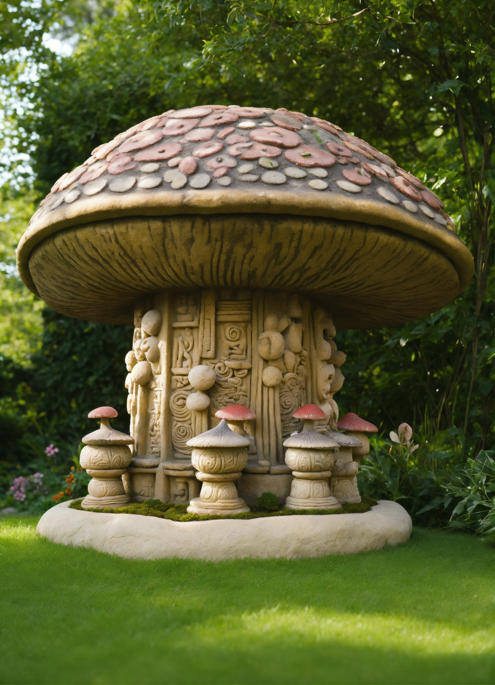 Ancient stone mushroom temple sculpted garden ornament in the style of alex grey