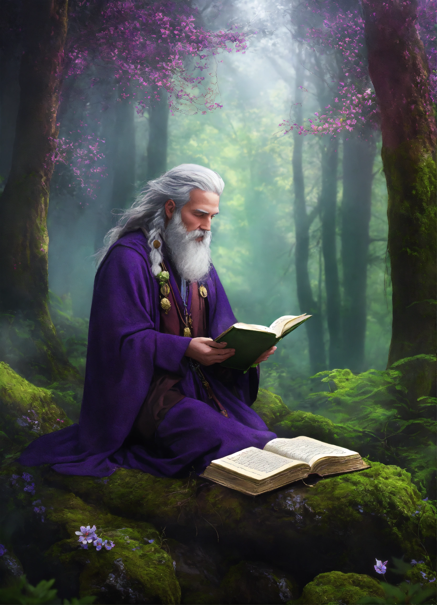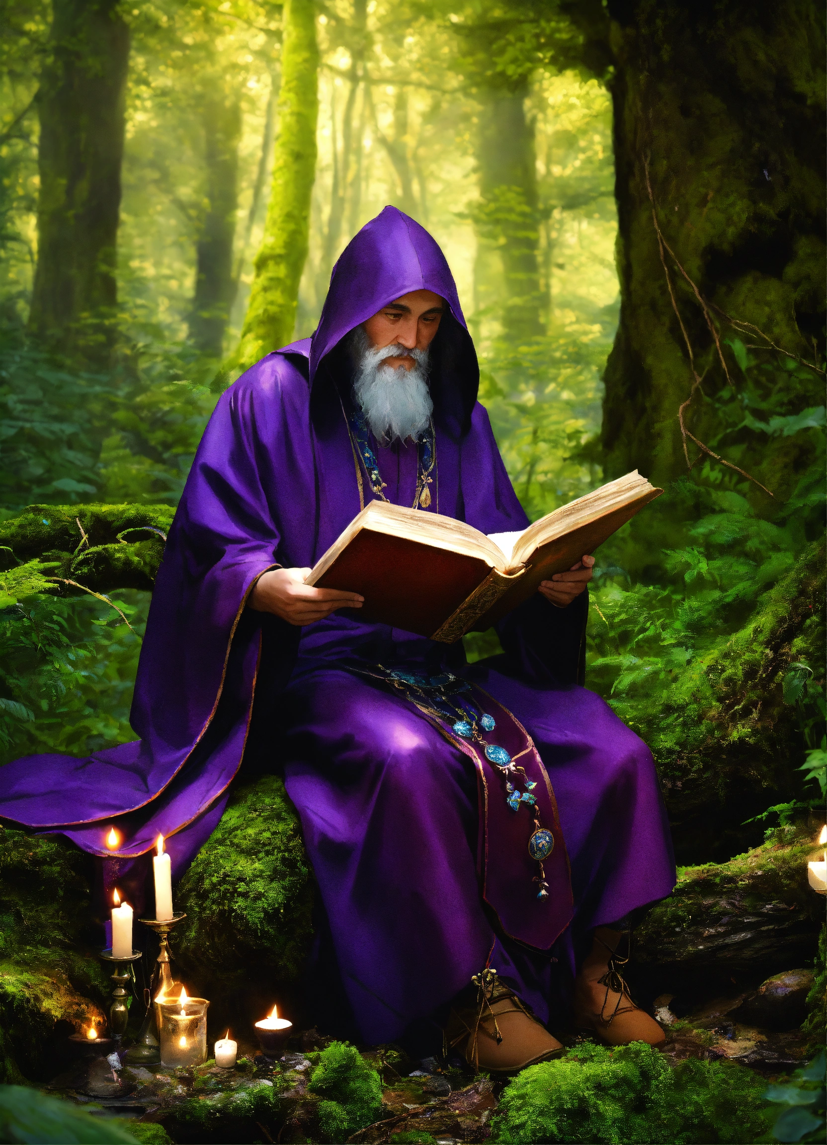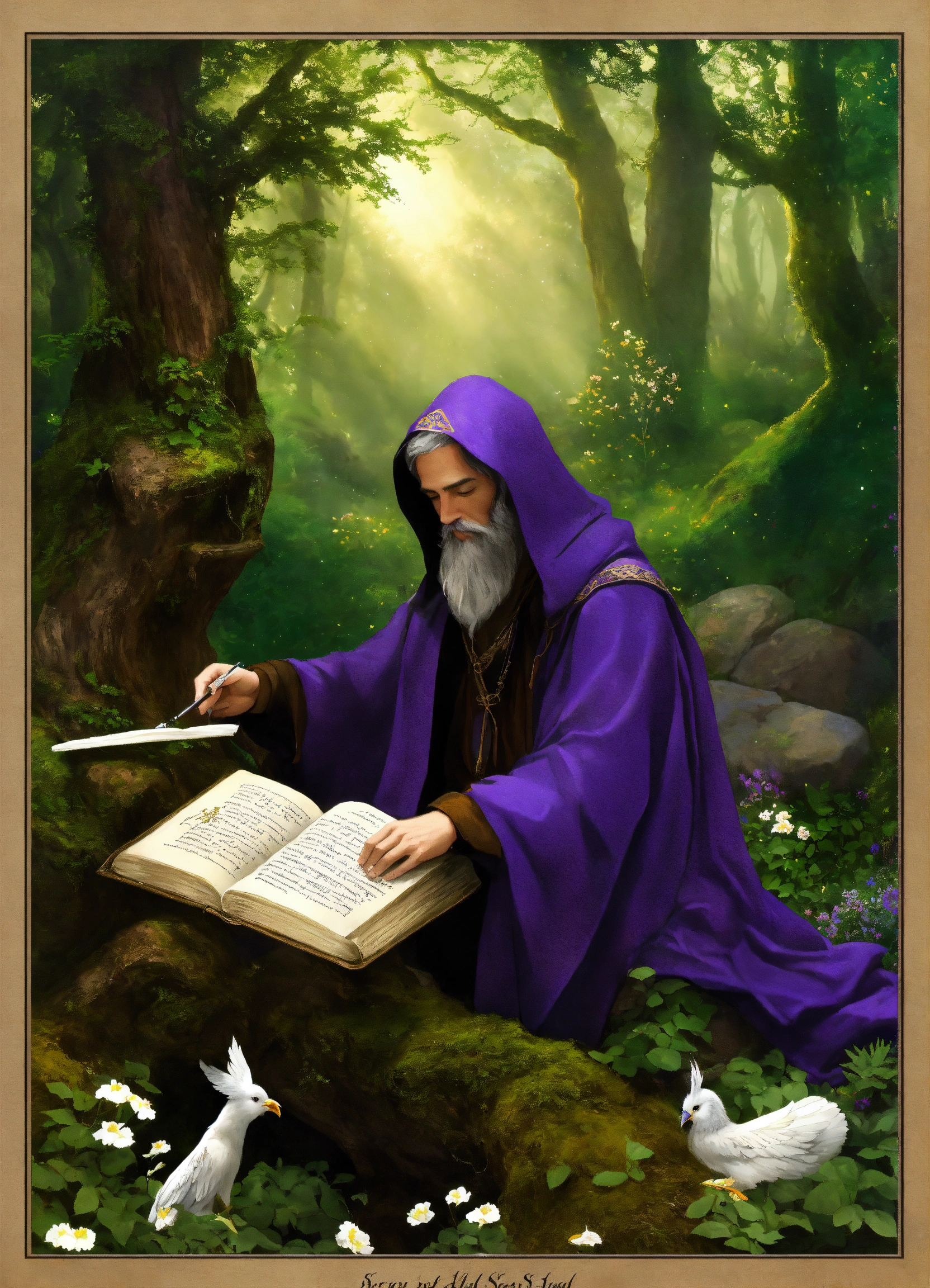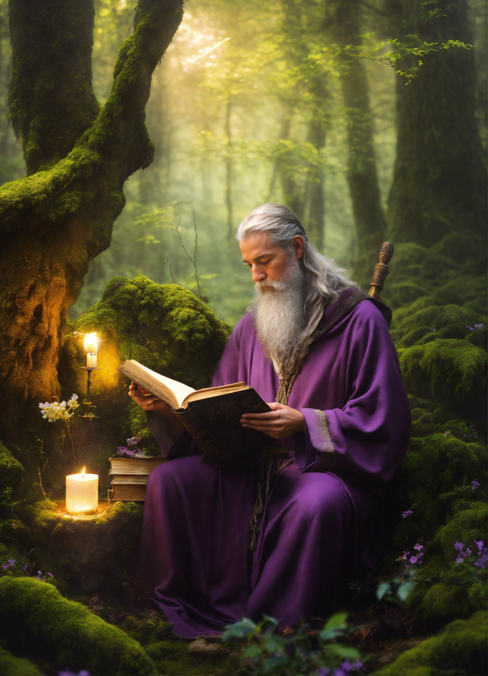 In a dense forest, a solitary druid without the long beard with a masculine appearance in a purple robe writes a sacred book of shadows. their hands glide across the pages, using a white feathered quill. the forest comes alive as the druid writes, protected by ancient trees. moss-covered stones and wildflowers add to the enchantment. the druid's quill merges nature and mysticism, creating a book of shadows that holds the universe's secrets.