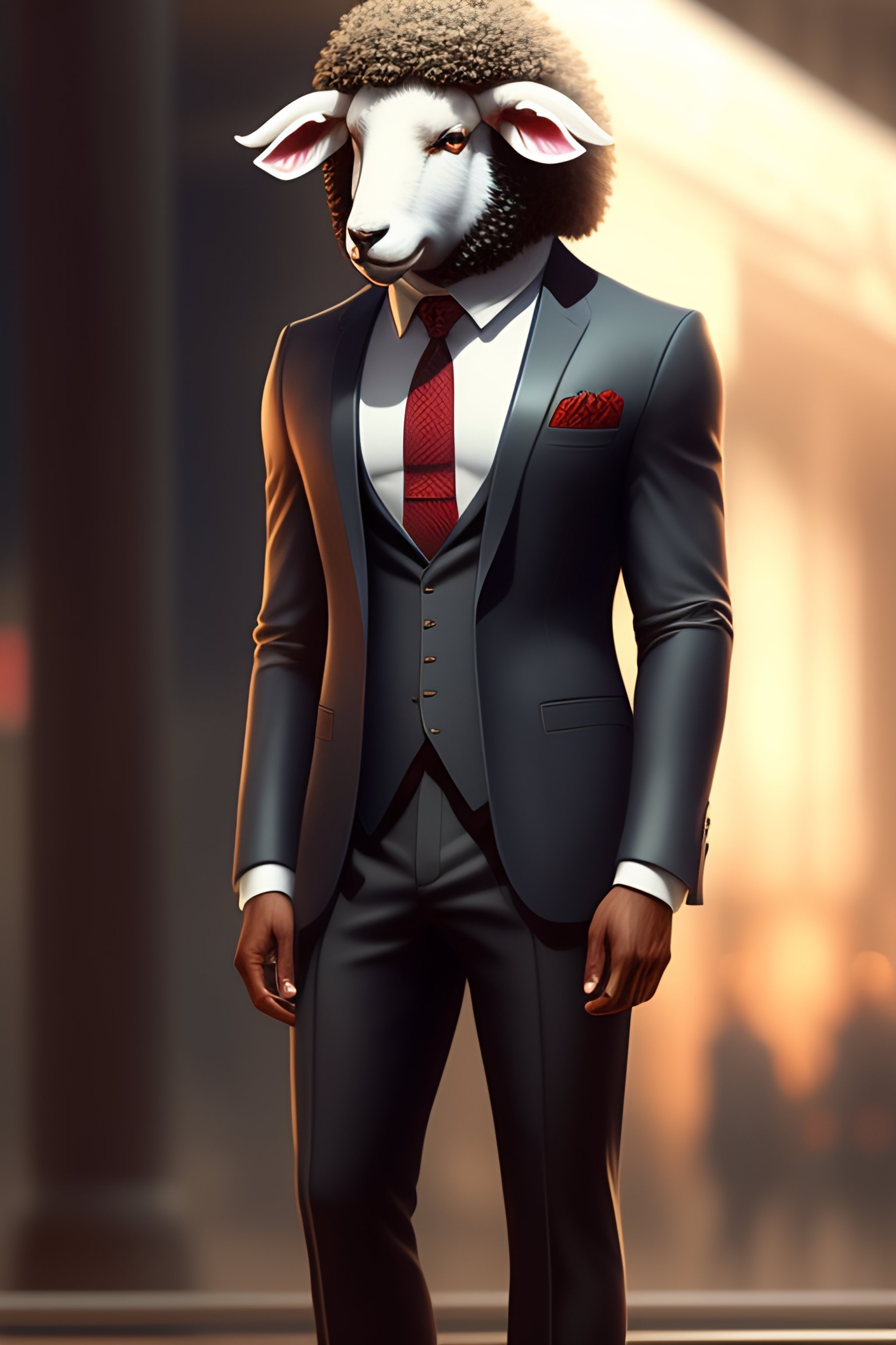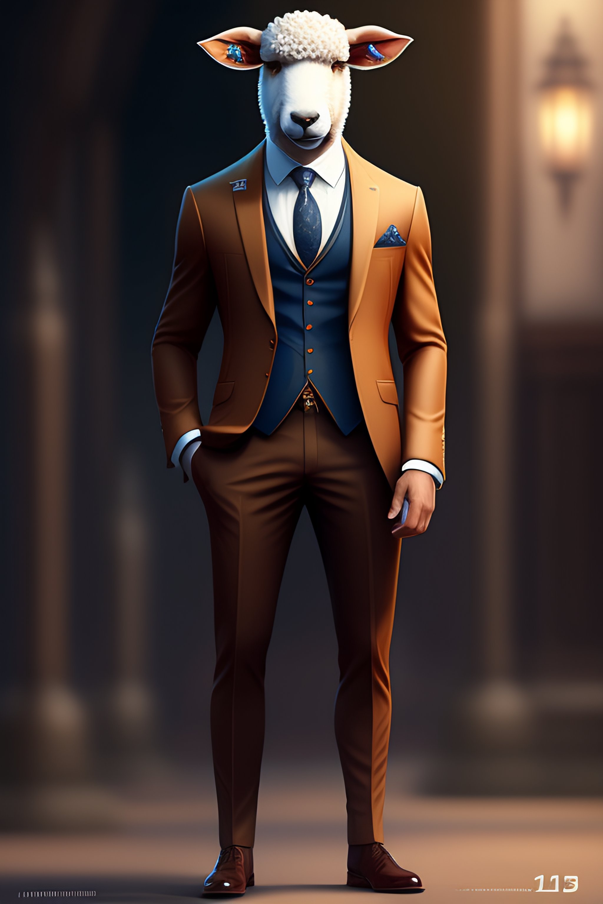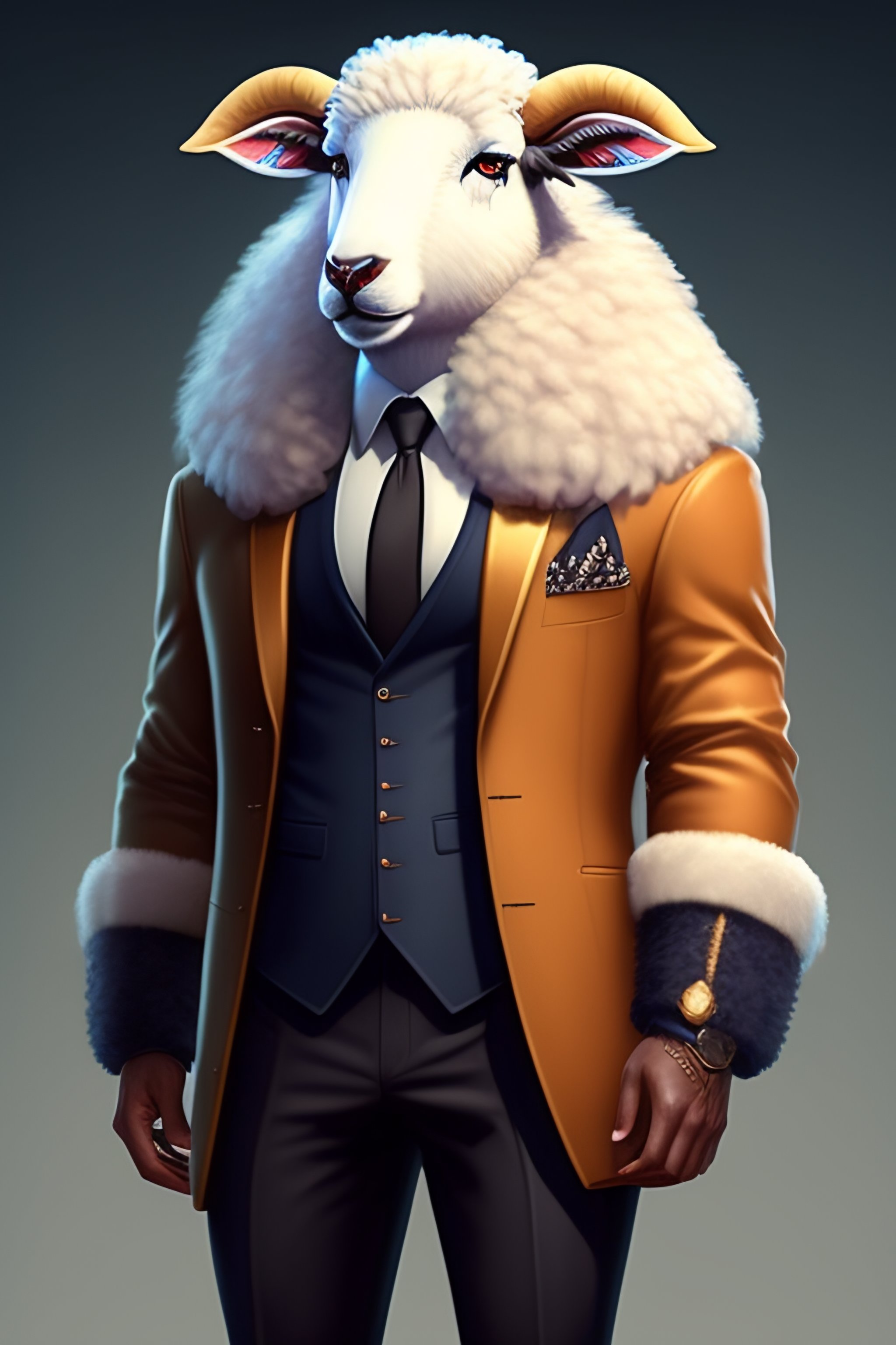Anthro furry humanoid sheep, three piece suit, checking watch, character concept design, painting, detailed, vivid, trending on artstation