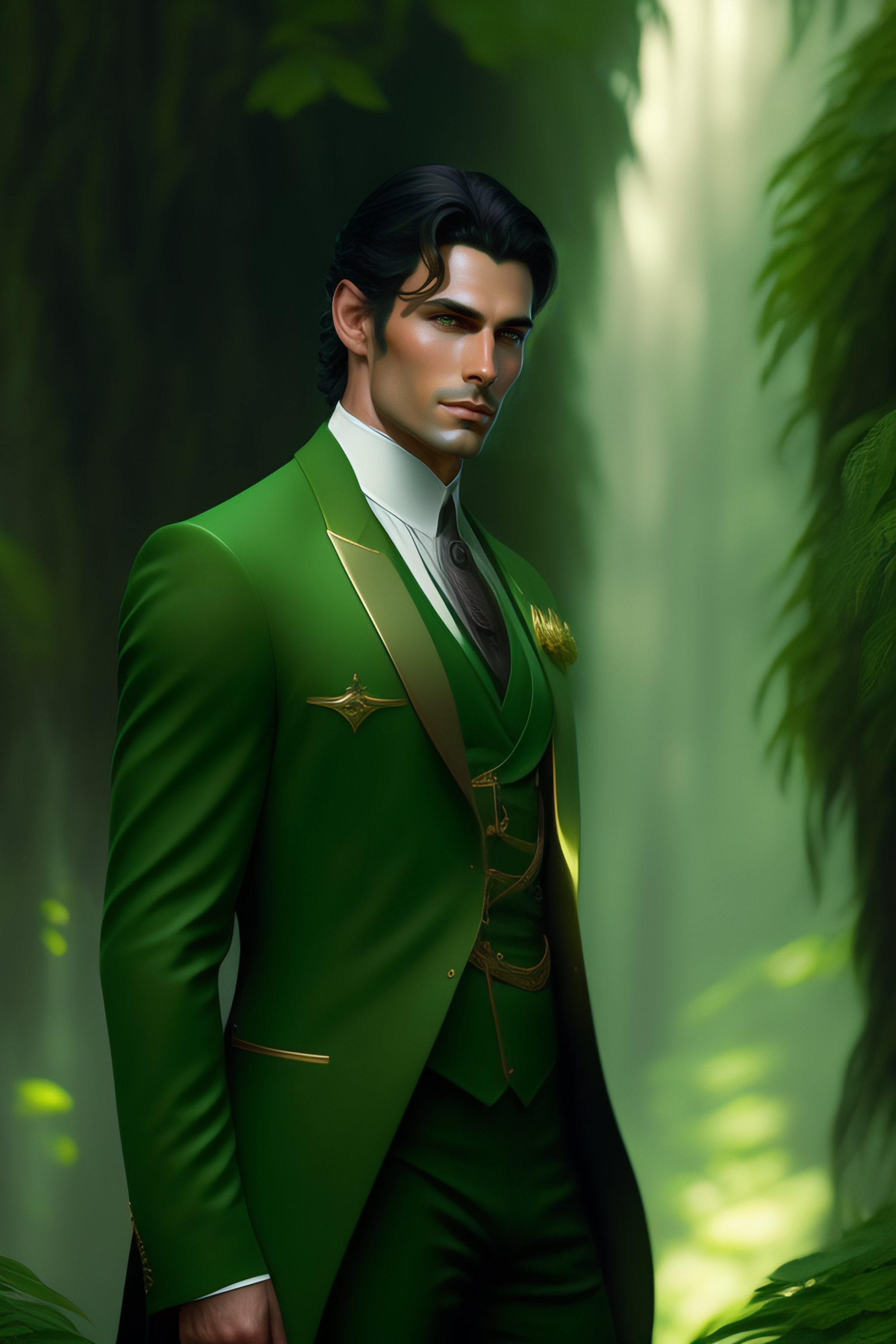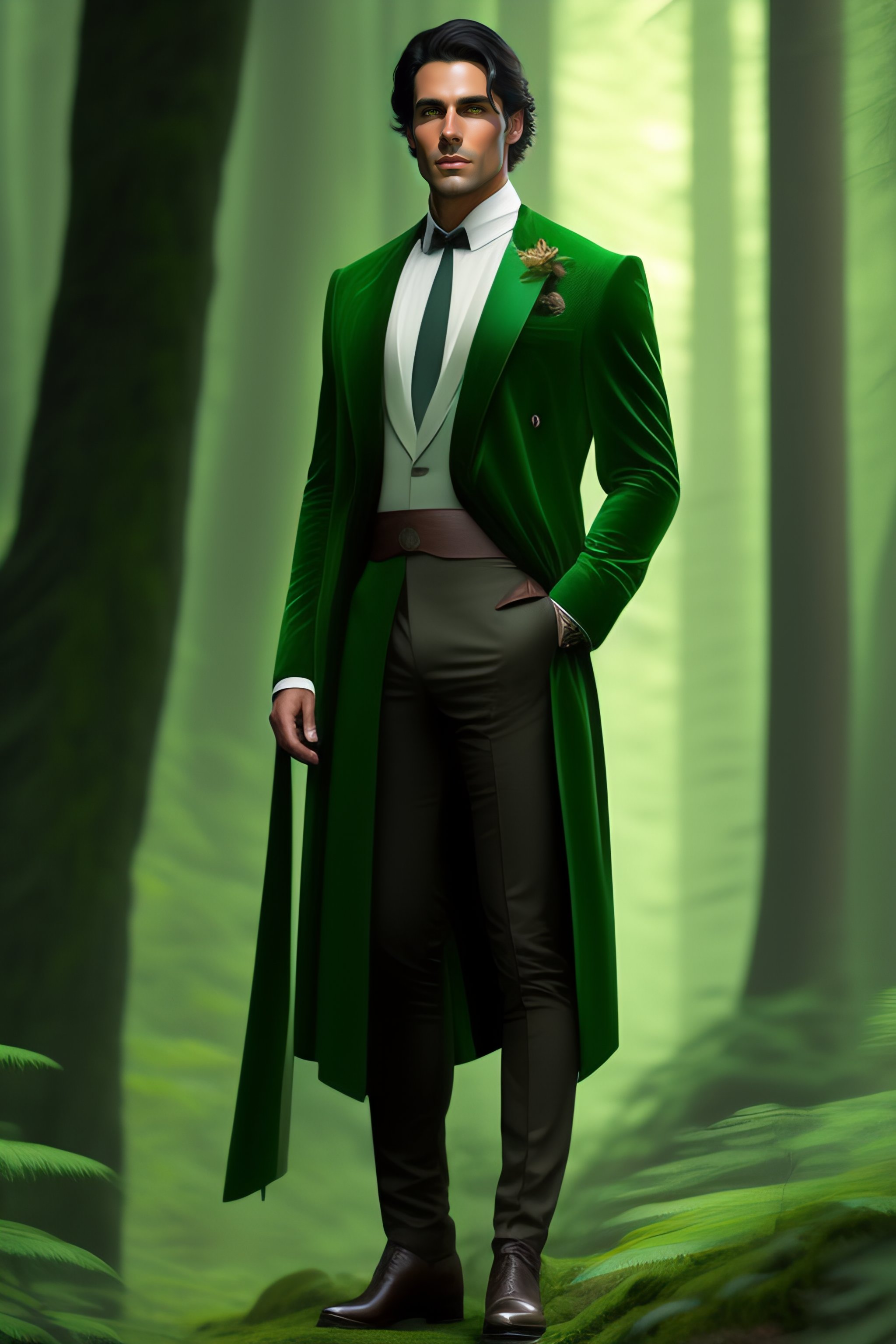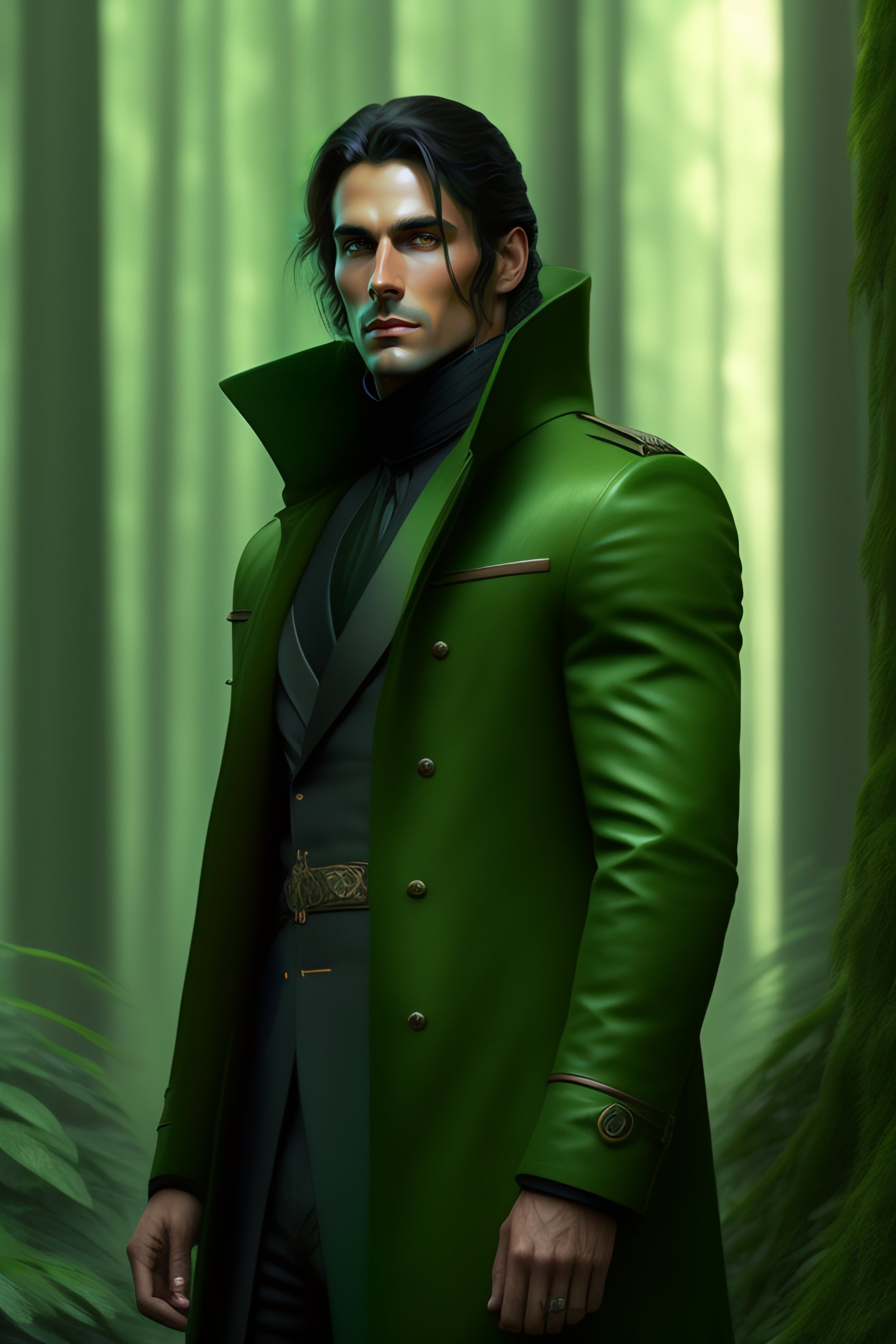 Full length shot of handsome dark haired male standing in alien green forrest highly detailed, digital painting, deviantart, artstation, concept art, matte, sharp focus, photo realistic, detailed face, realistic pale skin, greg rutkowski and alphonse mucha