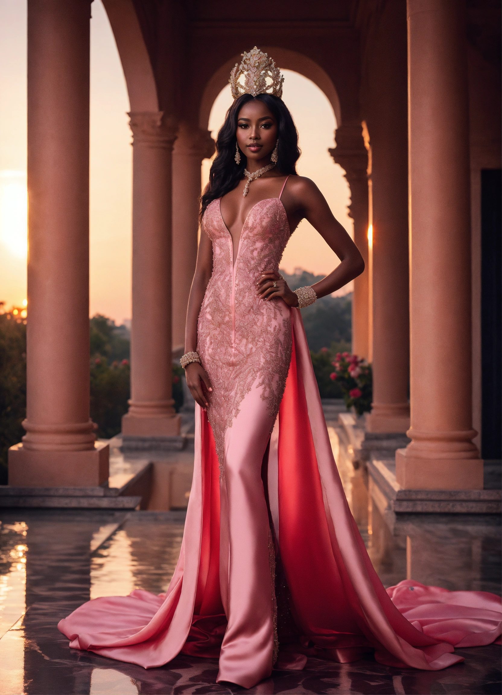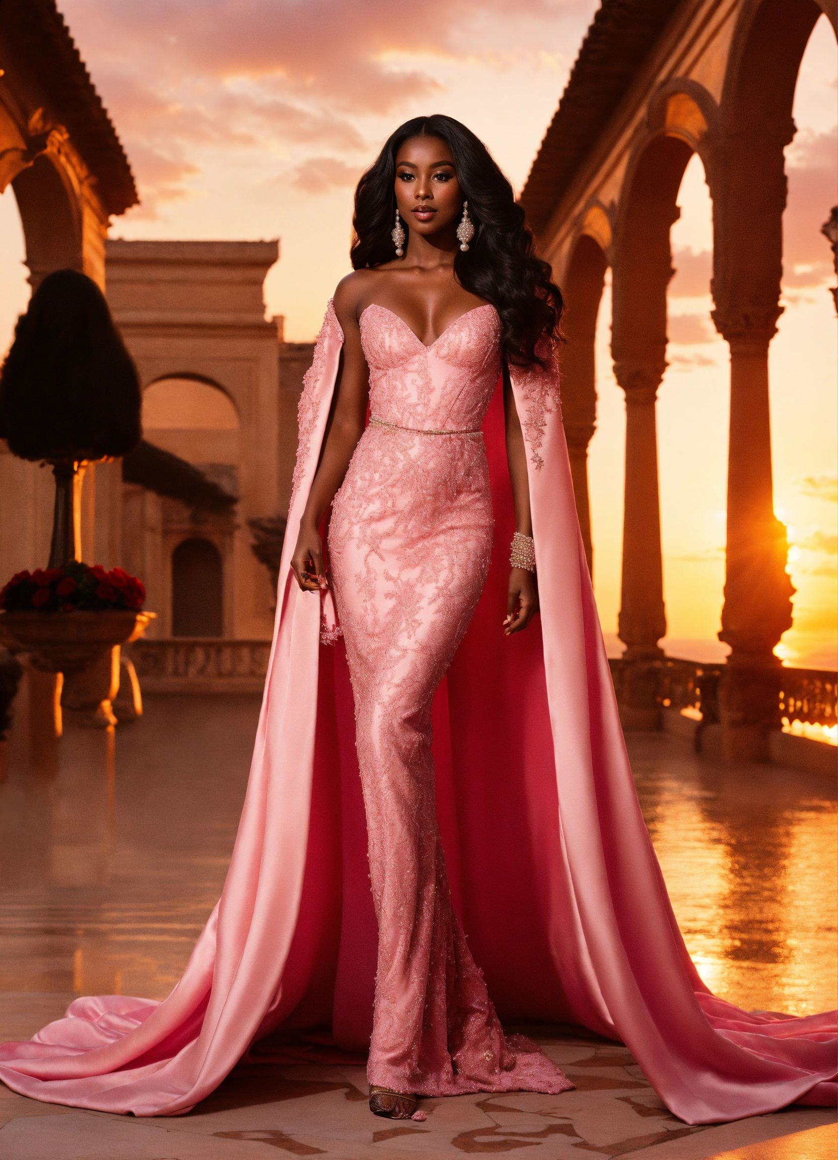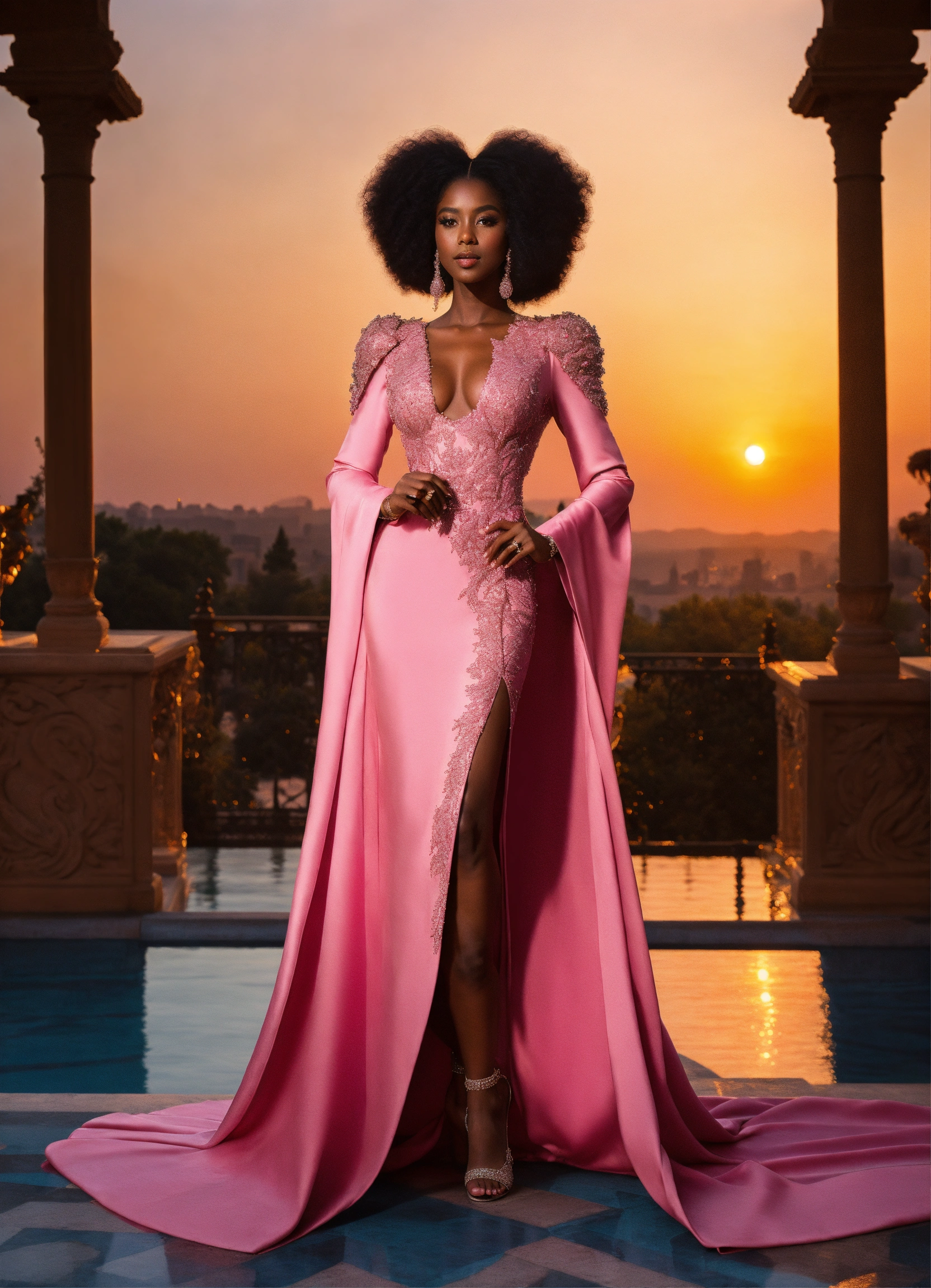 Alien queen, dark skin, long dark hair. pearl-embellished head-peice, wide hips. dressed in pink haute couture dress and robe, open toe heels, standing on a sumptuous palace terrace at sunset. outgoing persona.