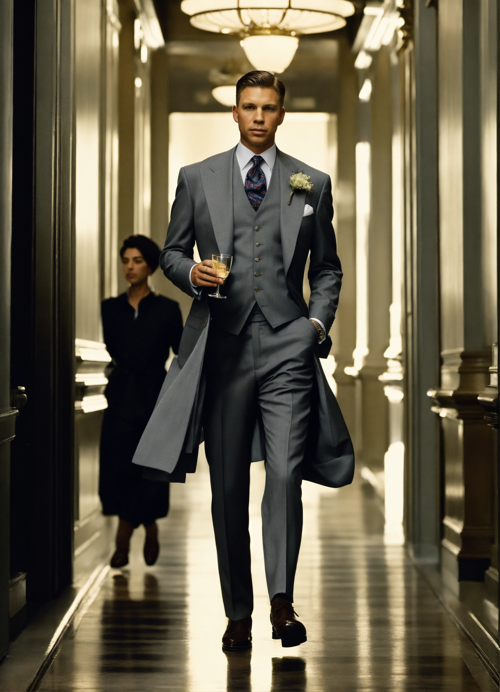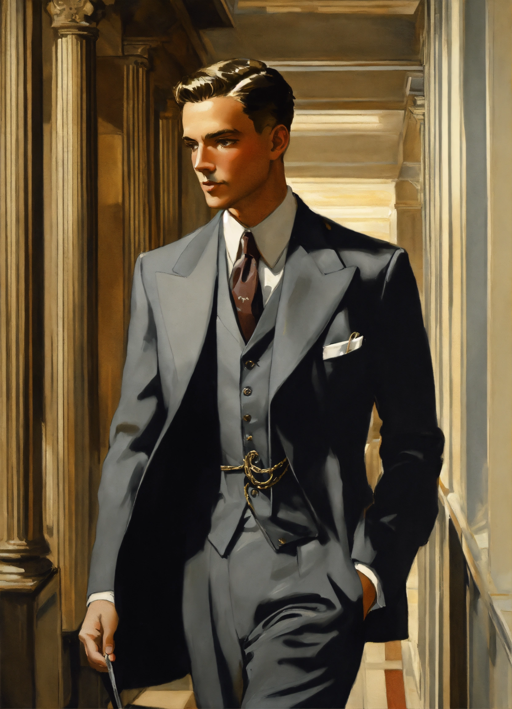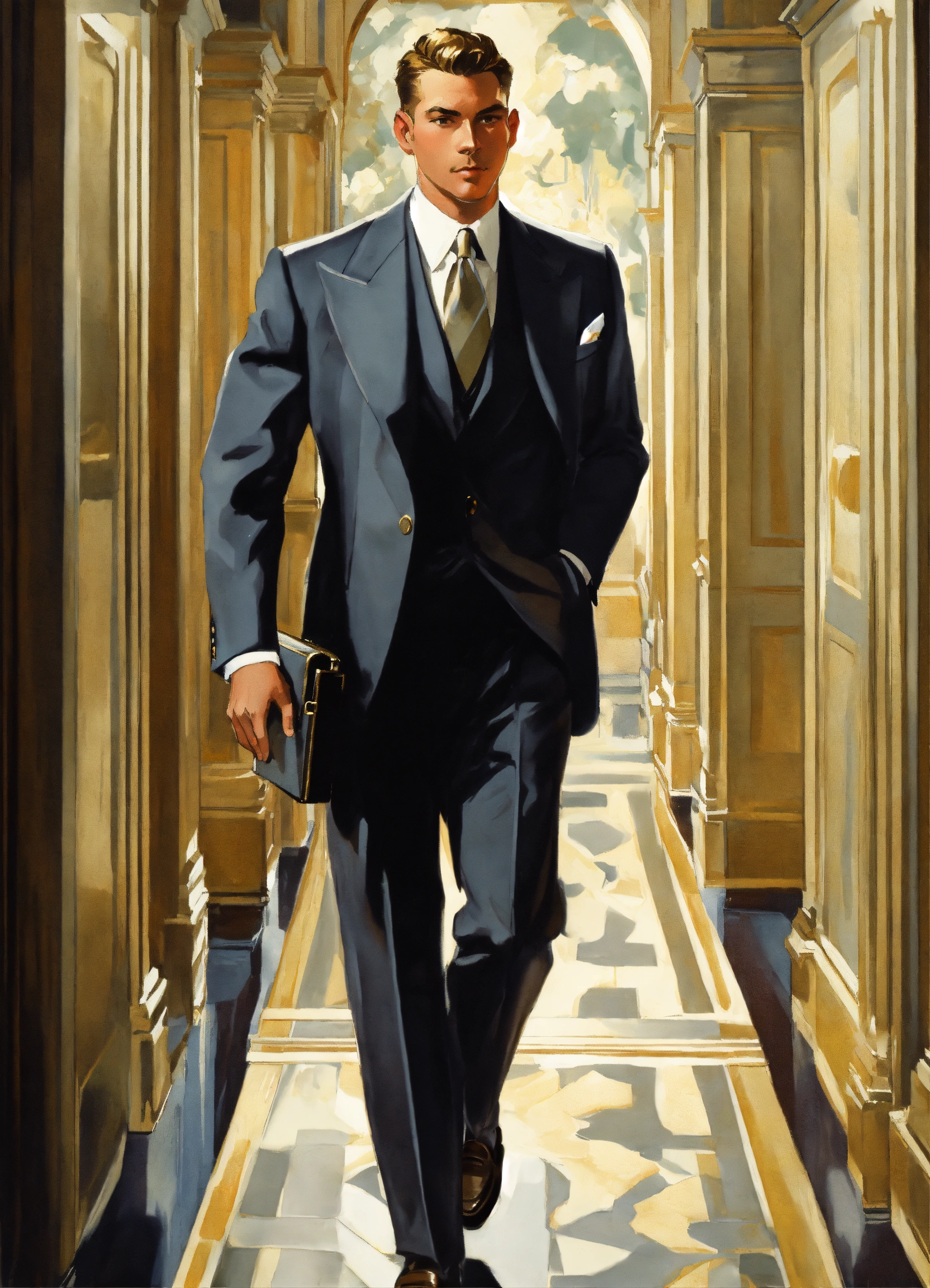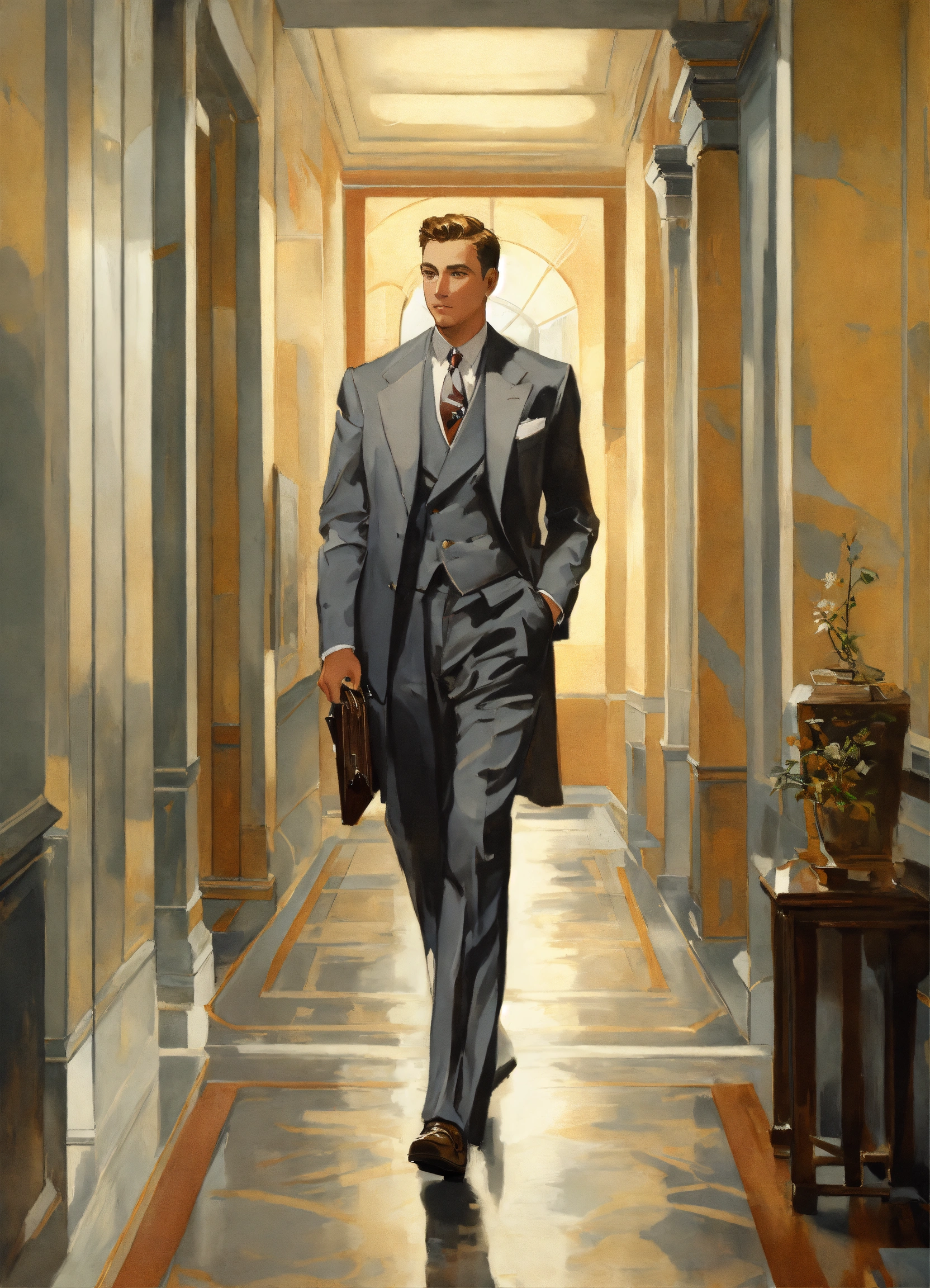 A businessman in dark grey vested suit, silver tie, large shoulders, thin waist, walking in a corridor, leyendecker style