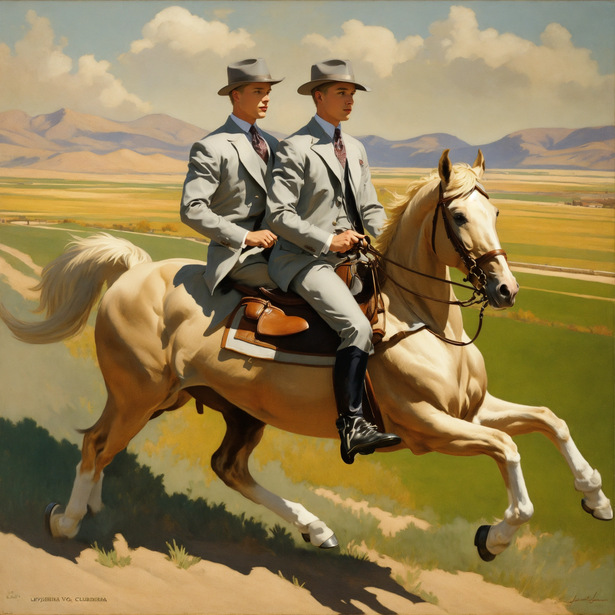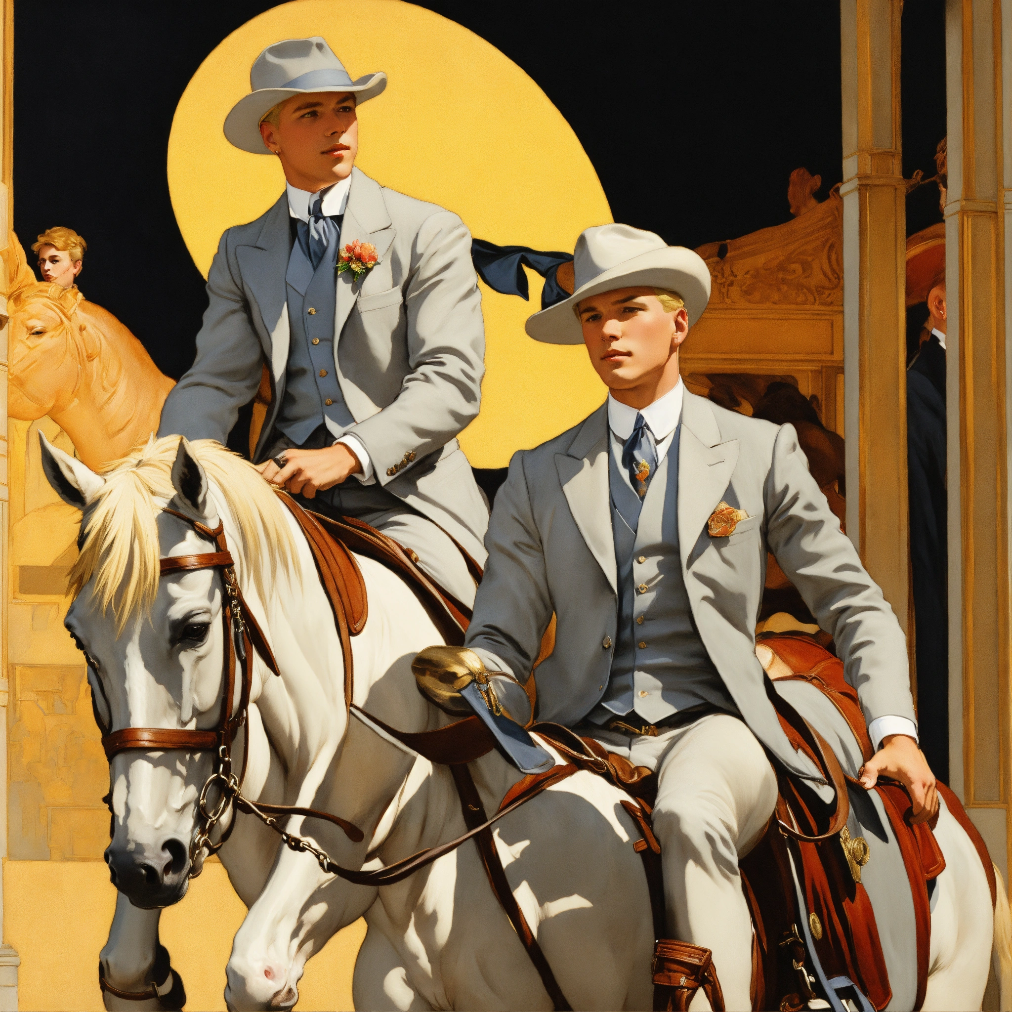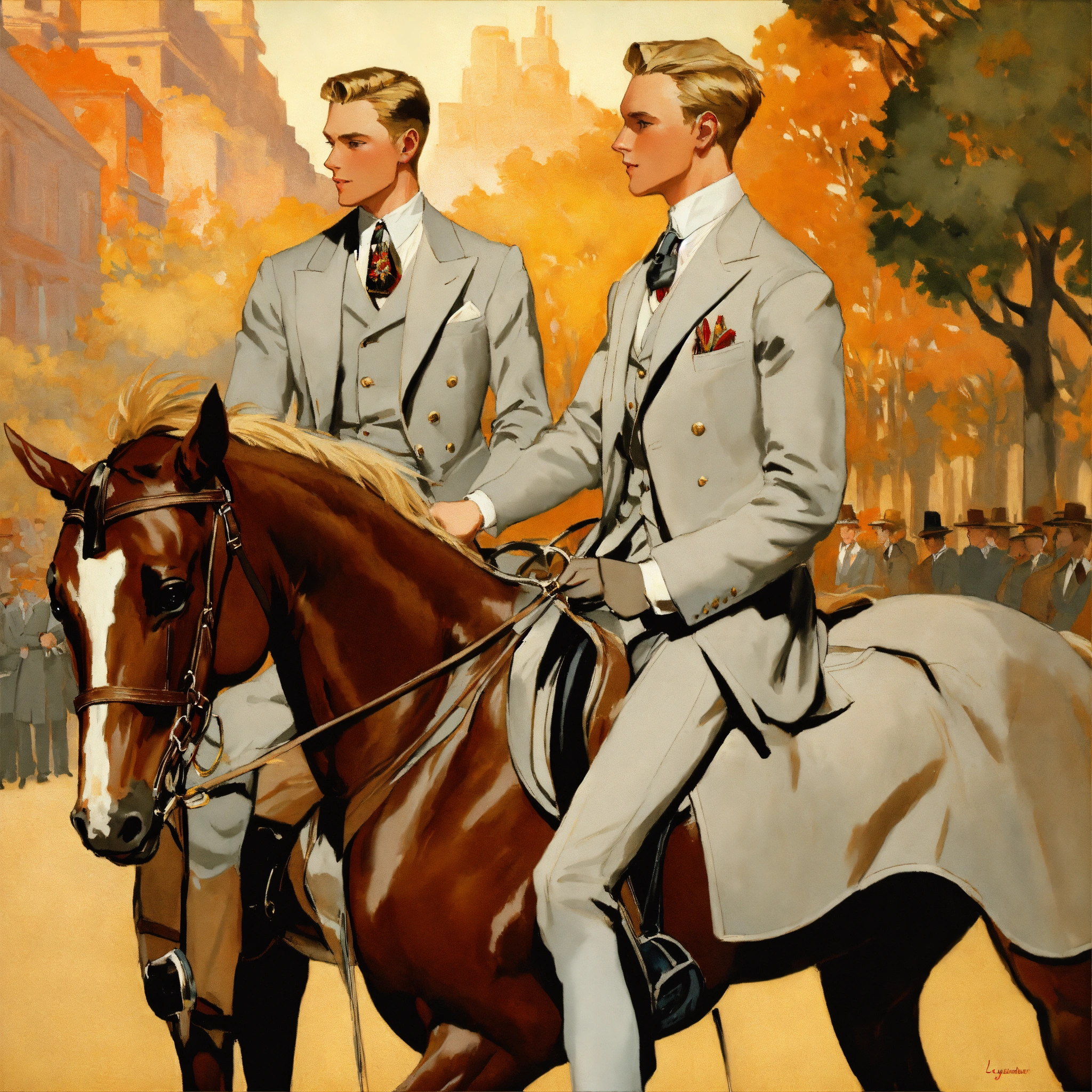 Two blonde male acristorats in light grey vested suit