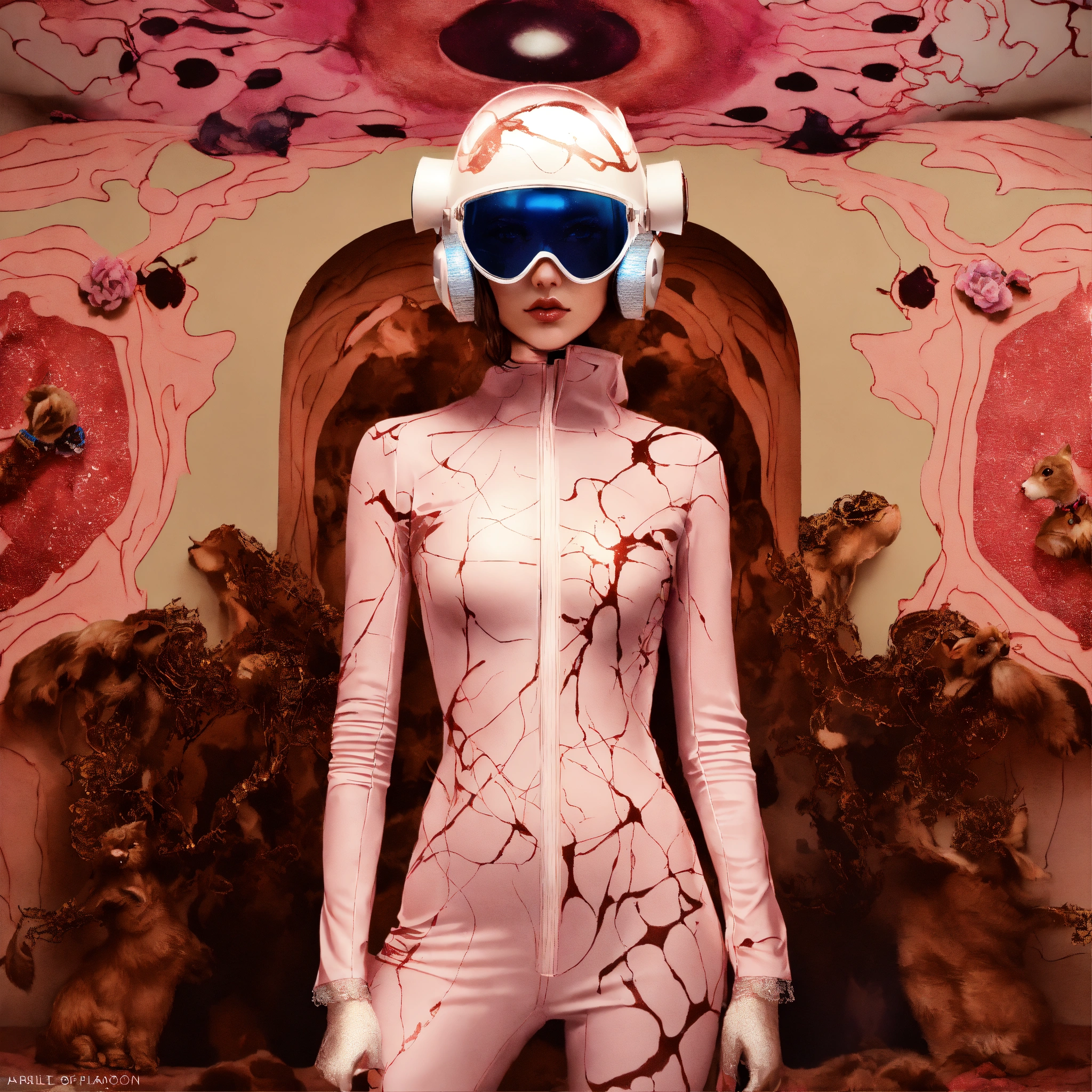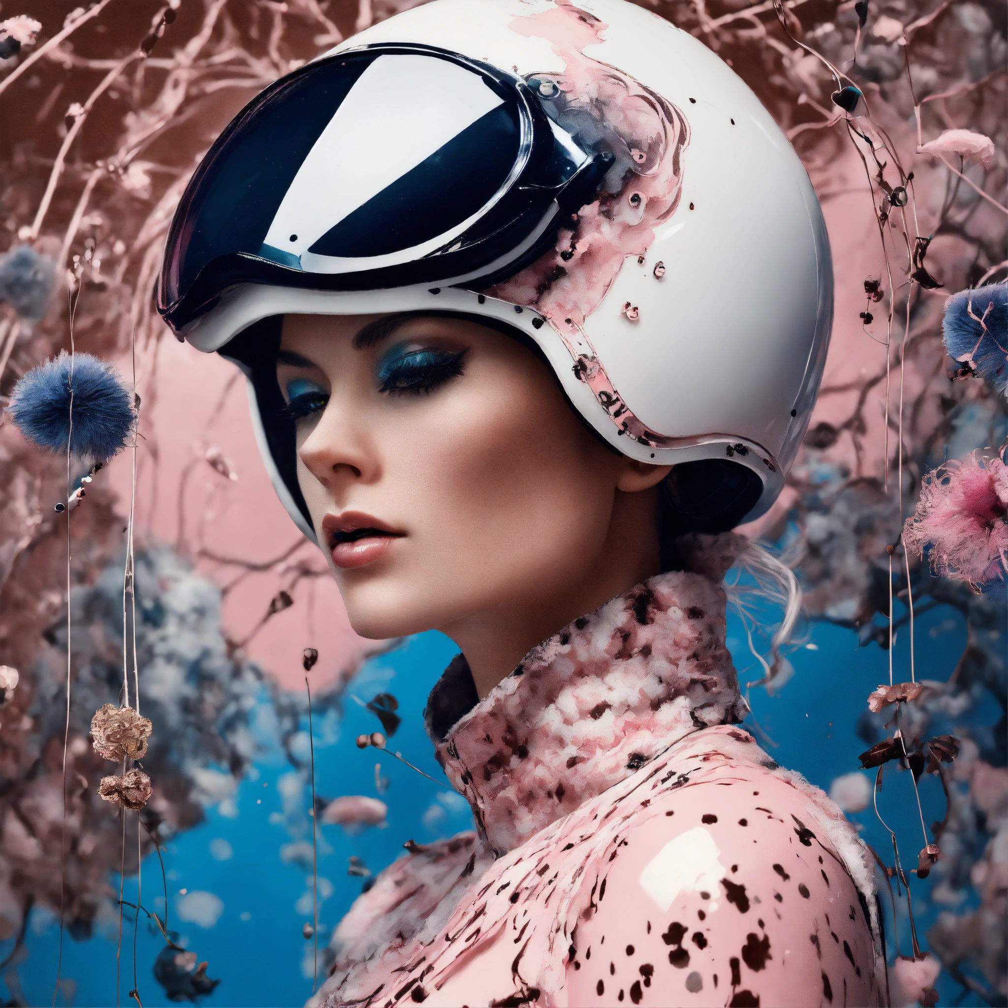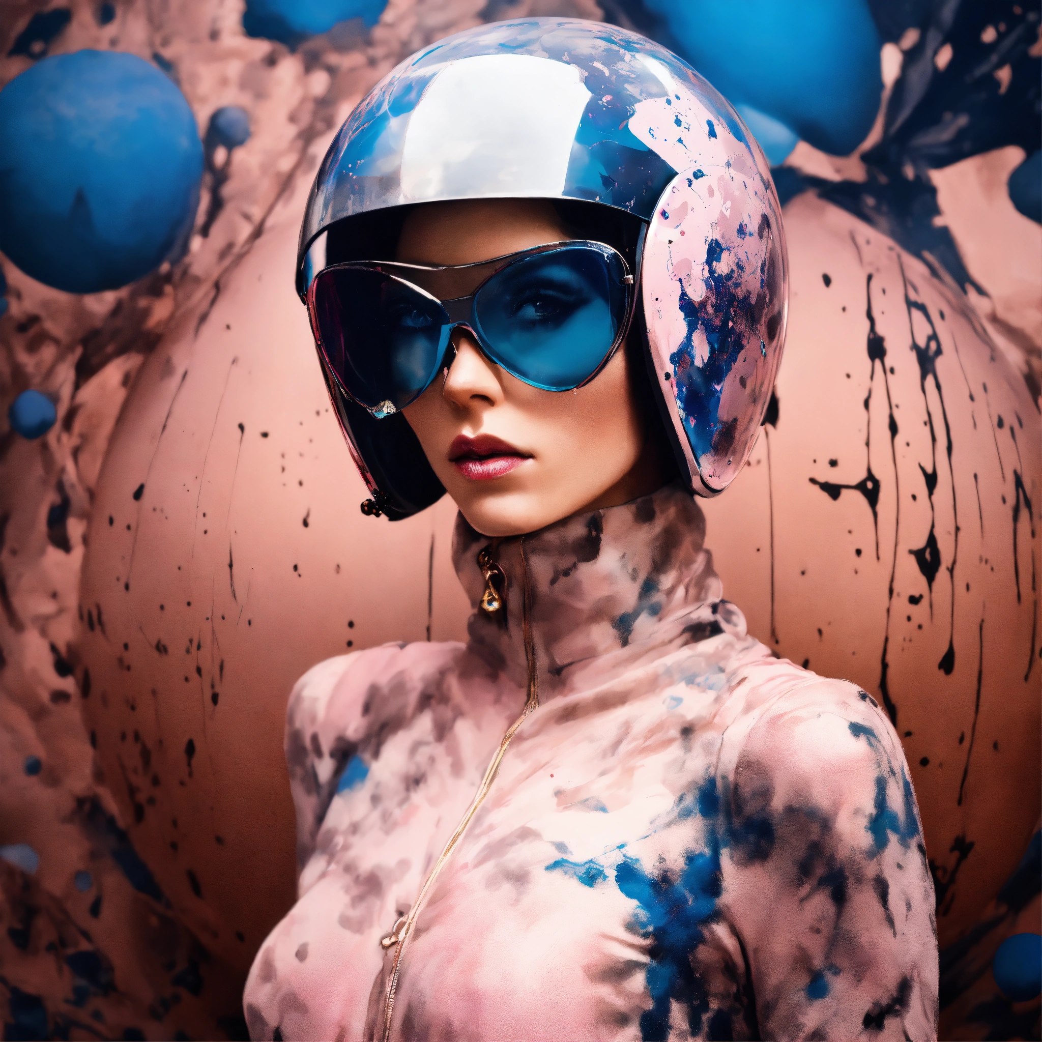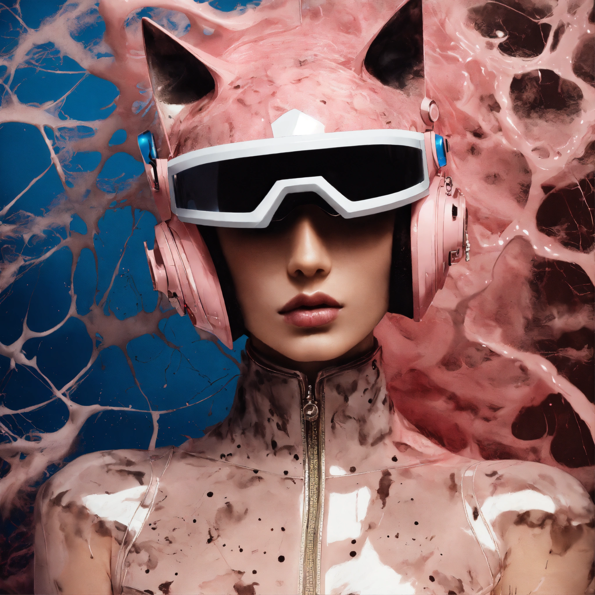 Deflagration of vintage, white, pink, grey and blue photography, a hi tech sci-fi fashion model woman, with her cat woman plexiglass helmet and sunglasses in a fur bodysuit, emerges from spiral vintage sepia ink splatters, 80 degree view, art by sergio lopez, natalie shau, james jean and salvador dali