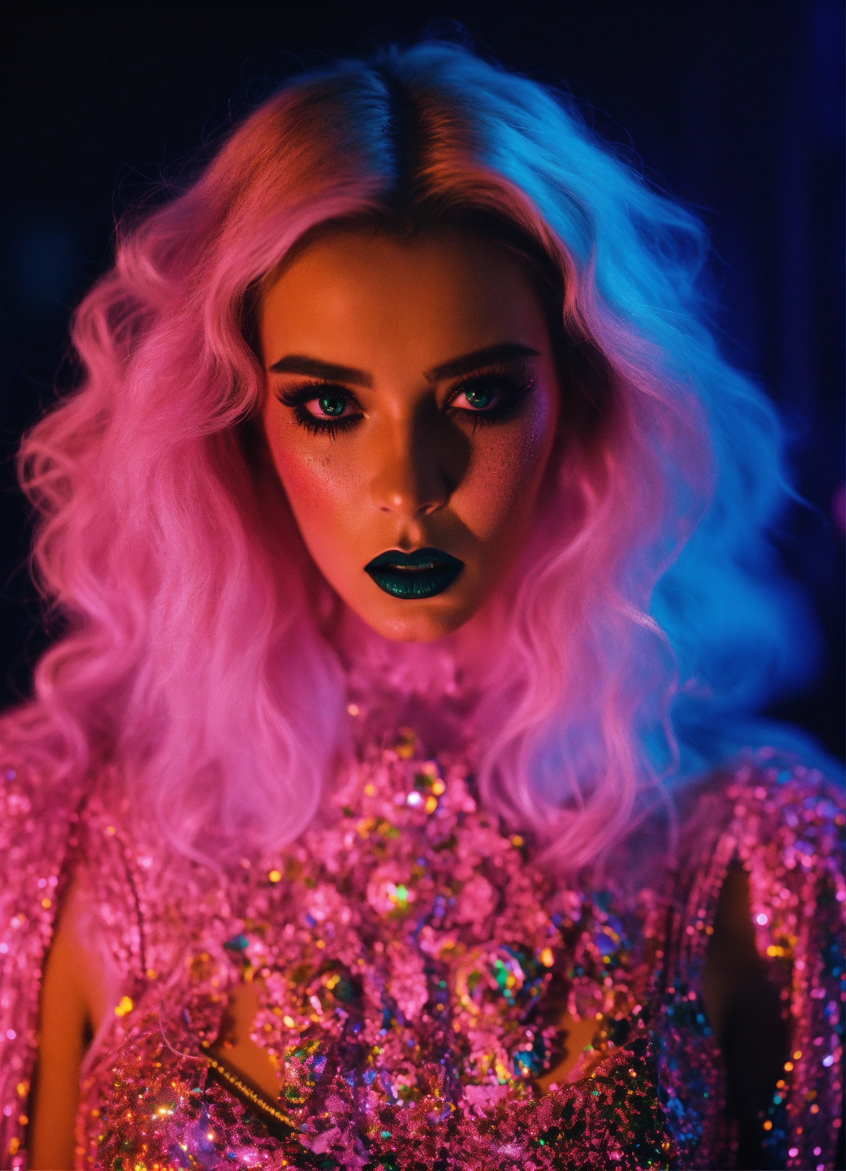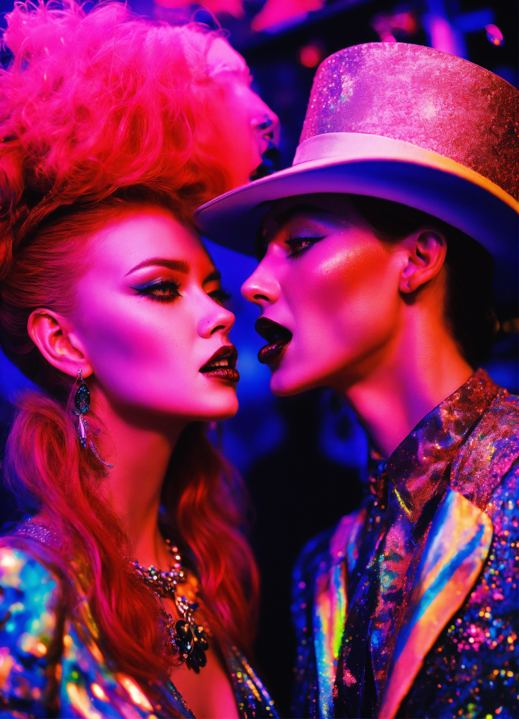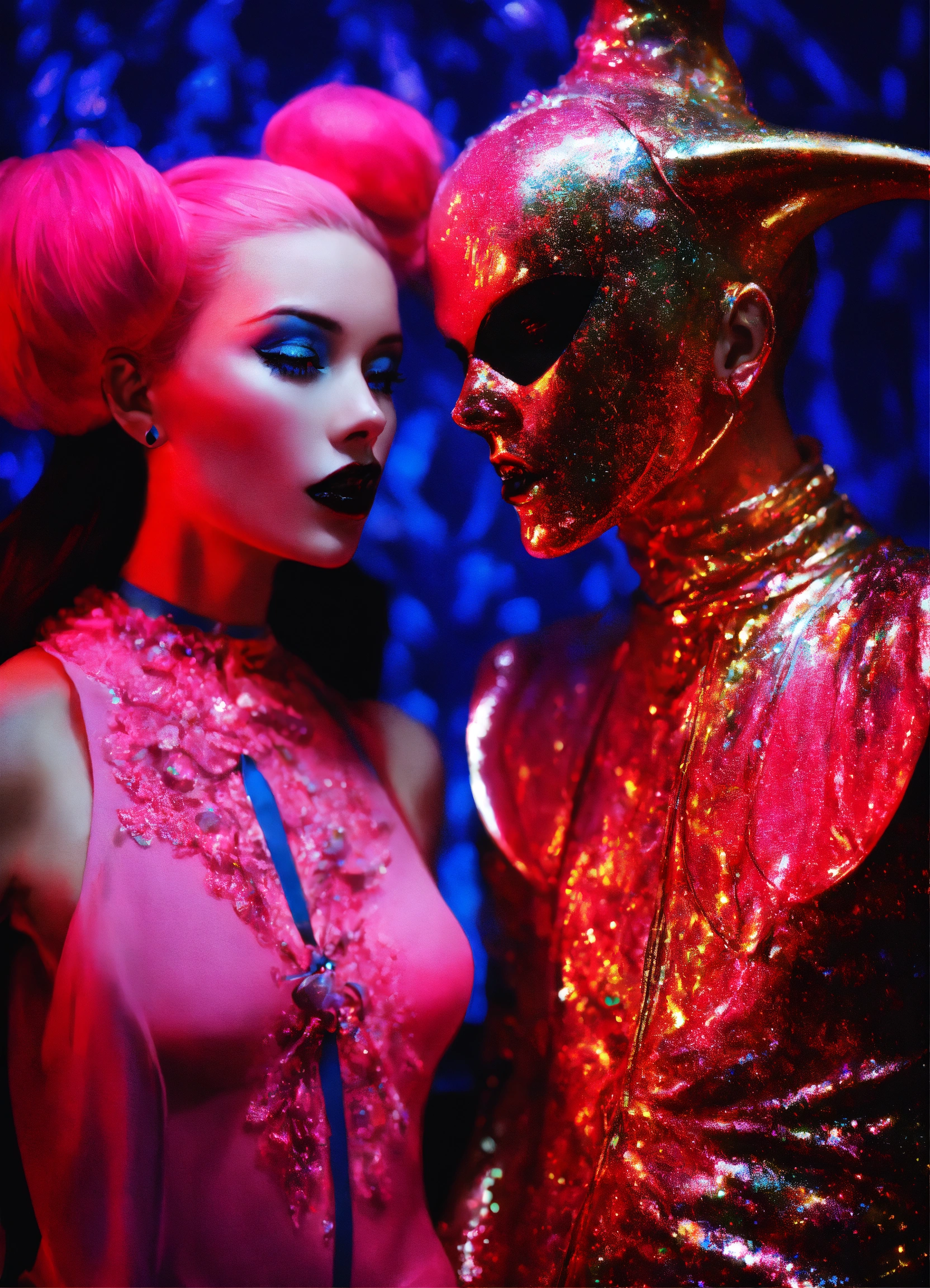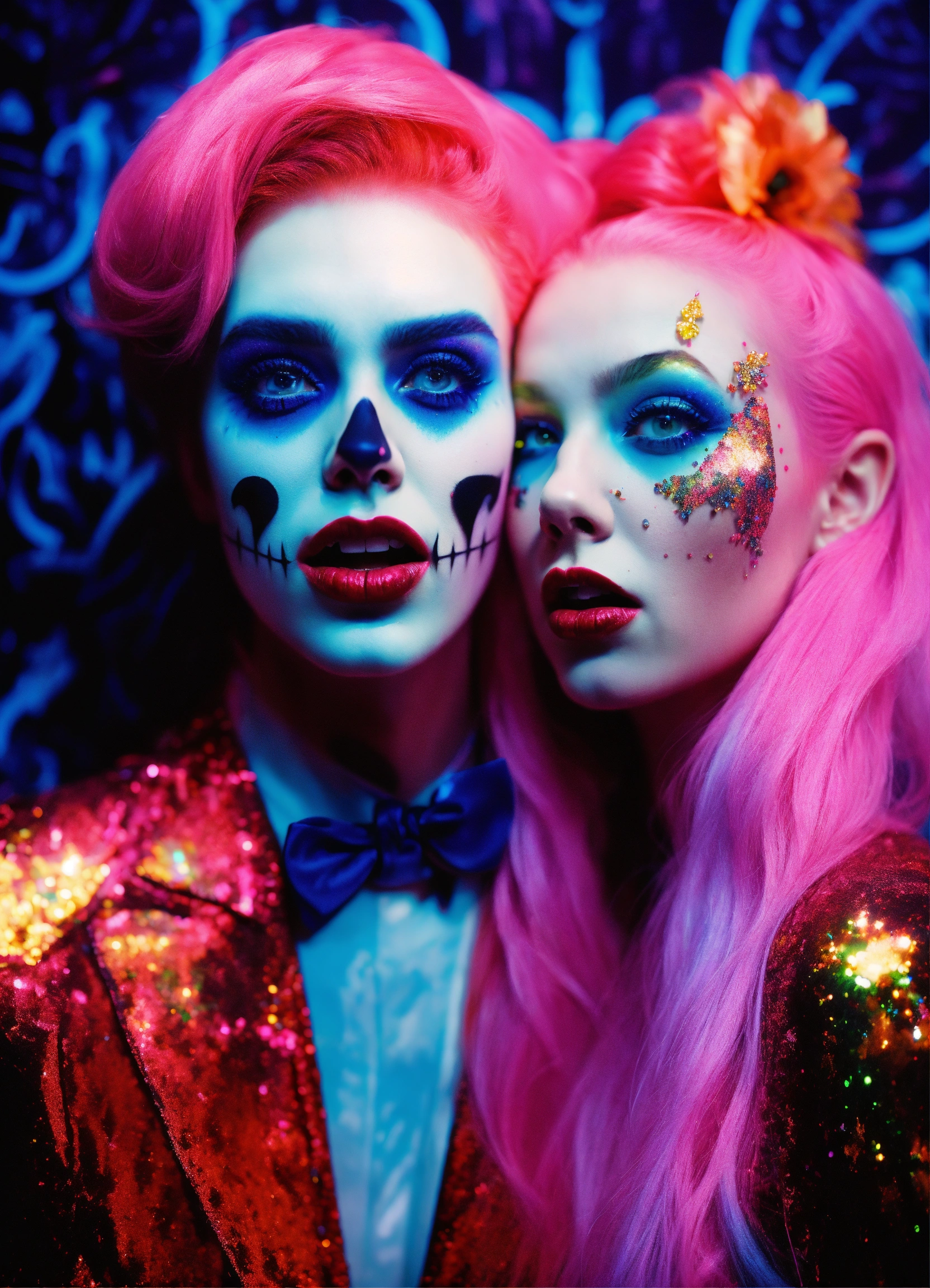 Close up portrait fashion, of a couple of scream from the movie scream dmt black light glitter neon gothic new orleans, 35mm film, art by sergio lopez, natalie shau, james jean and salvador dali