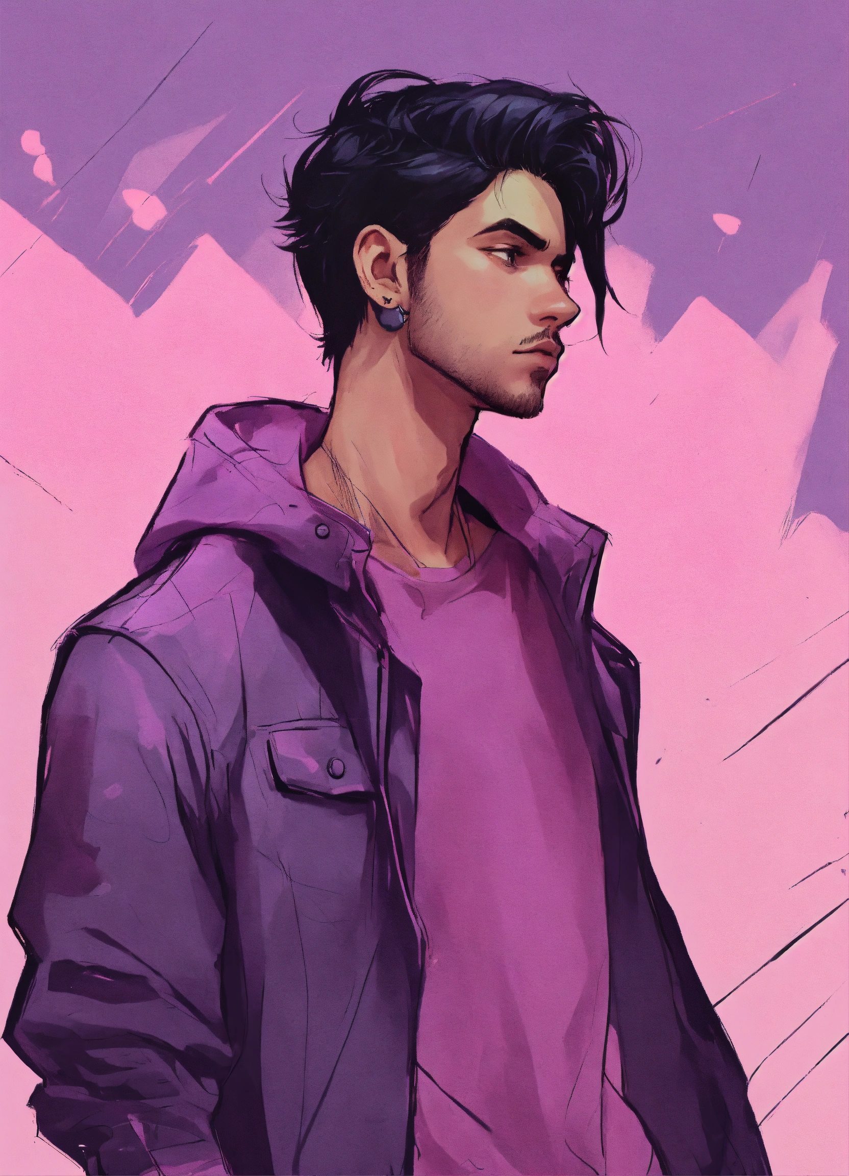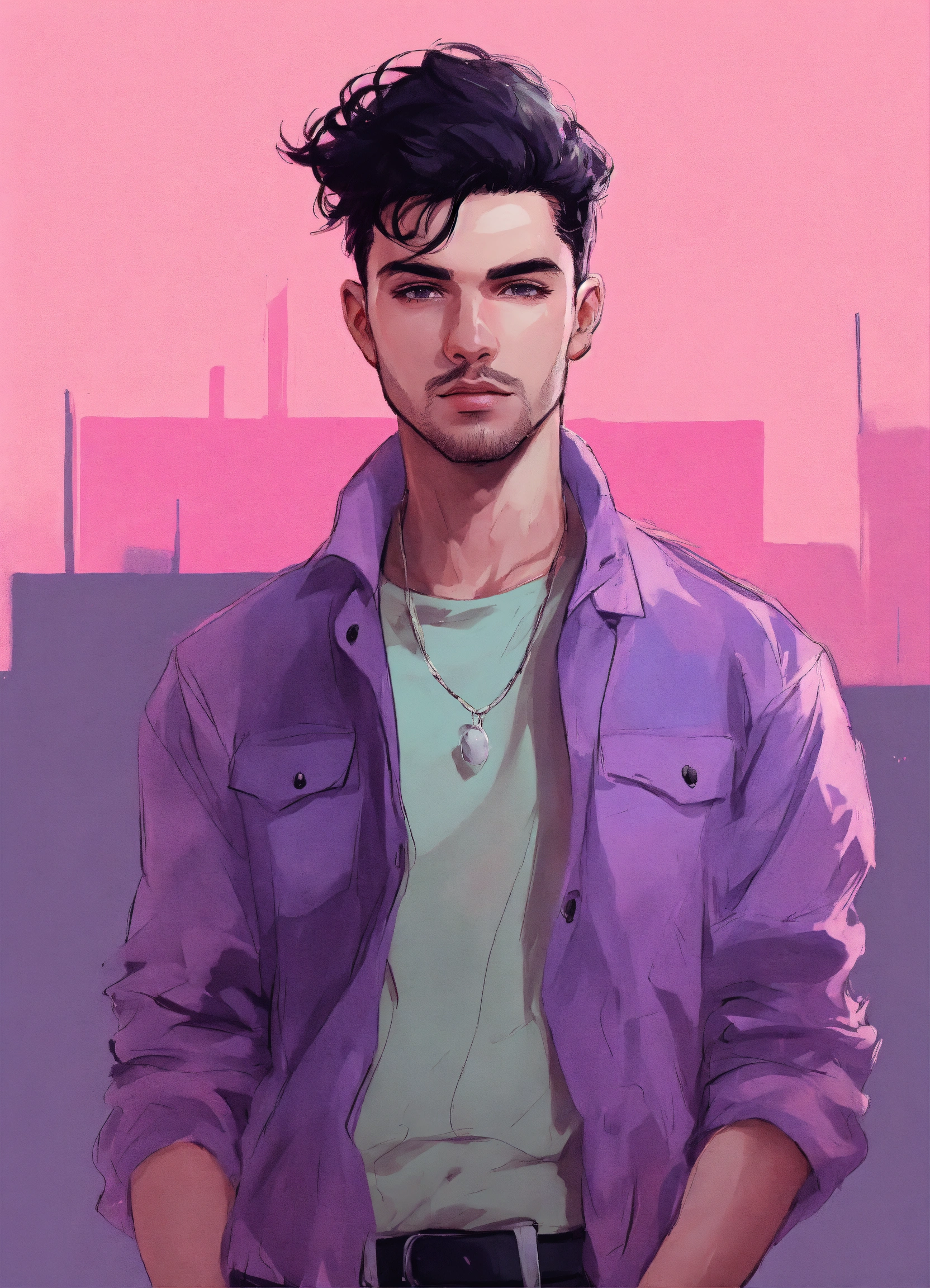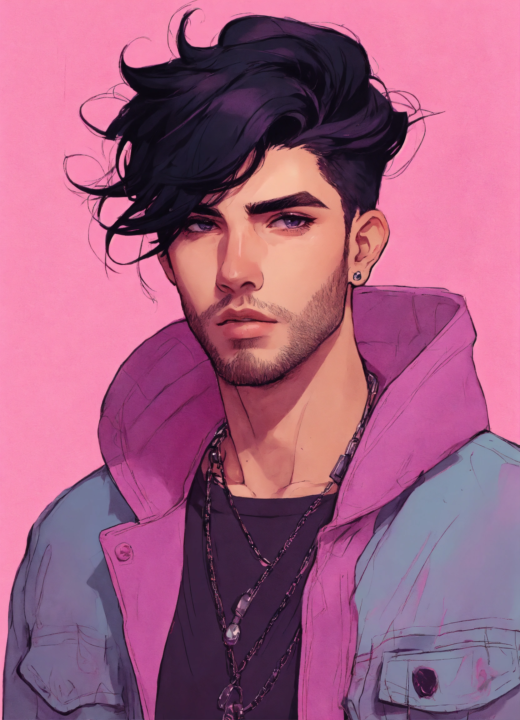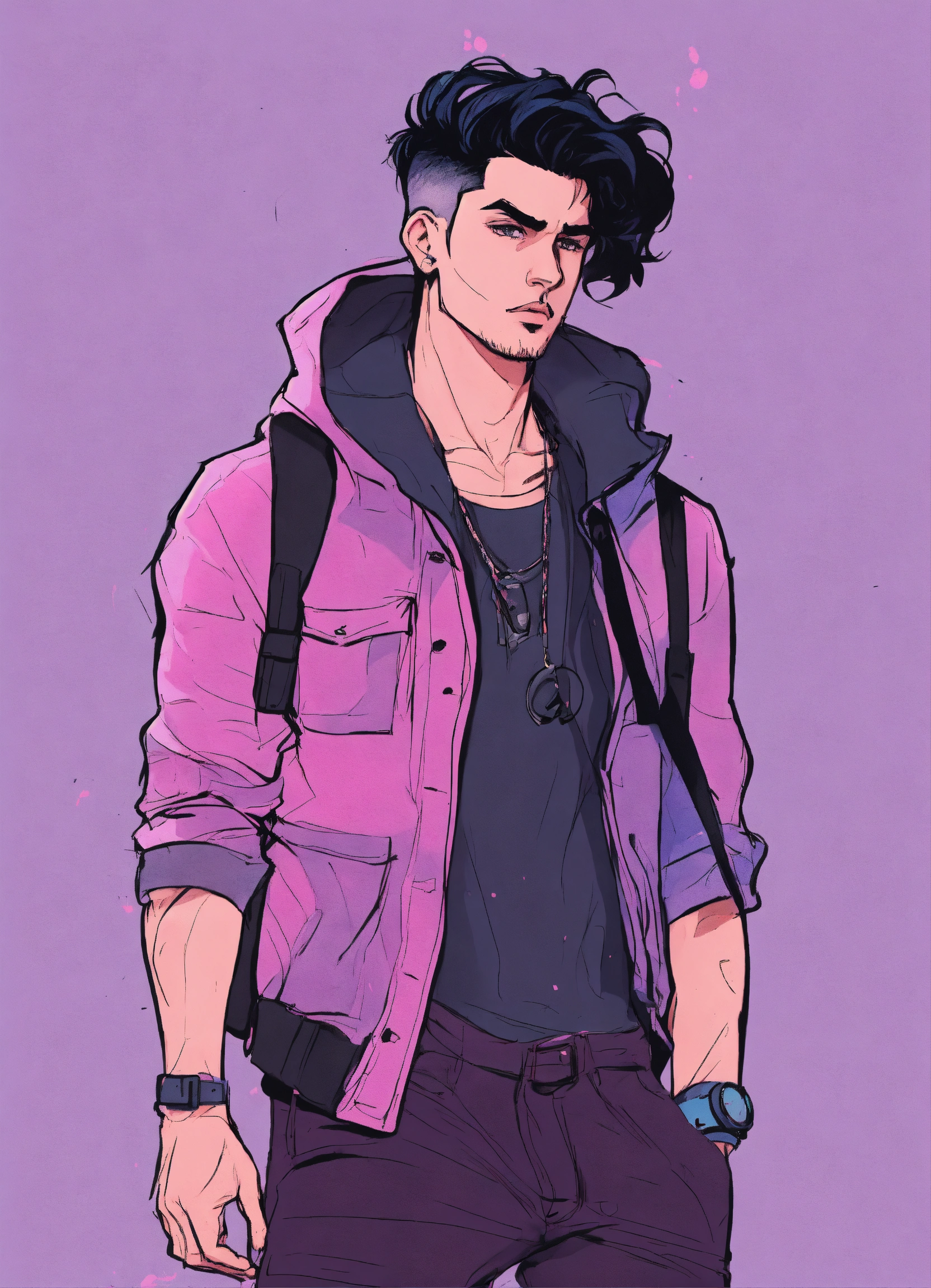 Cartoon sketch style, man 29 year old, with black hair, serious, dagger, pastel grunge streetstyle, bubblegum pastel dark purple color pallet