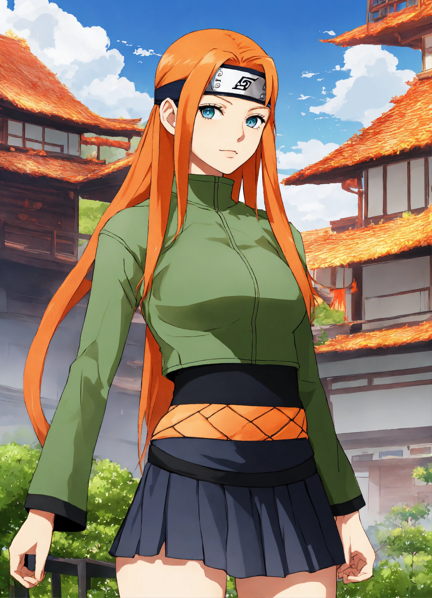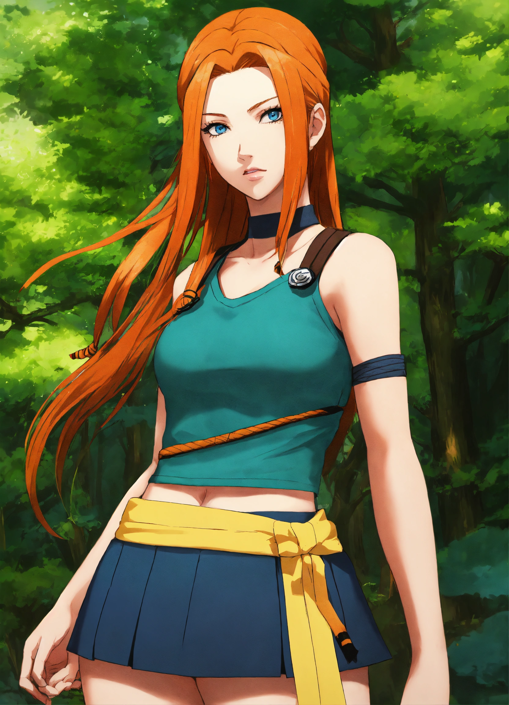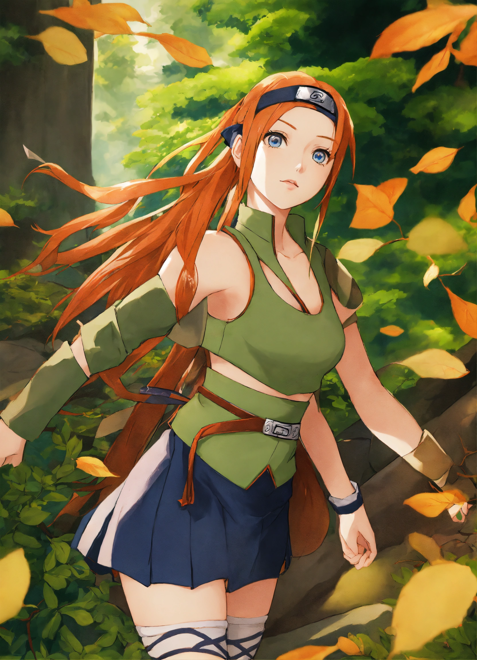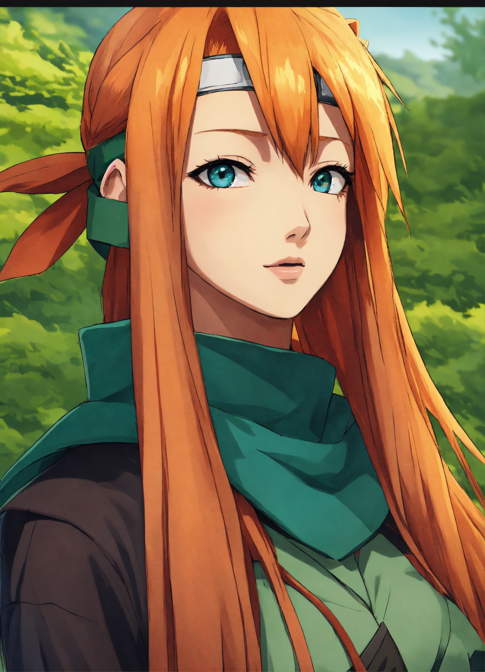 Naruto-style art, masashi kishimoto art, anime, naruto manga, naruto anime, original character, ginger hair, blue eyes, pretty woman, kunoichi, shinobi, konoha, ginger long hair, blue eyes, beautiful girl, beautiful young woman in naruto style art, feminine, fishnets, village hidden in the leaves, village headband, skirt, fishnets, cropped top, green kunoichi attire, feminine green kunoichi attire, green outfit, naruto headband, fishnets, flattering kunoichi fishnets with green cropped top and skirt, long hair down and flowing