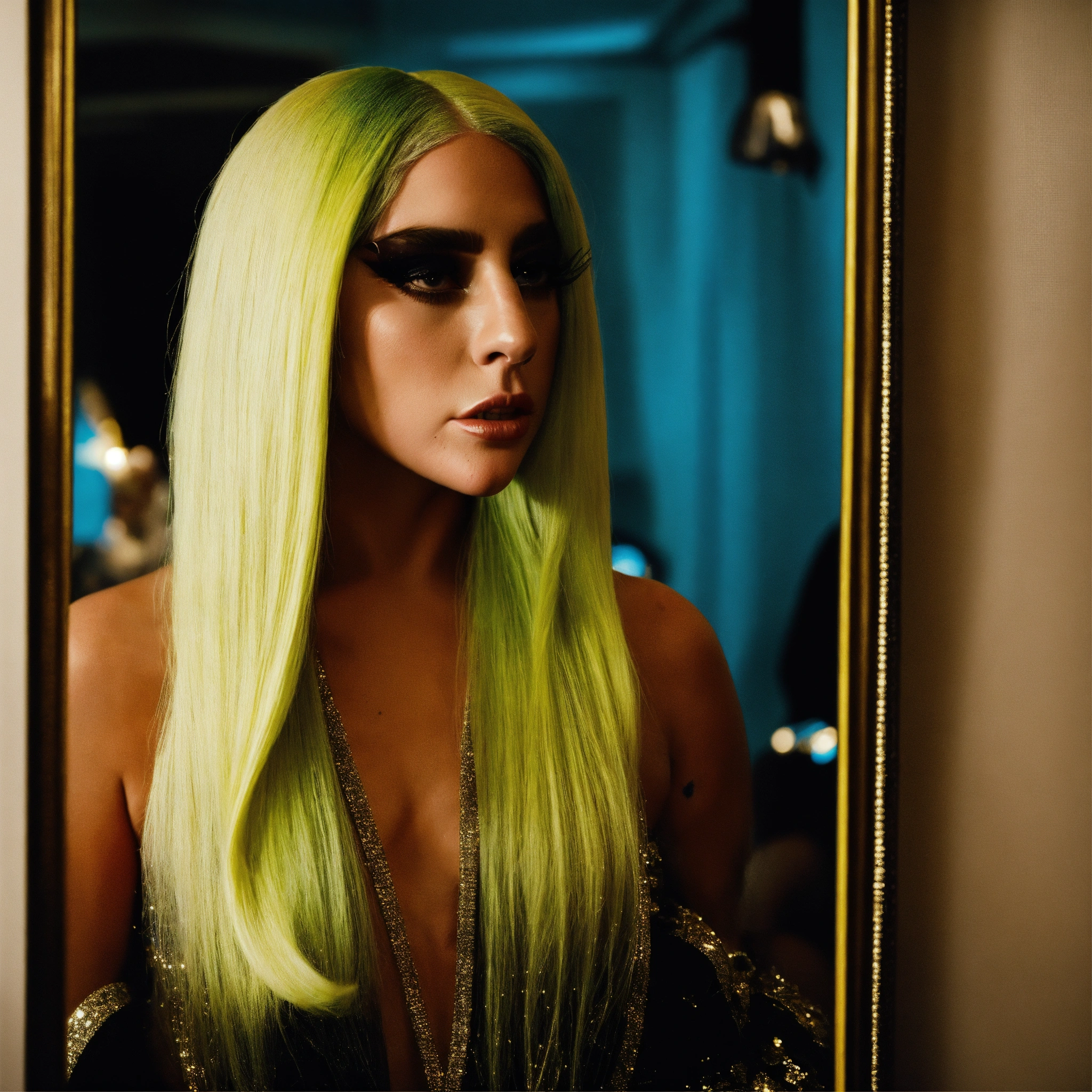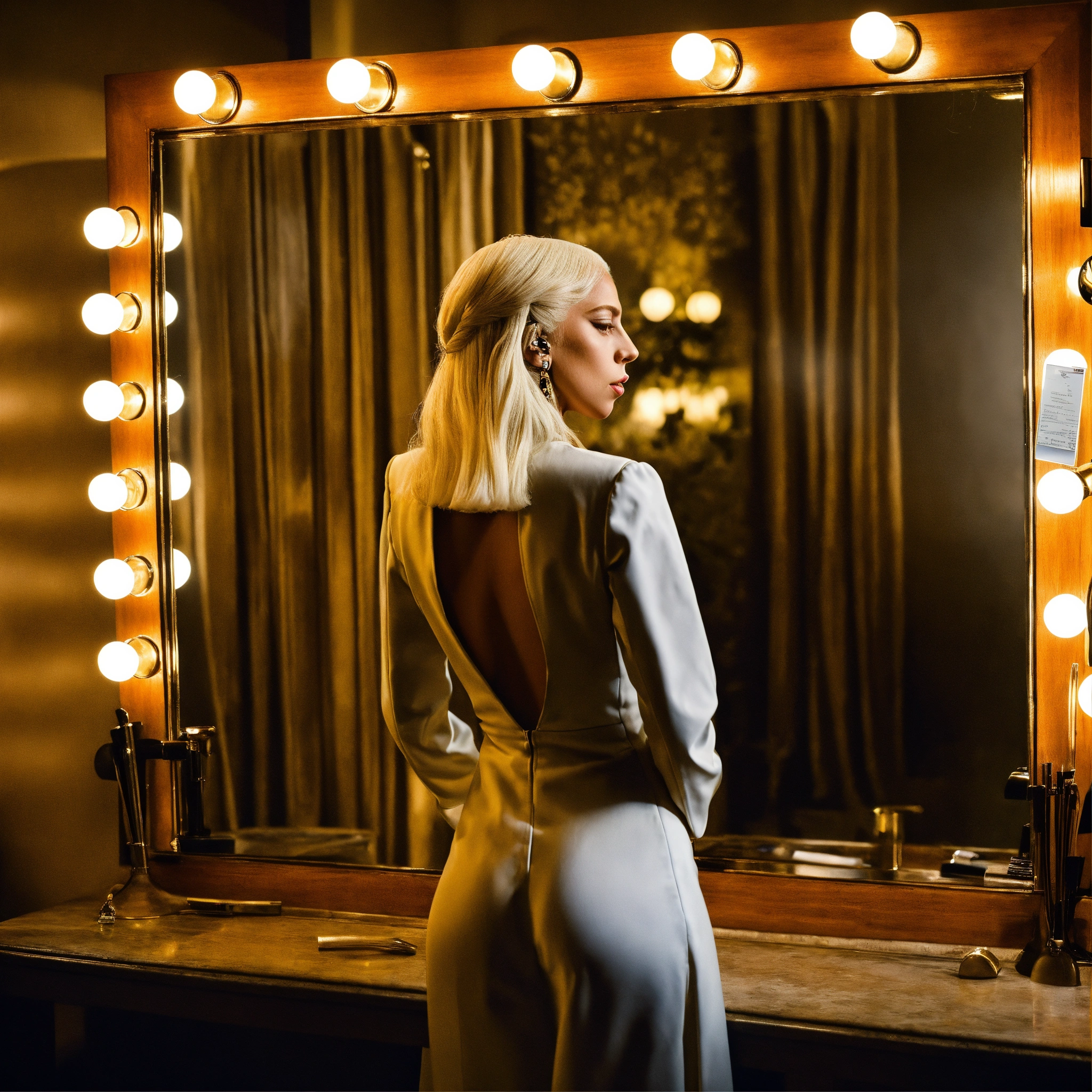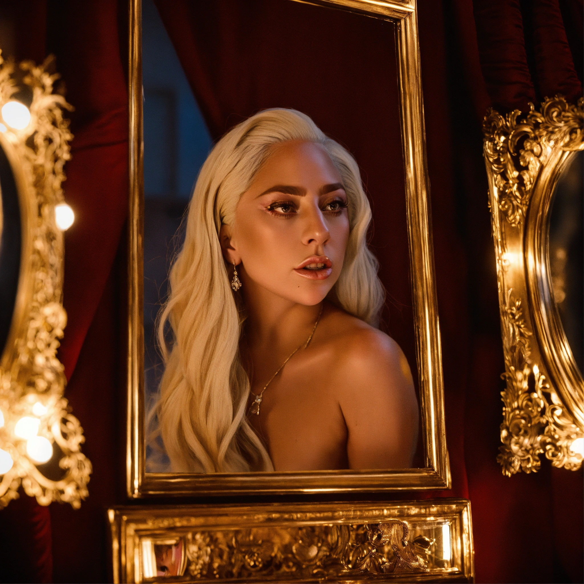 Lady gaga looking in to the mirror on reflection seeing woman inside
