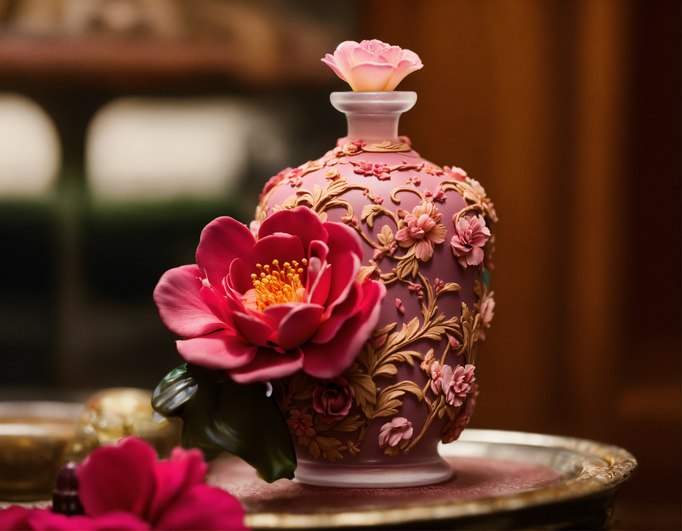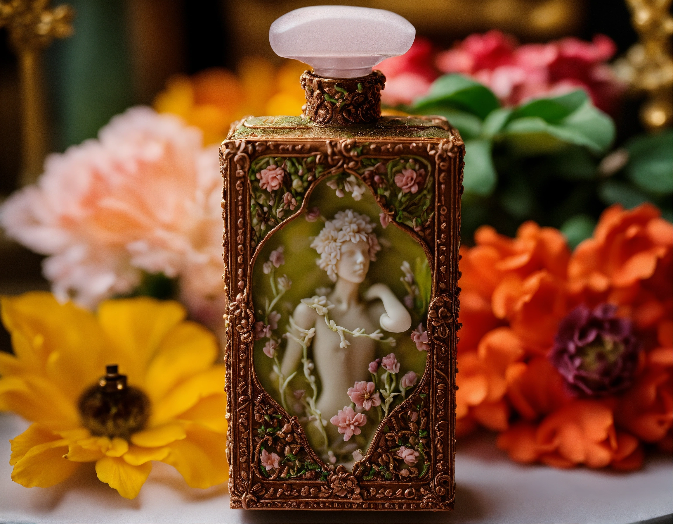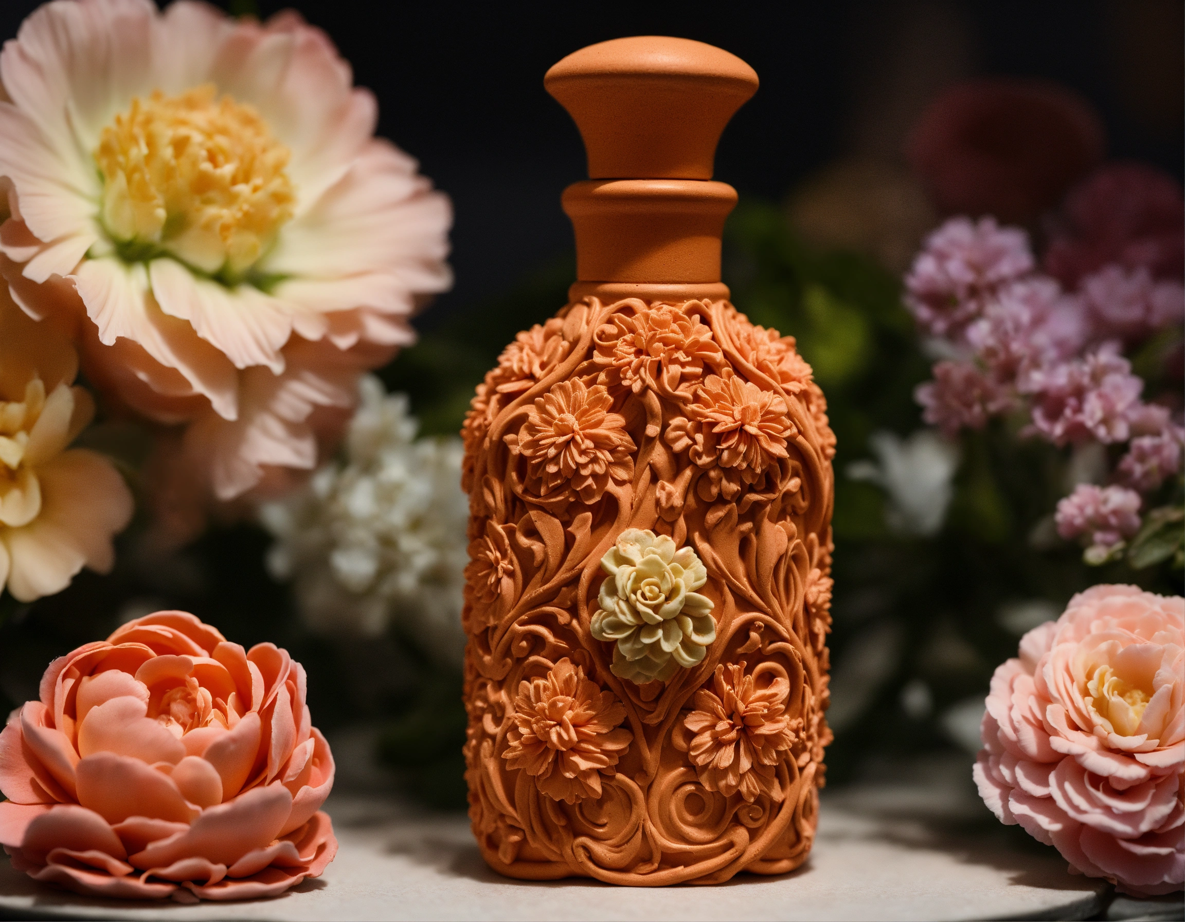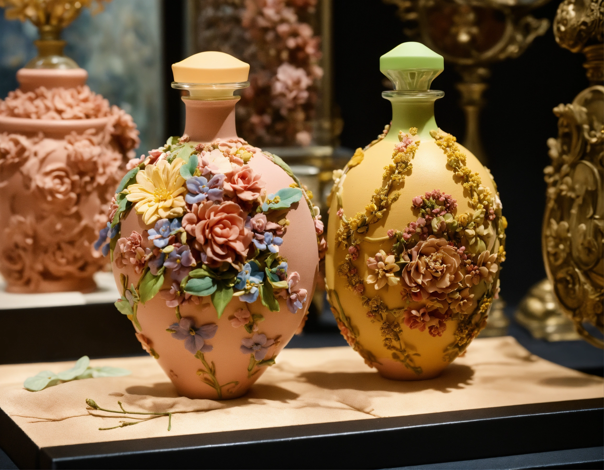 Hand-made modeling clay work. floral-inspired scent bottle, gallery art exposition, close up view on fragrance bottles, marquis de sade, flesh and bones inspiration
