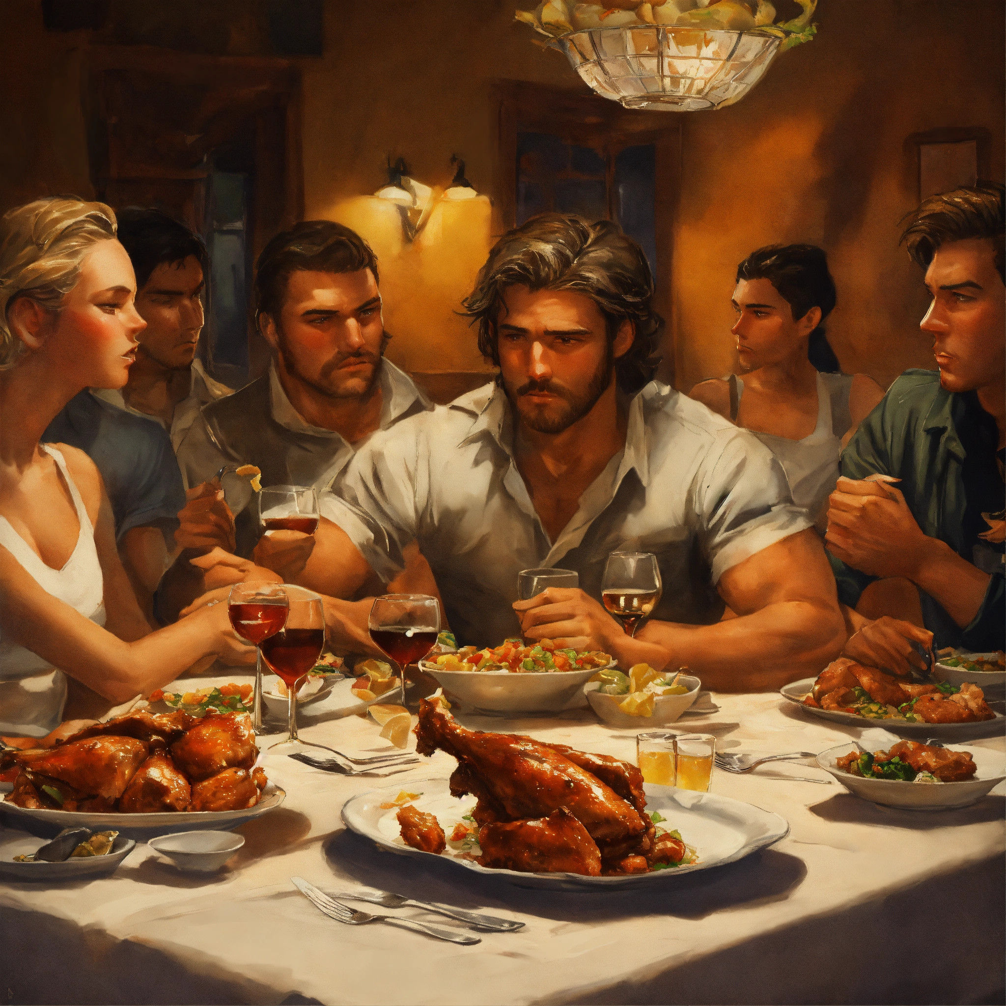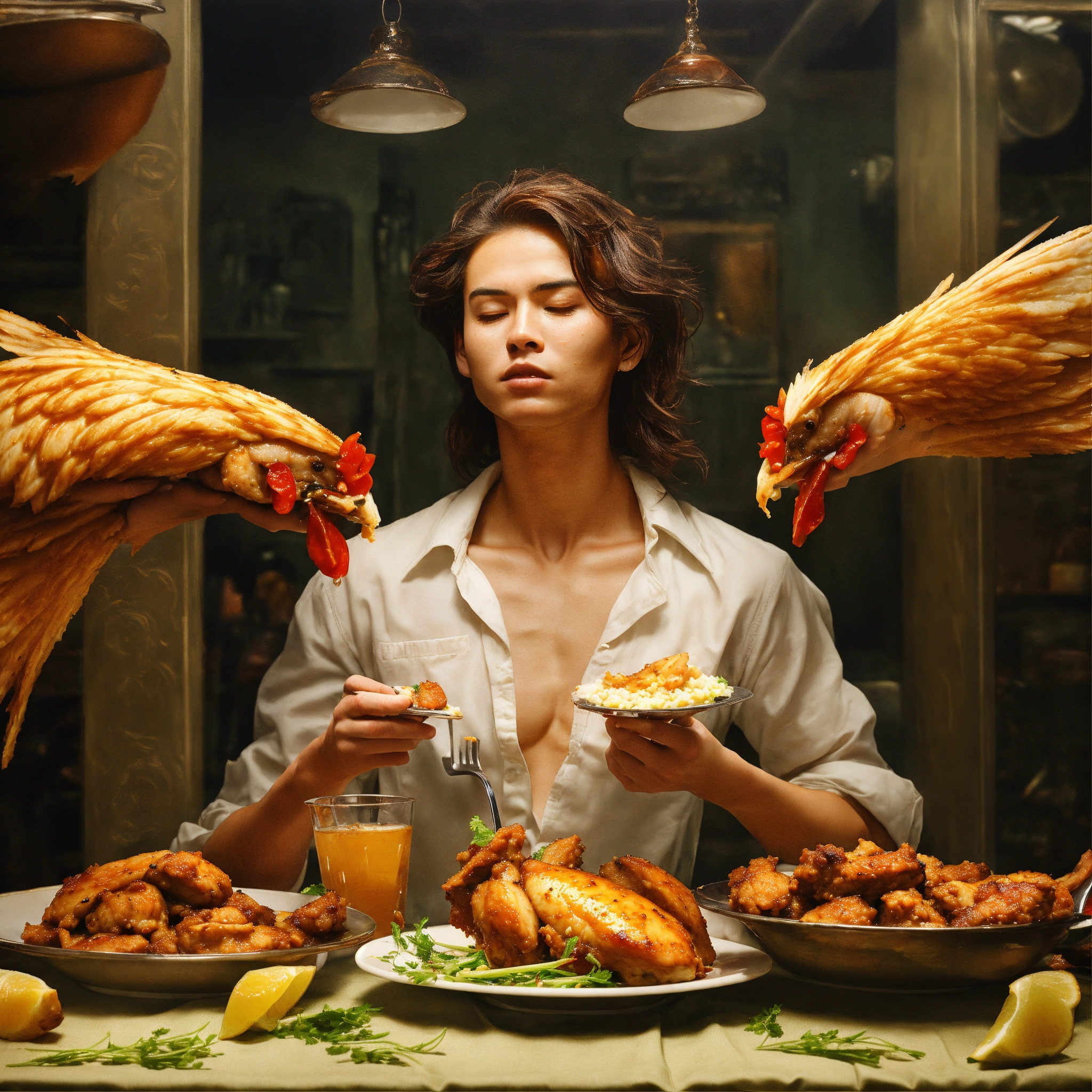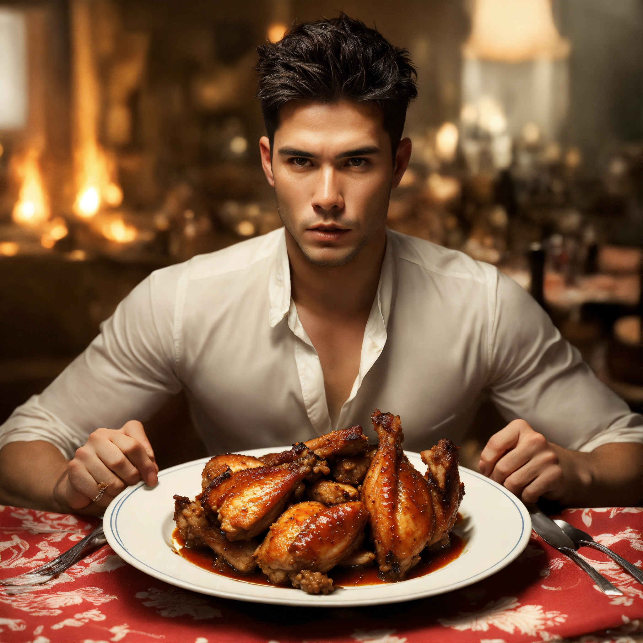 Men declaring cutlery is for the weak, grown man built for war and famine afraid of meat on hands, stacking millions vs nervous breakdown over chicken wing, weakness revealed, romantic dinner with dream girl, disappointment at napkin-wrapped neck, clinking and clanging at chicken wings, lost warrior spirit, shame missing, hyper-realistic beautiful woman with white skin.