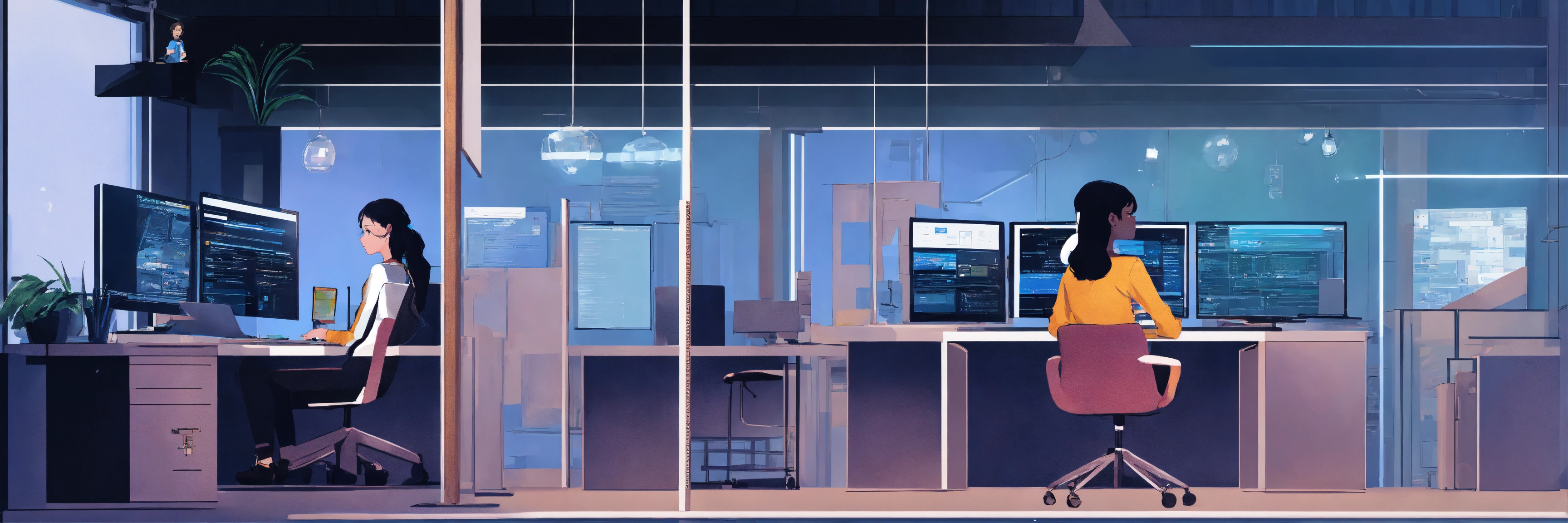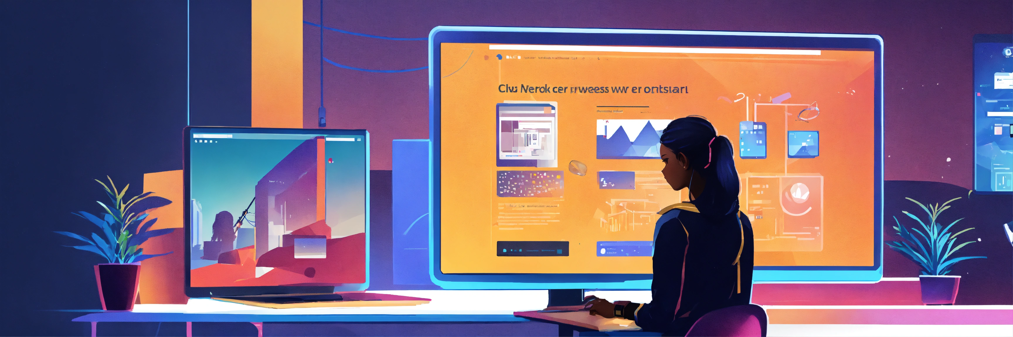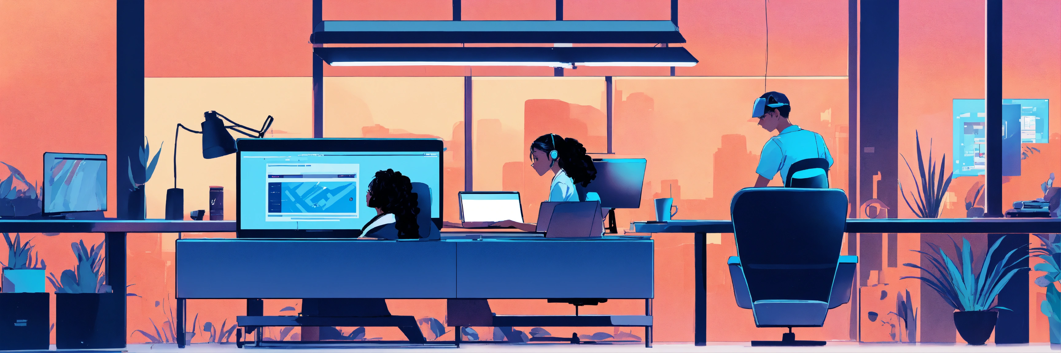 A detailed illustration of a saas company developing a website, with a white background, and the main colours being black and blue, with a single female developer in the foreground, working on the project.