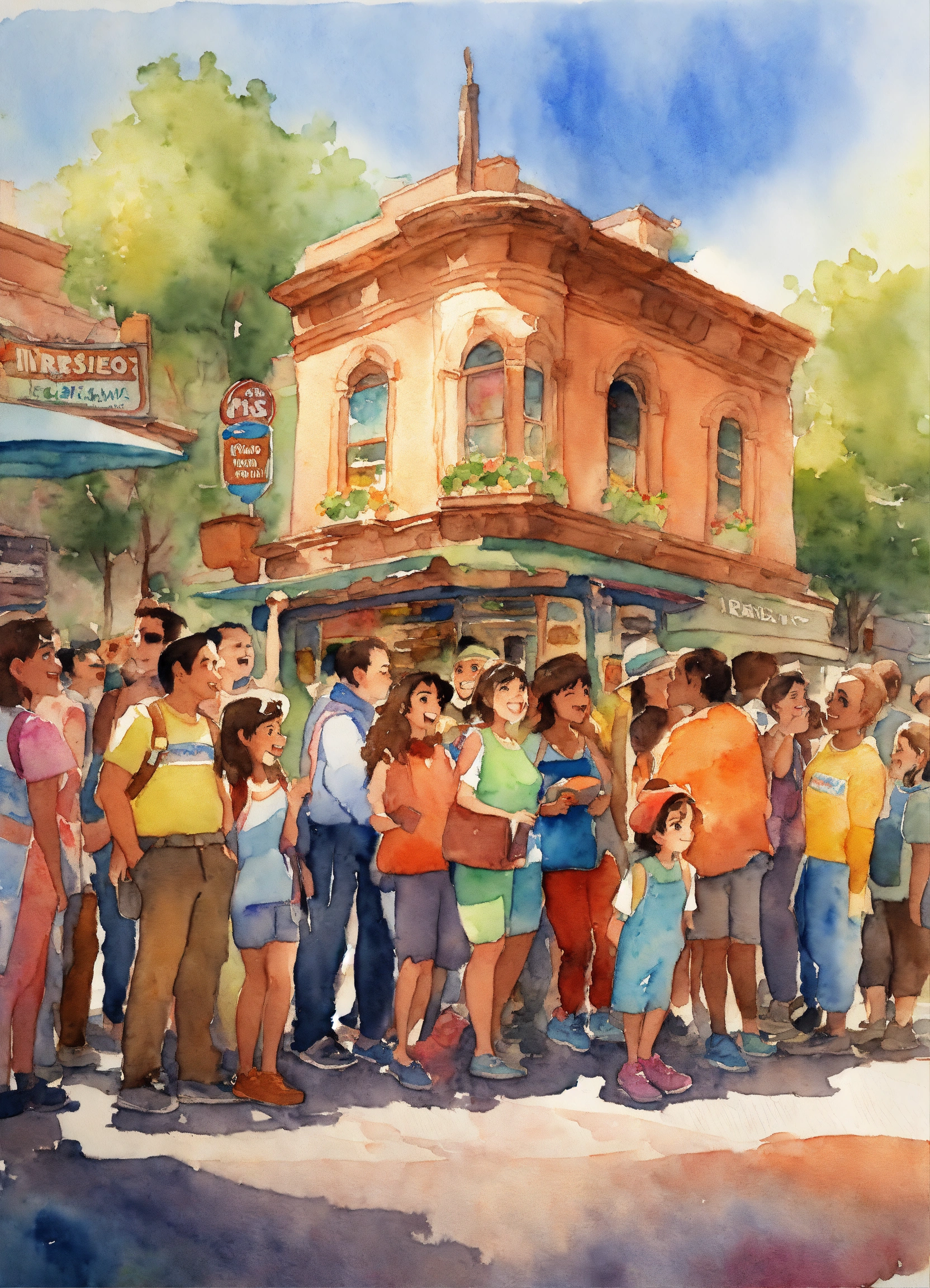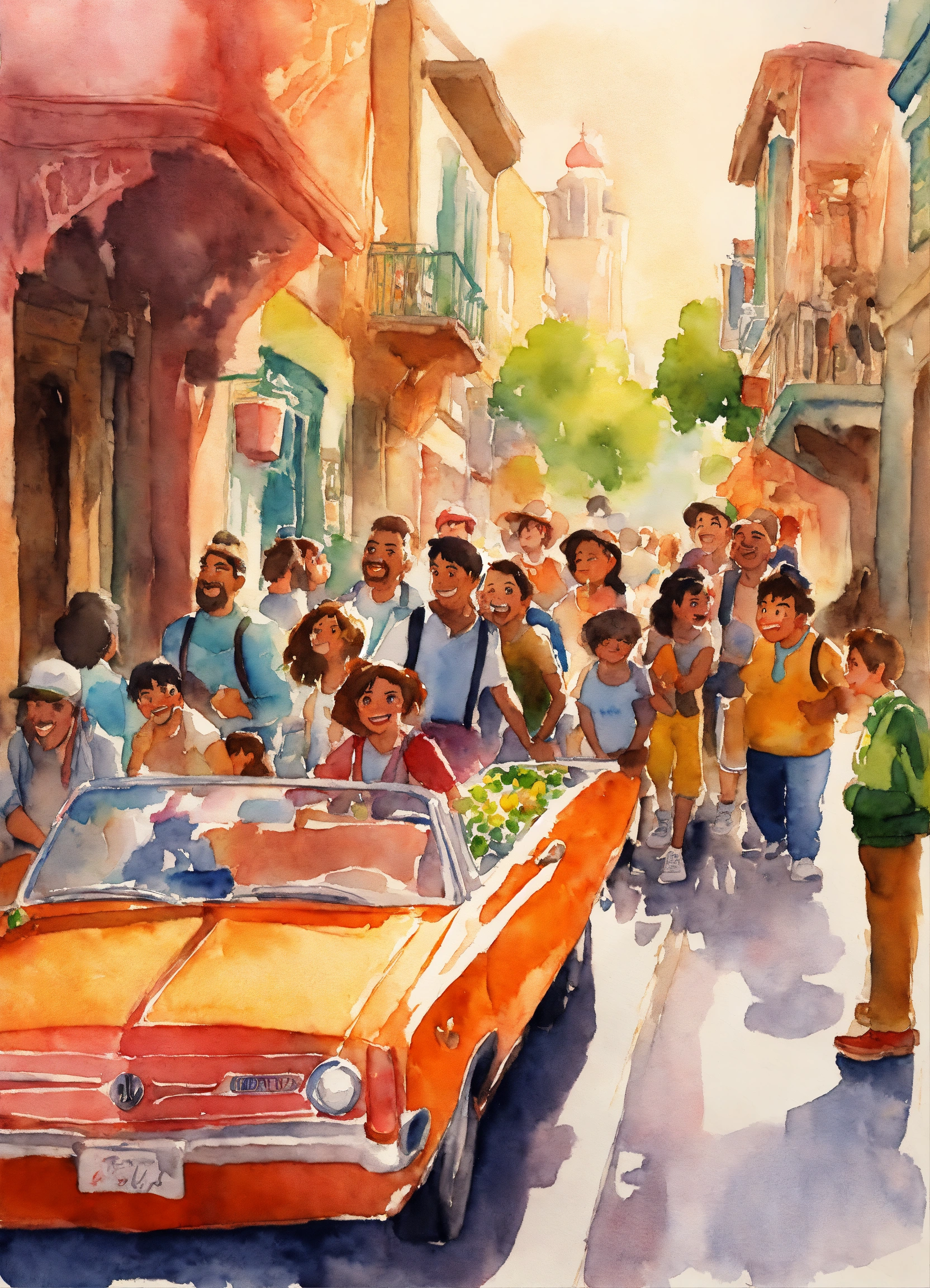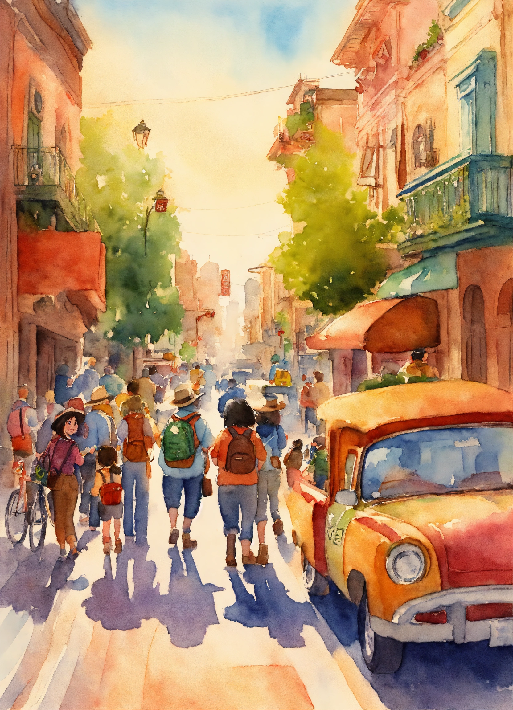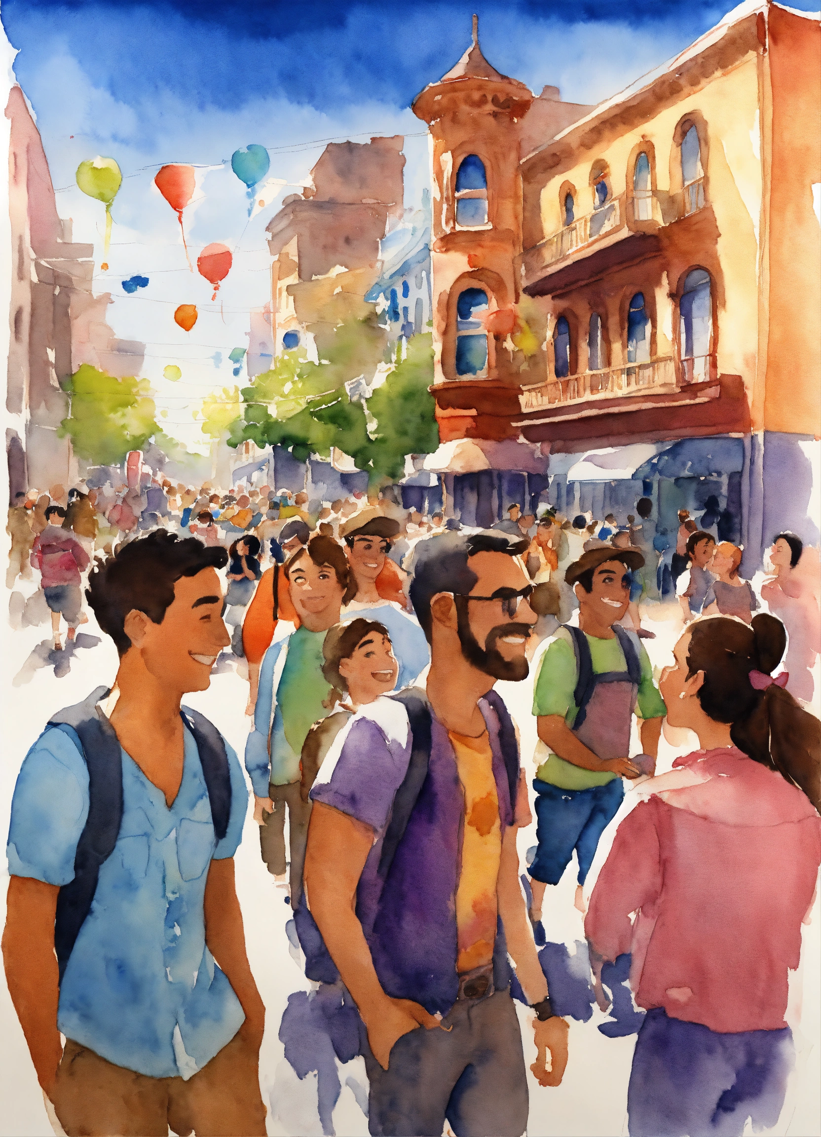 Watercolor pixar painting of hispanic participants gathering at the starting point, their smiles reflecting their voracious appetite for adventurein the colorful mission district, watercolor pixar style cartoon