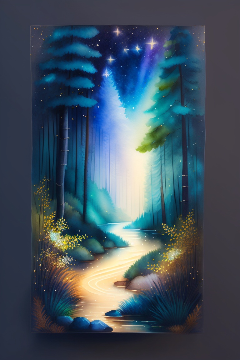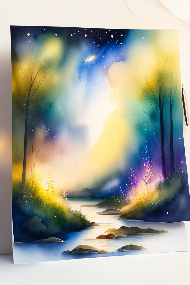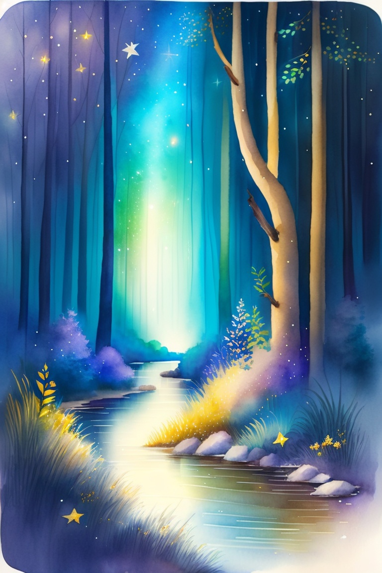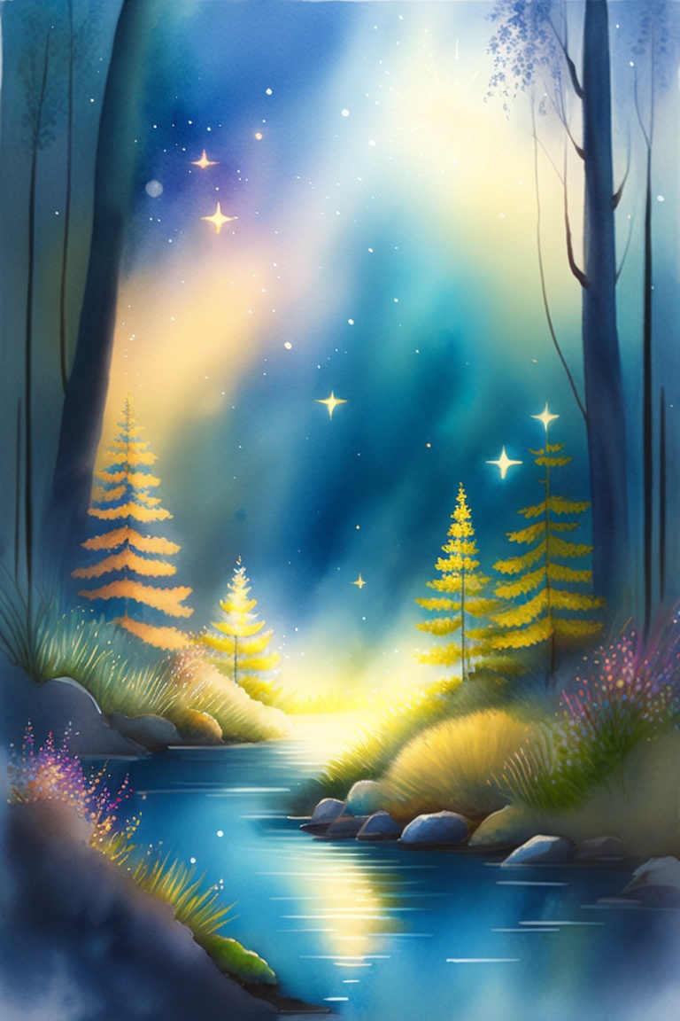 Fantasy aquarelle watercolor, enchanted fantasy forest clearing with firefly lights by a stream with stars bokeh, pen and ink on paper with watercolor washes, gold speckles, gilded edge, bokeh, stars