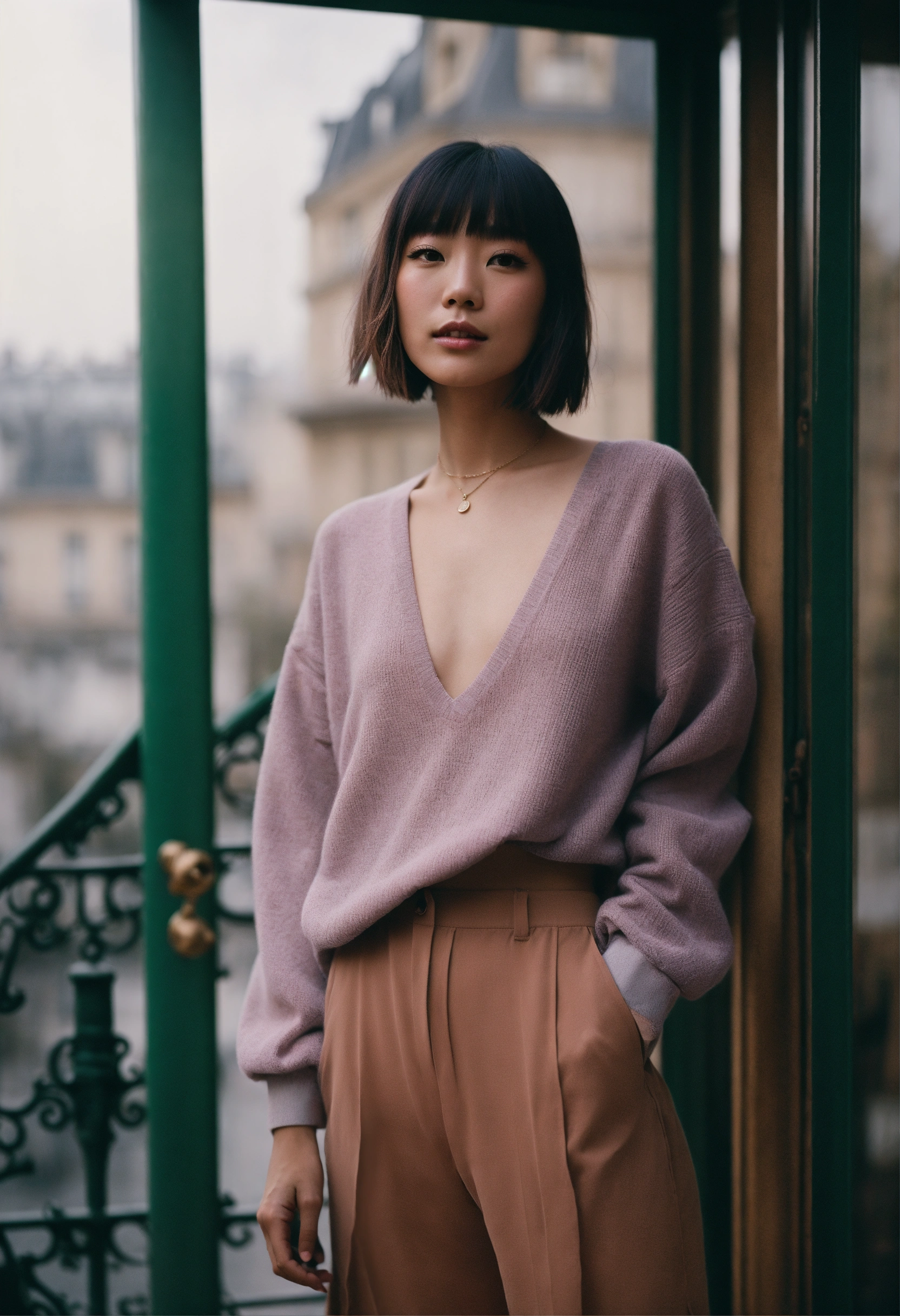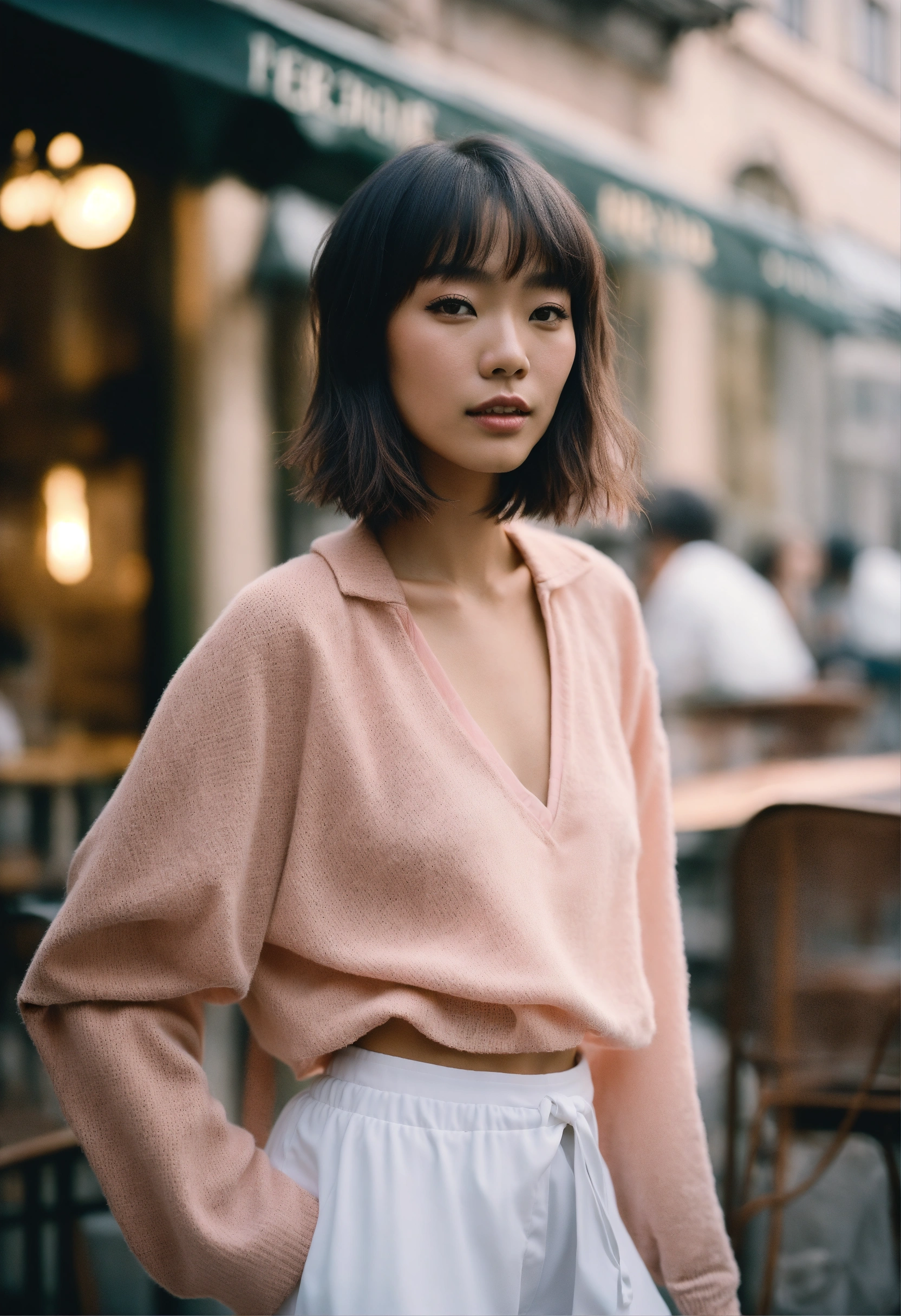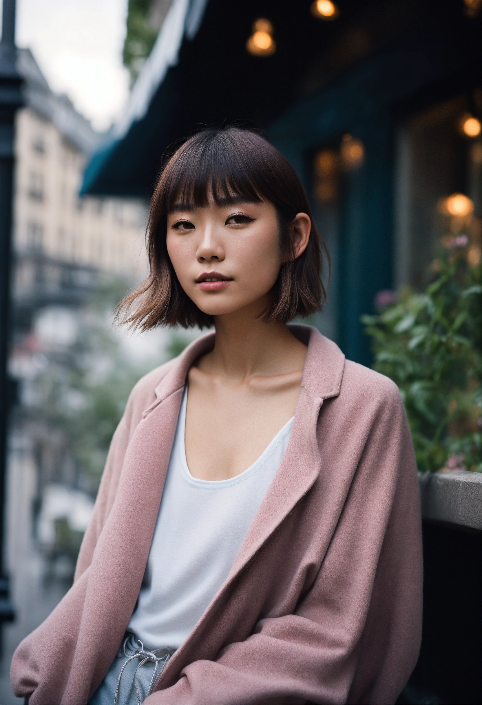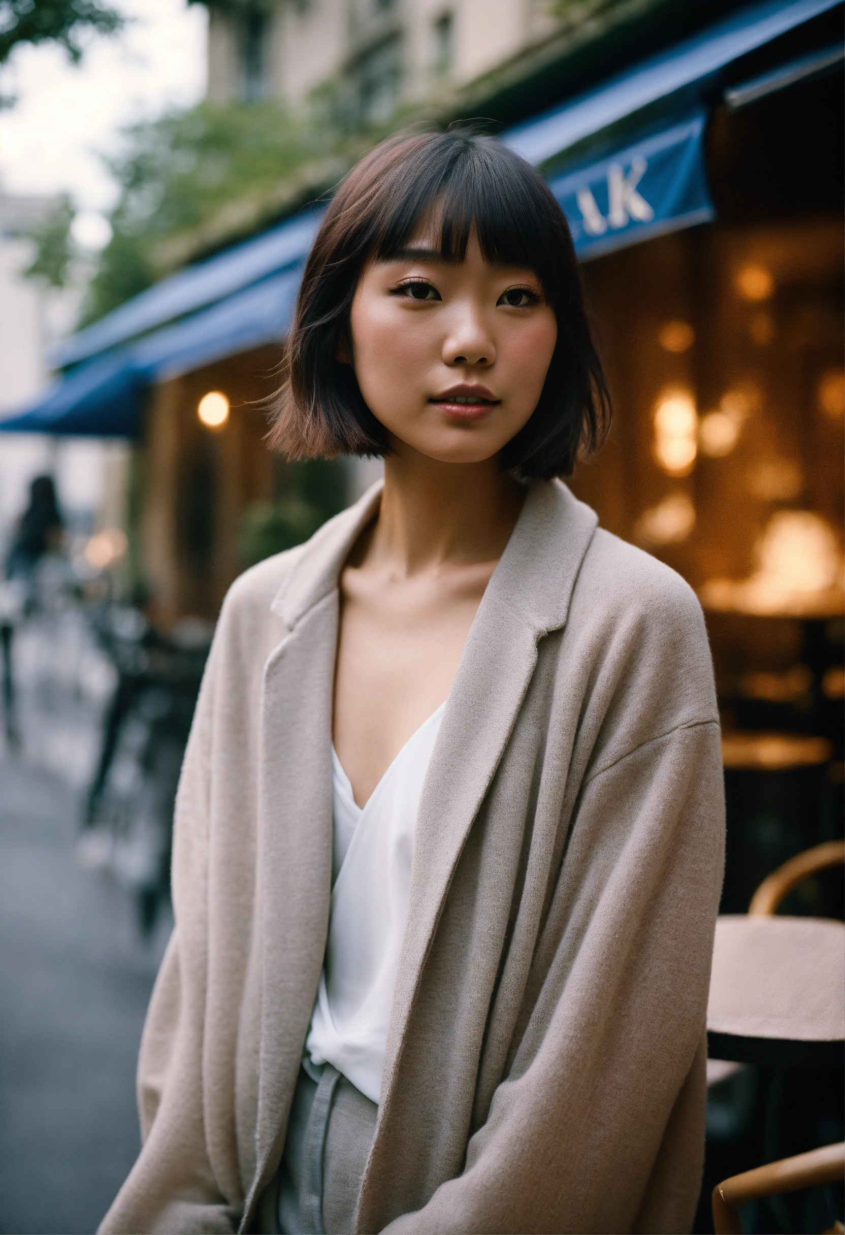 Portrait of a beautiful japanese fashion model with bob-cut hair and a sporty athleisure outfit, ethereal dreamy foggy, photoshoot by henri cartier bressons, editorial fashion magazine photoshoot, fashion poses, in front of parisian café terrace. kinfolk magazine. film grain. a soft smile