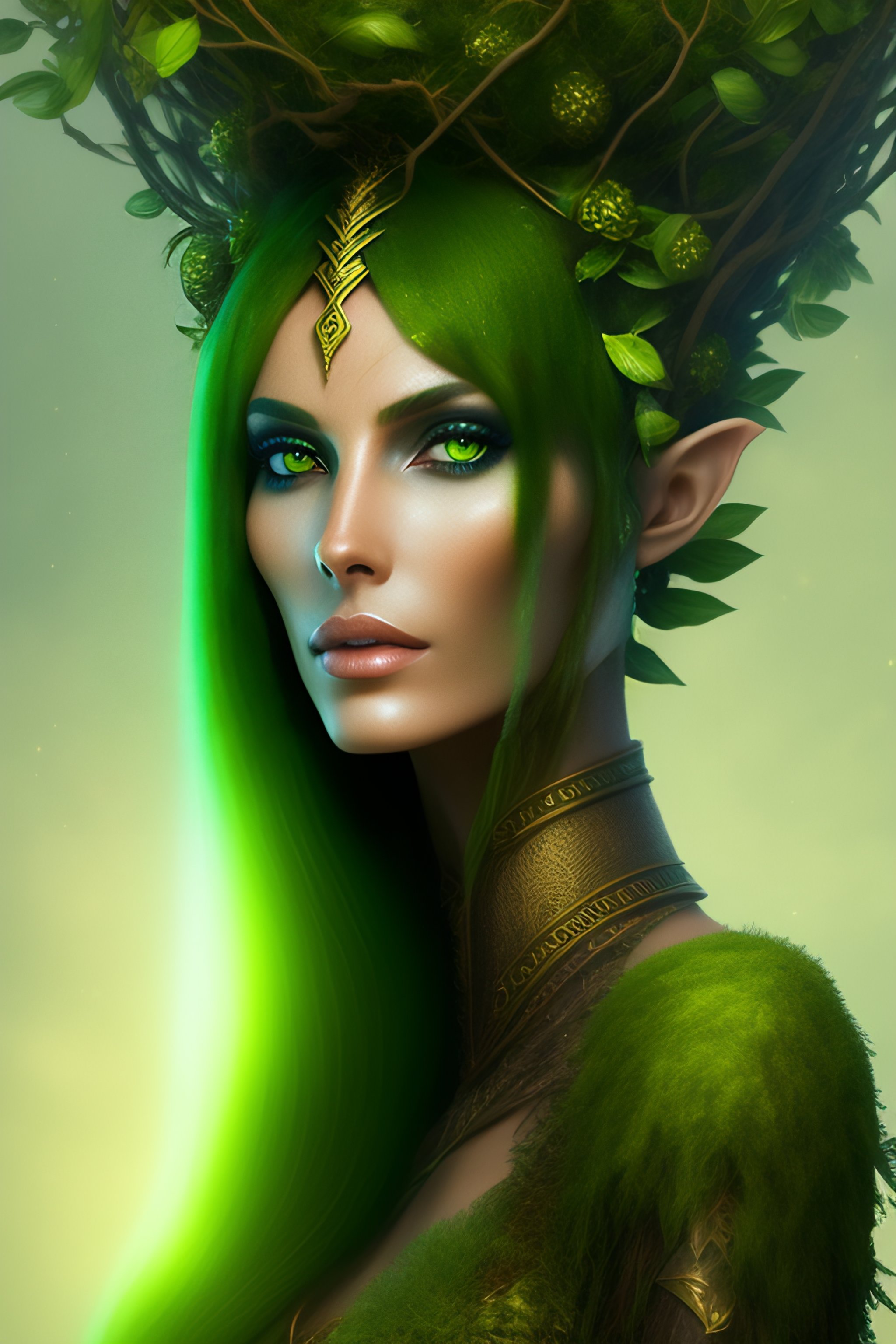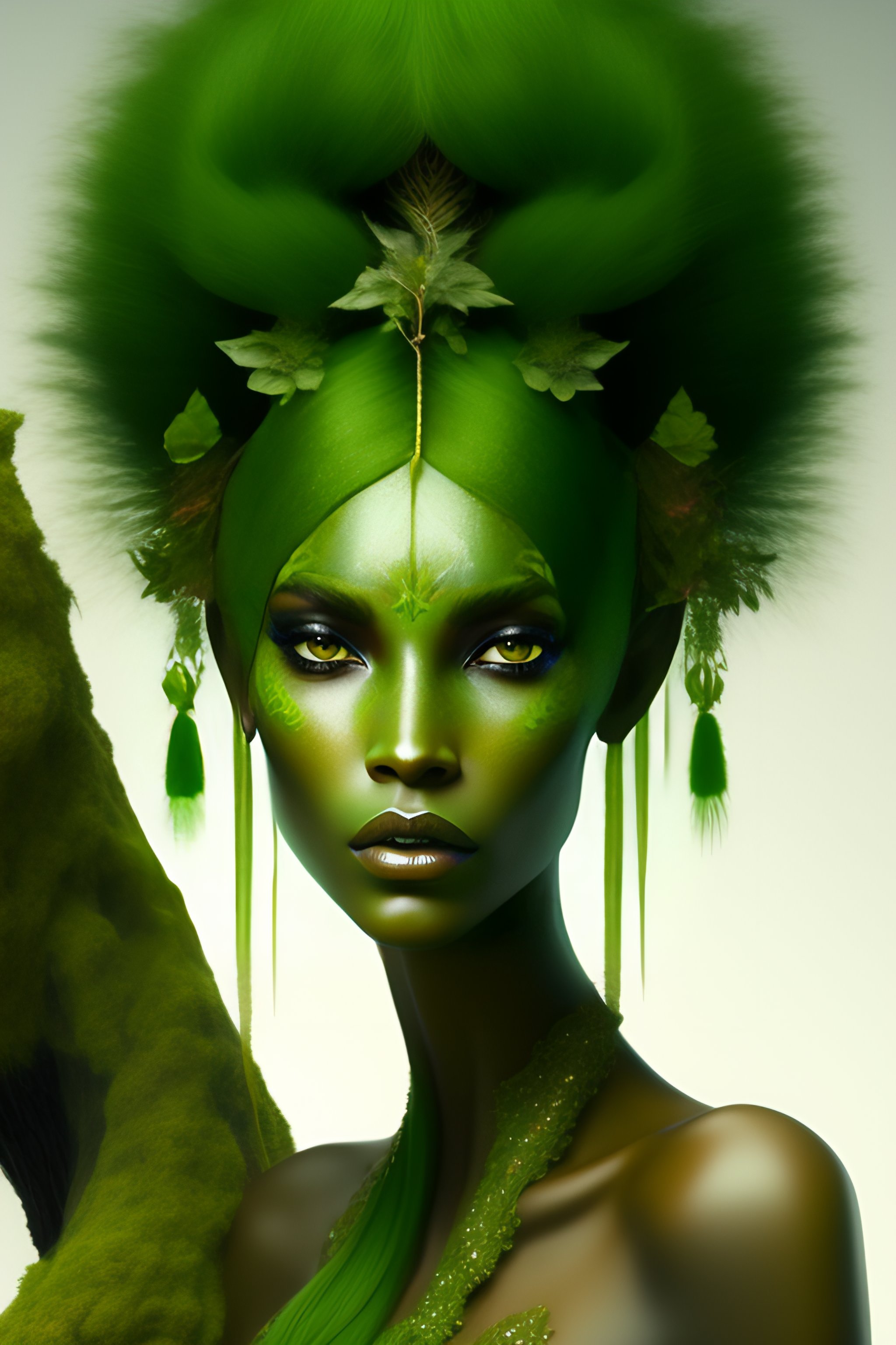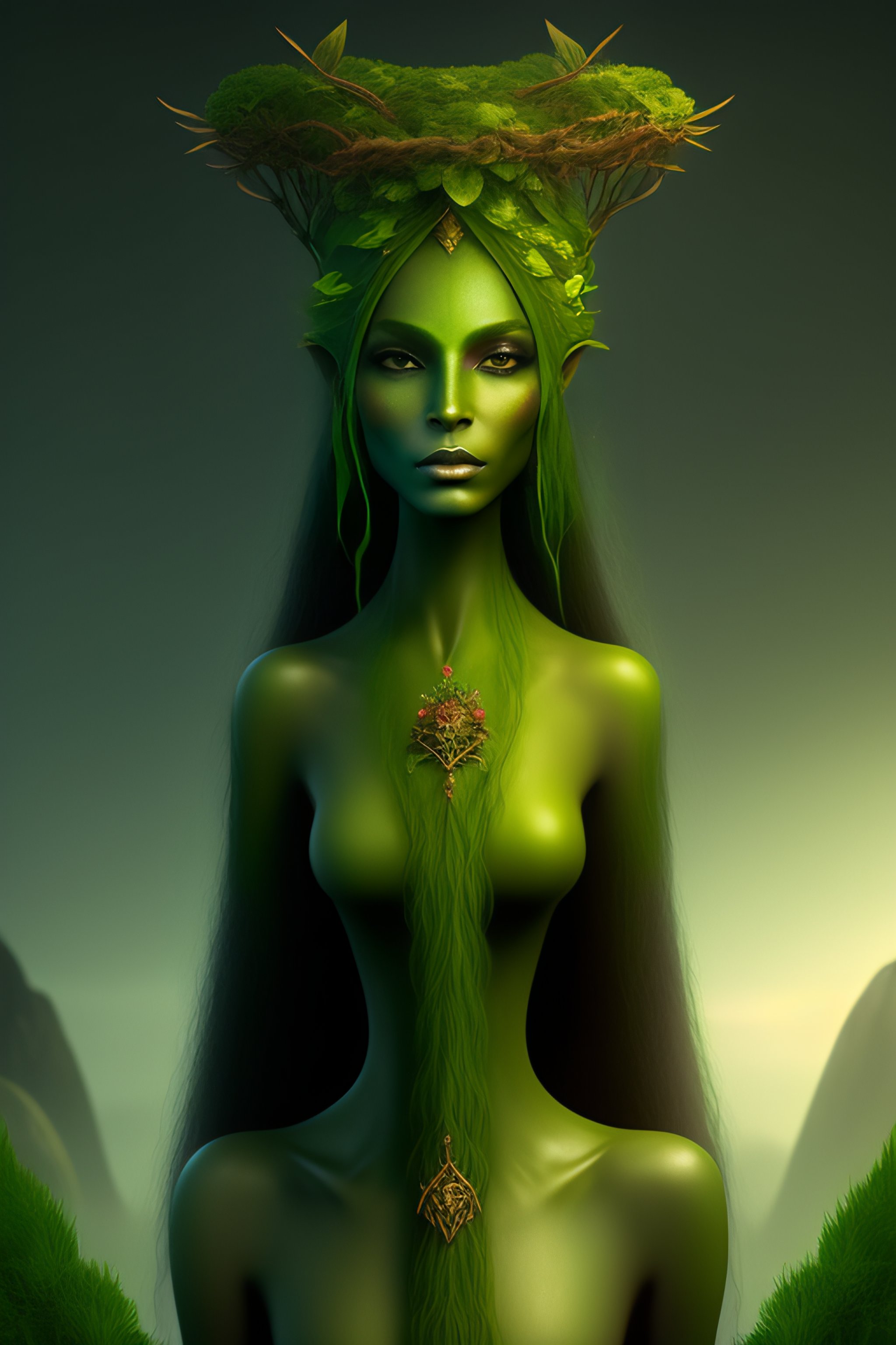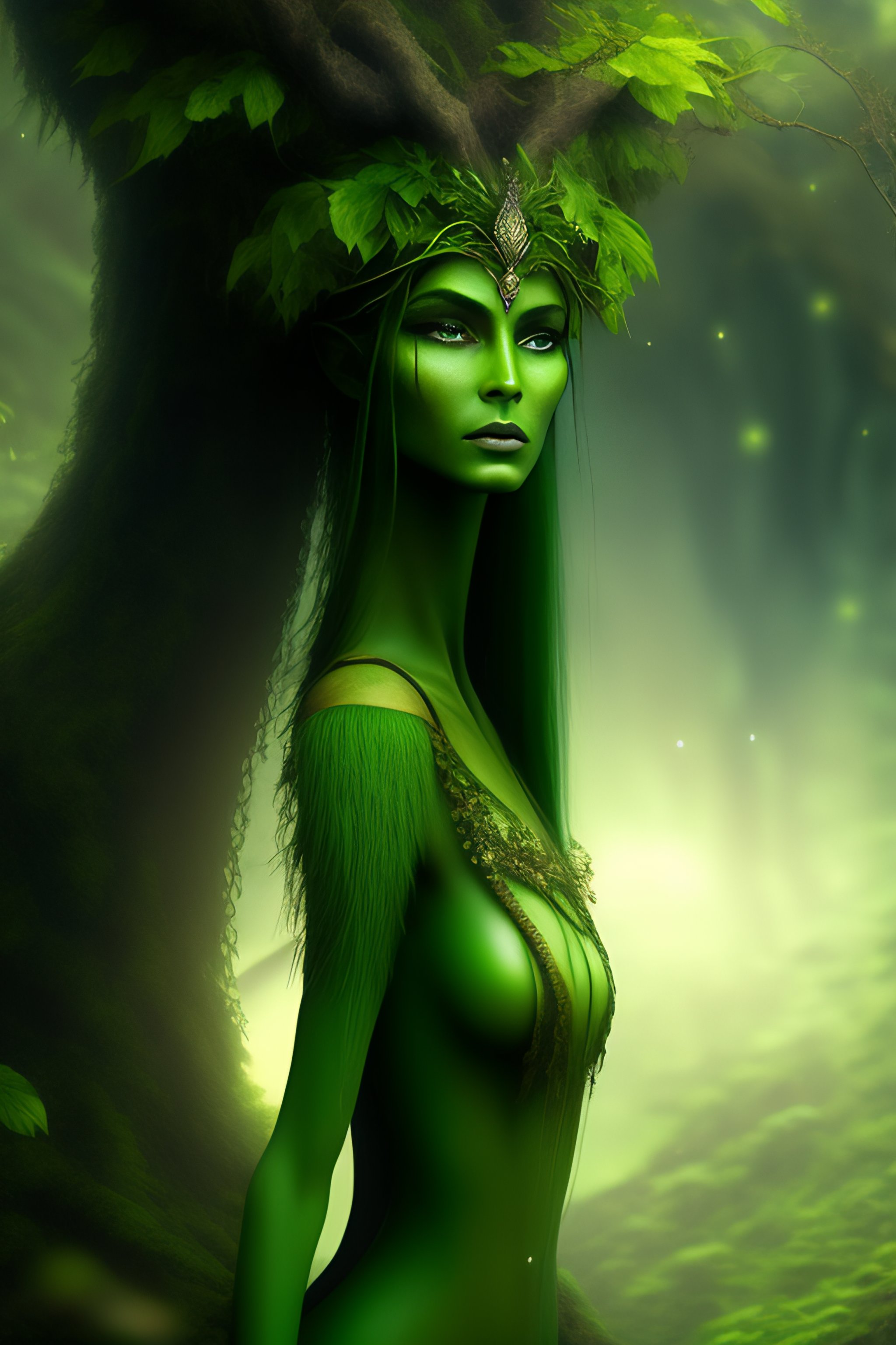 A green-skinned tall thin dryad, with grass for hair, a long narrow head, very thin lips and nose, almost no forehead, and huge eyes covering one third of its face. thin body with branches for fingers.