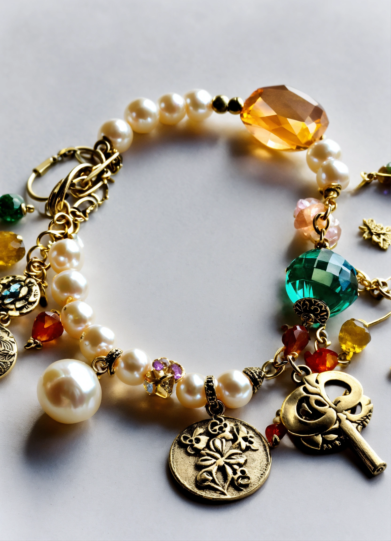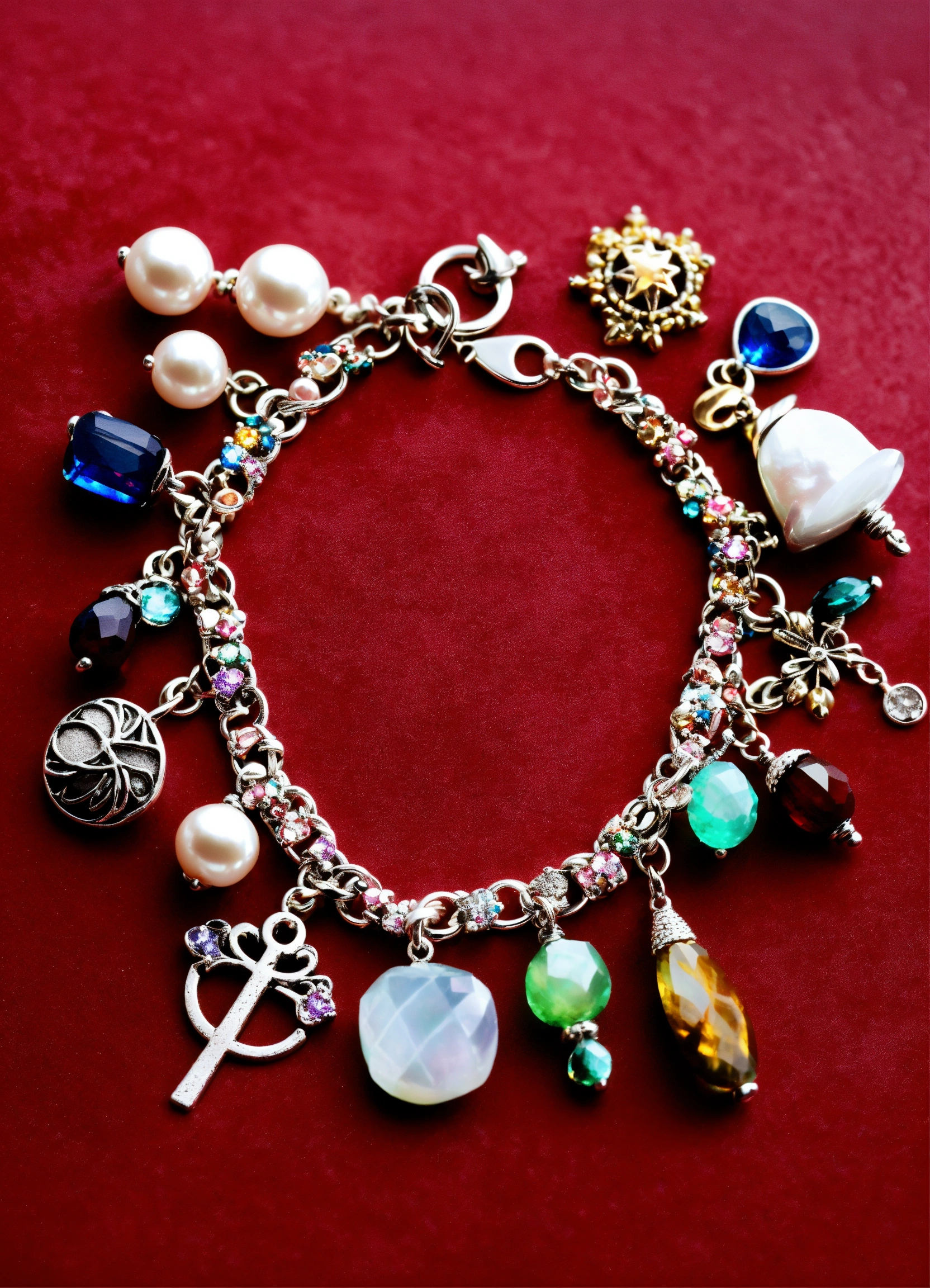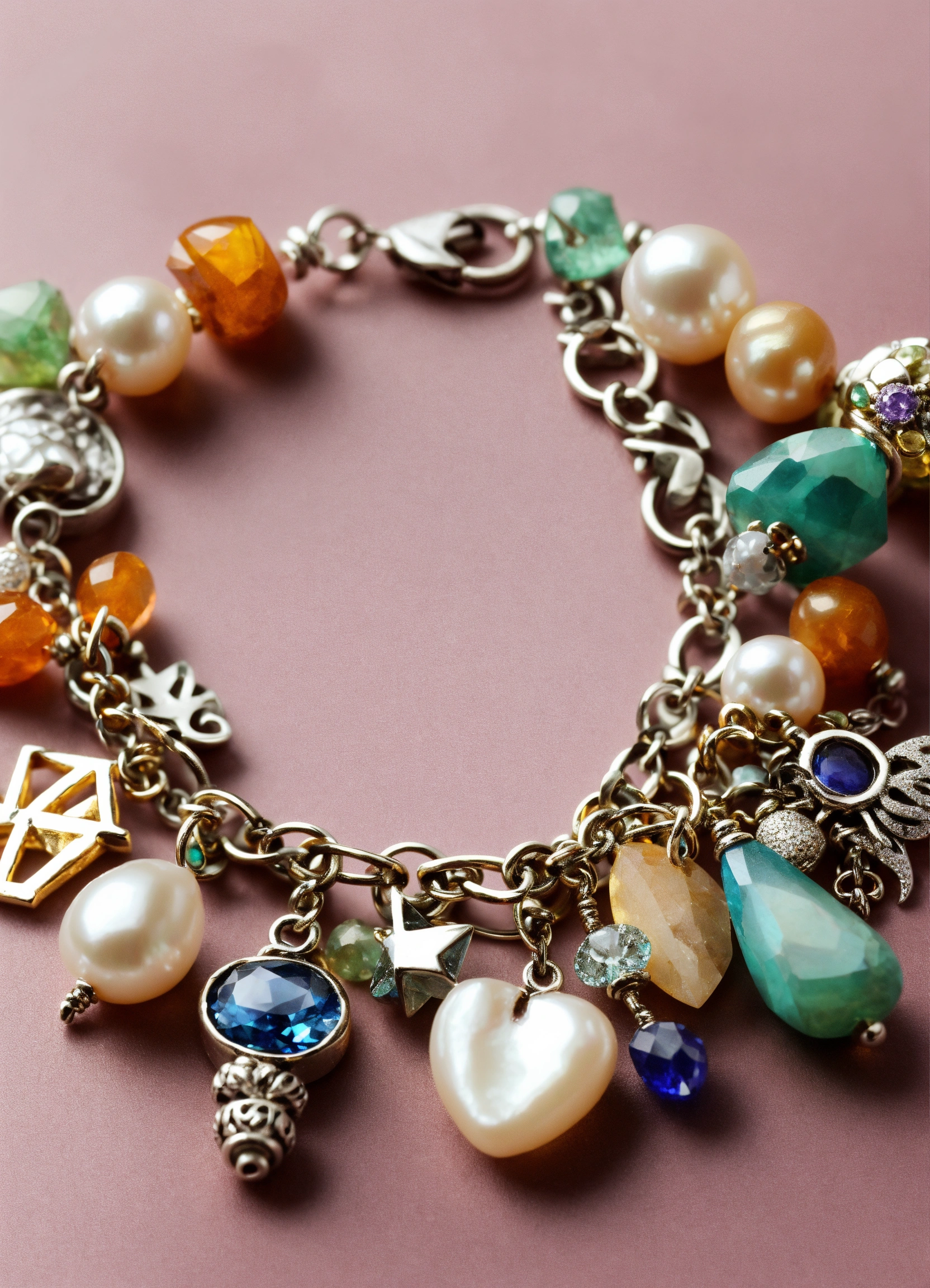 A mix of different types of charms and charms on a pearl and gemstone bracelet