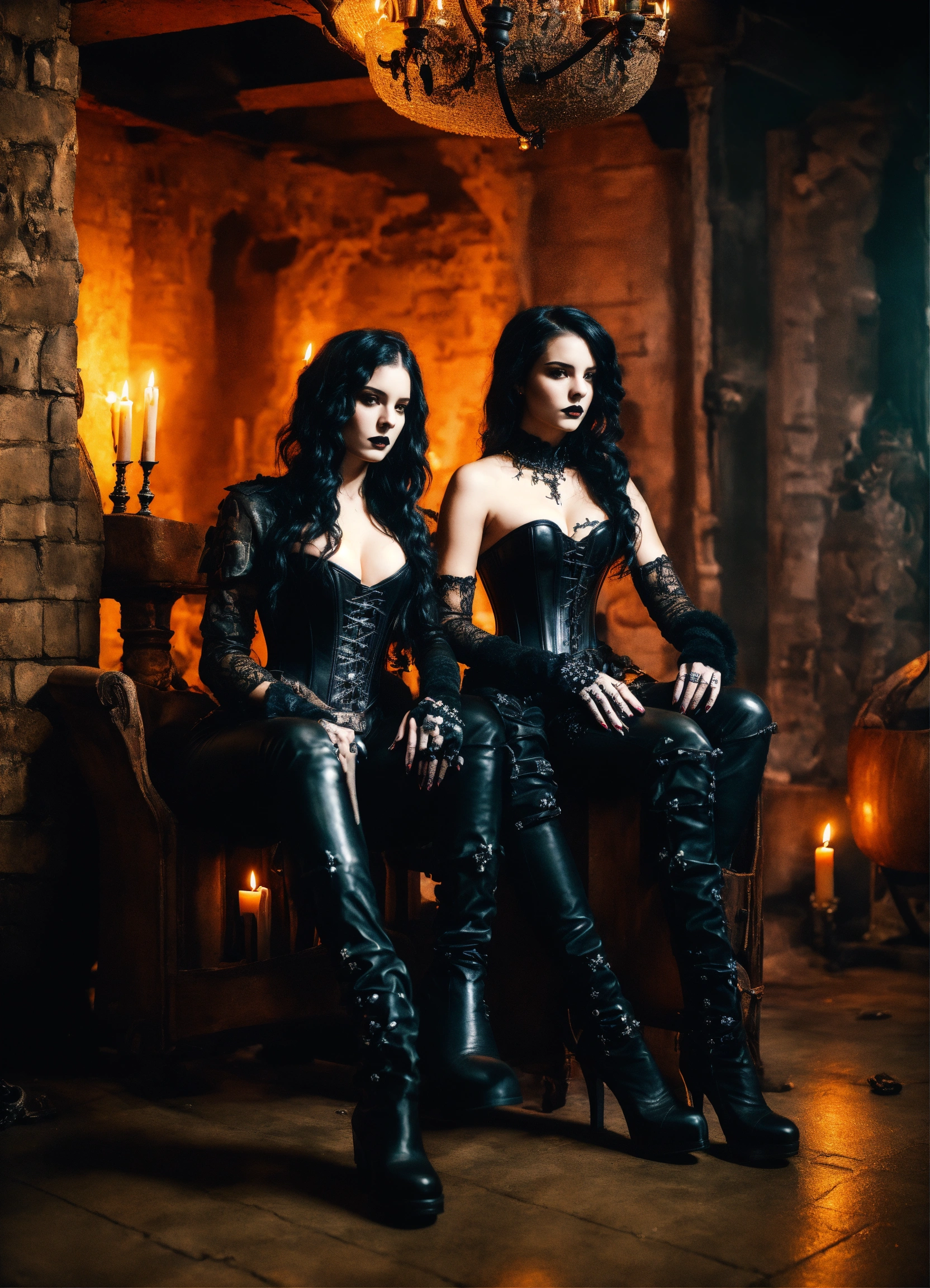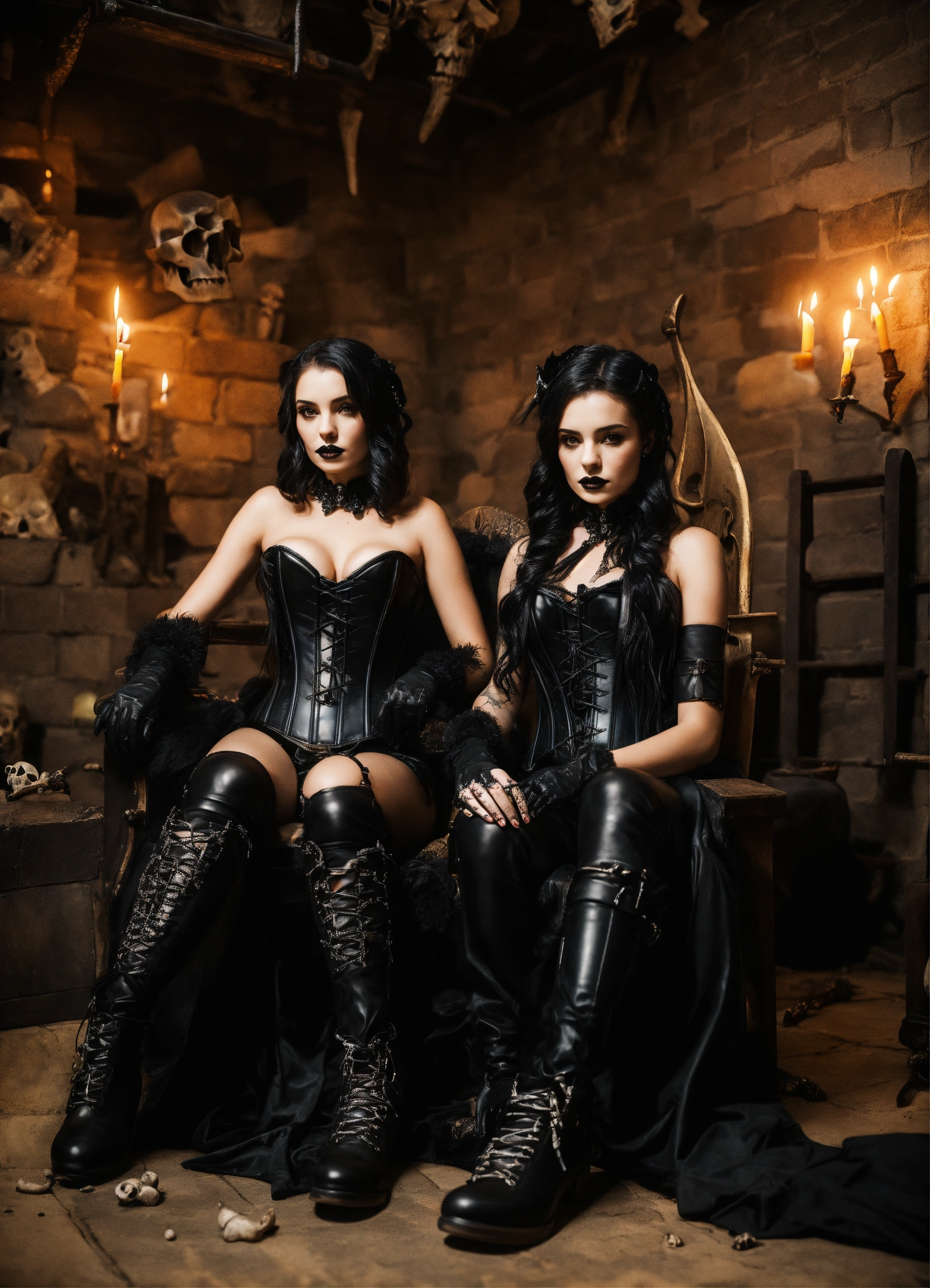 Two stunning young gothic women sitting on thrones in a candle lit basement wearing a black leather corset and black leather pants black leather gloves, hyper-realistic, photographic portrait floor strewn with skulls and bones